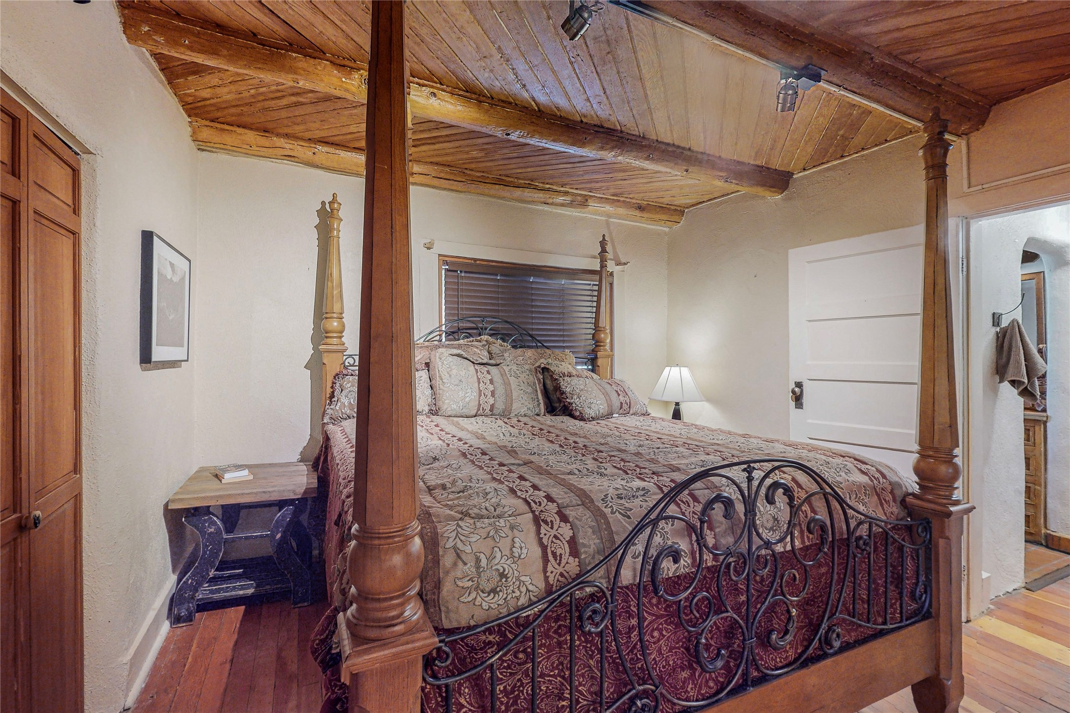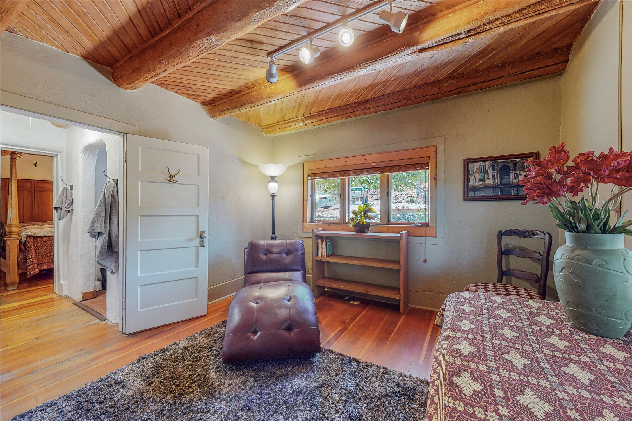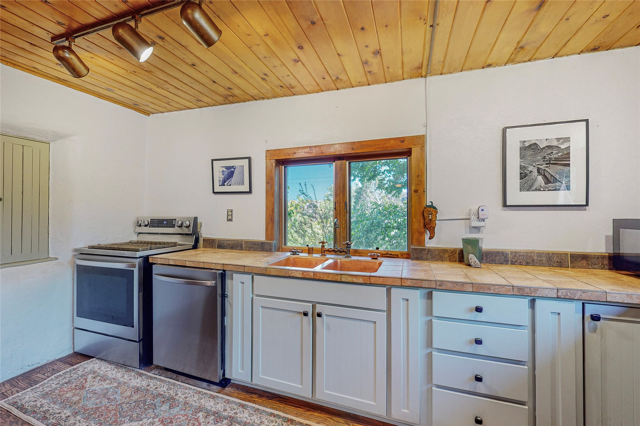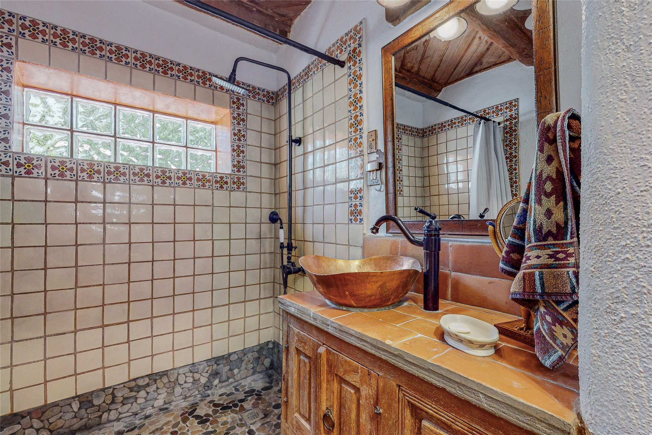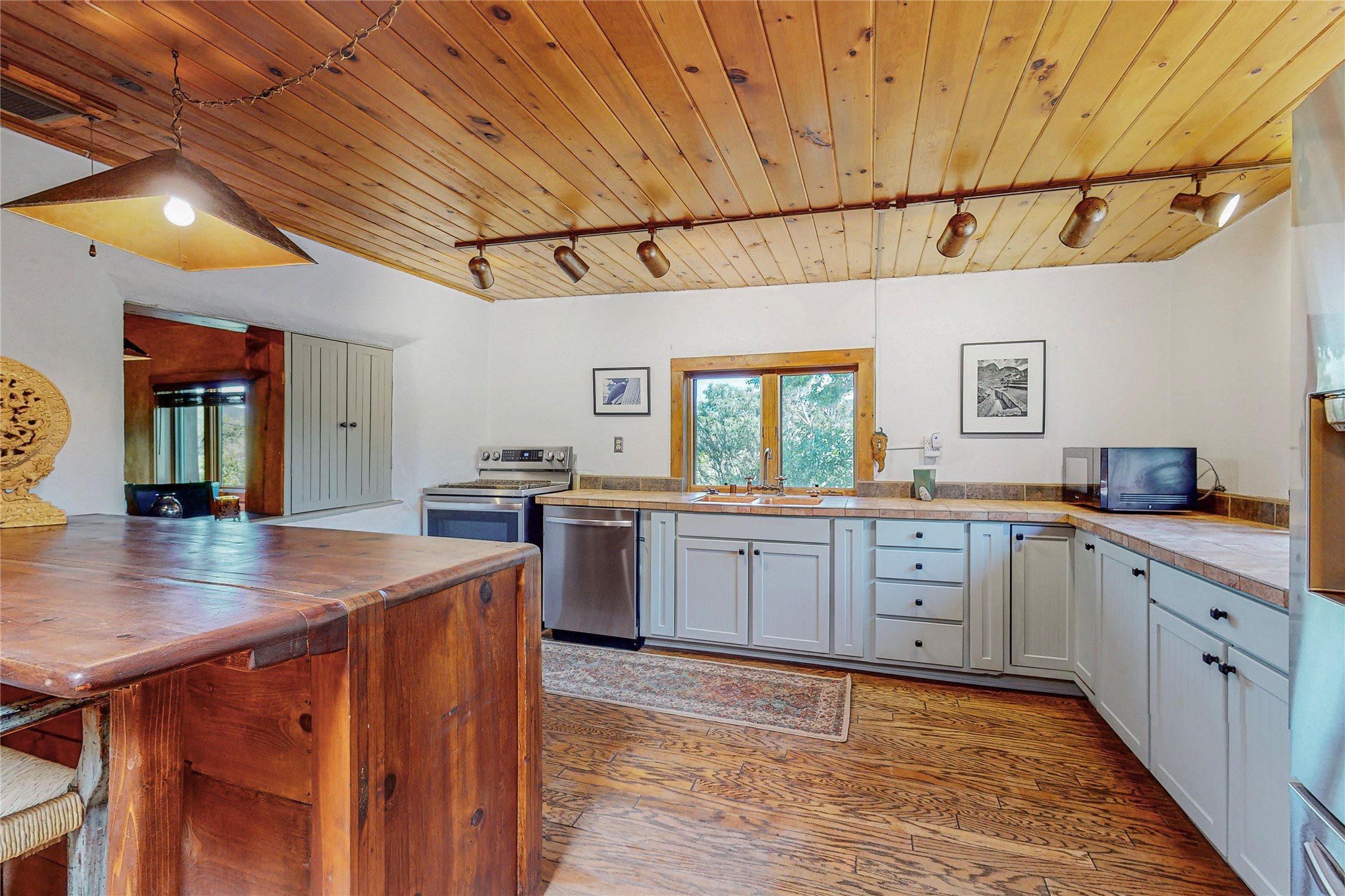 Classic Northern New Mexico style adobe gem listed for sale. The property features many upgrades including a fully fenced/walled lot with two access gates from paved NM Hwy 63, vigas and beams, tongue and groove ceilings, extensive landscaping, a fountain, an horno, a bricked terrace with great views, and a carport. Entering from the graveled driveway to covered porch overlooking one of the gardens and fountain one enters the home through a custom wooden door. The living room has recently sanded and sealed floors, corner kiva fireplace, views to the ridge above the Pecos River, bookshelf and openings to the office/2nd bedroom and dining room. The bathroom has be renovated and adjoins both bedrooms. The large recently remodeled country kitchen has stainless steel appliances - refrigerator/dishwasher/stove, copper sink, expansive seating area, new cabinets and adjoins the laundry room. There is a lower level with a den, bath, a small room that with a closet could be a bedroom or an office, separate entrance as well as a large unfinished "basement" for ample storage or renovation possibilities. There is radon mitigation in place. There is a stand alone shed/work shop that is a bonus. Come see this beautiful property today!