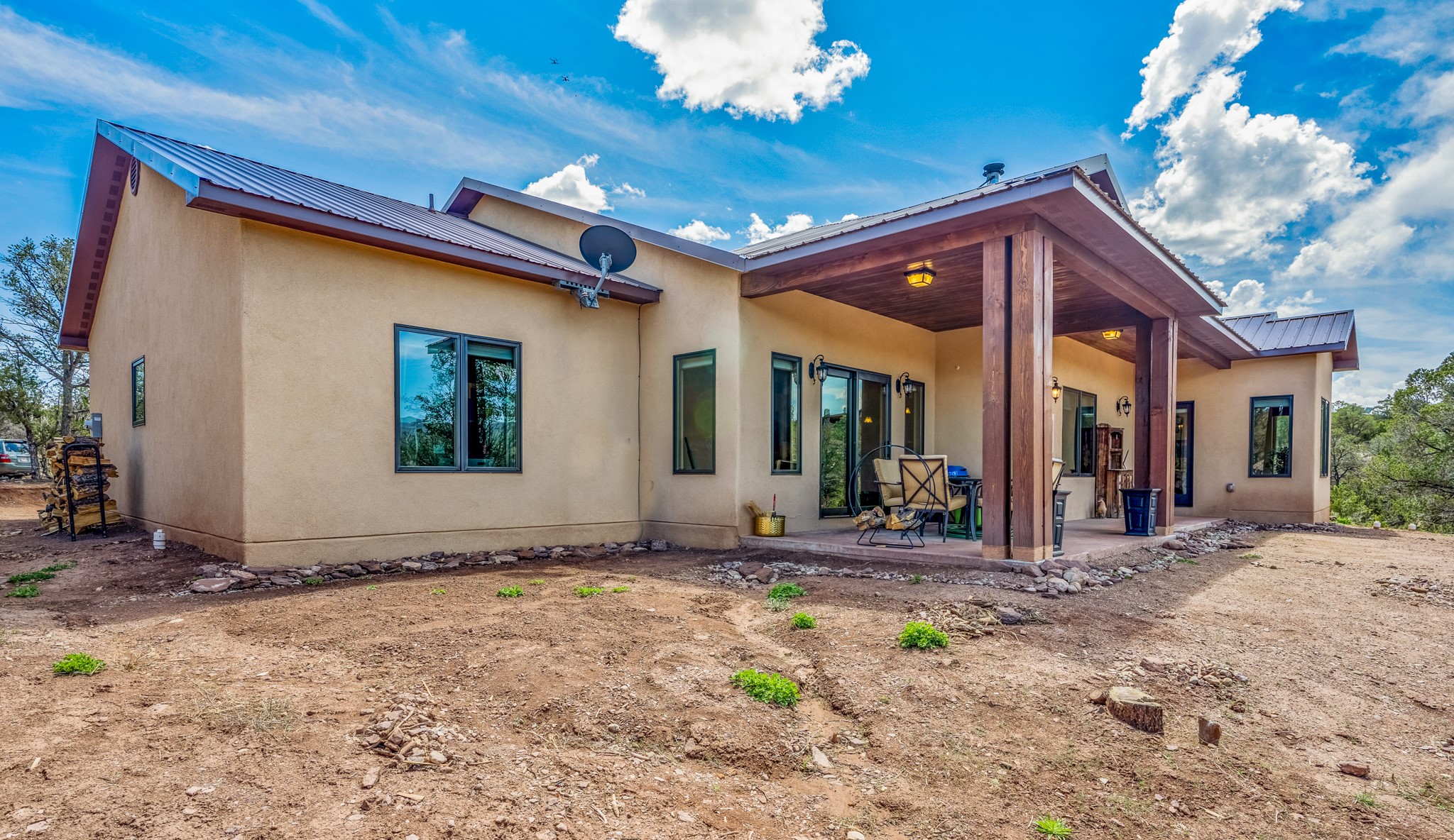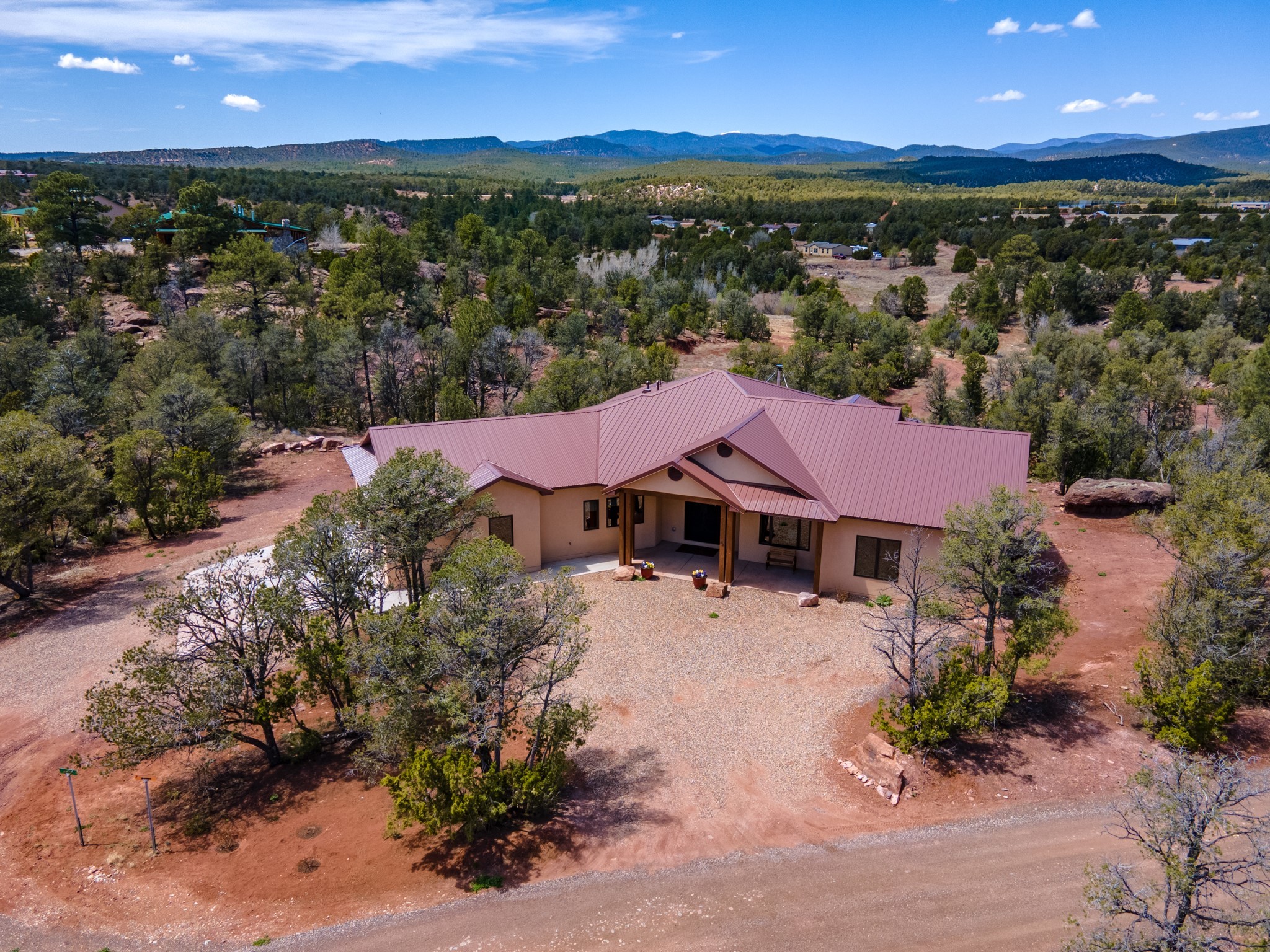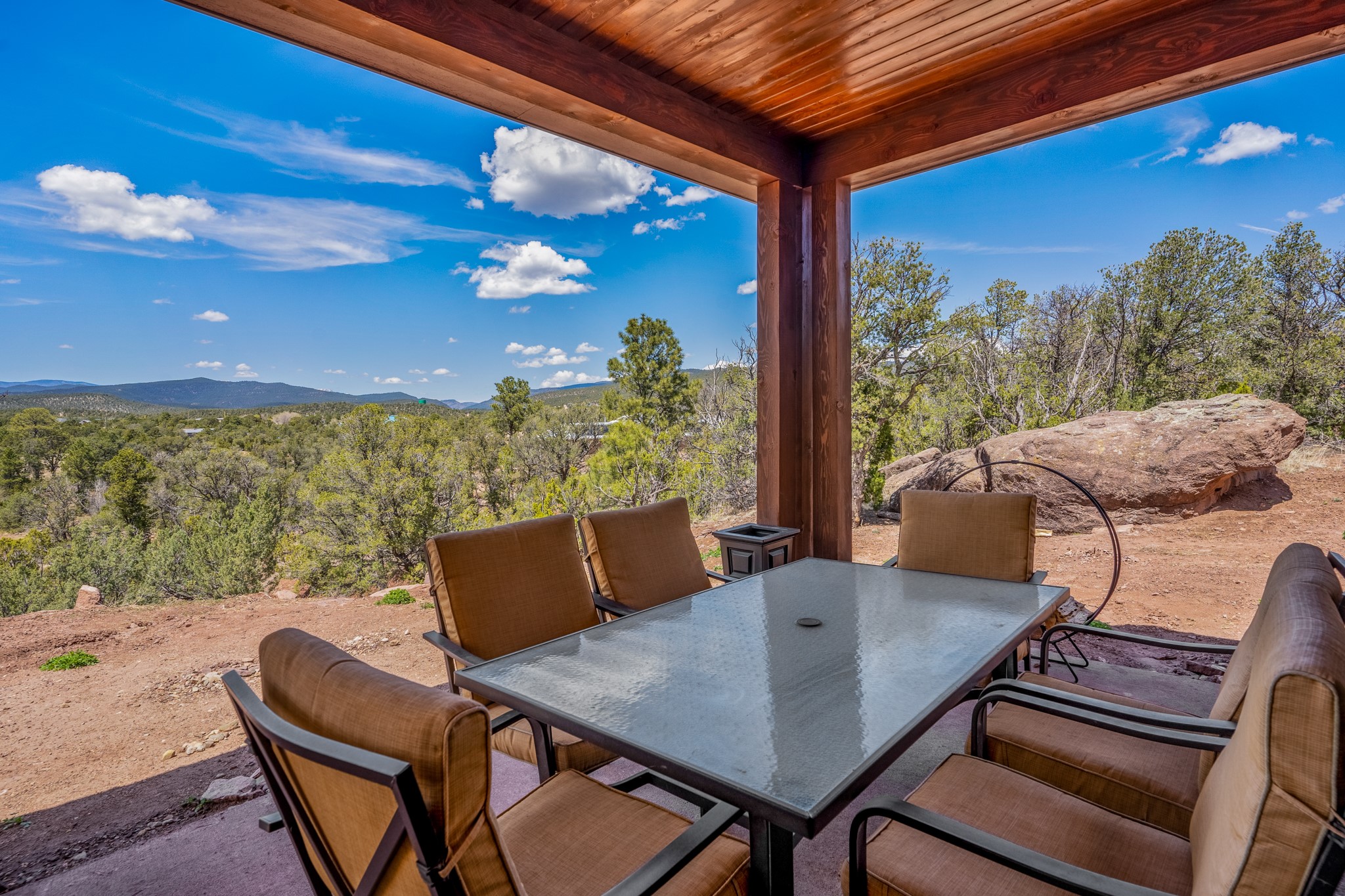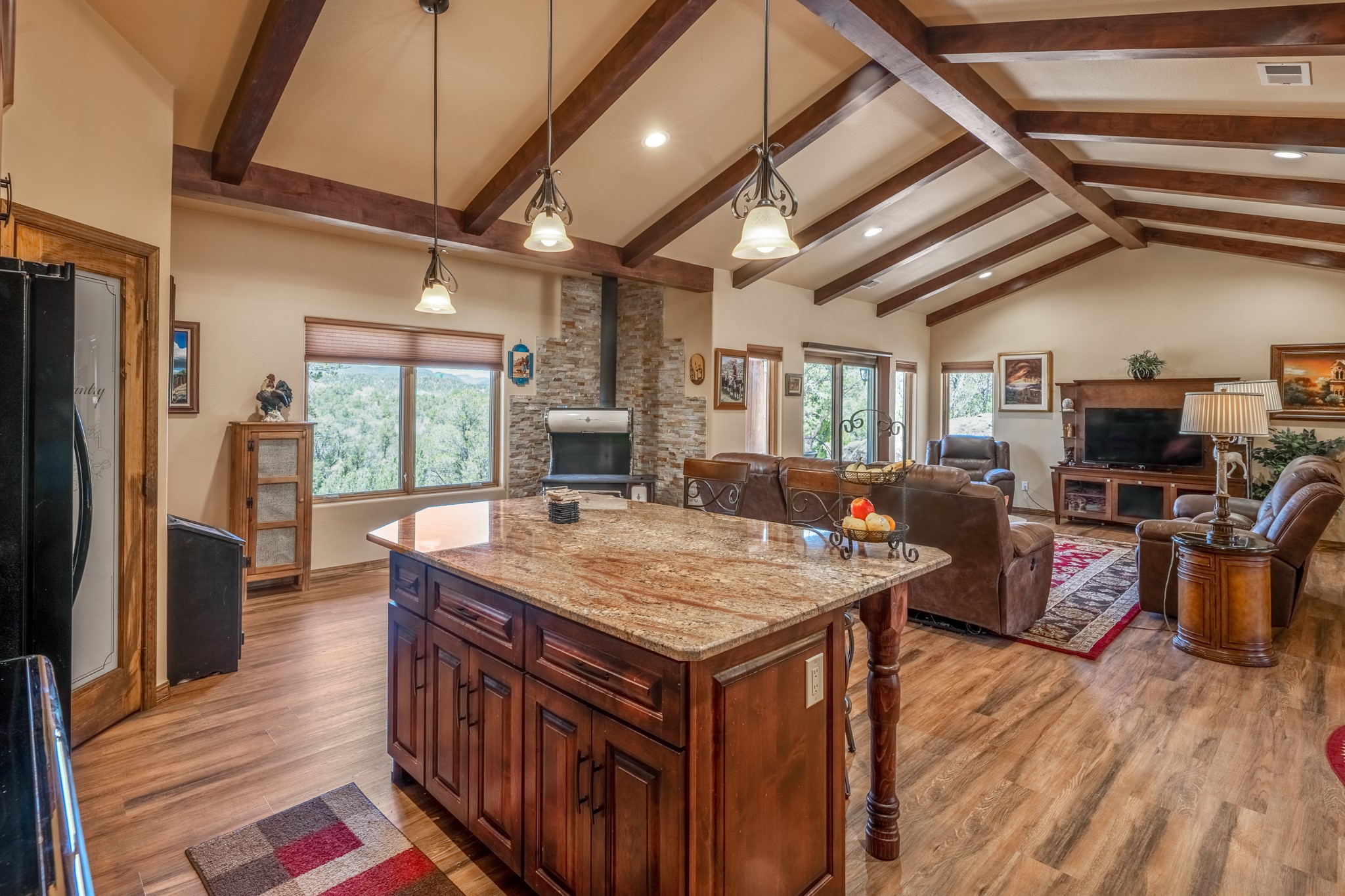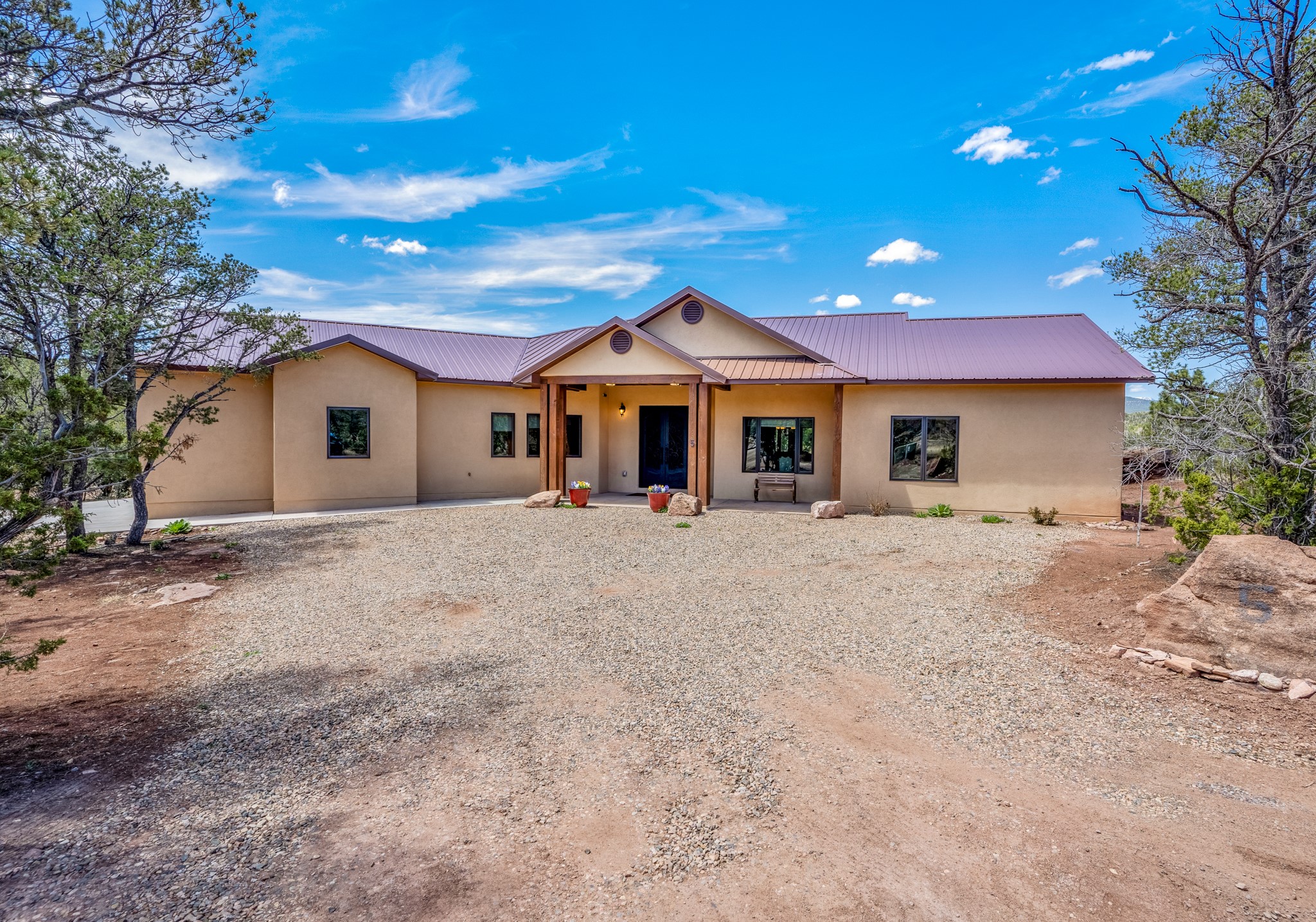 Gorgeous Pecos gem built in 2021 with wonderful views approximately 20 minutes from Santa Fe and is sited on a bit over an acre boasting 2312 +/- square feet, 3 bedrooms plus an office/work out room/playroom or a possible 4th bedroom, 3 bathrooms, and a direct entry finished 2-car garage into the large laundry room with granite counters and cabinets. This single level home offers an open concept kitchen with can and pendant lighting, beautiful granite counters, a huge island, soft close drawers and cabinets, eat-in kitchen nook and pantry. The living room with tall ceiling has wood beams and doors leading to the large rear covered porch perfect for viewing the amazing views. The split bedroom floorplan is perfect for privacy. The large owner's suite has an en-suite bath with dual sinks, granite counters, tiled shower, his and hers walk-in closets with built-ins and 2 separate commode closets. On the opposite side of the home, you will find 2 good sized guest bedrooms (1 with 2 walk-in closets) with a jack and jill full bath with double sinks and granite counters. The home has the Village of Pecos water and sewer, Mora San Miguel electric and propane for gas. Amenities/Features: Wood doors-Forced air heat with central refrigerated air conditioning-Pitched pro-panel roof-Pella windows and doors throughout-Formal dining room-Front and rear covered porches-Tile and wood laminate flooring and carpet in the bedrooms-Whole house water softener and so much more!