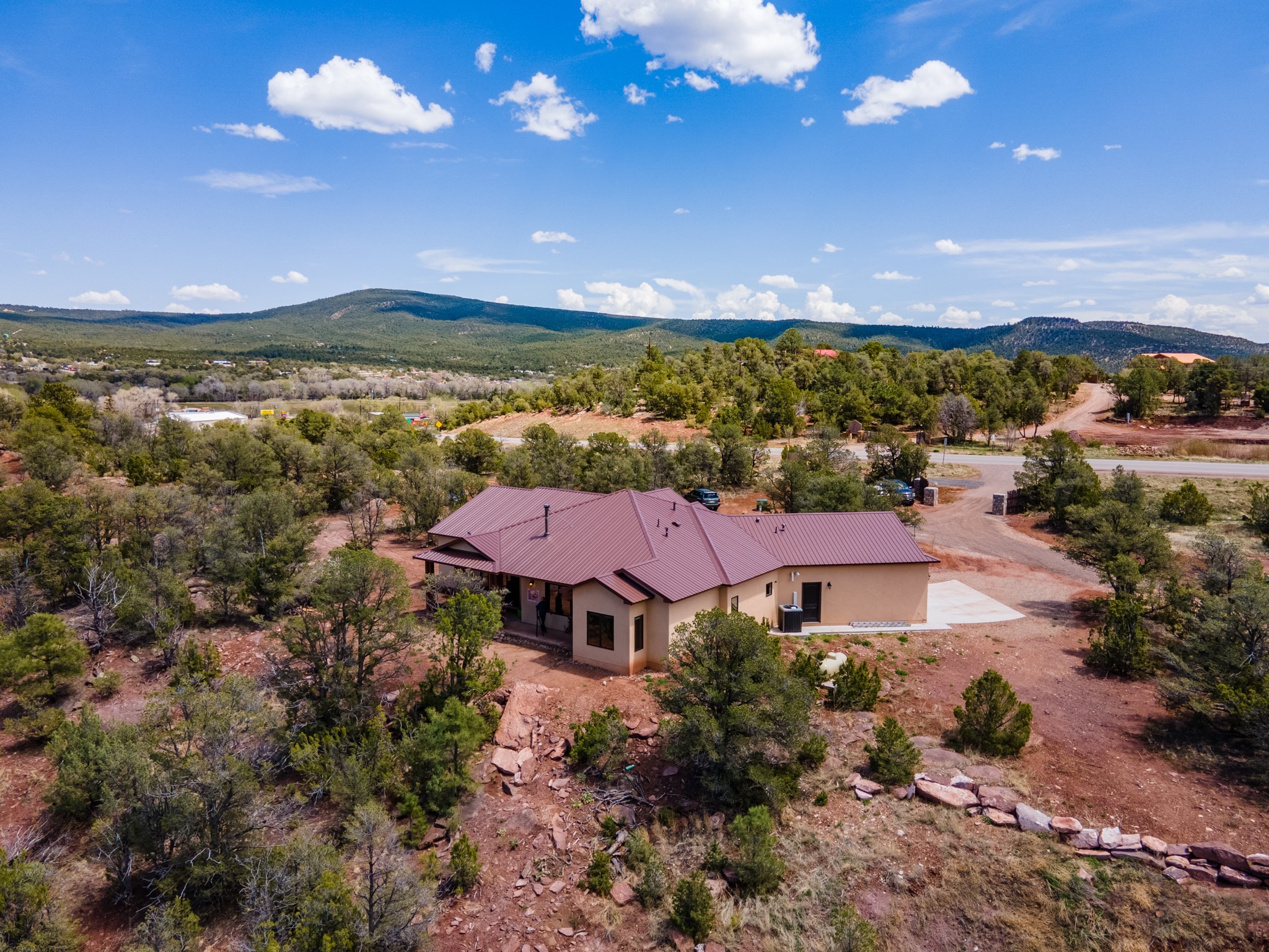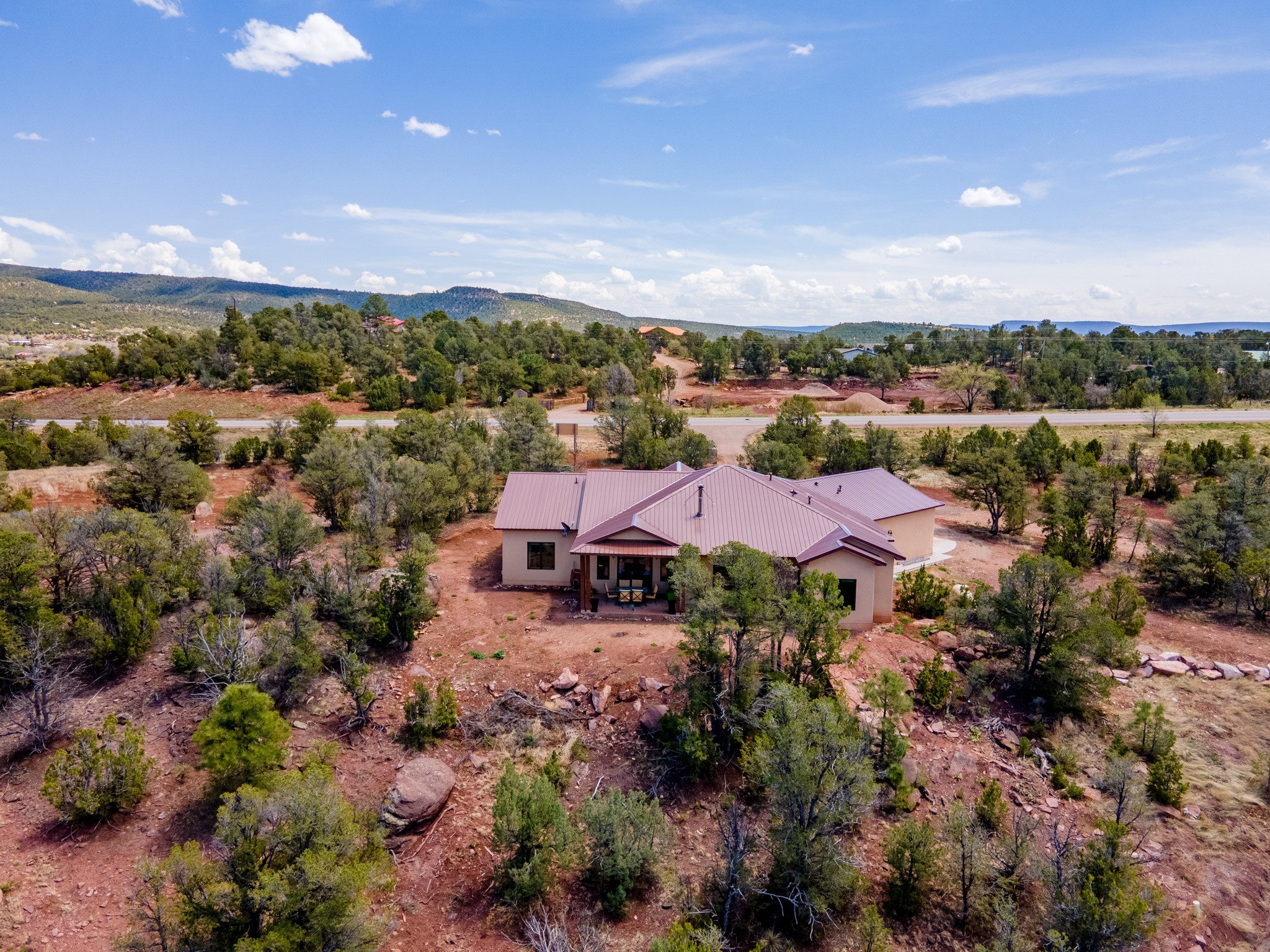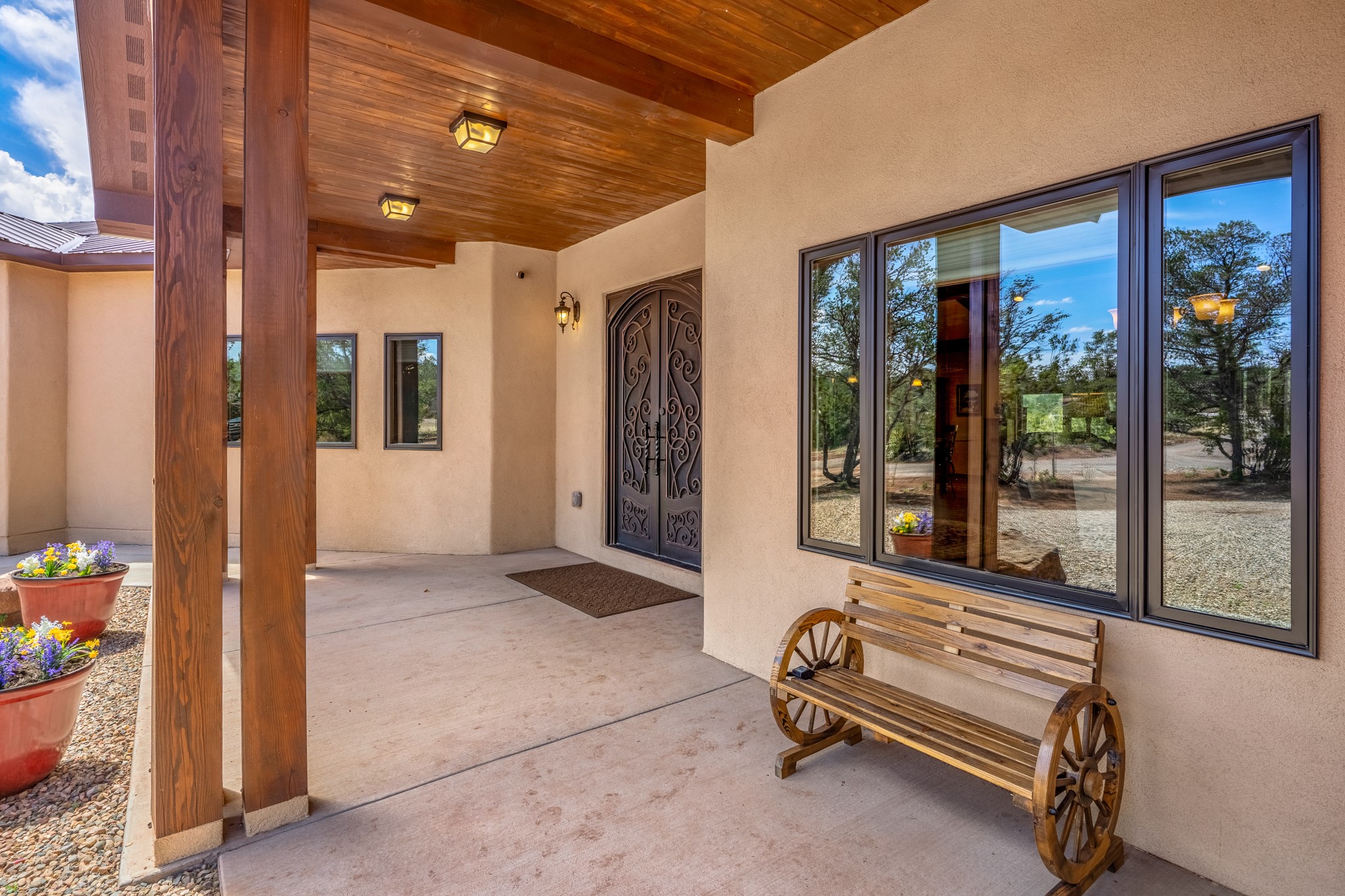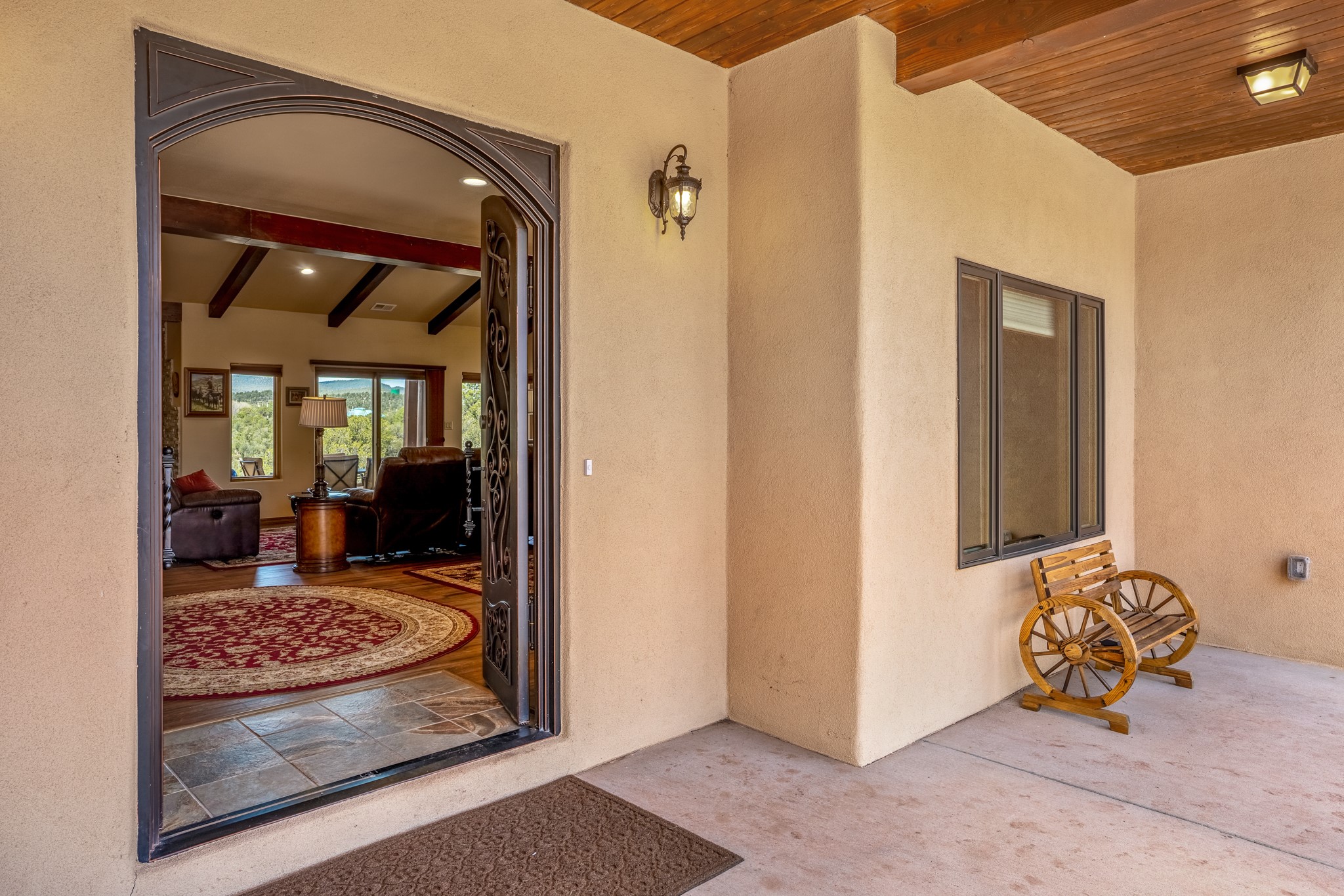 Gorgeous Pecos gem built in 2021 with wonderful views approximately 20 minutes from Santa Fe and is sited on a bit over an acre boasting 2312 +/- square feet, 3 bedrooms plus an office/work out room/playroom or a possible 4th bedroom, 3 bathrooms, and a direct entry finished 2-car garage into the large laundry room with granite counters and cabinets. This single level home offers an open concept kitchen with can and pendant lighting, beautiful granite counters, a huge island, soft close drawers and cabinets, eat-in kitchen nook and pantry. The living room with tall ceiling has wood beams and doors leading to the large rear covered porch perfect for viewing the amazing views. The split bedroom floorplan is perfect for privacy. The large owner's suite has an en-suite bath with dual sinks, granite counters, tiled shower, his and hers walk-in closets with built-ins and 2 separate commode closets. On the opposite side of the home, you will find 2 good sized guest bedrooms (1 with 2 walk-in closets) with a jack and jill full bath with double sinks and granite counters. The home has the Village of Pecos water and sewer, Mora San Miguel electric and propane for gas. Amenities/Features: Wood doors-Forced air heat with central refrigerated air conditioning-Pitched pro-panel roof-Pella windows and doors throughout-Formal dining room-Front and rear covered porches-Tile and wood laminate flooring and carpet in the bedrooms-Whole house water softener and so much more!