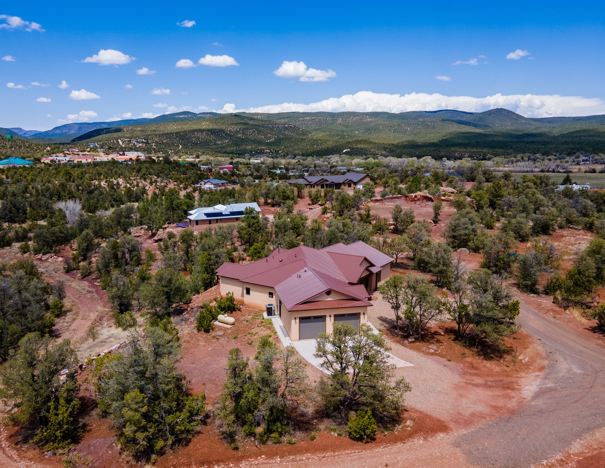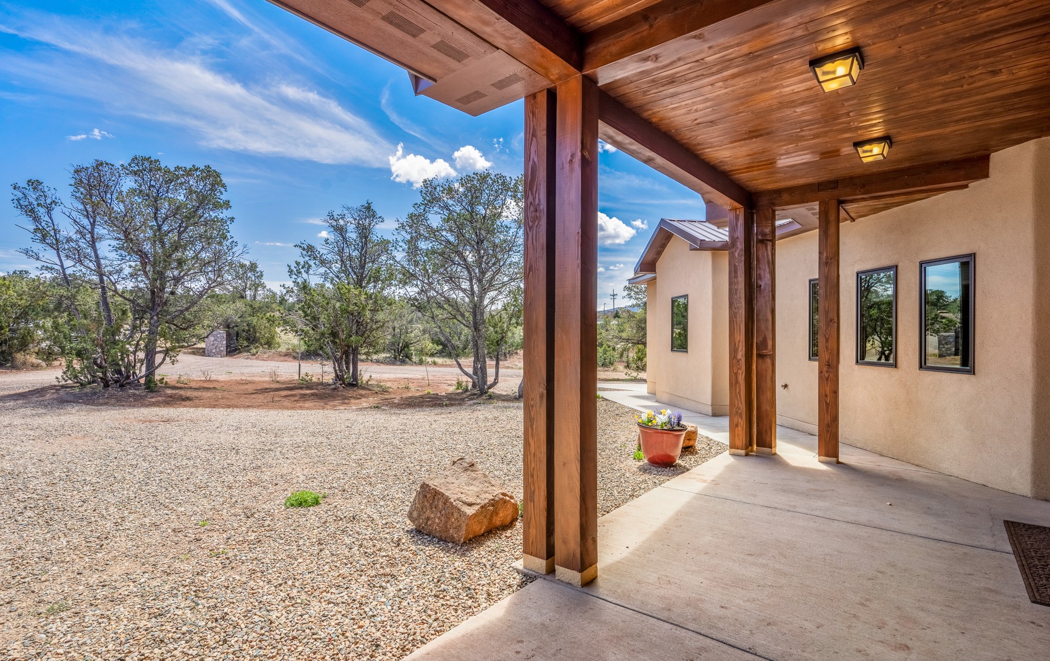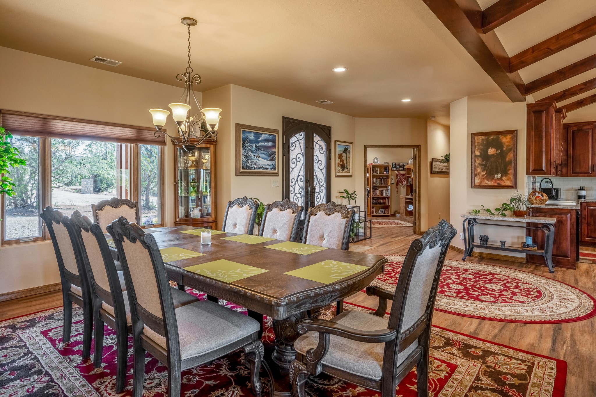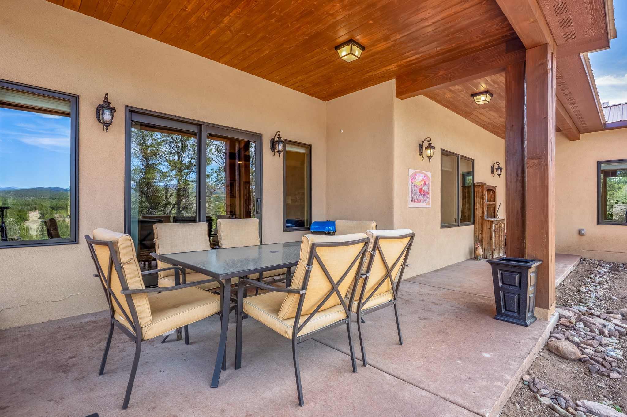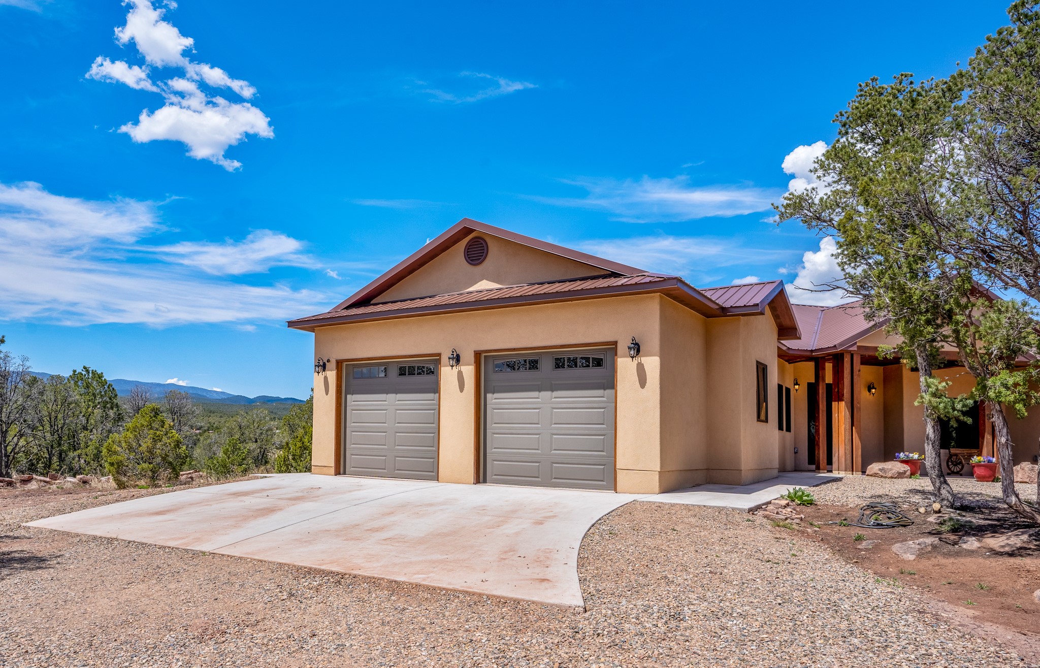 Gorgeous Pecos gem built in 2021 with wonderful views approximately 20 minutes from Santa Fe and is sited on a bit over an acre boasting 2312 +/- square feet, 3 bedrooms plus an office/work out room/playroom or a possible 4th bedroom, 3 bathrooms, and a direct entry finished 2-car garage into the large laundry room with granite counters and cabinets. This single level home offers an open concept kitchen with can and pendant lighting, beautiful granite counters, a huge island, soft close drawers and cabinets, eat-in kitchen nook and pantry. The living room with tall ceiling has wood beams and doors leading to the large rear covered porch perfect for viewing the amazing views. The split bedroom floorplan is perfect for privacy. The large owner's suite has an en-suite bath with dual sinks, granite counters, tiled shower, his and hers walk-in closets with built-ins and 2 separate commode closets. On the opposite side of the home, you will find 2 good sized guest bedrooms (1 with 2 walk-in closets) with a jack and jill full bath with double sinks and granite counters. The home has the Village of Pecos water and sewer, Mora San Miguel electric and propane for gas. Amenities/Features: Wood doors-Forced air heat with central refrigerated air conditioning-Pitched pro-panel roof-Pella windows and doors throughout-Formal dining room-Front and rear covered porches-Tile and wood laminate flooring and carpet in the bedrooms-Whole house water softener and so much more!