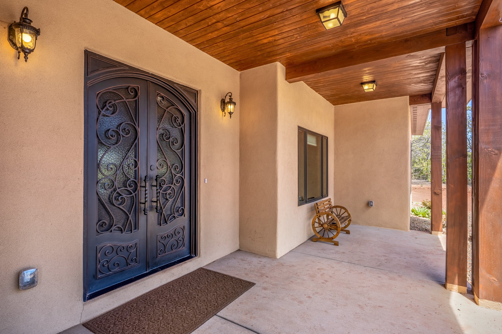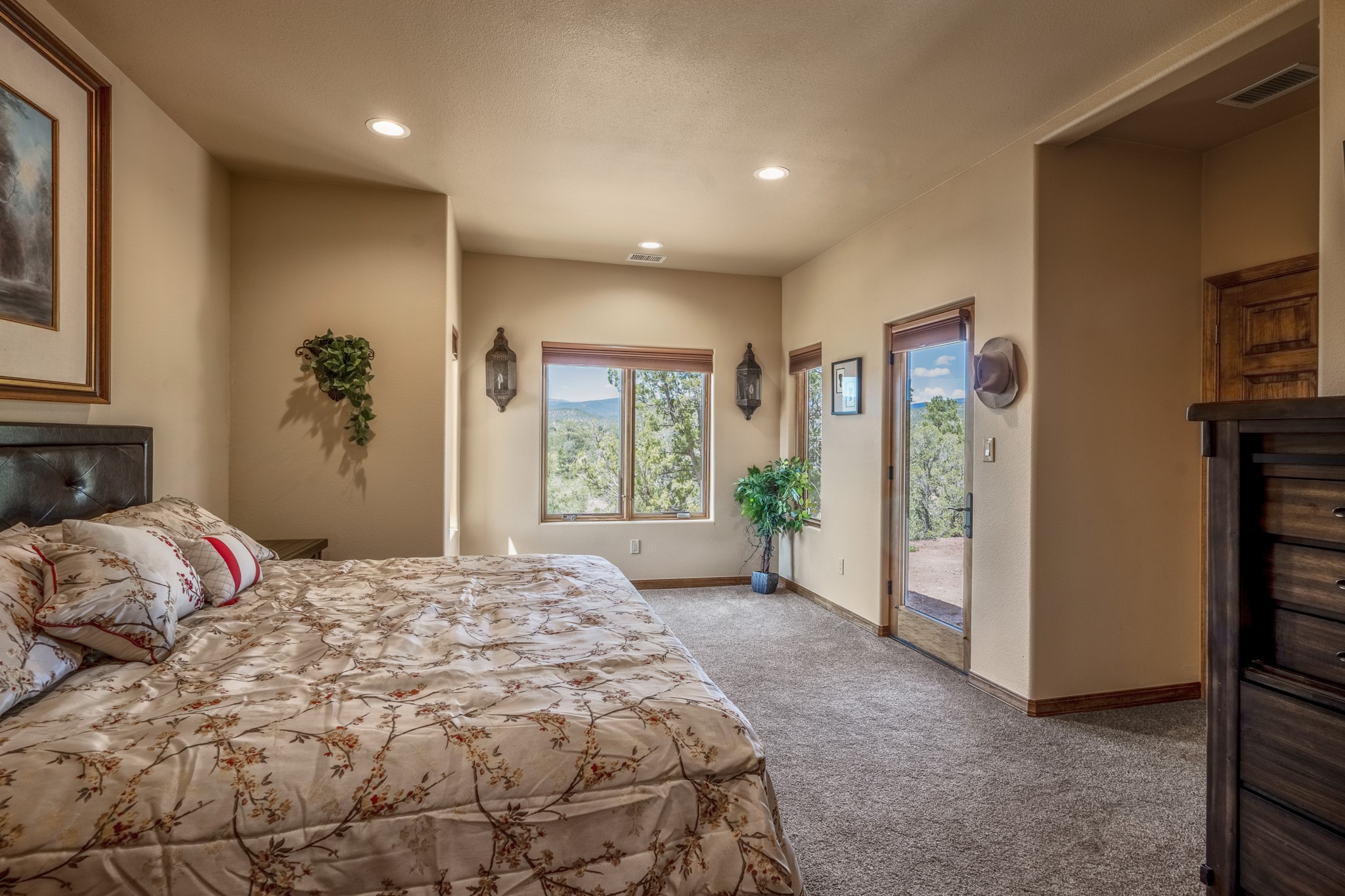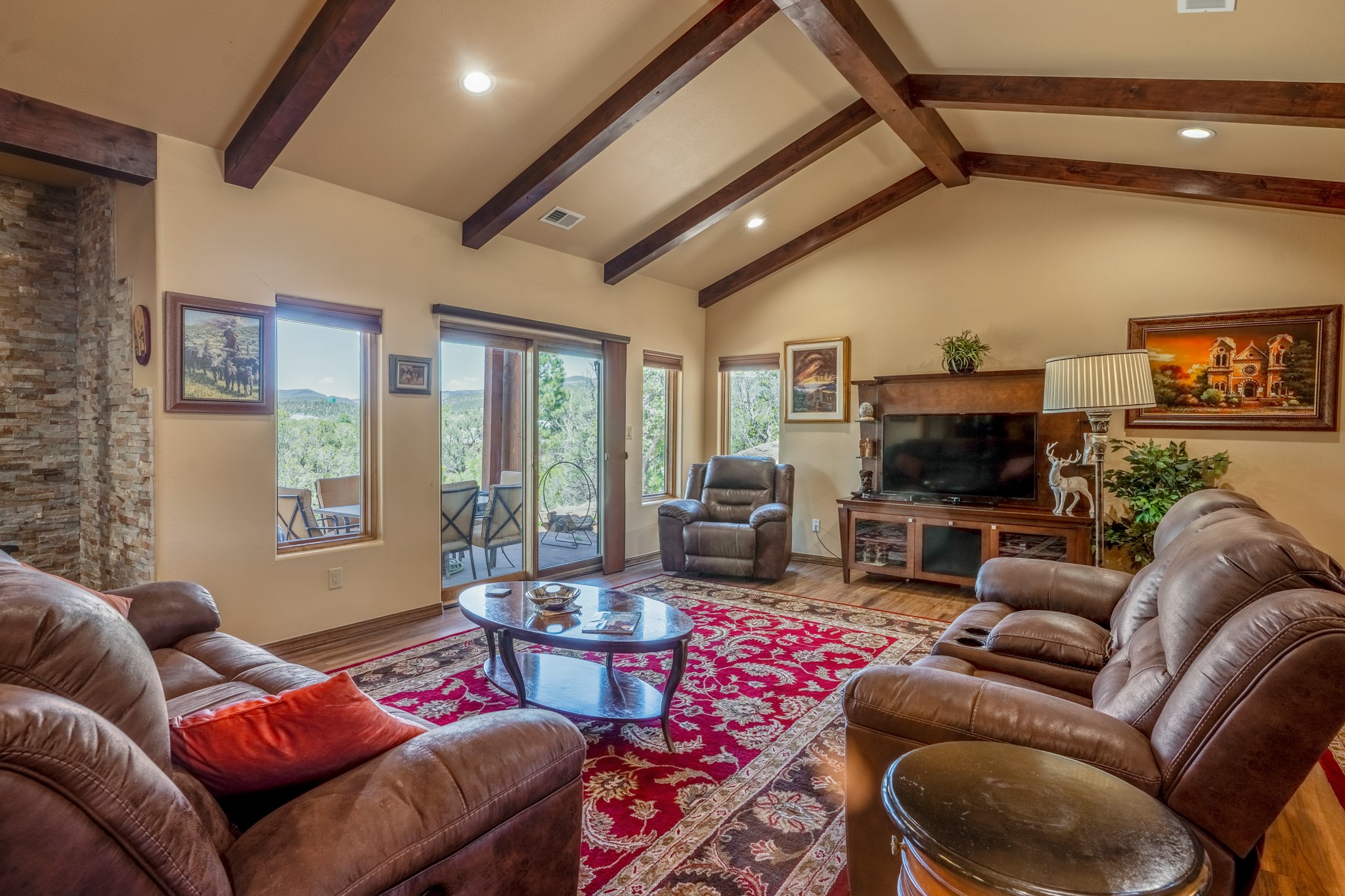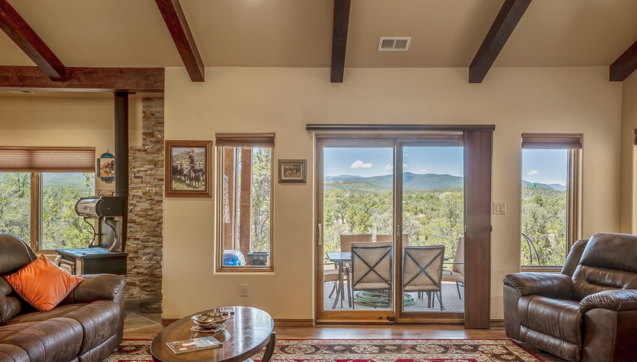 Gorgeous Pecos gem built in 2021 with wonderful views approximately 20 minutes from Santa Fe and is sited on a bit over an acre boasting 2312 +/- square feet, 3 bedrooms plus an office/work out room/playroom or a possible 4th bedroom, 3 bathrooms, and a direct entry finished 2-car garage into the large laundry room with granite counters and cabinets. This single level home offers an open concept kitchen with can and pendant lighting, beautiful granite counters, a huge island, soft close drawers and cabinets, eat-in kitchen nook and pantry. The living room with tall ceiling has wood beams and doors leading to the large rear covered porch perfect for viewing the amazing views. The split bedroom floorplan is perfect for privacy. The large owner's suite has an en-suite bath with dual sinks, granite counters, tiled shower, his and hers walk-in closets with built-ins and 2 separate commode closets. On the opposite side of the home, you will find 2 good sized guest bedrooms (1 with 2 walk-in closets) with a jack and jill full bath with double sinks and granite counters. The home has the Village of Pecos water and sewer, Mora San Miguel electric and propane for gas. Amenities/Features: Wood doors-Forced air heat with central refrigerated air conditioning-Pitched pro-panel roof-Pella windows and doors throughout-Formal dining room-Front and rear covered porches-Tile and wood laminate flooring and carpet in the bedrooms-Whole house water softener and so much more!