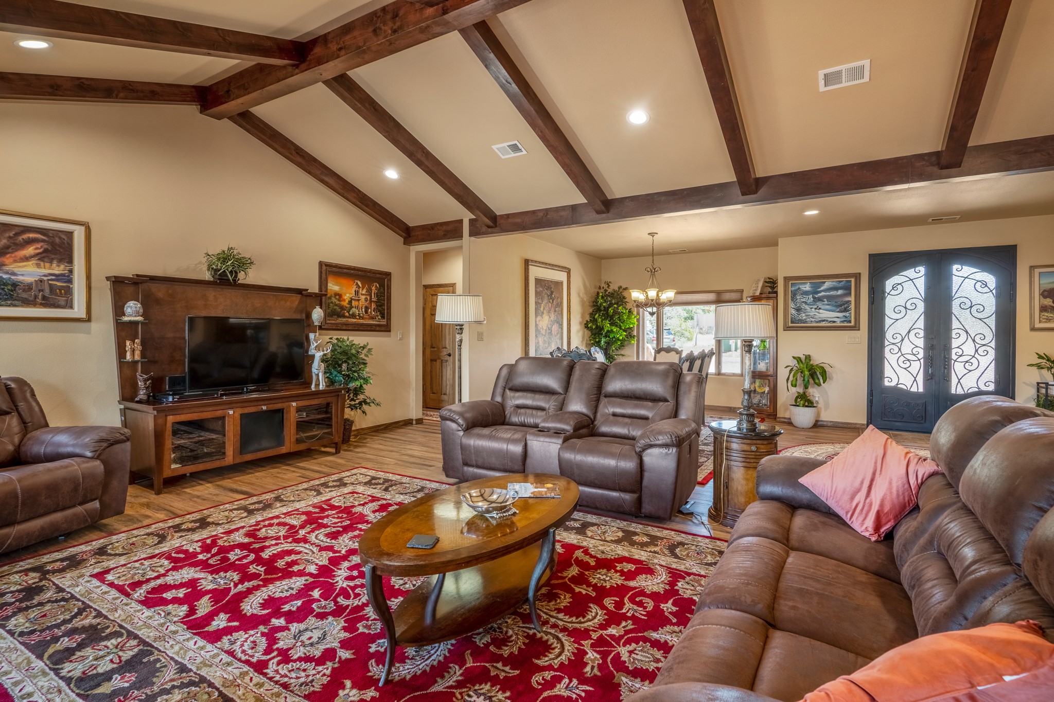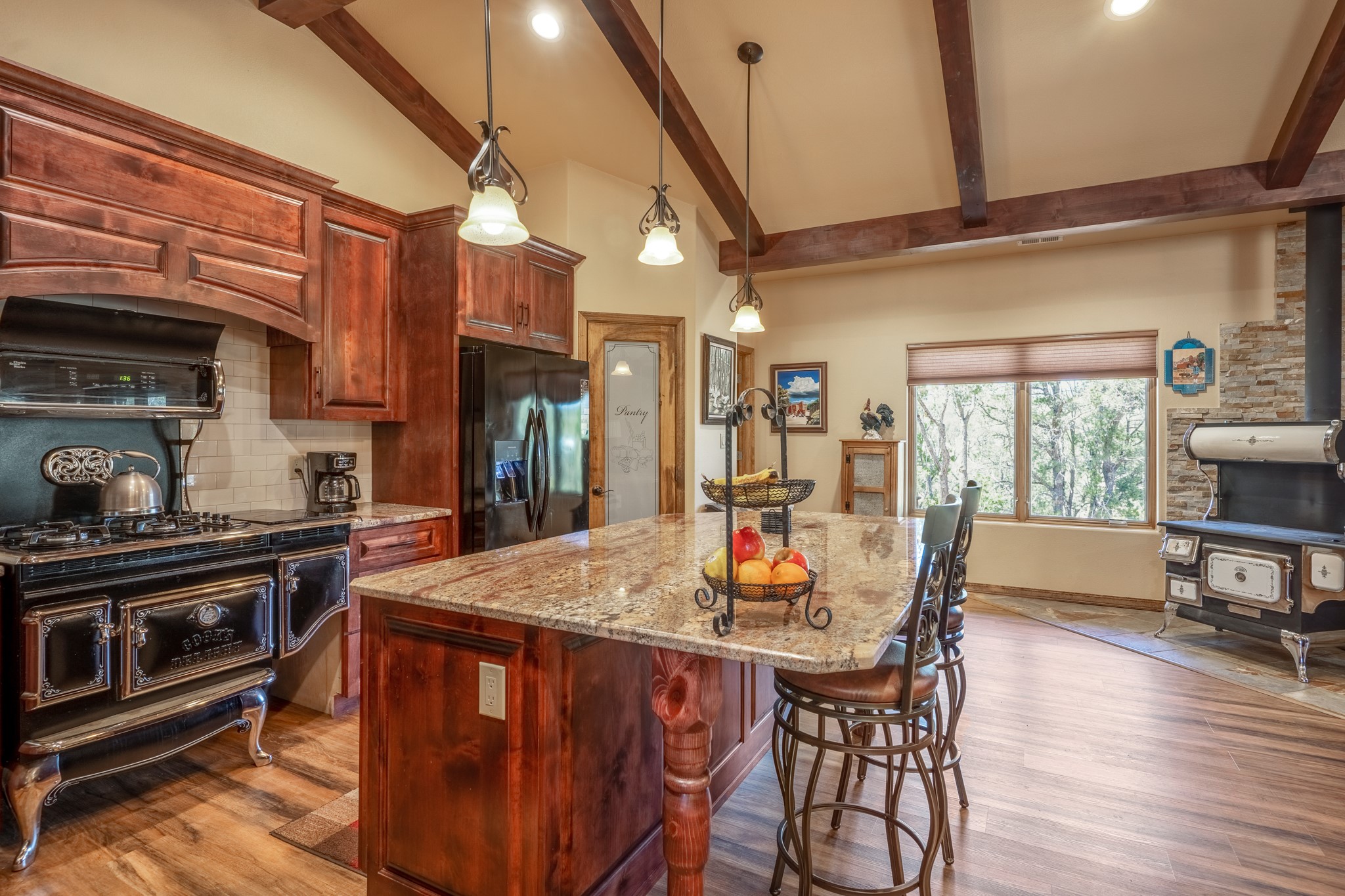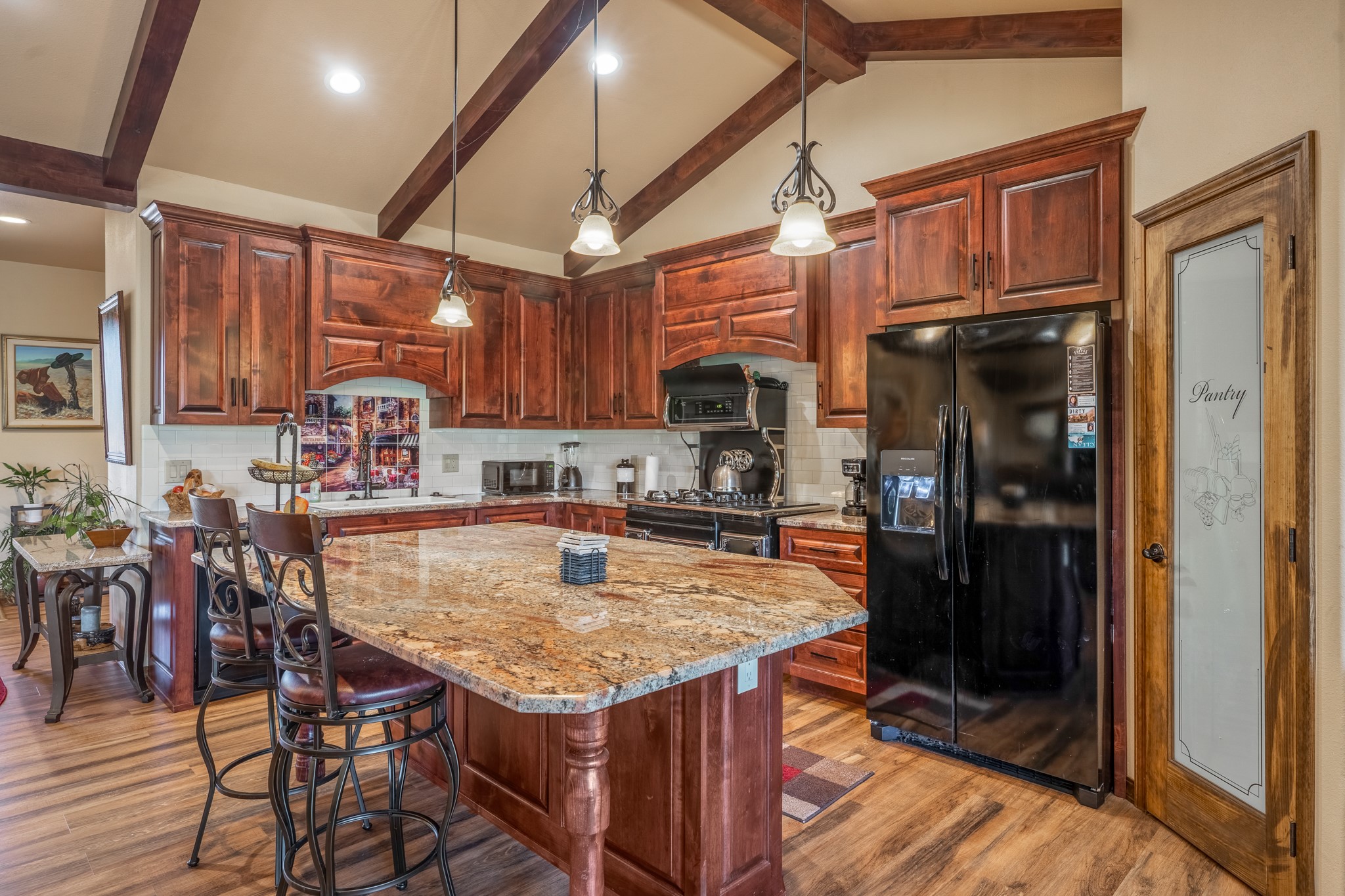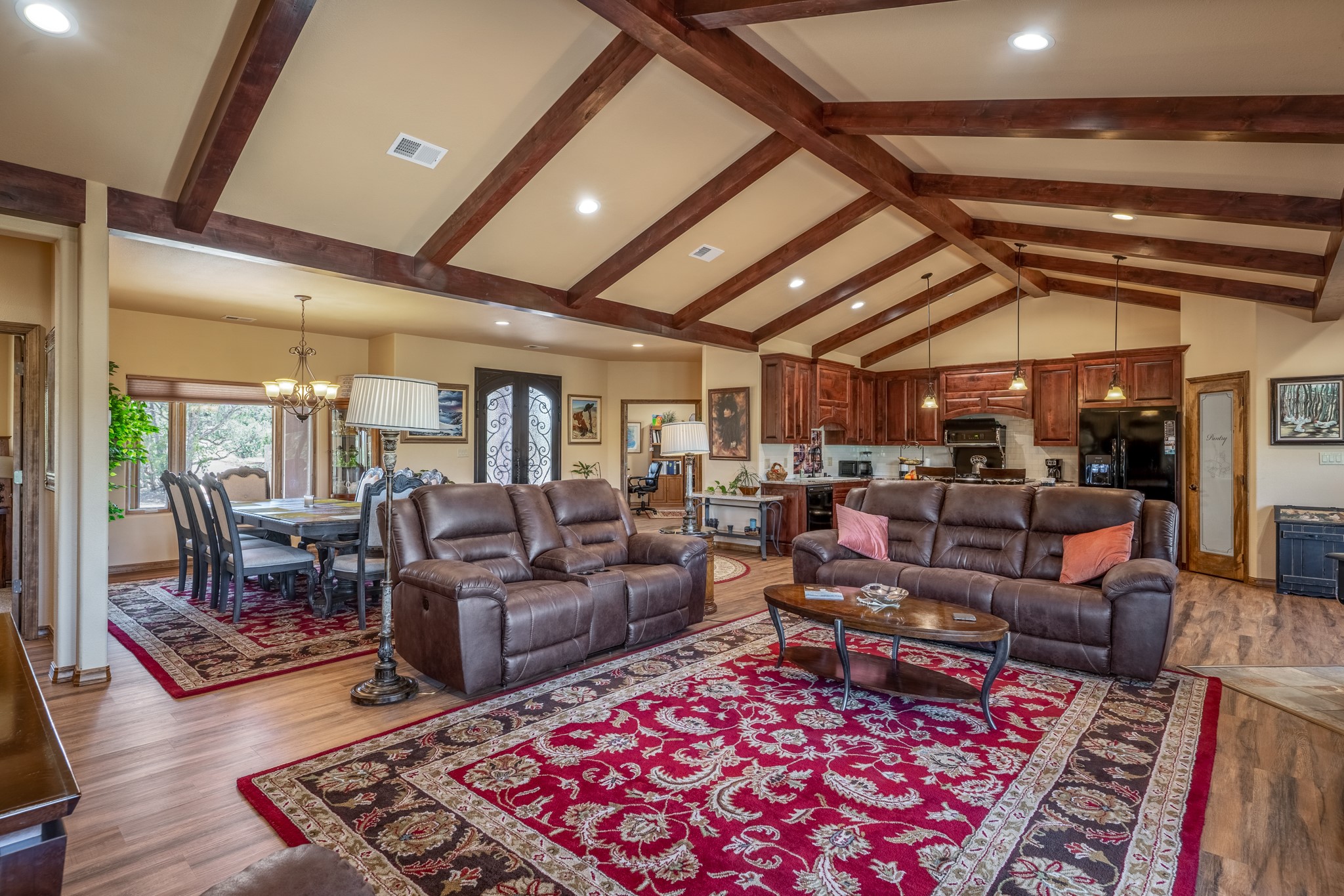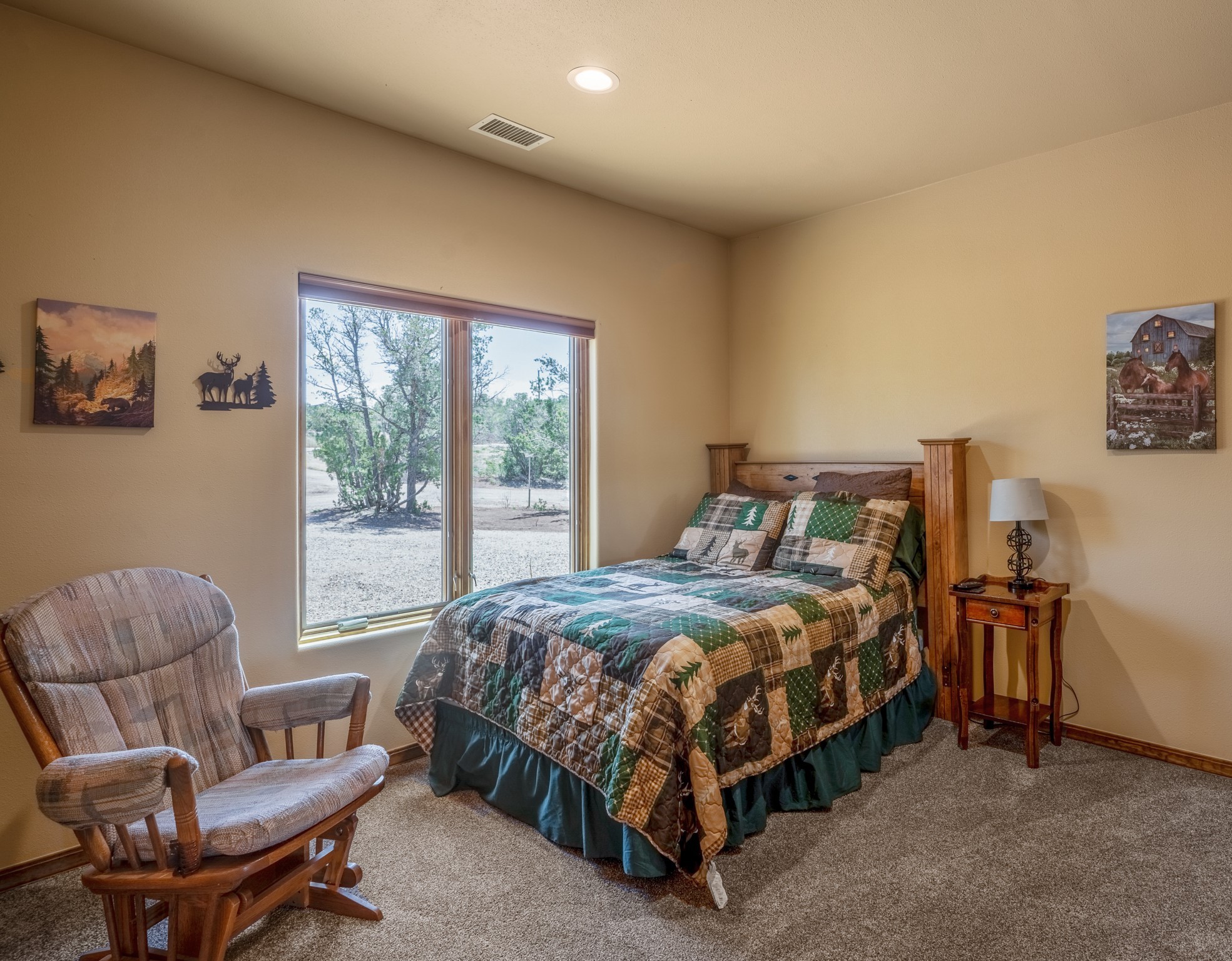 Gorgeous Pecos gem built in 2021 with wonderful views approximately 20 minutes from Santa Fe and is sited on a bit over an acre boasting 2312 +/- square feet, 3 bedrooms plus an office/work out room/playroom or a possible 4th bedroom, 3 bathrooms, and a direct entry finished 2-car garage into the large laundry room with granite counters and cabinets. This single level home offers an open concept kitchen with can and pendant lighting, beautiful granite counters, a huge island, soft close drawers and cabinets, eat-in kitchen nook and pantry. The living room with tall ceiling has wood beams and doors leading to the large rear covered porch perfect for viewing the amazing views. The split bedroom floorplan is perfect for privacy. The large owner's suite has an en-suite bath with dual sinks, granite counters, tiled shower, his and hers walk-in closets with built-ins and 2 separate commode closets. On the opposite side of the home, you will find 2 good sized guest bedrooms (1 with 2 walk-in closets) with a jack and jill full bath with double sinks and granite counters. The home has the Village of Pecos water and sewer, Mora San Miguel electric and propane for gas. Amenities/Features: Wood doors-Forced air heat with central refrigerated air conditioning-Pitched pro-panel roof-Pella windows and doors throughout-Formal dining room-Front and rear covered porches-Tile and wood laminate flooring and carpet in the bedrooms-Whole house water softener and so much more!