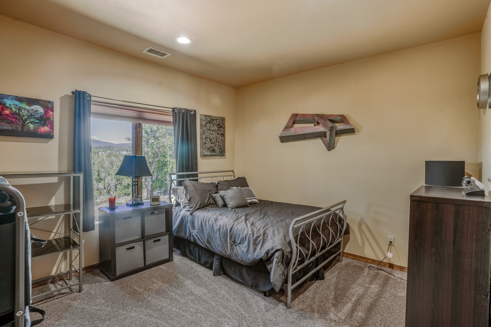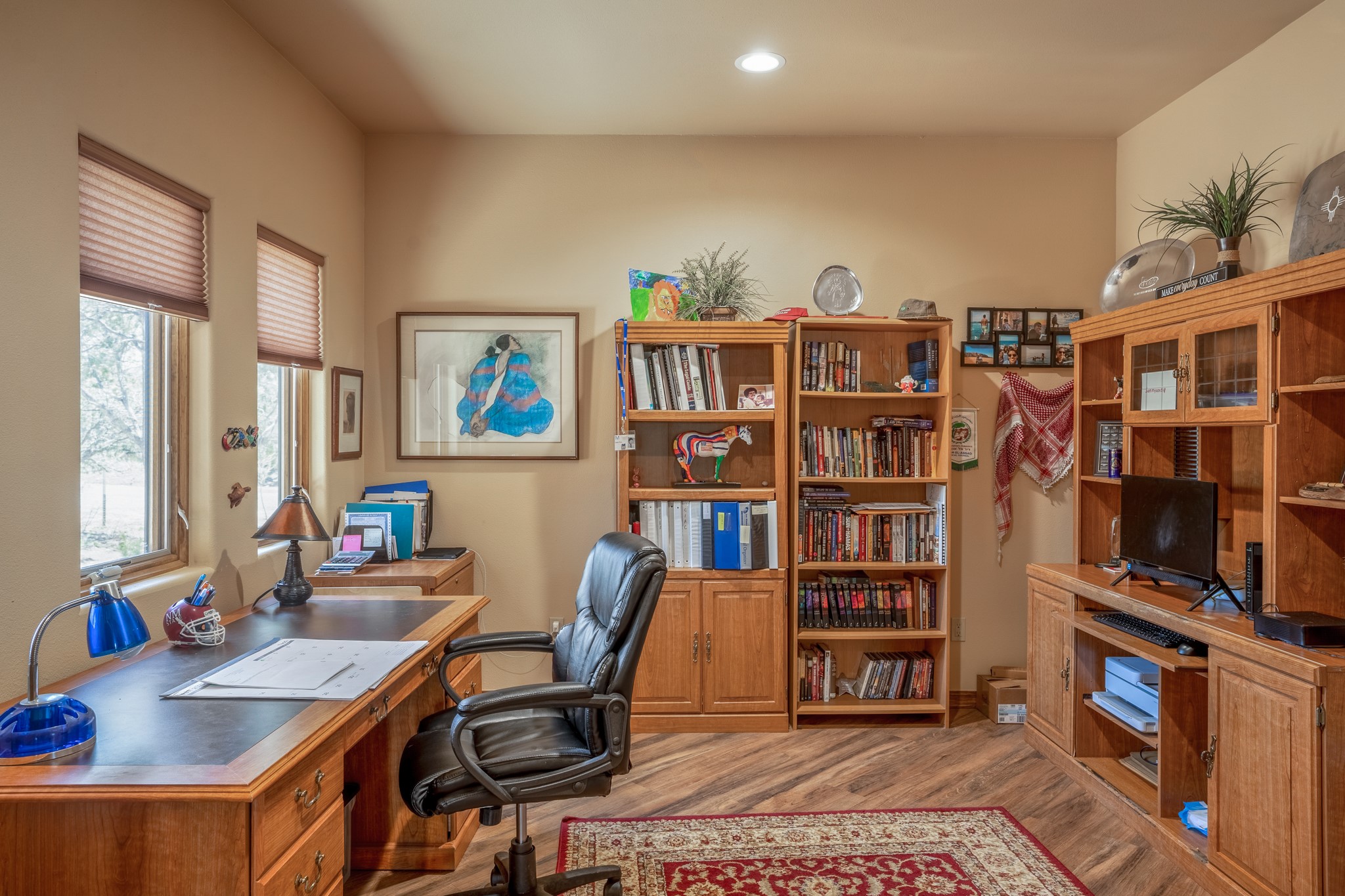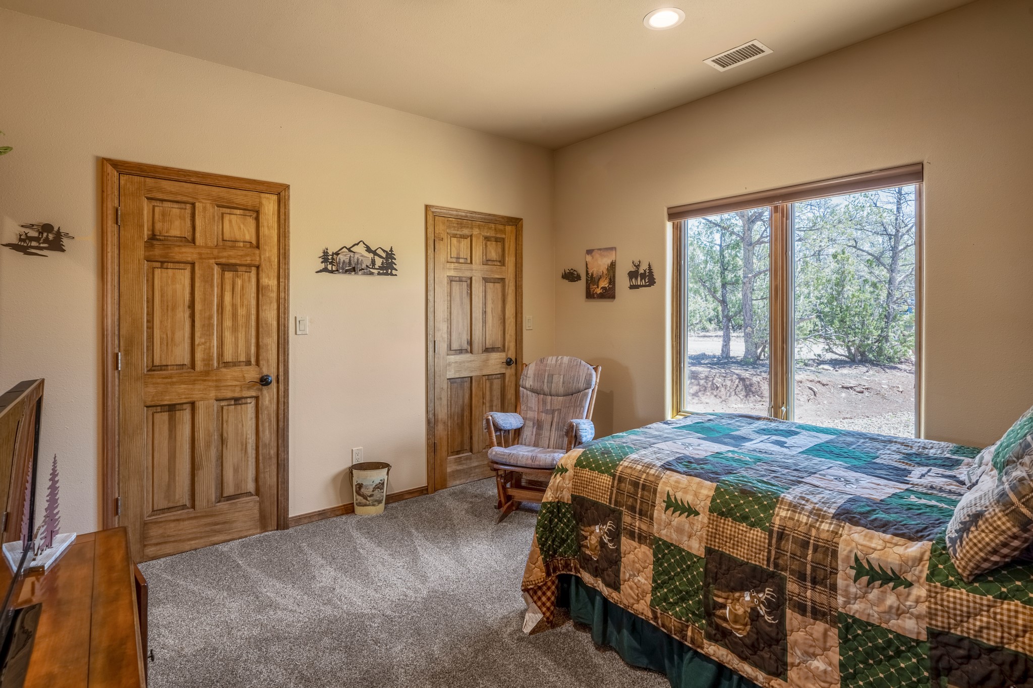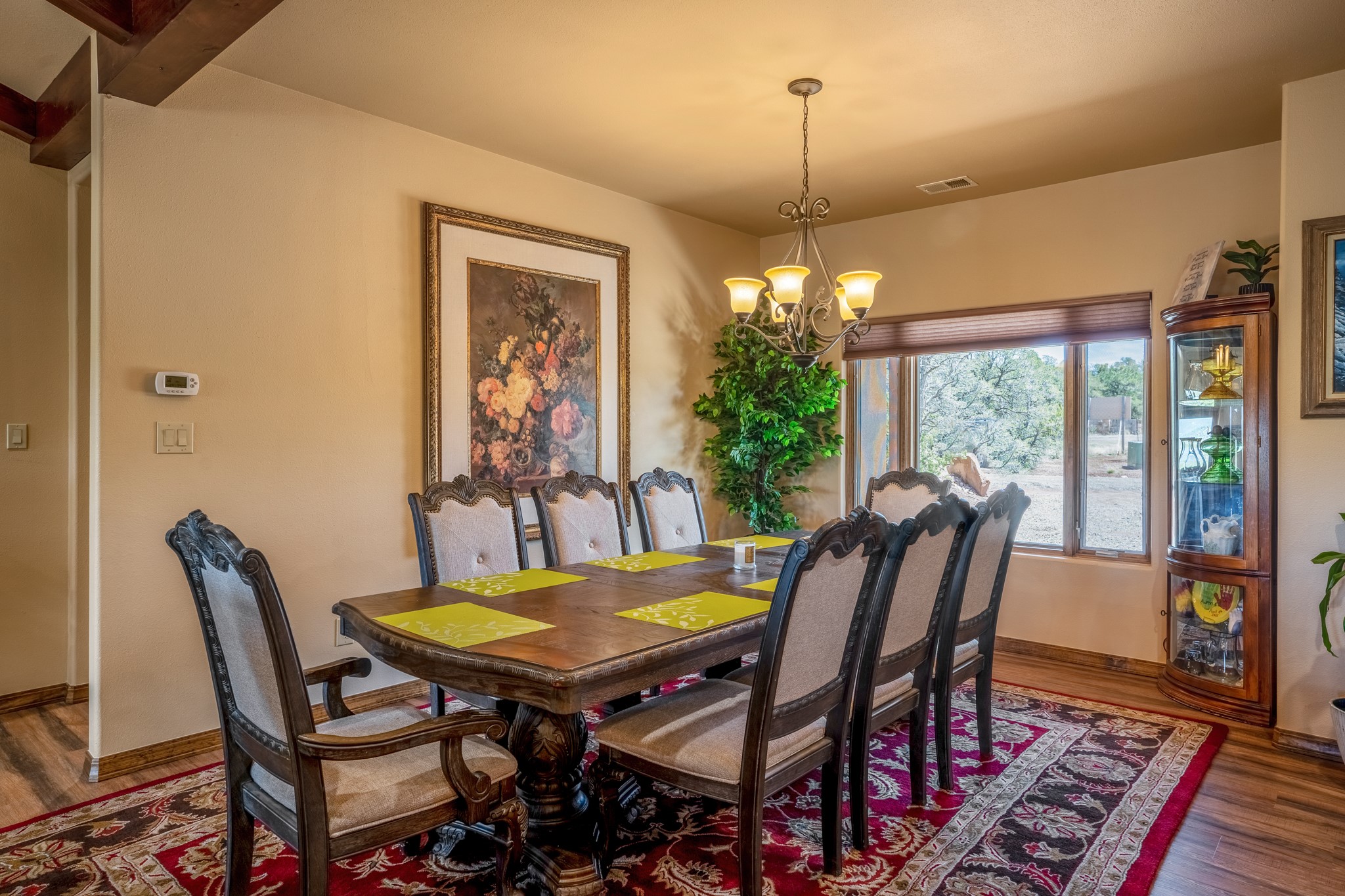 Gorgeous Pecos gem built in 2021 with wonderful views approximately 20 minutes from Santa Fe and is sited on a bit over an acre boasting 2312 +/- square feet, 3 bedrooms plus an office/work out room/playroom or a possible 4th bedroom, 3 bathrooms, and a direct entry finished 2-car garage into the large laundry room with granite counters and cabinets. This single level home offers an open concept kitchen with can and pendant lighting, beautiful granite counters, a huge island, soft close drawers and cabinets, eat-in kitchen nook and pantry. The living room with tall ceiling has wood beams and doors leading to the large rear covered porch perfect for viewing the amazing views. The split bedroom floorplan is perfect for privacy. The large owner's suite has an en-suite bath with dual sinks, granite counters, tiled shower, his and hers walk-in closets with built-ins and 2 separate commode closets. On the opposite side of the home, you will find 2 good sized guest bedrooms (1 with 2 walk-in closets) with a jack and jill full bath with double sinks and granite counters. The home has the Village of Pecos water and sewer, Mora San Miguel electric and propane for gas. Amenities/Features: Wood doors-Forced air heat with central refrigerated air conditioning-Pitched pro-panel roof-Pella windows and doors throughout-Formal dining room-Front and rear covered porches-Tile and wood laminate flooring and carpet in the bedrooms-Whole house water softener and so much more!