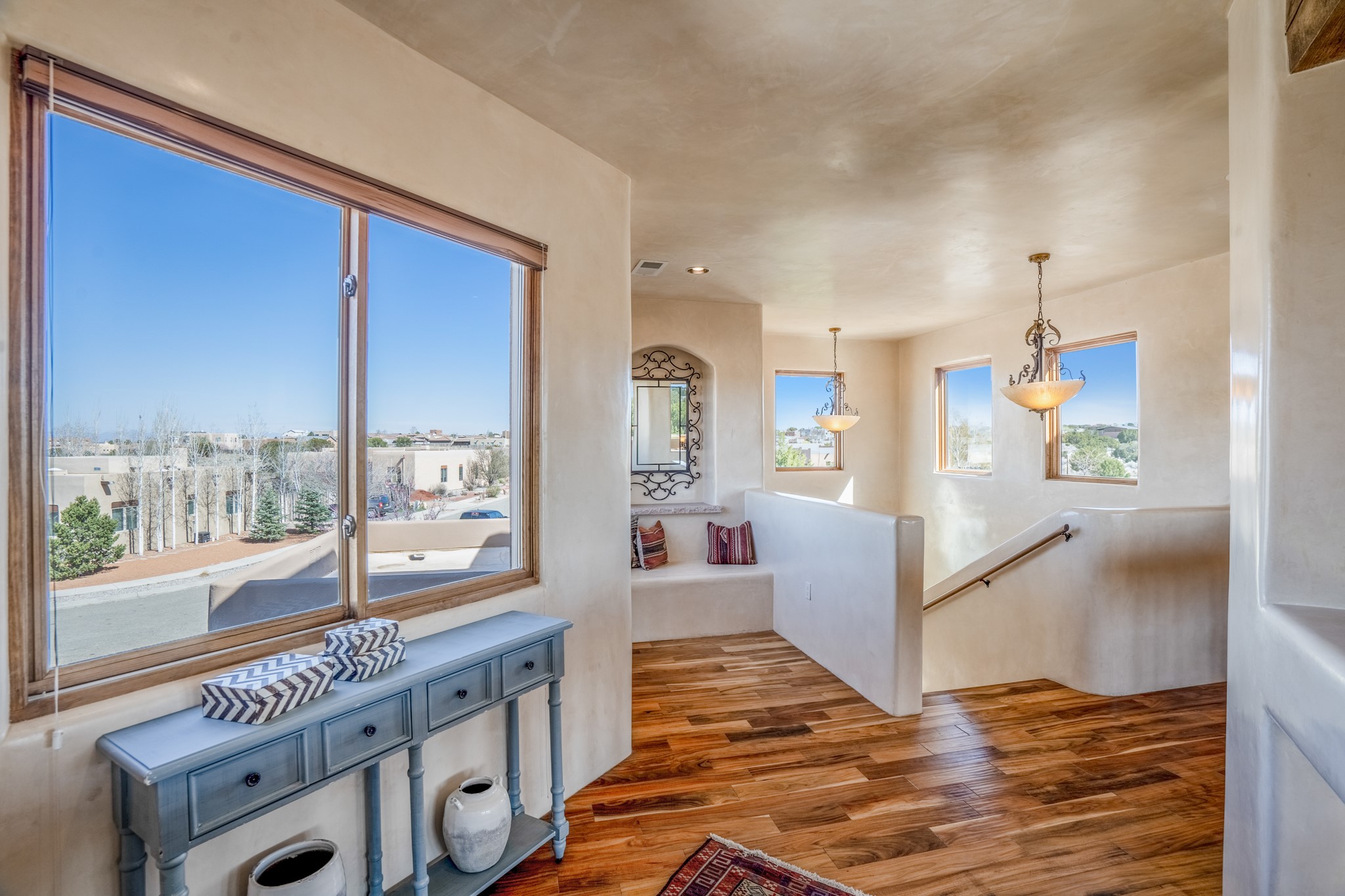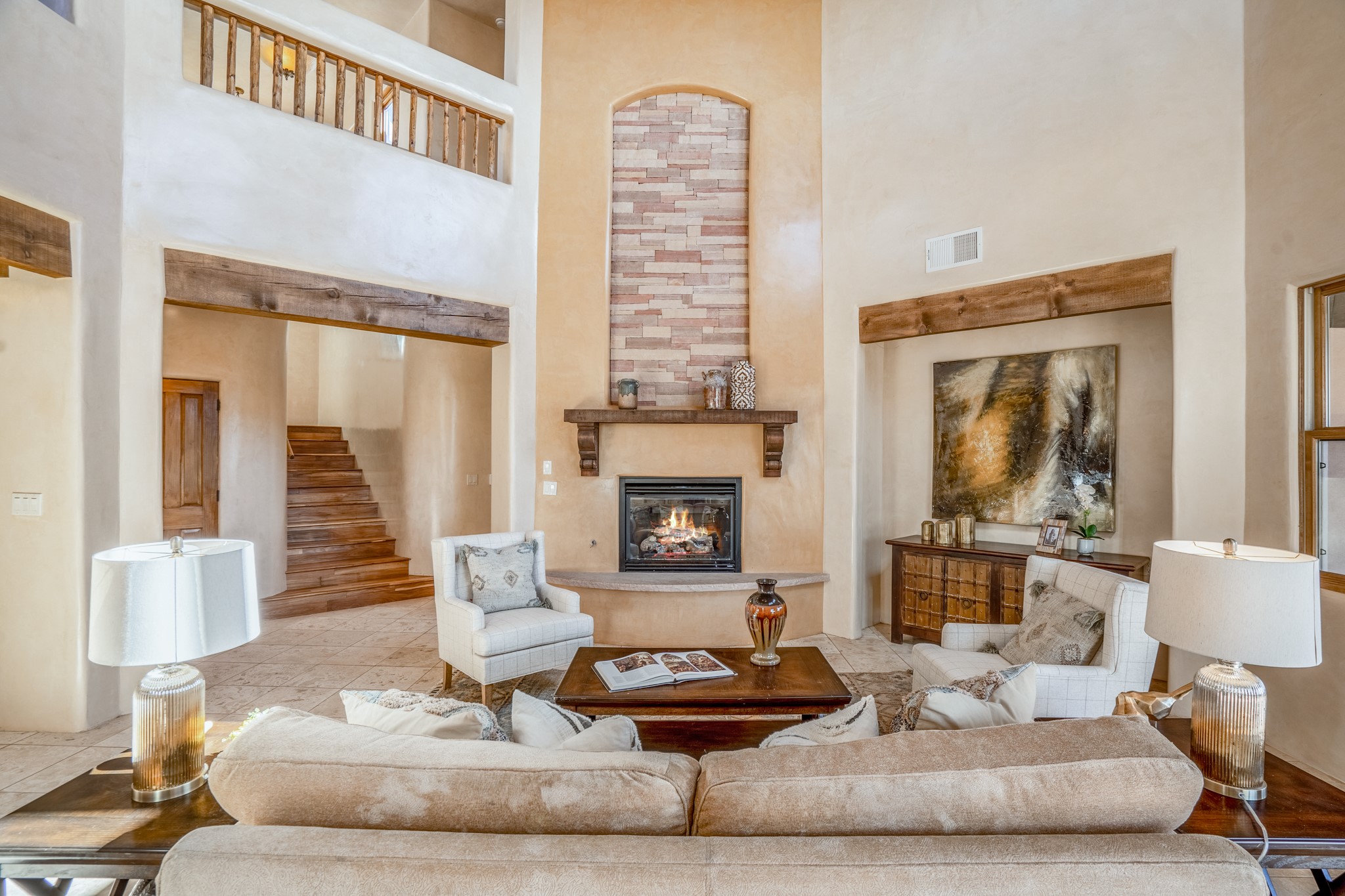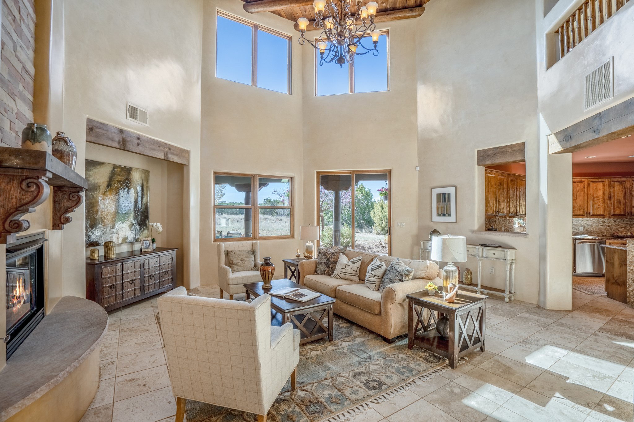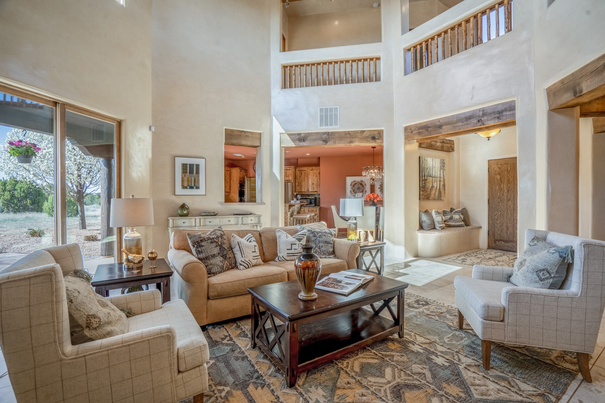 Located on possibly the best lot in La Pradera this spacious home features warm plaster walls throughout the main living areas, soaring 24 foot ceilings with Vigas and T&G in the living room, 2 fireplaces, nichos, lovely wood and tile floors throughout as well as many other custom features. The master suite is located on the main level as well as an office or the 5th bedroom. Bedroom 2 and 3 share a jack and jill bathroom, and bedroom 4 has its own full bath. Located on a green belt this home has amazing sunrise views and gorgeous Mountain views from just about every room in the house. New TPO roof, tankless water heater and new STO Stucco color coat.