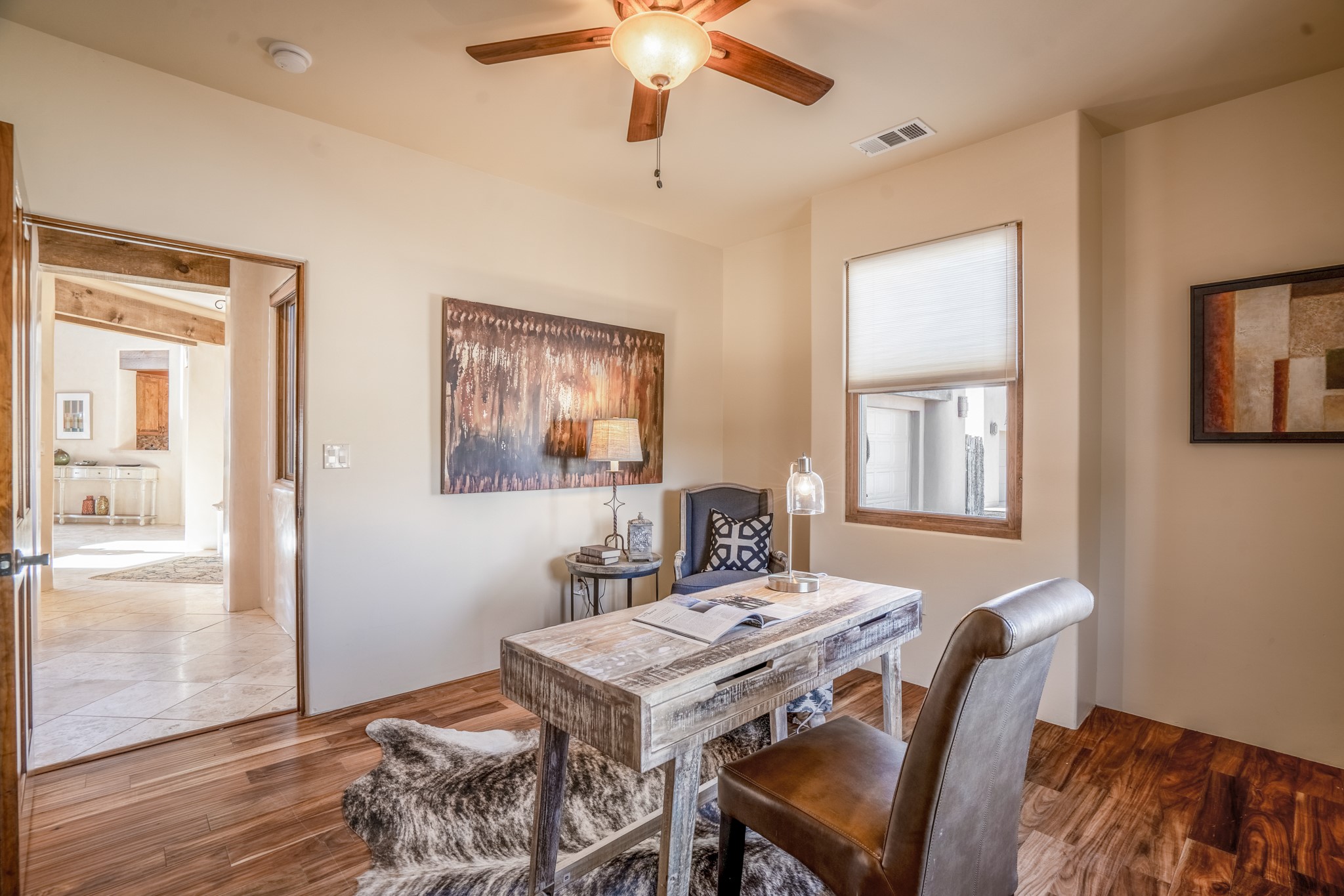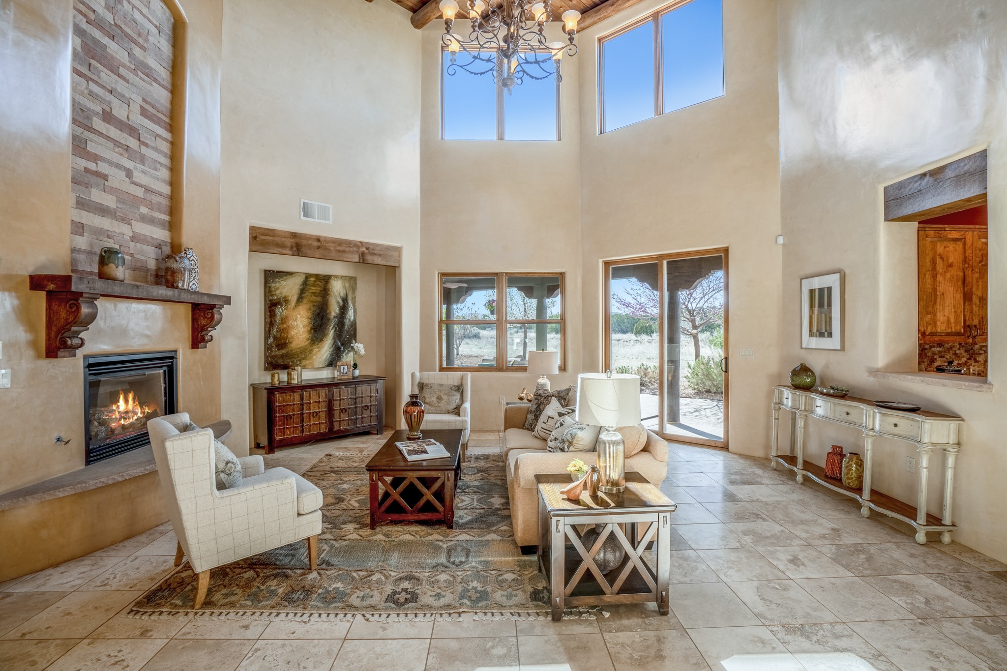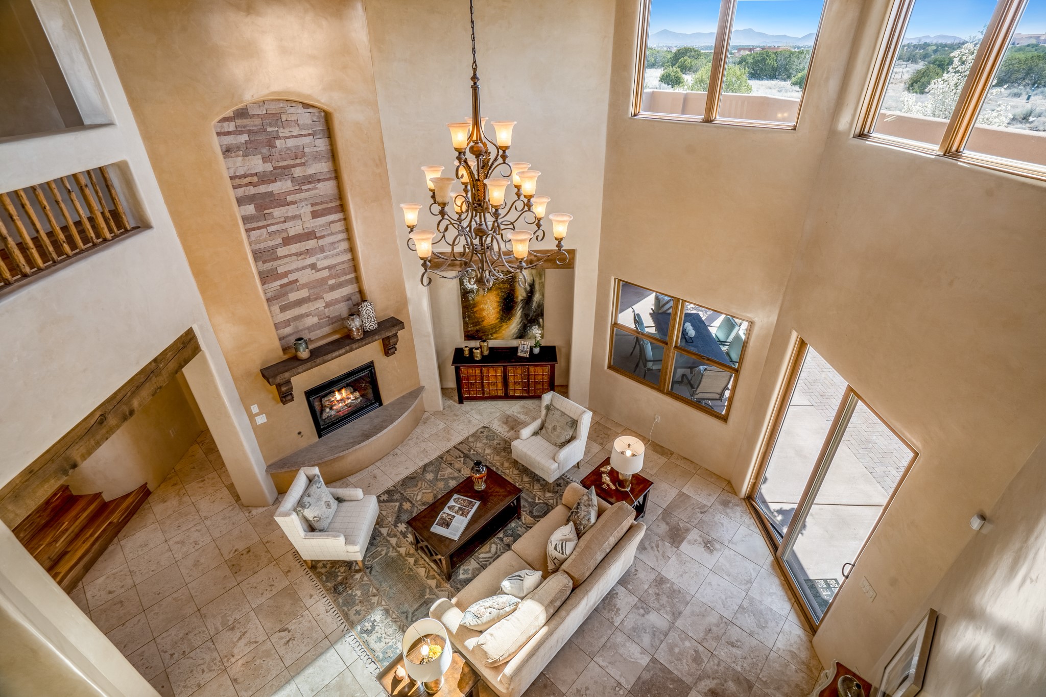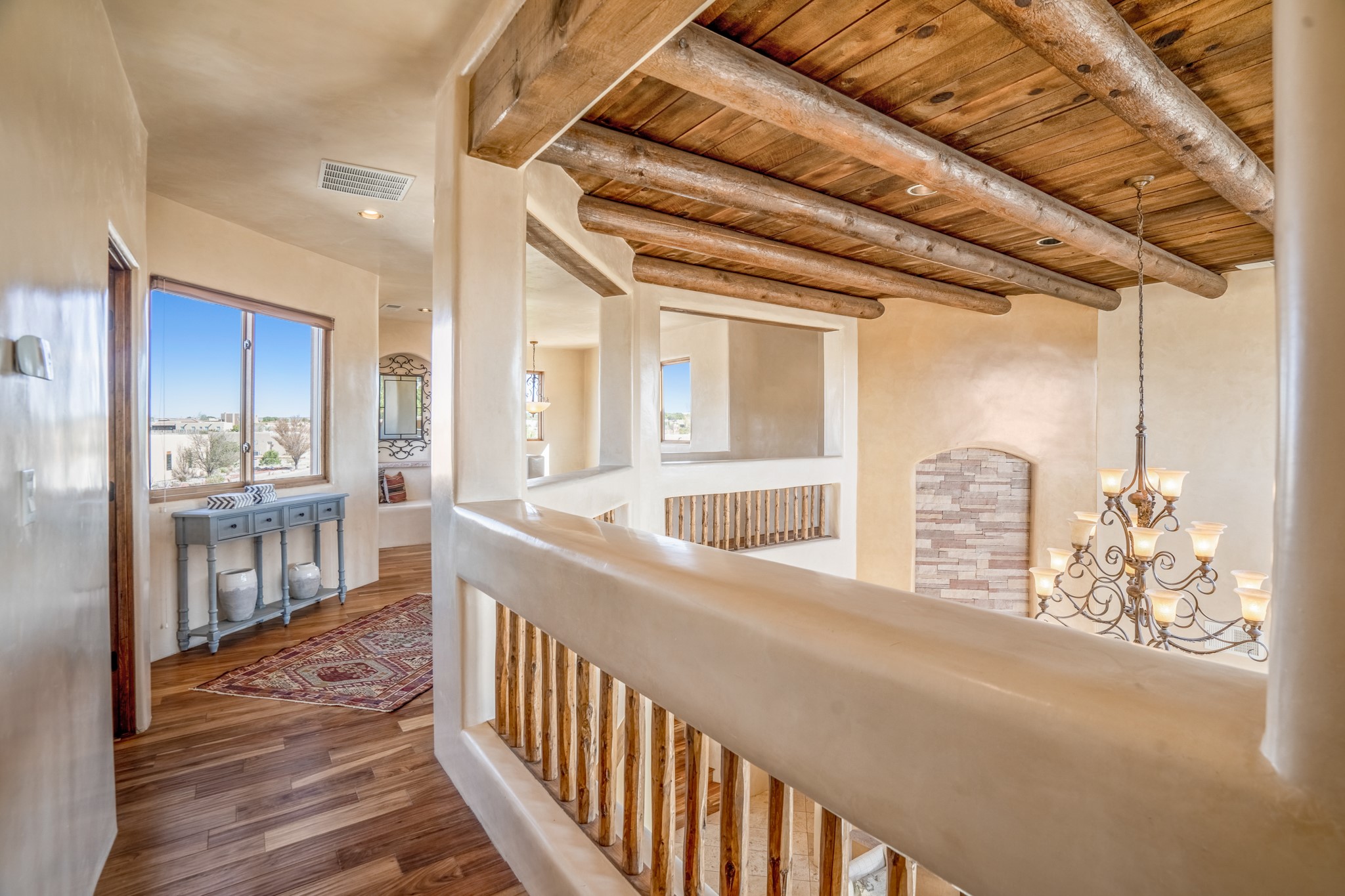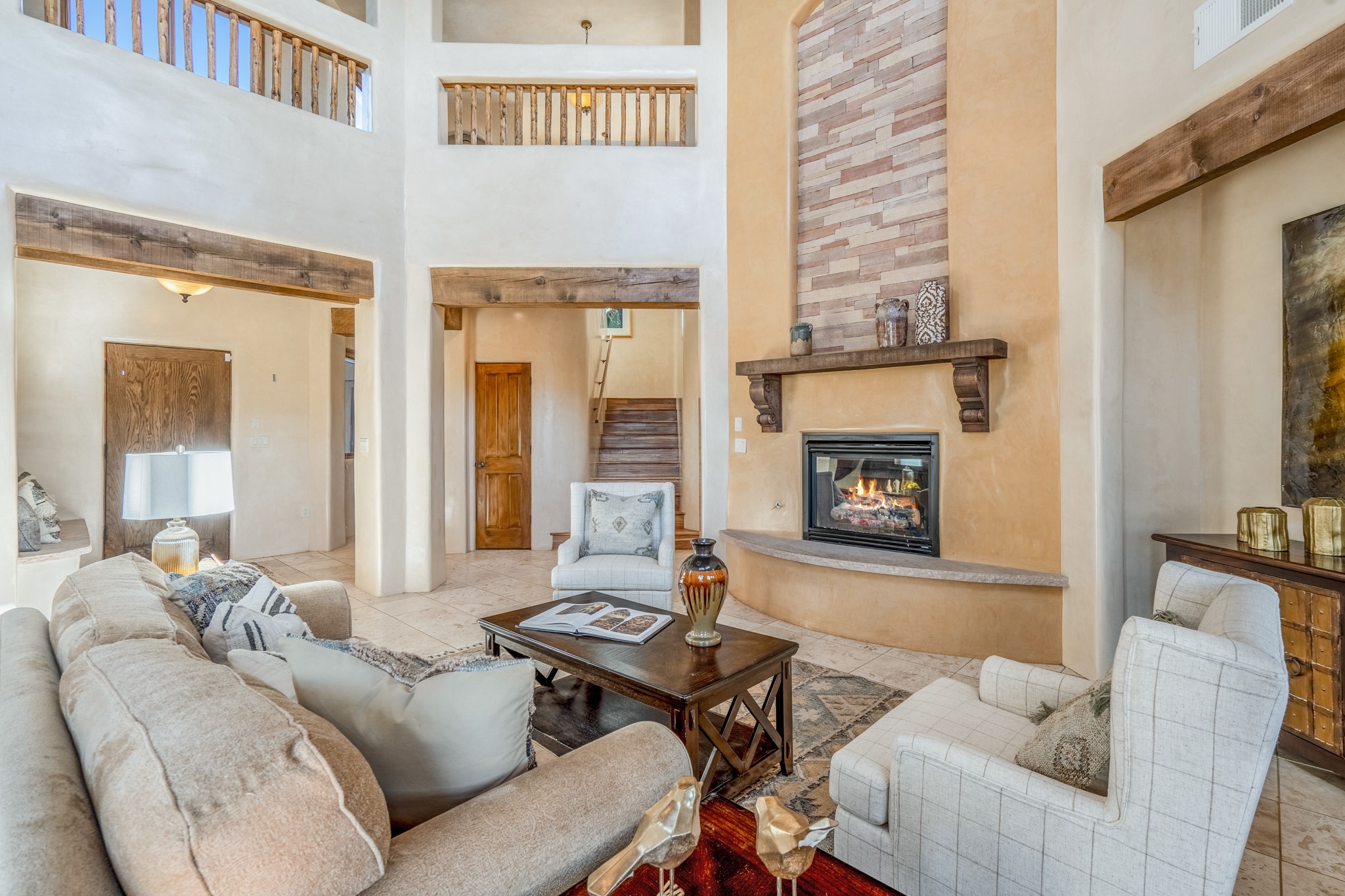 Located on possibly the best lot in La Pradera this spacious home features warm plaster walls throughout the main living areas, soaring 24 foot ceilings with Vigas and T&G in the living room, 2 fireplaces, nichos, lovely wood and tile floors throughout as well as many other custom features. The master suite is located on the main level as well as an office or the 5th bedroom. Bedroom 2 and 3 share a jack and jill bathroom, and bedroom 4 has its own full bath. Located on a green belt this home has amazing sunrise views and gorgeous Mountain views from just about every room in the house. New TPO roof, tankless water heater and new STO Stucco color coat.