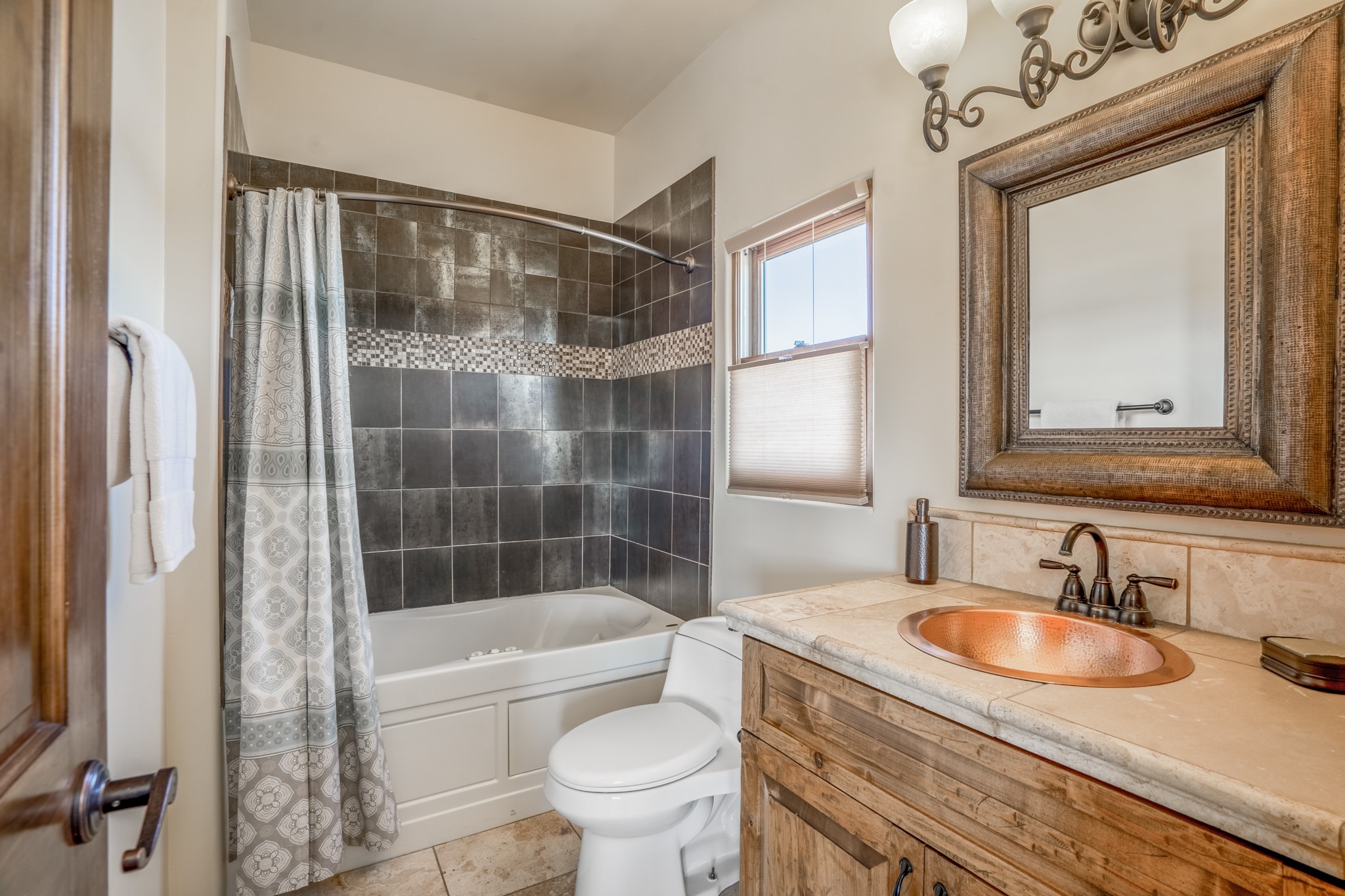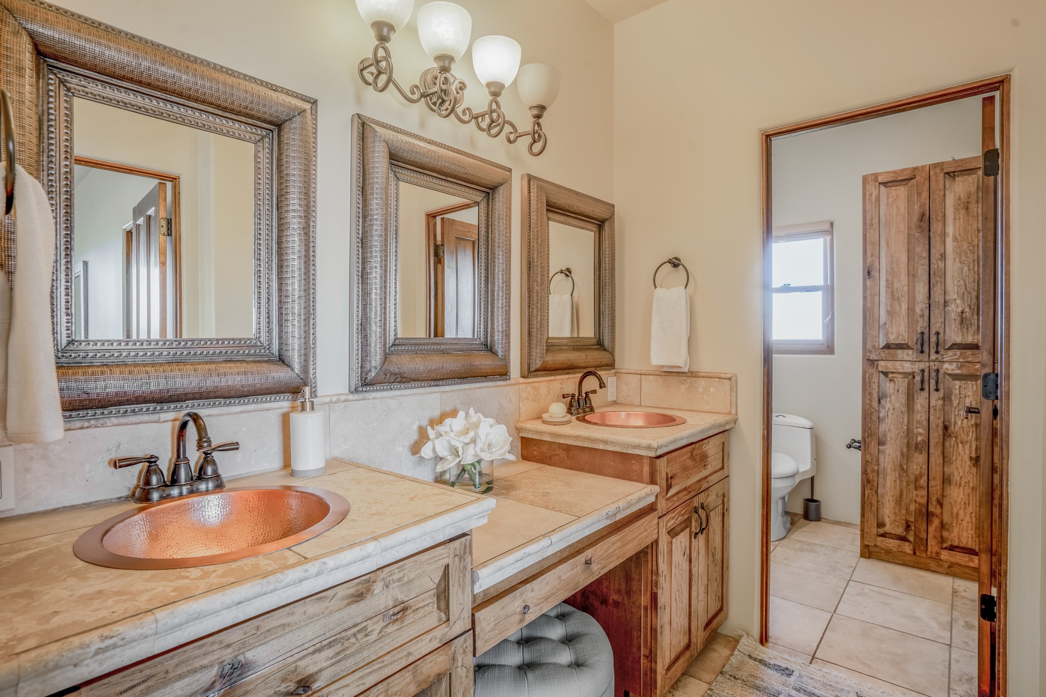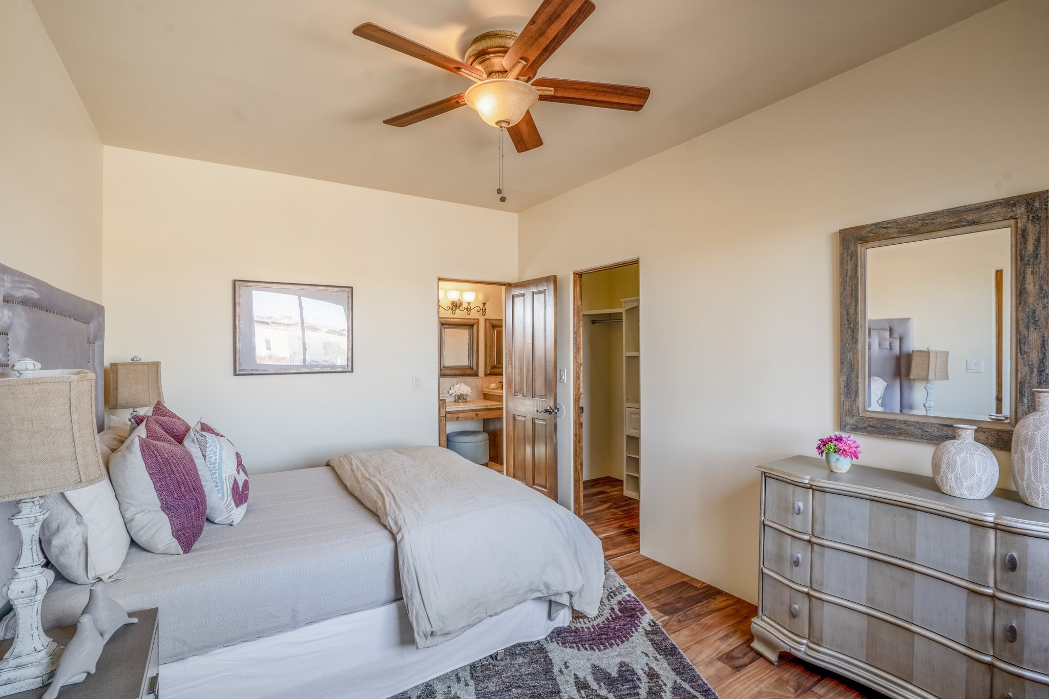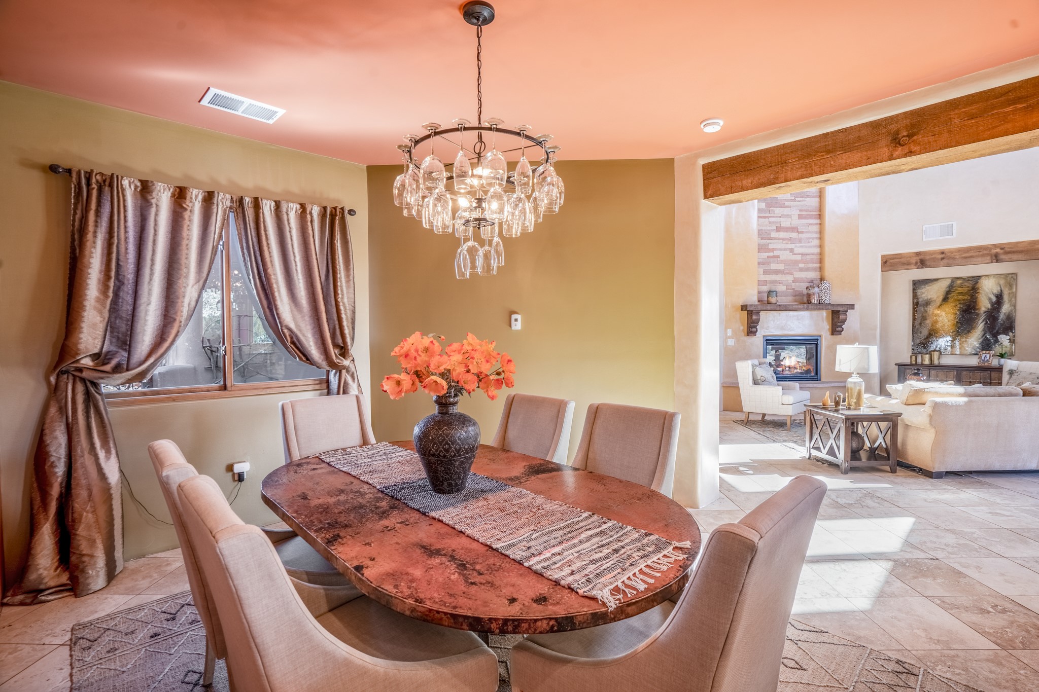 Located on possibly the best lot in La Pradera this spacious home features warm plaster walls throughout the main living areas, soaring 24 foot ceilings with Vigas and T&G in the living room, 2 fireplaces, nichos, lovely wood and tile floors throughout as well as many other custom features. The master suite is located on the main level as well as an office or the 5th bedroom. Bedroom 2 and 3 share a jack and jill bathroom, and bedroom 4 has its own full bath. Located on a green belt this home has amazing sunrise views and gorgeous Mountain views from just about every room in the house. New TPO roof, tankless water heater and new STO Stucco color coat.