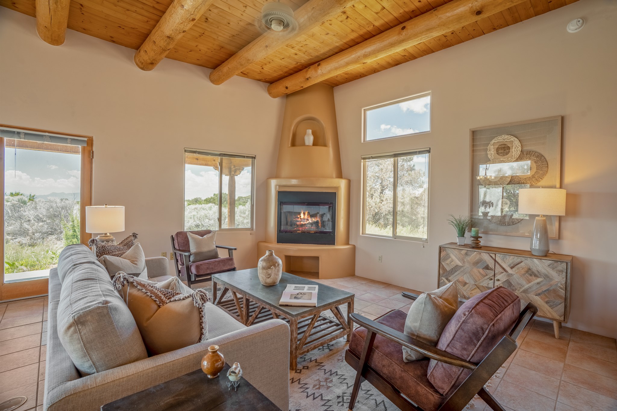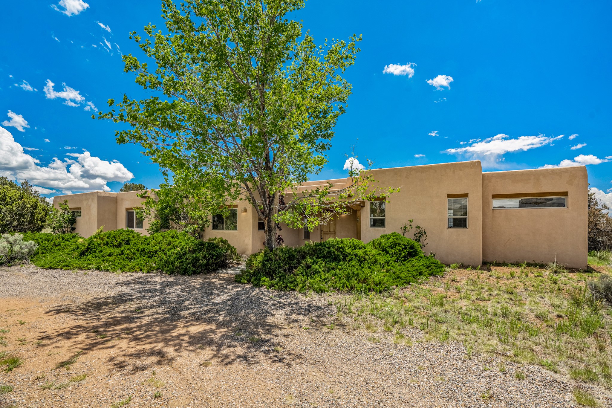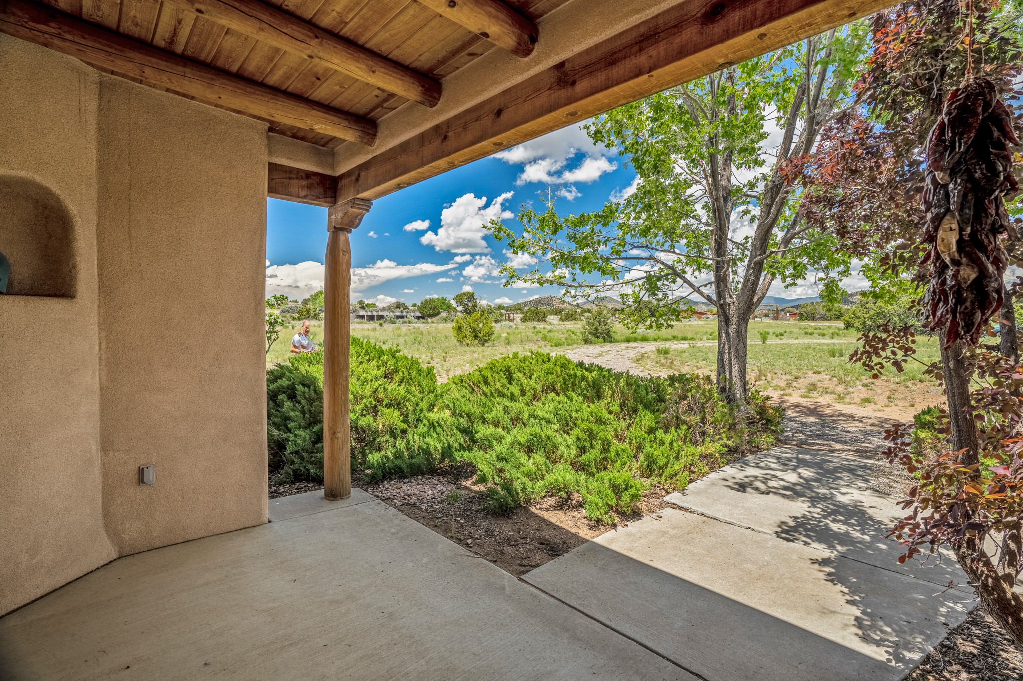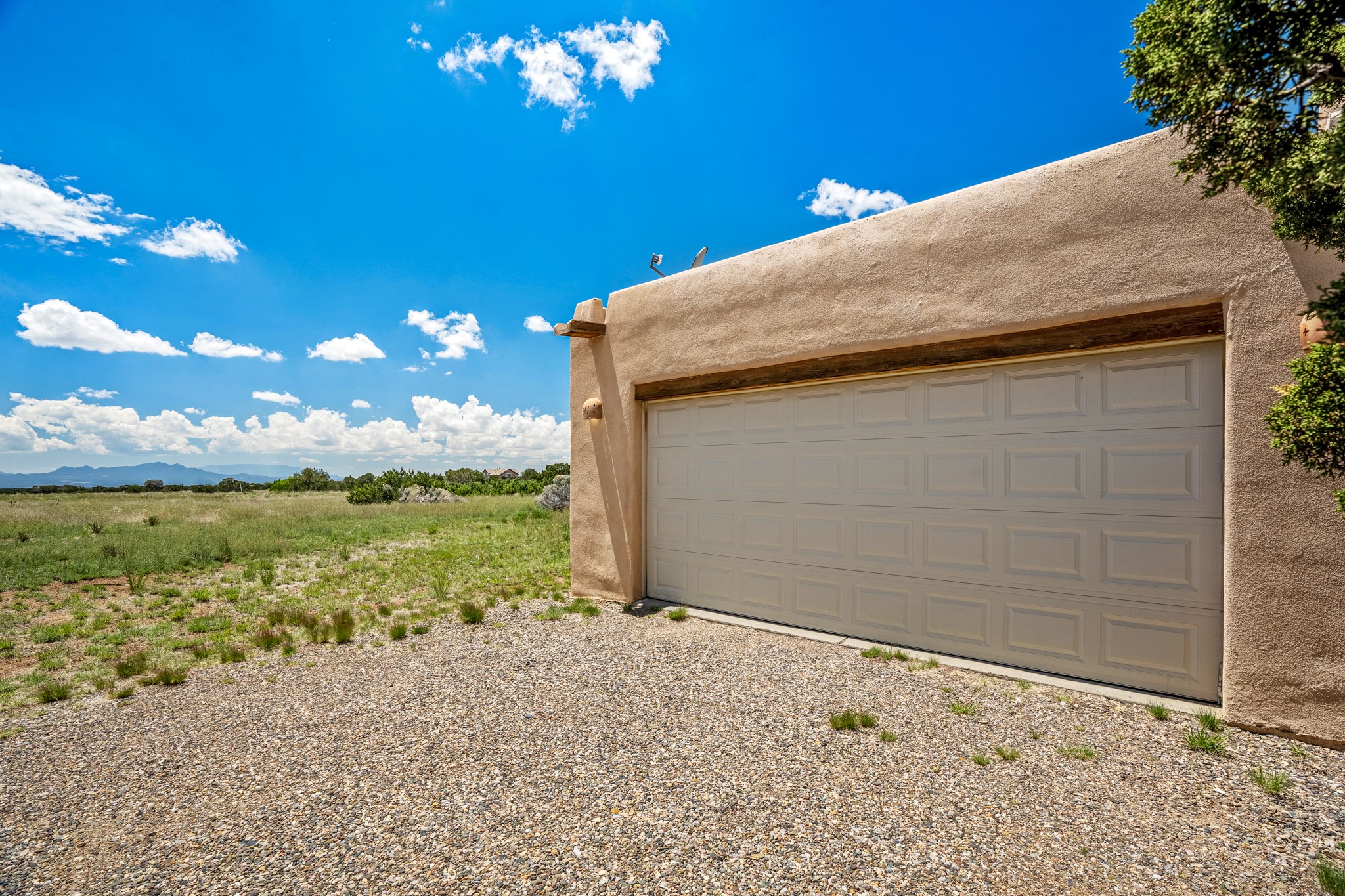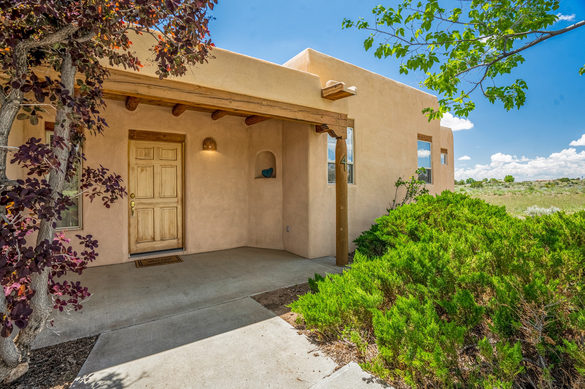 Welcome home to La Paz at Eldorado. This single level three bedroom, two bath property is loaded with Santa Fe charm! The well designed floor plan includes an open living & dining room with a kiva fireplace, bright kitchen with great storage & counter space, and a large portal overlooking a neighborhood greenbelt perfect for entertaining. The primary suite is thoughtfully separated from the other bedrooms and includes vigas, an ensuite bathroom with a soaking tub, shower, walk-in closet and double vanities along with stunning views! The two additional bedrooms are adjacent to the kitchen and share their own full bathroom, continue down the hall to find a laundry/mudroom and access to the two car garage. There are views of the Sangre de Cristo foothills to the Northeast from the bedrooms & entry along with Southwestern views from the entertaining spaces that are perfect to capture the sunset. Sited on 2.8 acres and just minutes from Eldorado's Agora & La Tienda shopping and dining.