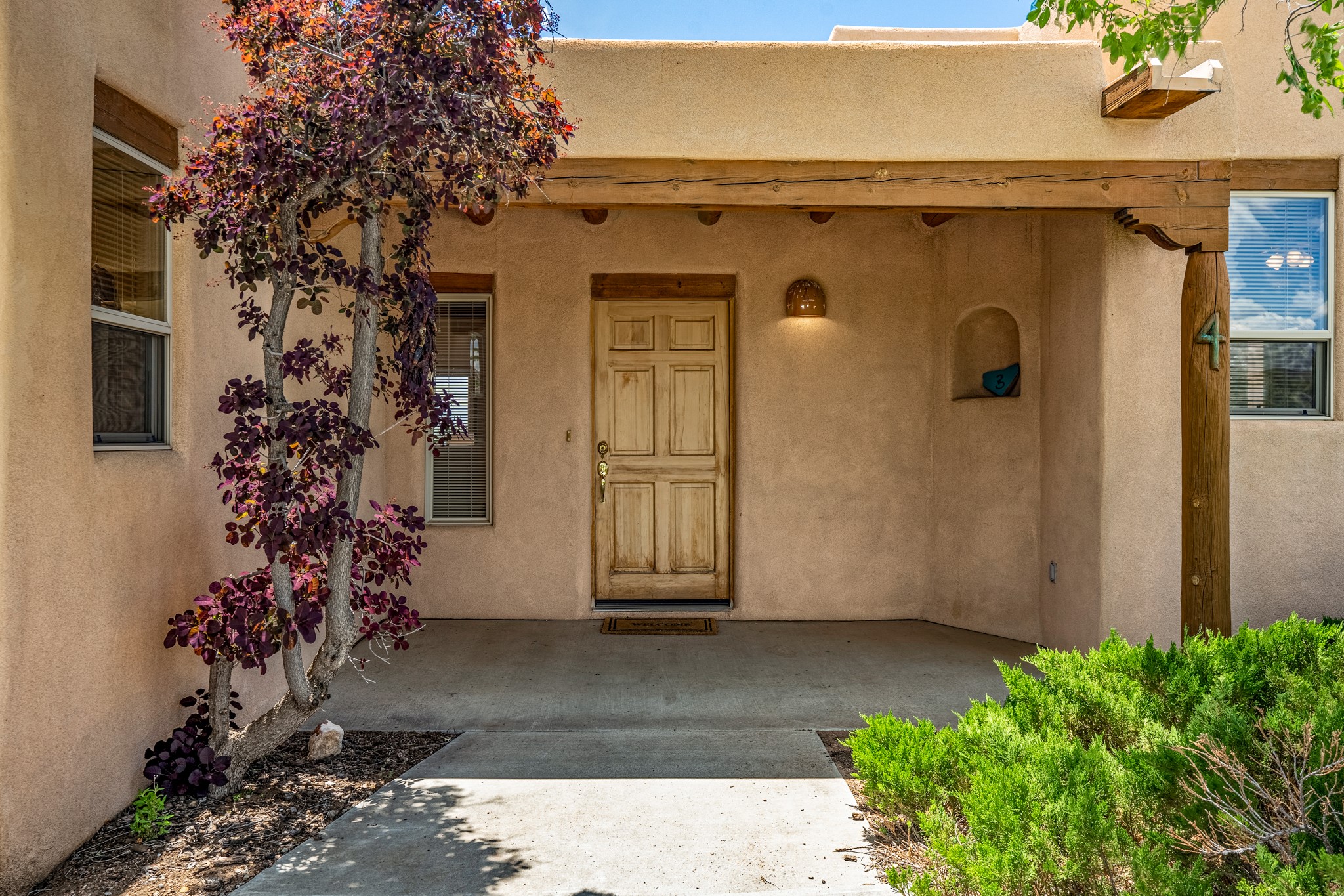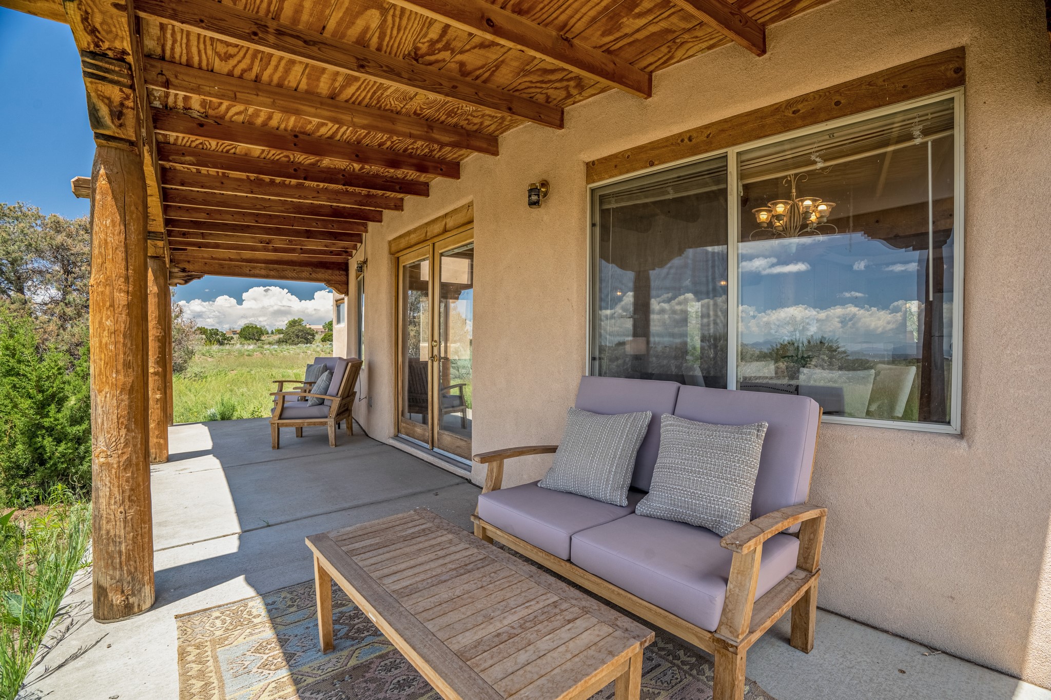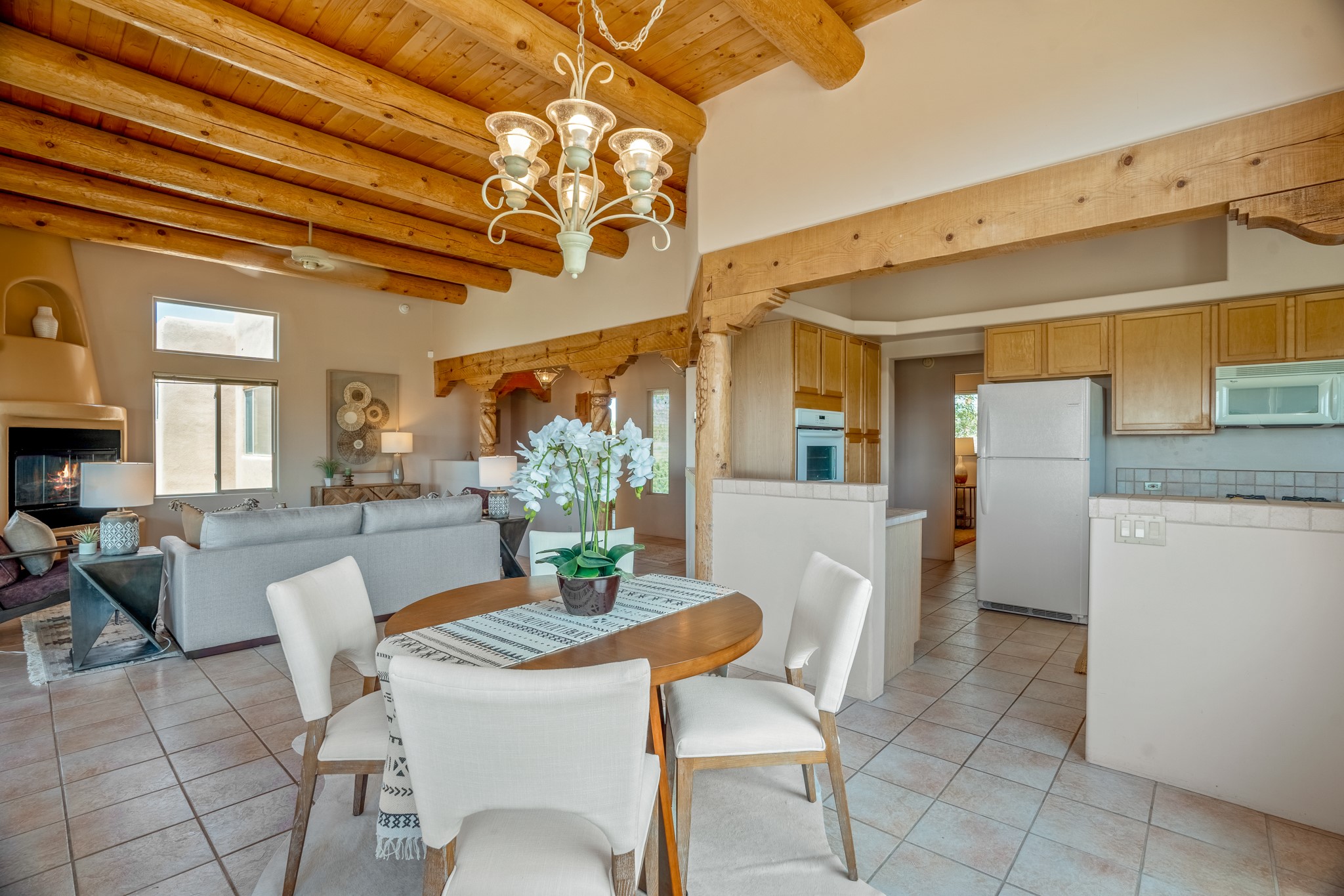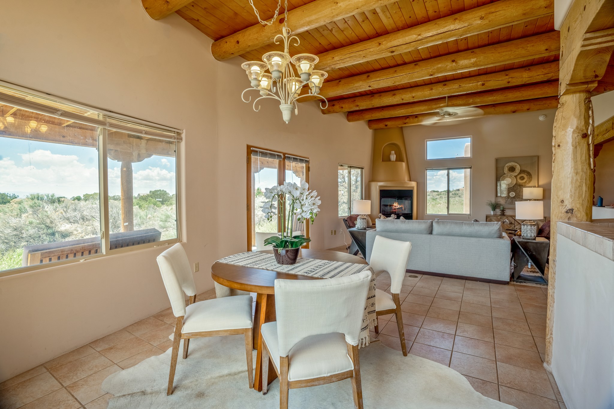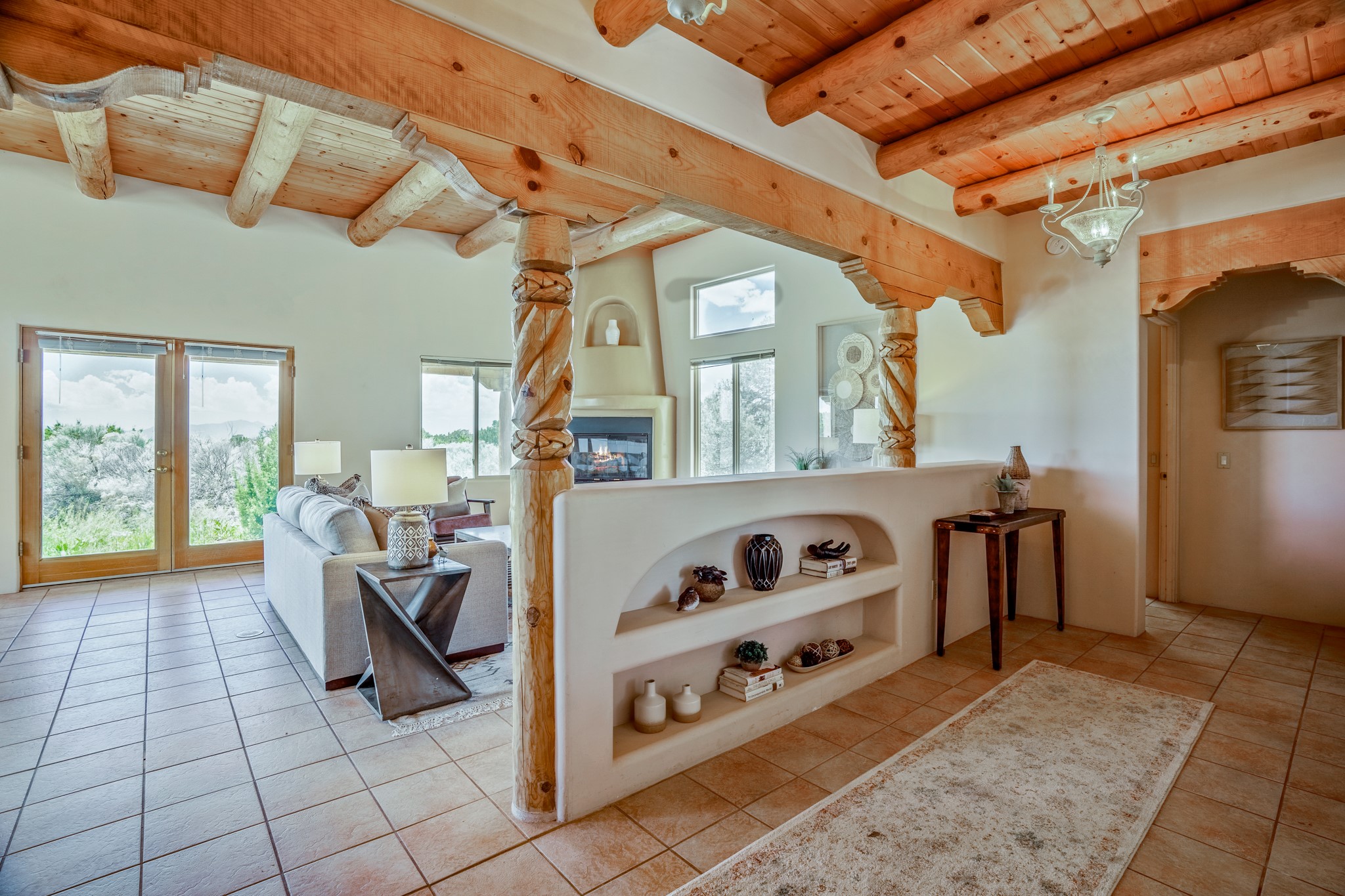 Welcome home to La Paz at Eldorado. This single level three bedroom, two bath property is loaded with Santa Fe charm! The well designed floor plan includes an open living & dining room with a kiva fireplace, bright kitchen with great storage & counter space, and a large portal overlooking a neighborhood greenbelt perfect for entertaining. The primary suite is thoughtfully separated from the other bedrooms and includes vigas, an ensuite bathroom with a soaking tub, shower, walk-in closet and double vanities along with stunning views! The two additional bedrooms are adjacent to the kitchen and share their own full bathroom, continue down the hall to find a laundry/mudroom and access to the two car garage. There are views of the Sangre de Cristo foothills to the Northeast from the bedrooms & entry along with Southwestern views from the entertaining spaces that are perfect to capture the sunset. Sited on 2.8 acres and just minutes from Eldorado's Agora & La Tienda shopping and dining.
