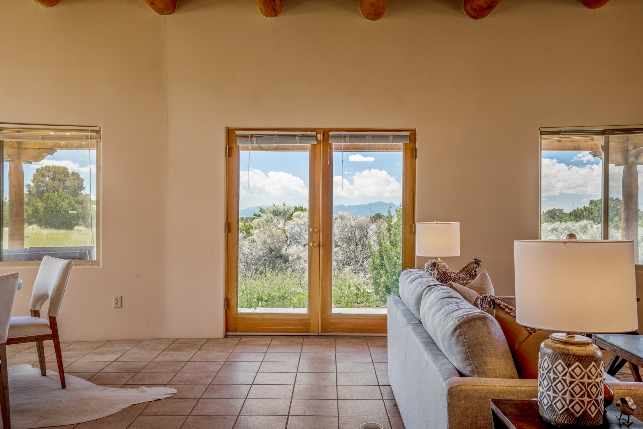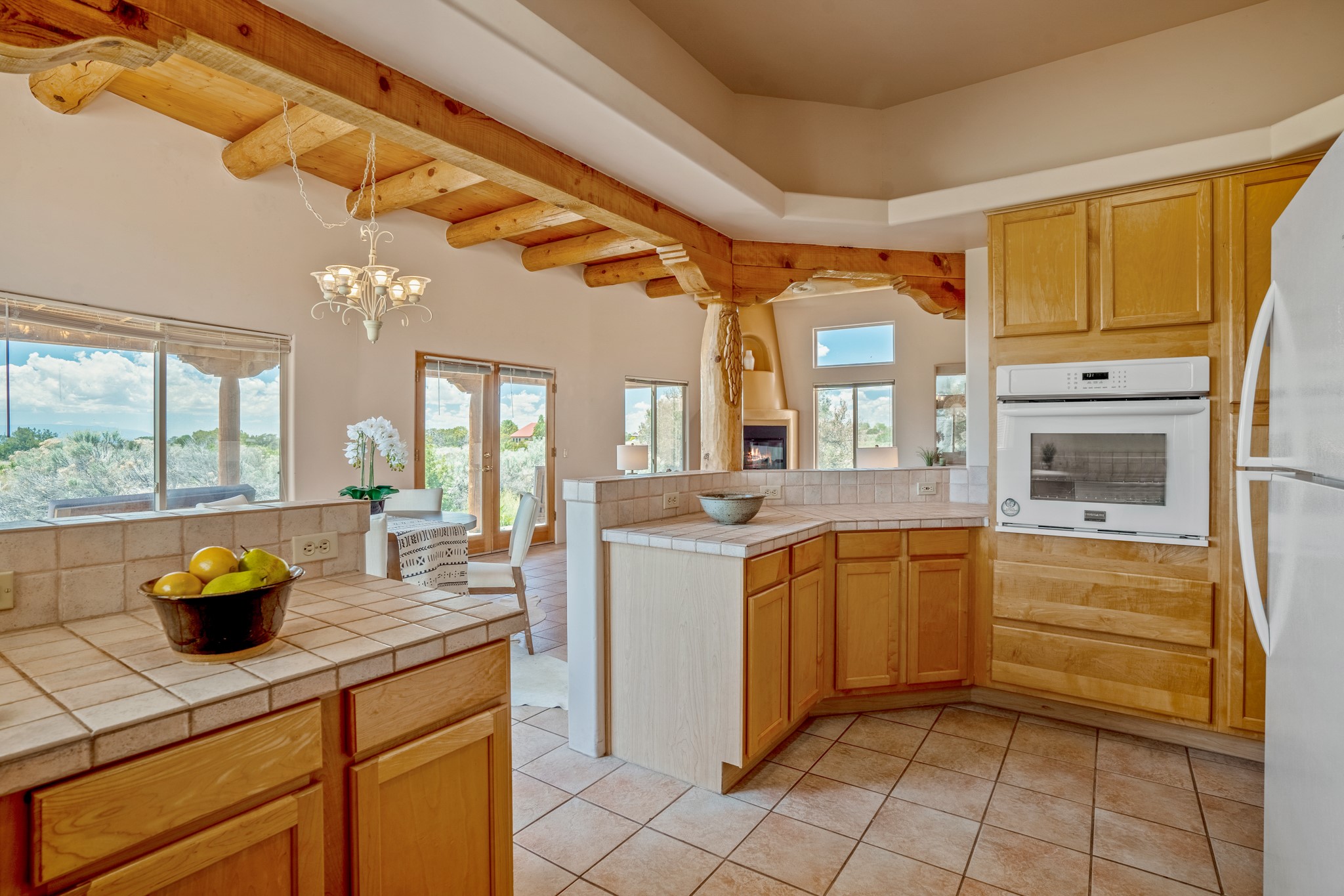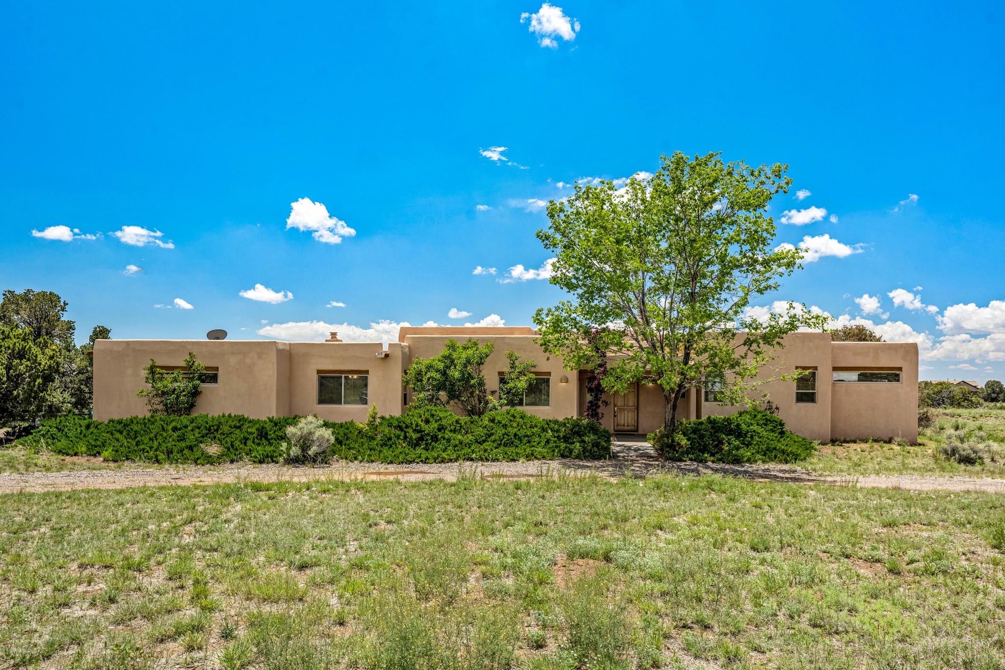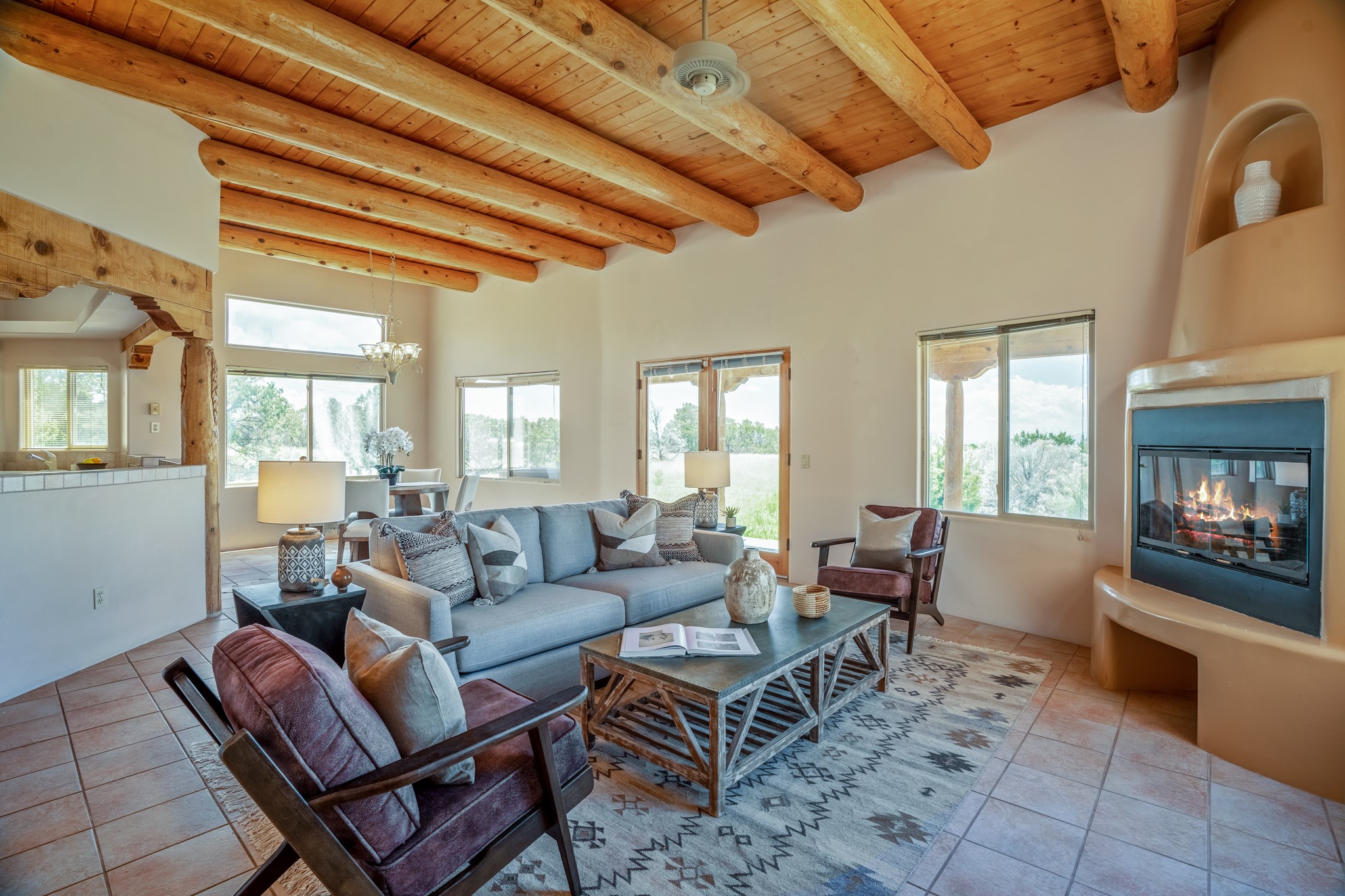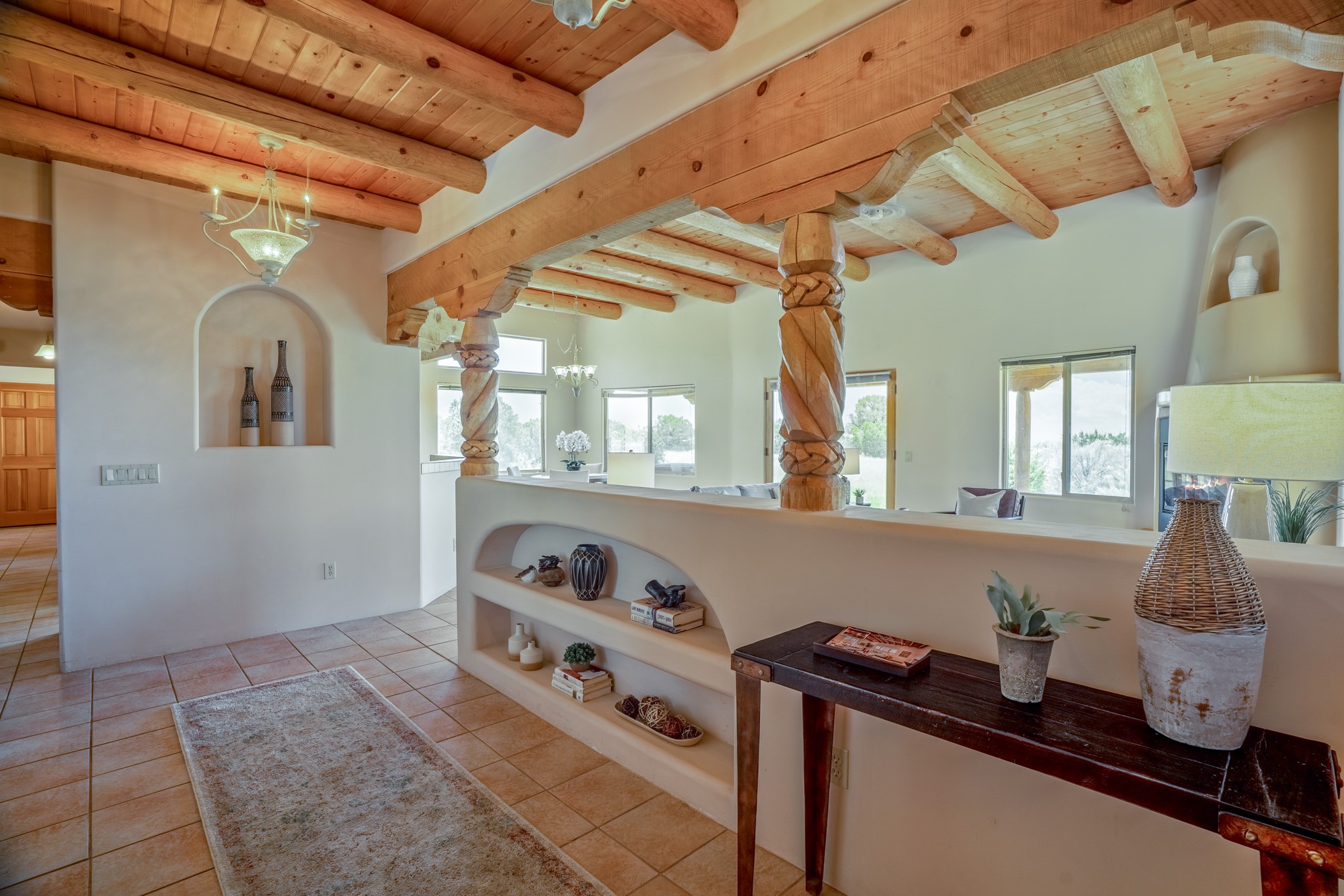Welcome home to La Paz at Eldorado. This single level three bedroom, two bath property is loaded with Santa Fe charm! The well designed floor plan includes an open living & dining room with a kiva fireplace, bright kitchen with great storage & counter space, and a large portal overlooking a neighborhood greenbelt perfect for entertaining. The primary suite is thoughtfully separated from the other bedrooms and includes vigas, an ensuite bathroom with a soaking tub, shower, walk-in closet and double vanities along with stunning views! The two additional bedrooms are adjacent to the kitchen and share their own full bathroom, continue down the hall to find a laundry/mudroom and access to the two car garage. There are views of the Sangre de Cristo foothills to the Northeast from the bedrooms & entry along with Southwestern views from the entertaining spaces that are perfect to capture the sunset. Sited on 2.8 acres and just minutes from Eldorado's Agora & La Tienda shopping and dining.