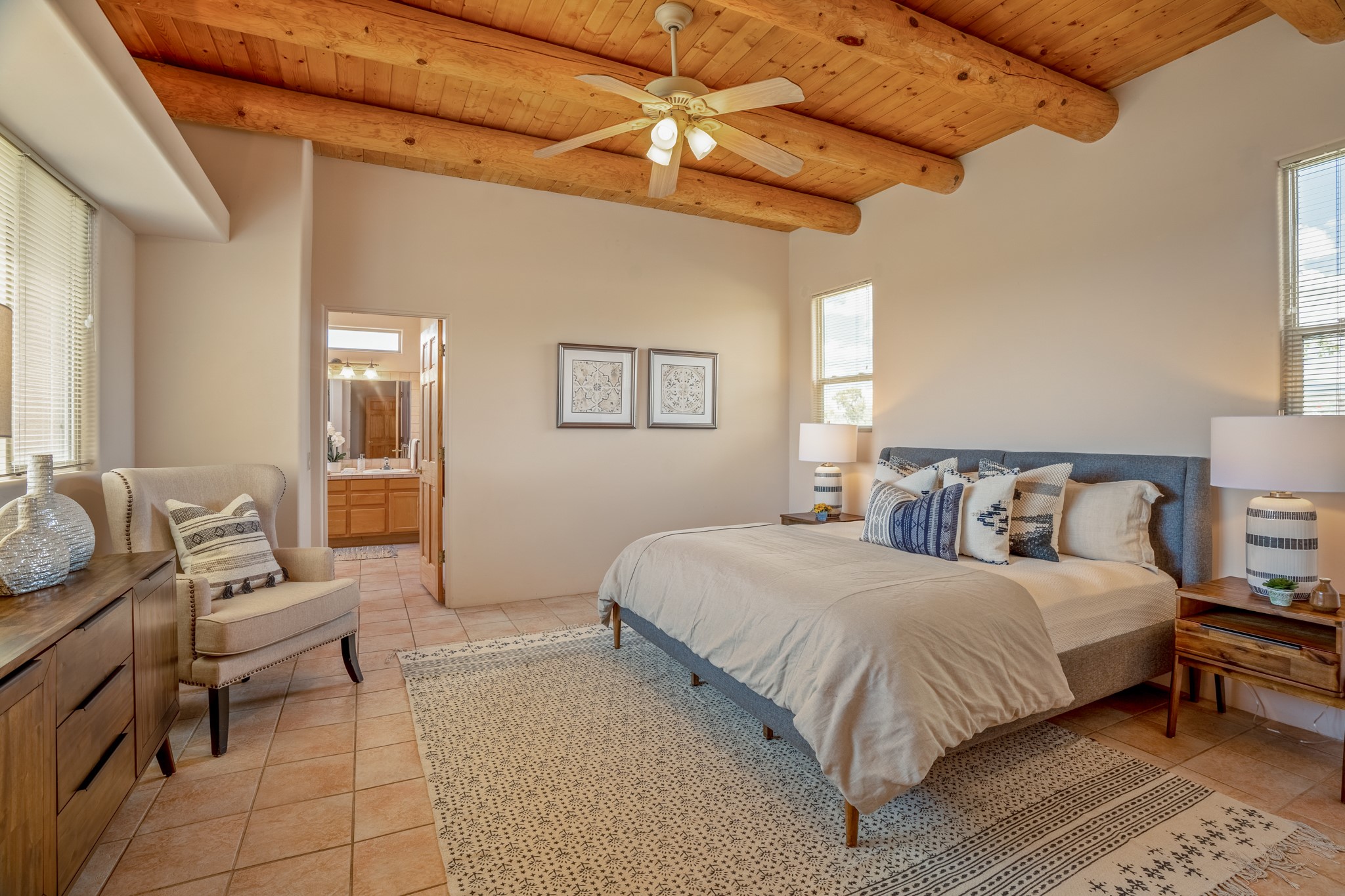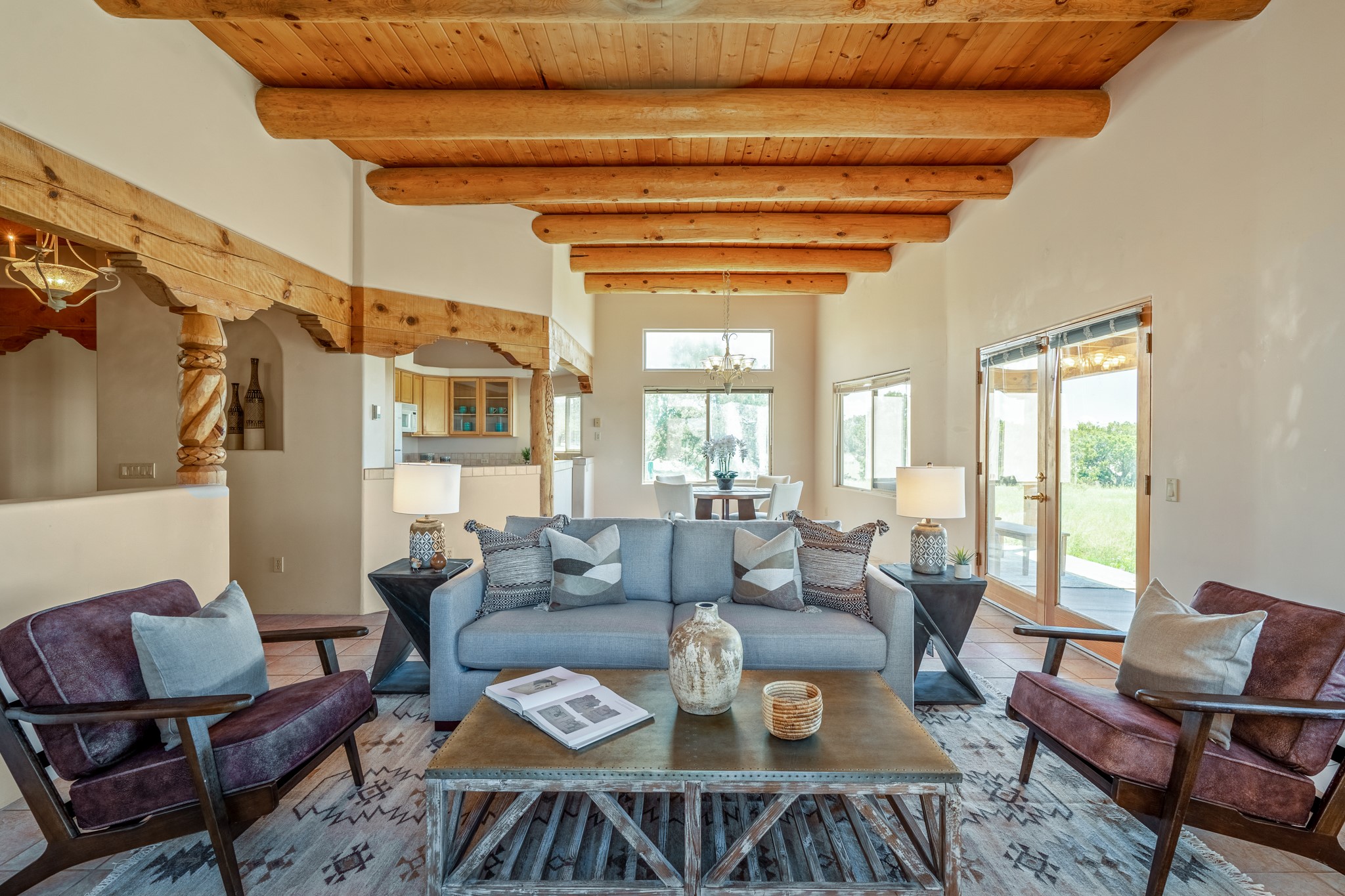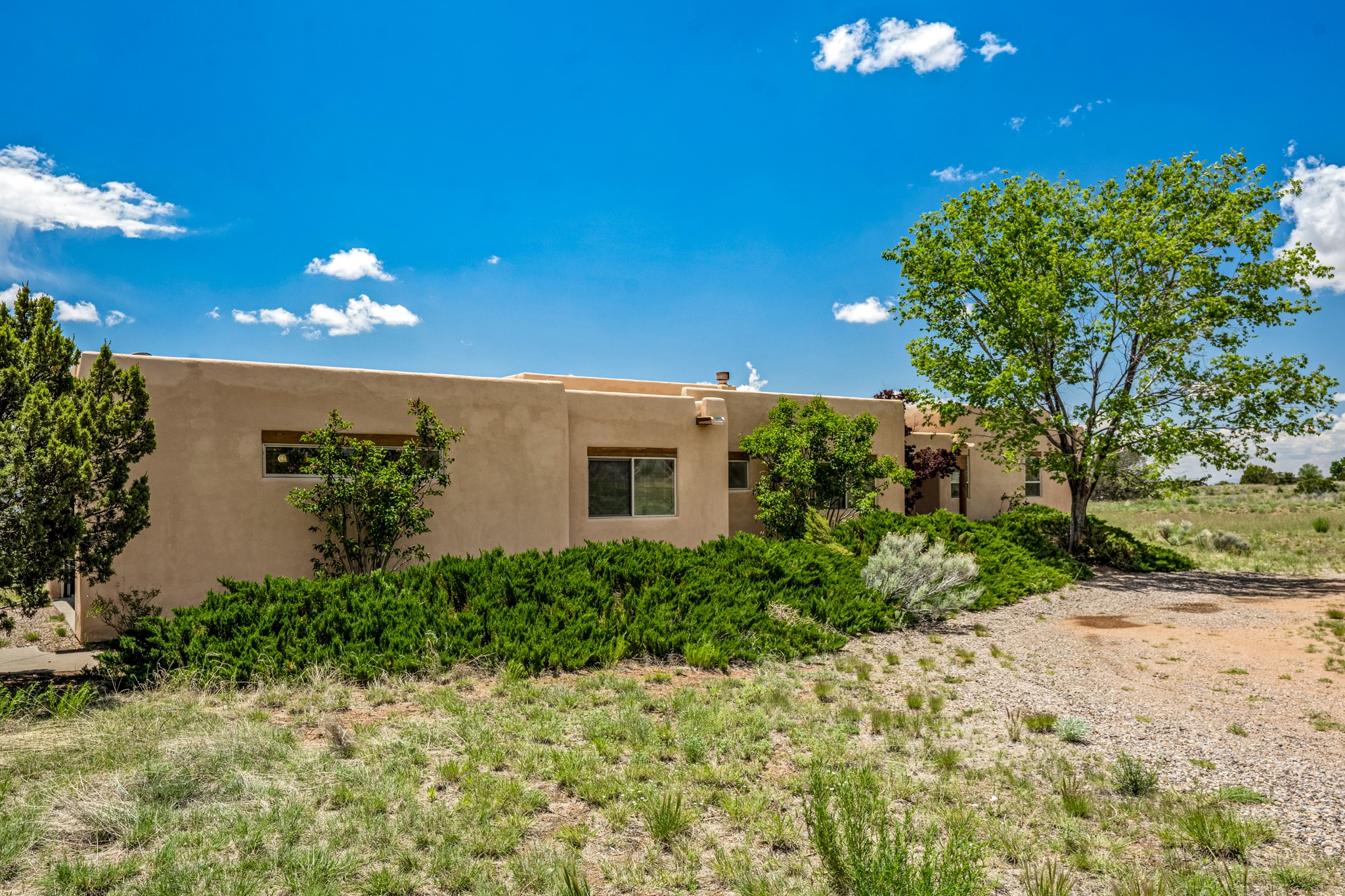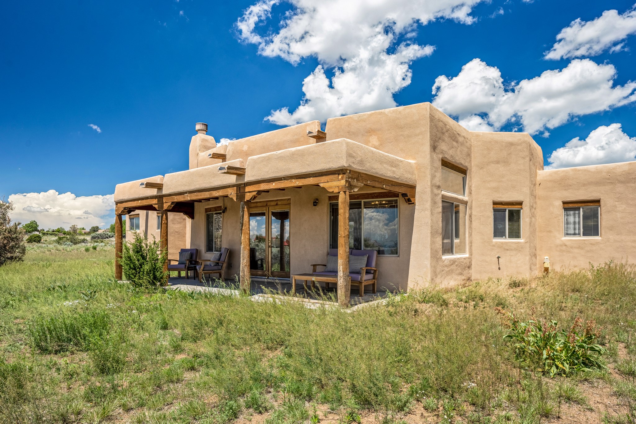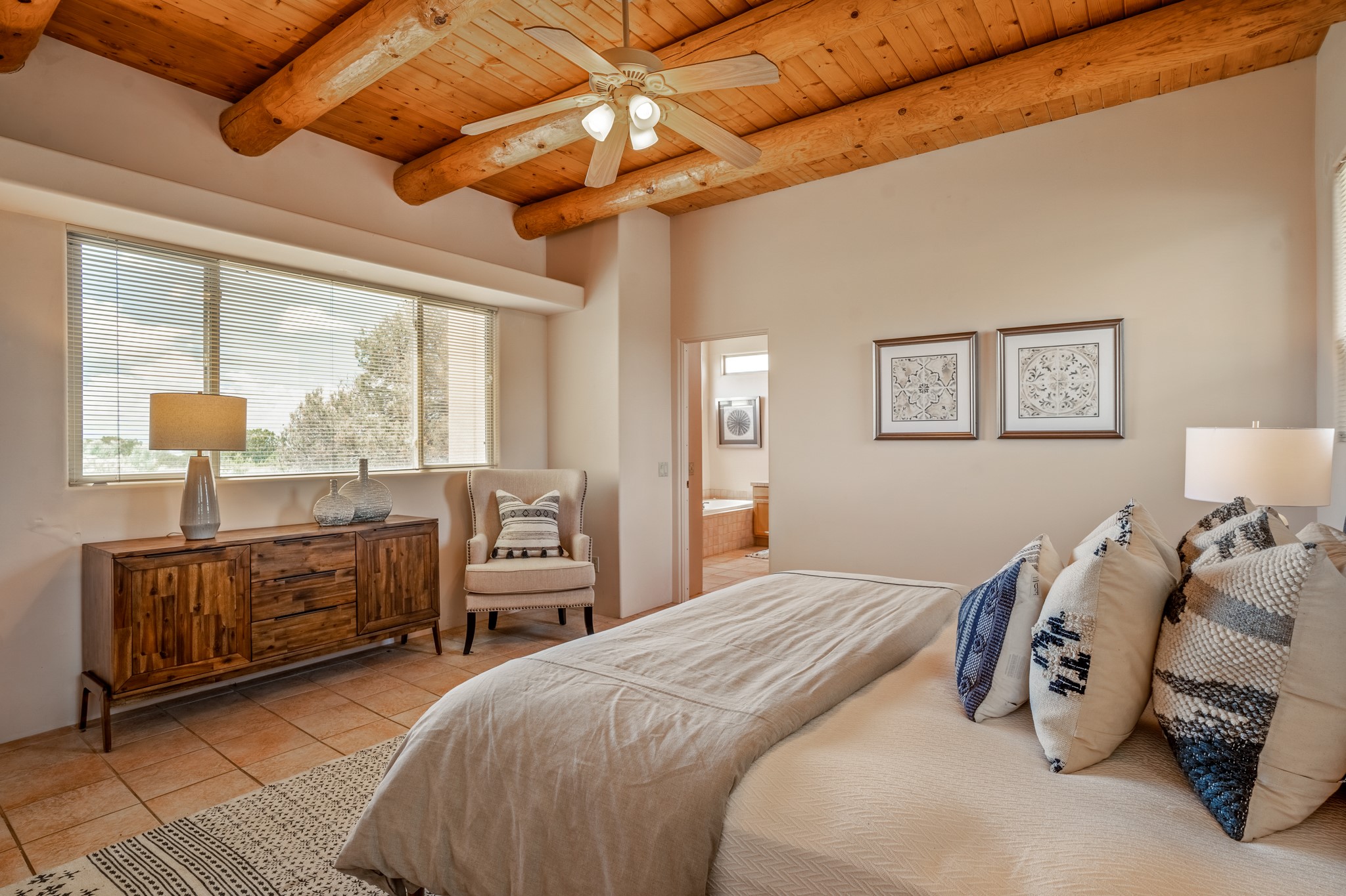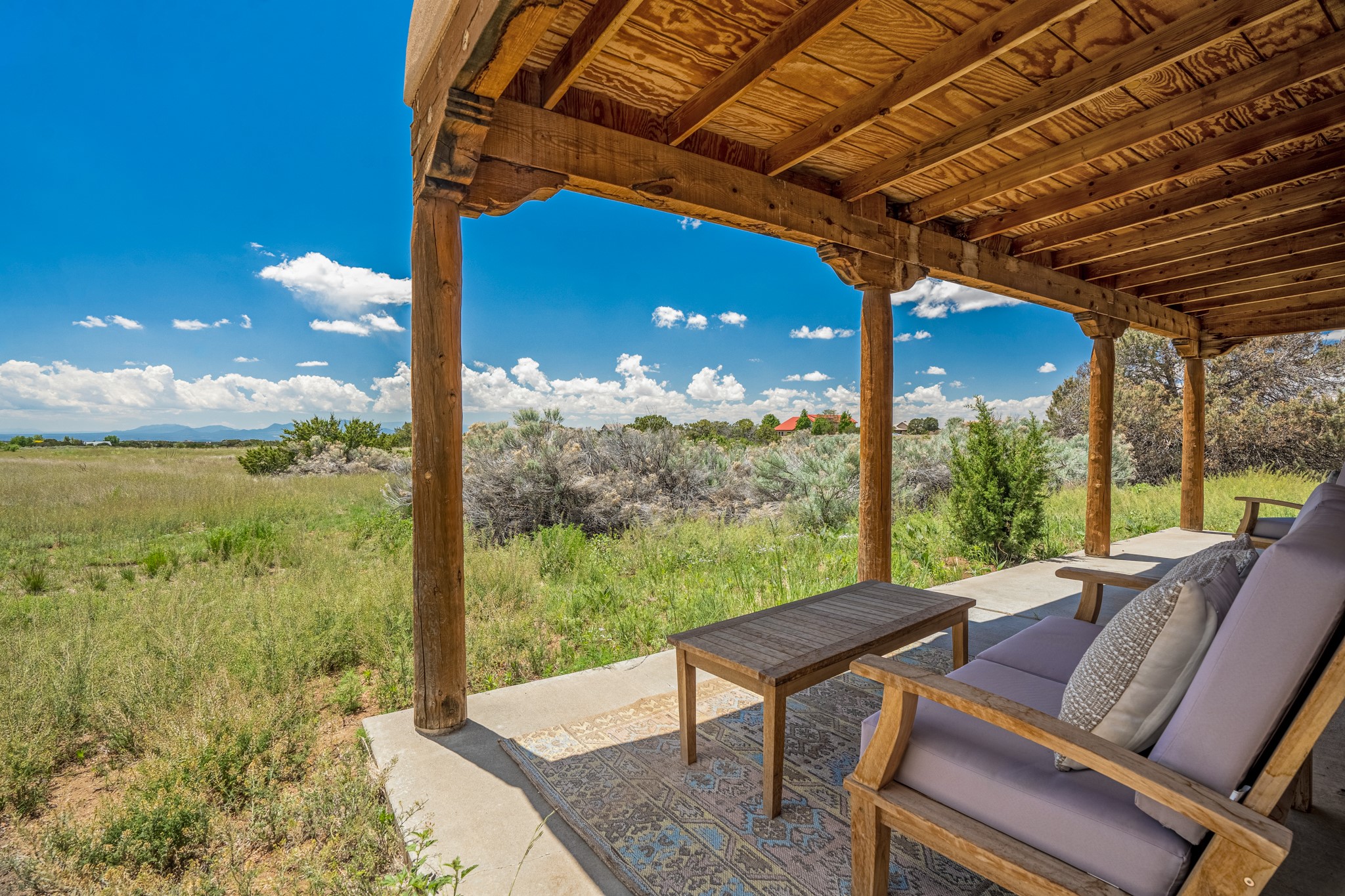 Welcome home to La Paz at Eldorado. This single level three bedroom, two bath property is loaded with Santa Fe charm! The well designed floor plan includes an open living & dining room with a kiva fireplace, bright kitchen with great storage & counter space, and a large portal overlooking a neighborhood greenbelt perfect for entertaining. The primary suite is thoughtfully separated from the other bedrooms and includes vigas, an ensuite bathroom with a soaking tub, shower, walk-in closet and double vanities along with stunning views! The two additional bedrooms are adjacent to the kitchen and share their own full bathroom, continue down the hall to find a laundry/mudroom and access to the two car garage. There are views of the Sangre de Cristo foothills to the Northeast from the bedrooms & entry along with Southwestern views from the entertaining spaces that are perfect to capture the sunset. Sited on 2.8 acres and just minutes from Eldorado's Agora & La Tienda shopping and dining.