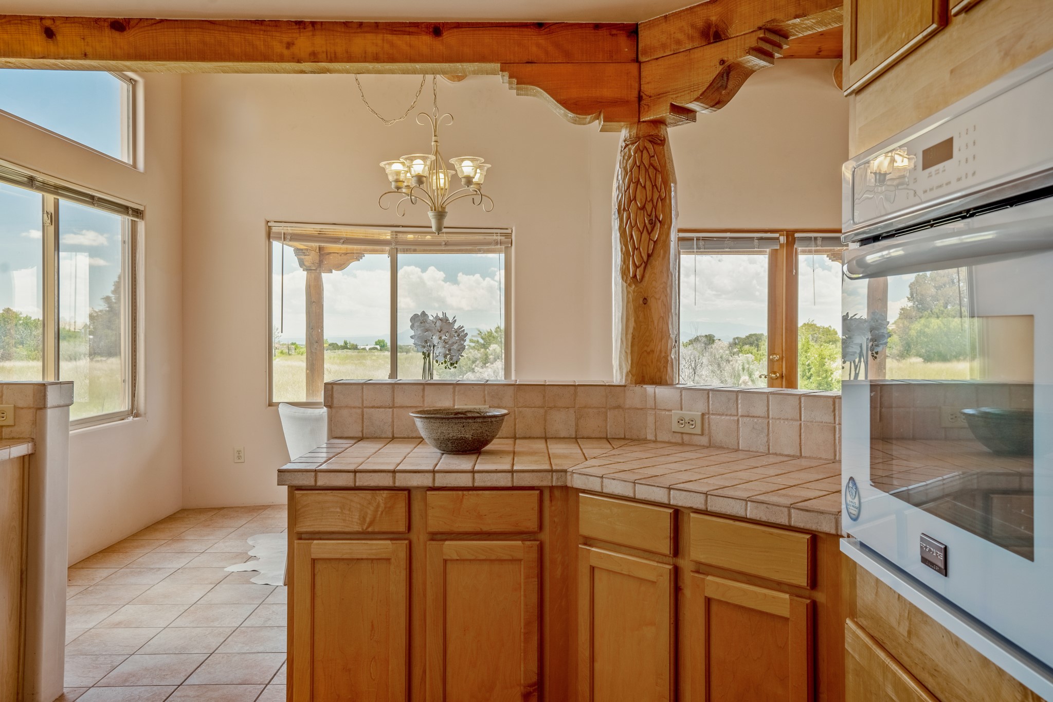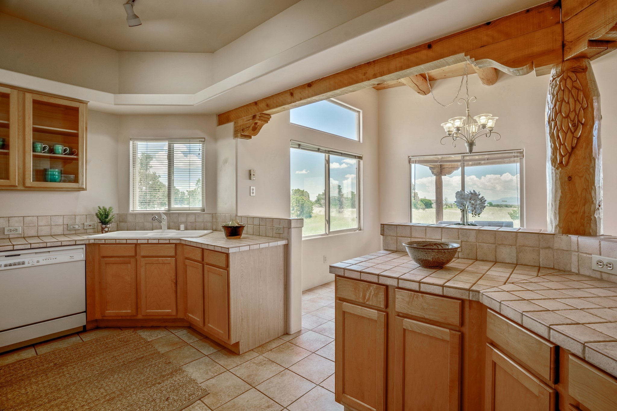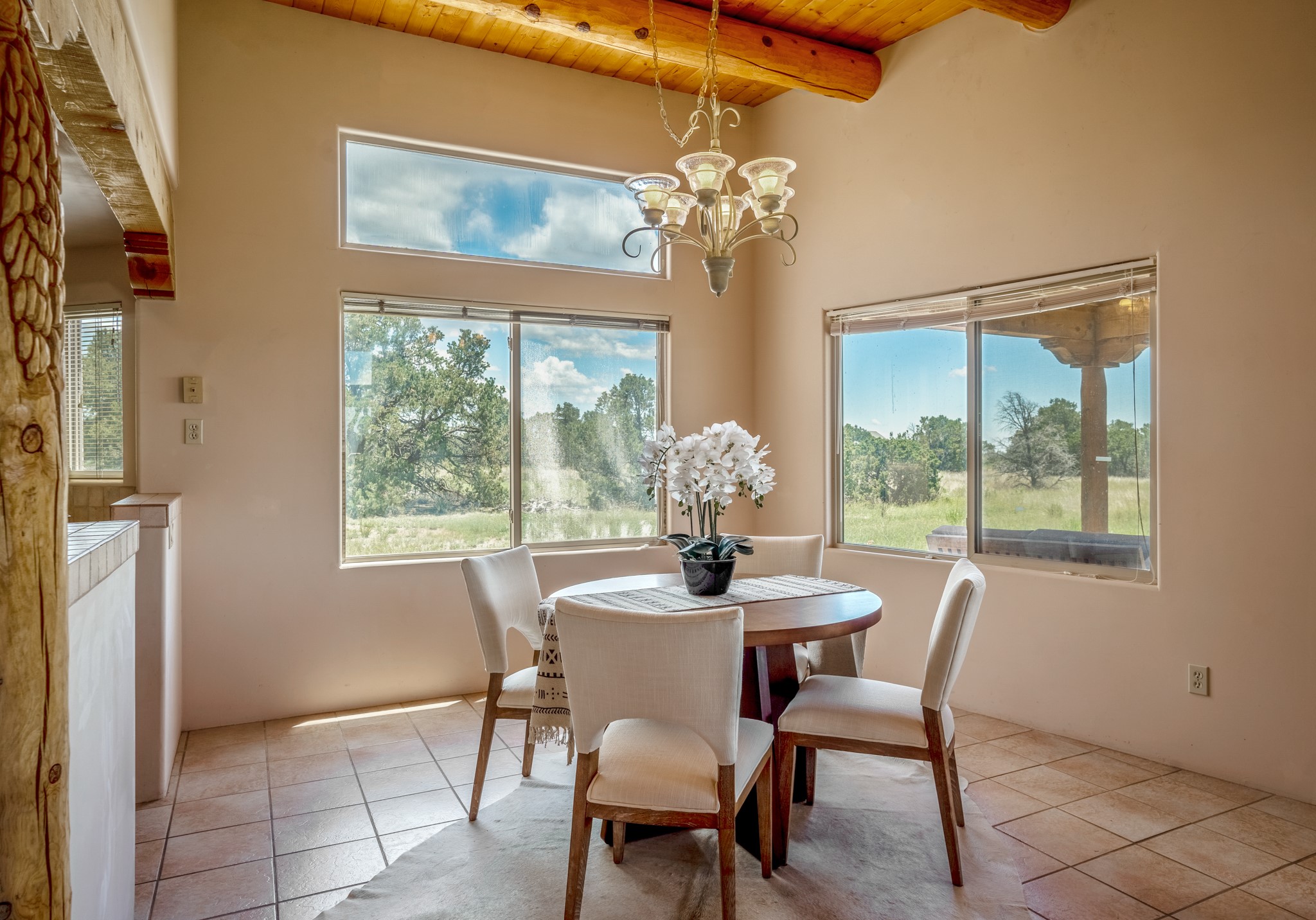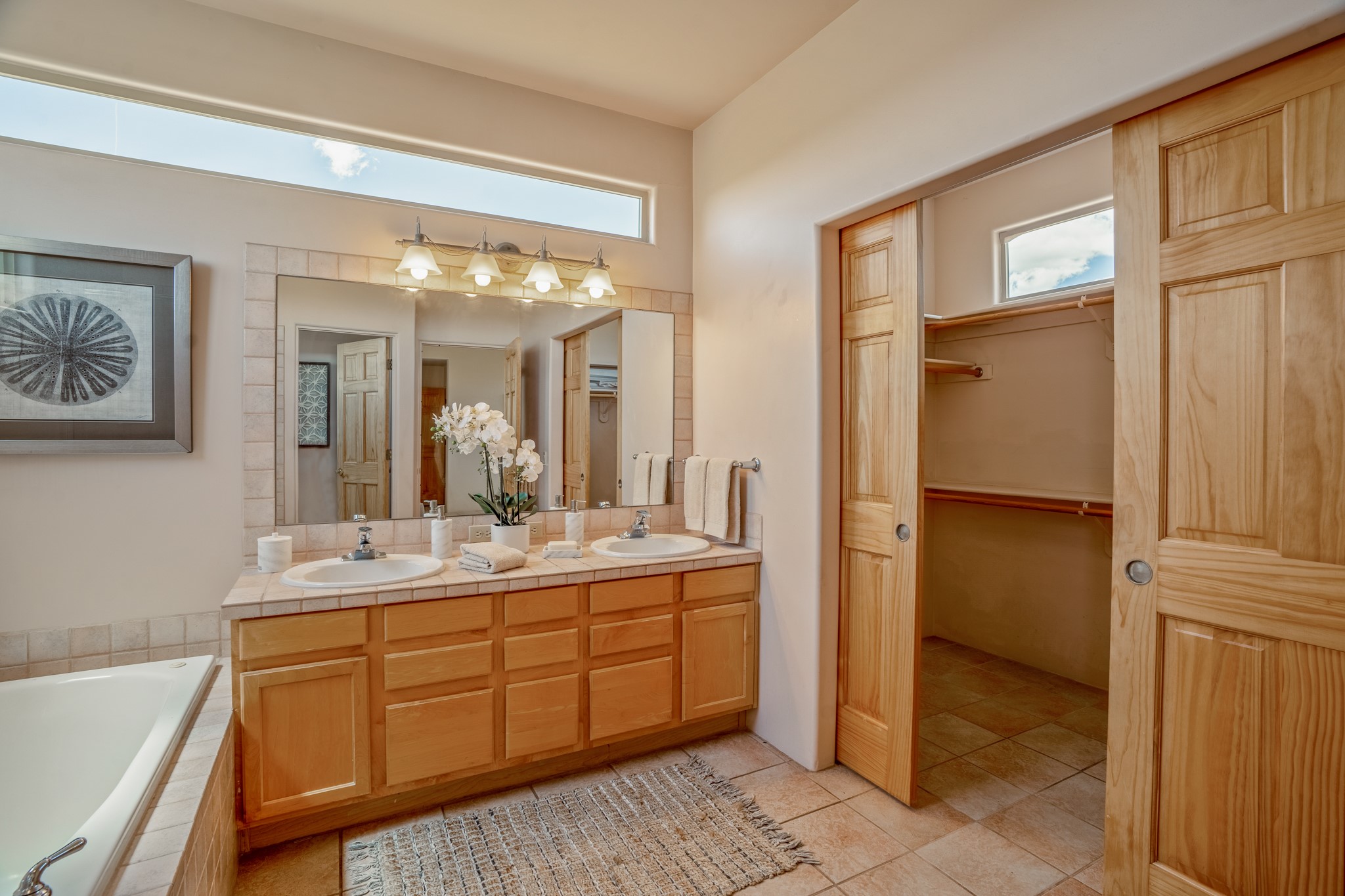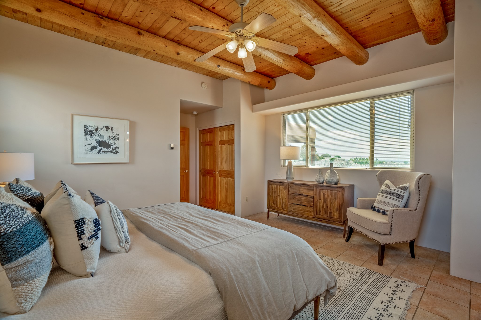 Welcome home to La Paz at Eldorado. This single level three bedroom, two bath property is loaded with Santa Fe charm! The well designed floor plan includes an open living & dining room with a kiva fireplace, bright kitchen with great storage & counter space, and a large portal overlooking a neighborhood greenbelt perfect for entertaining. The primary suite is thoughtfully separated from the other bedrooms and includes vigas, an ensuite bathroom with a soaking tub, shower, walk-in closet and double vanities along with stunning views! The two additional bedrooms are adjacent to the kitchen and share their own full bathroom, continue down the hall to find a laundry/mudroom and access to the two car garage. There are views of the Sangre de Cristo foothills to the Northeast from the bedrooms & entry along with Southwestern views from the entertaining spaces that are perfect to capture the sunset. Sited on 2.8 acres and just minutes from Eldorado's Agora & La Tienda shopping and dining.