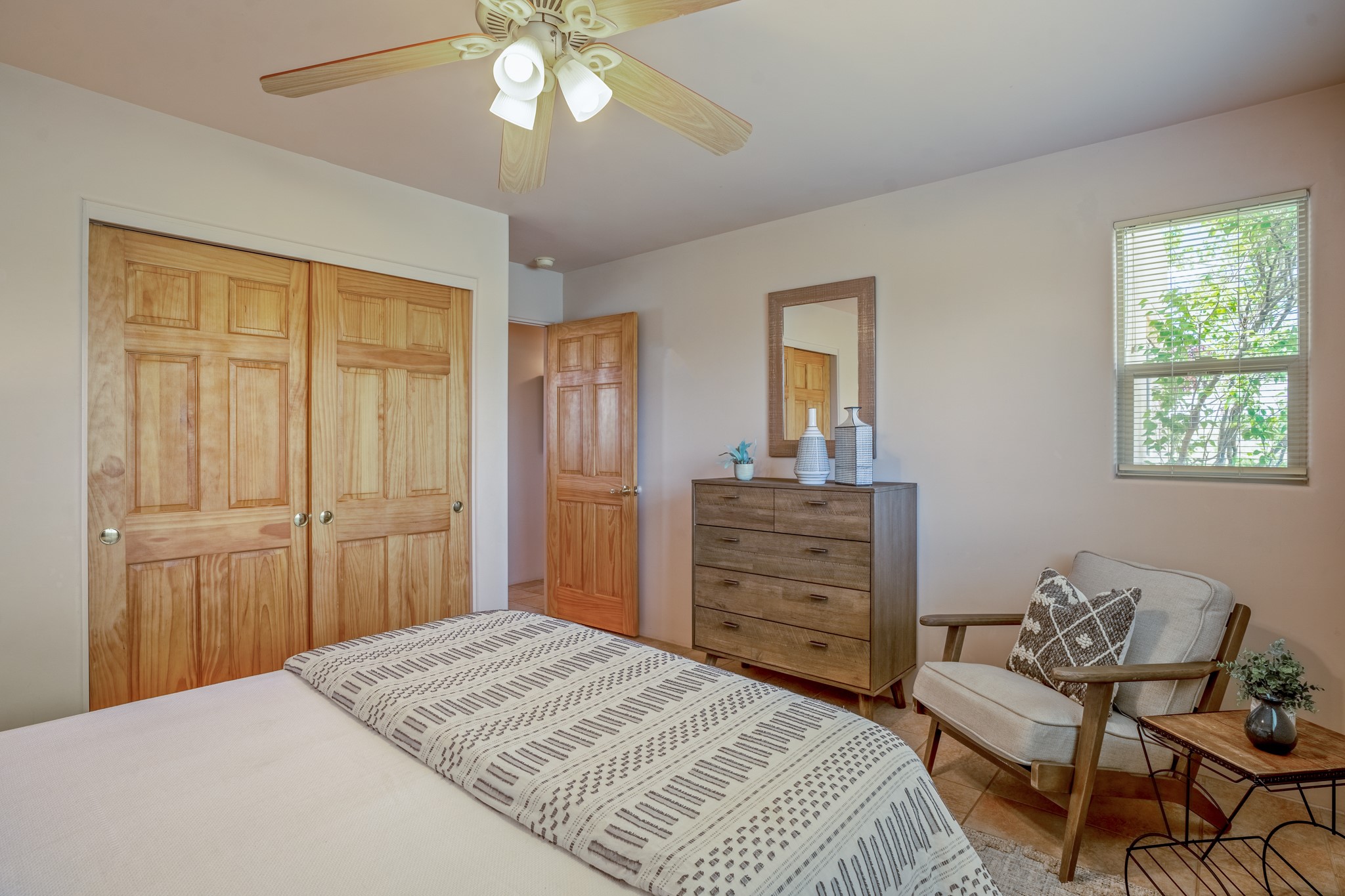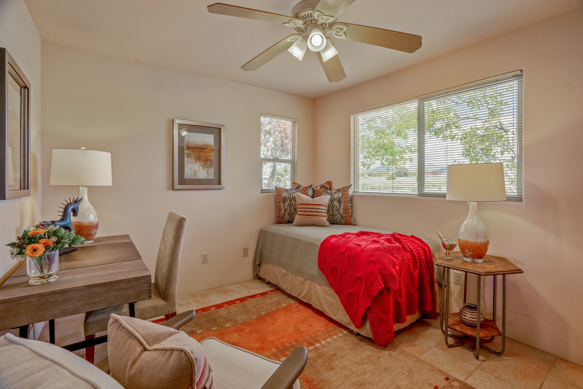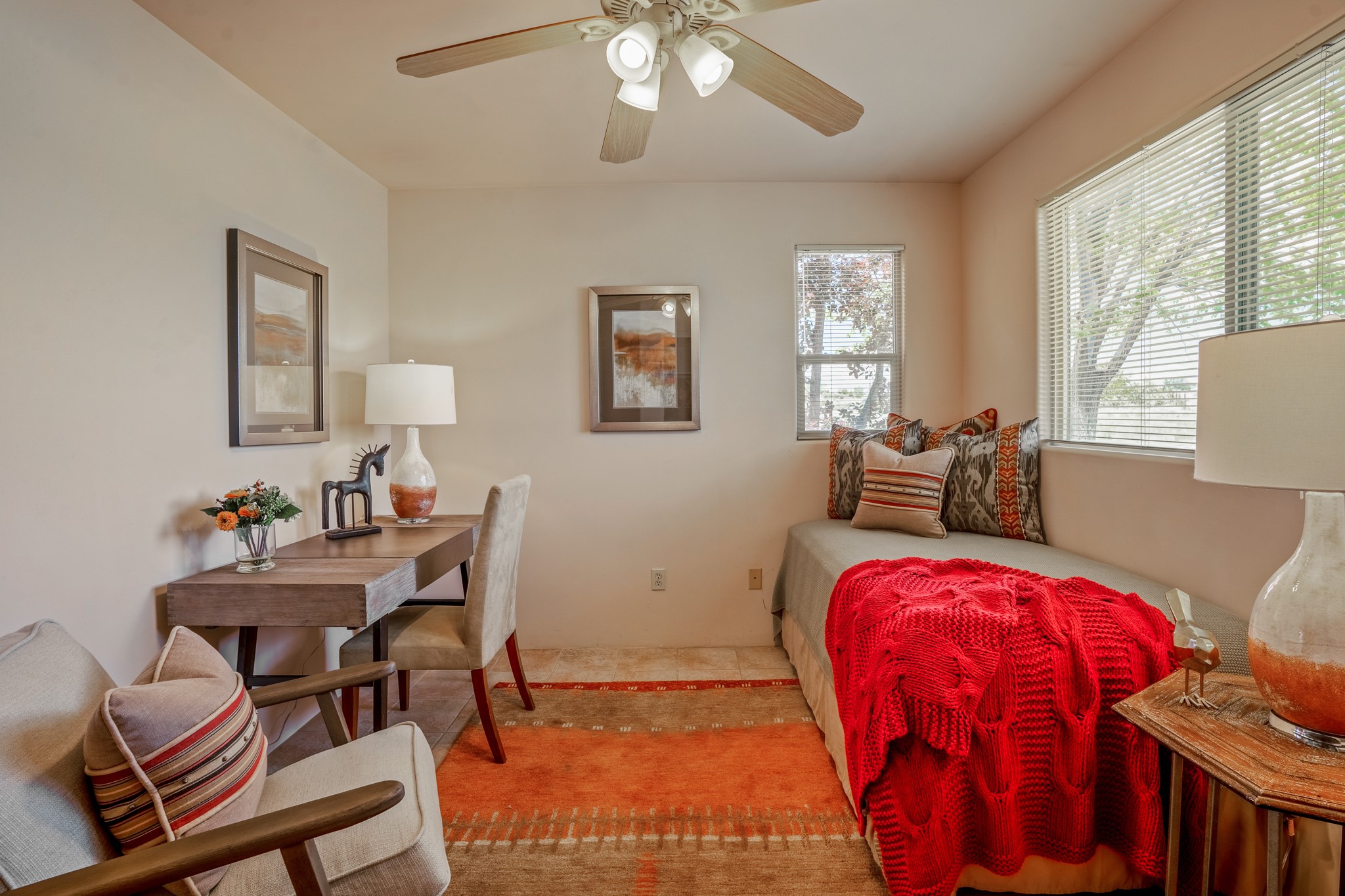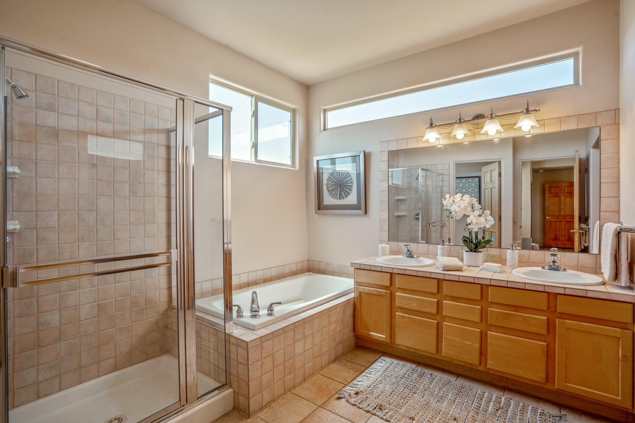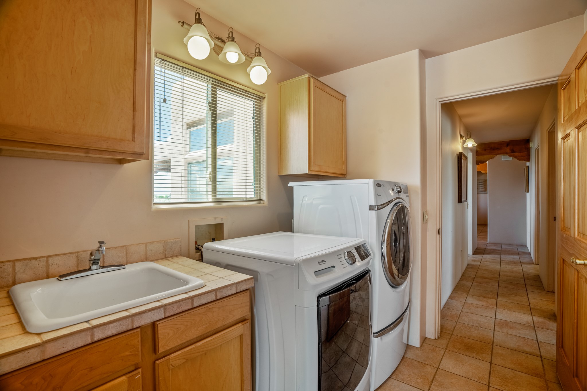 Welcome home to La Paz at Eldorado. This single level three bedroom, two bath property is loaded with Santa Fe charm! The well designed floor plan includes an open living & dining room with a kiva fireplace, bright kitchen with great storage & counter space, and a large portal overlooking a neighborhood greenbelt perfect for entertaining. The primary suite is thoughtfully separated from the other bedrooms and includes vigas, an ensuite bathroom with a soaking tub, shower, walk-in closet and double vanities along with stunning views! The two additional bedrooms are adjacent to the kitchen and share their own full bathroom, continue down the hall to find a laundry/mudroom and access to the two car garage. There are views of the Sangre de Cristo foothills to the Northeast from the bedrooms & entry along with Southwestern views from the entertaining spaces that are perfect to capture the sunset. Sited on 2.8 acres and just minutes from Eldorado's Agora & La Tienda shopping and dining.