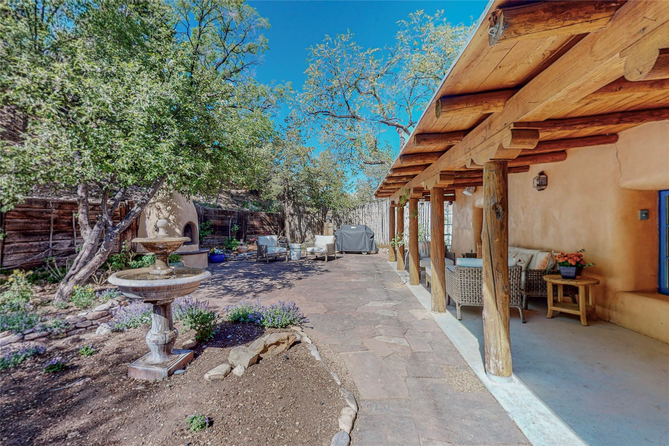 This Historic Eastside multi-level Pueblo Adobe is a one-of-a-kind gem! Tucked behind stuccoed and stone walls, this home has been lovingly maintained and thoughtfully enhanced by its current owner. The property is beautifully landscaped with a bubbling fountain, Kiva fireplace and a gracious entertainers portal. Spacious eat-in gourmet kitchen with Zimbabwe black granite countertops, stainless steel Wolf six burner stove, Wolf double ovens, Subzero fridge, wine cooler and a farm sink replete with an electronic hands-free soap dispenser. Large living/dining room with fireplace, adjacent office nook and powder room. All three bedrooms are en-suite and uniquely charming. Master Bedroom is an oasis all to itself with a Norweigian Jutol free-standing stove, walk-in closet, generous-sized bathroom with dual sinks, clawfoot tub, shower and an Envo heated bidet/toilet system. Beamed ceiling guest bedroom has treetop Aspen views and a new Mr. Steam shower system in the bathroom. Original stone walls lead you downstairs past the utility room and custom floor-to-ceiling wine cooler, to the bedroom/media room with its own private patio and bath. Plaster and stone walls abound, high cove ceilings with vigas, wood, brick and tiled floors, central A/C and nichos galore. Carport parking for 2 cars comes with a level 2 EV charger. Off-street parking for an additional 2-3 cars. Close to The Plaza, art galleries, boutiques and the restaurants on Canyon Road. If you're looking for originality, you need to look no further, as this property exudes the Old World Charm of Santa Fe that rarely becomes available!