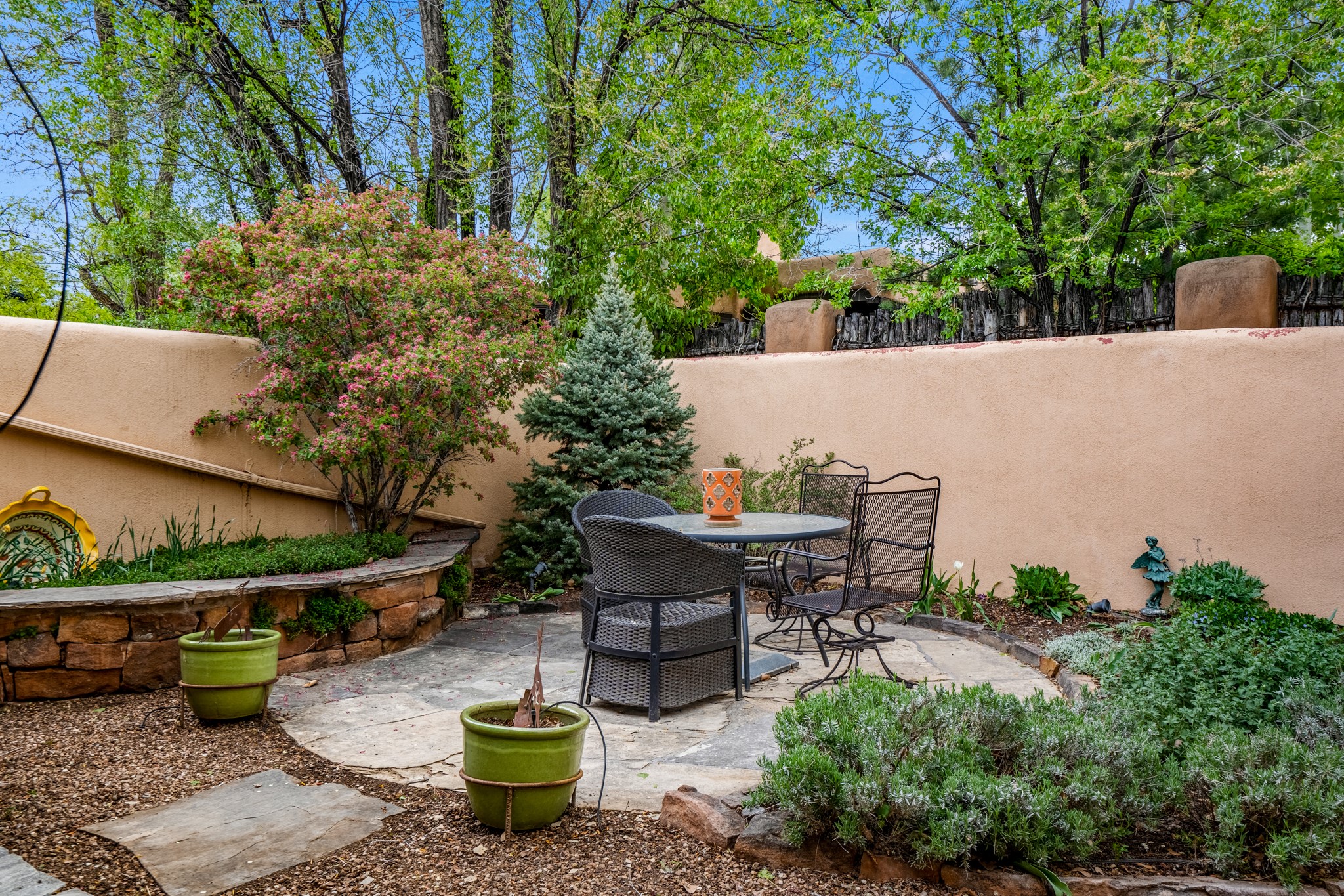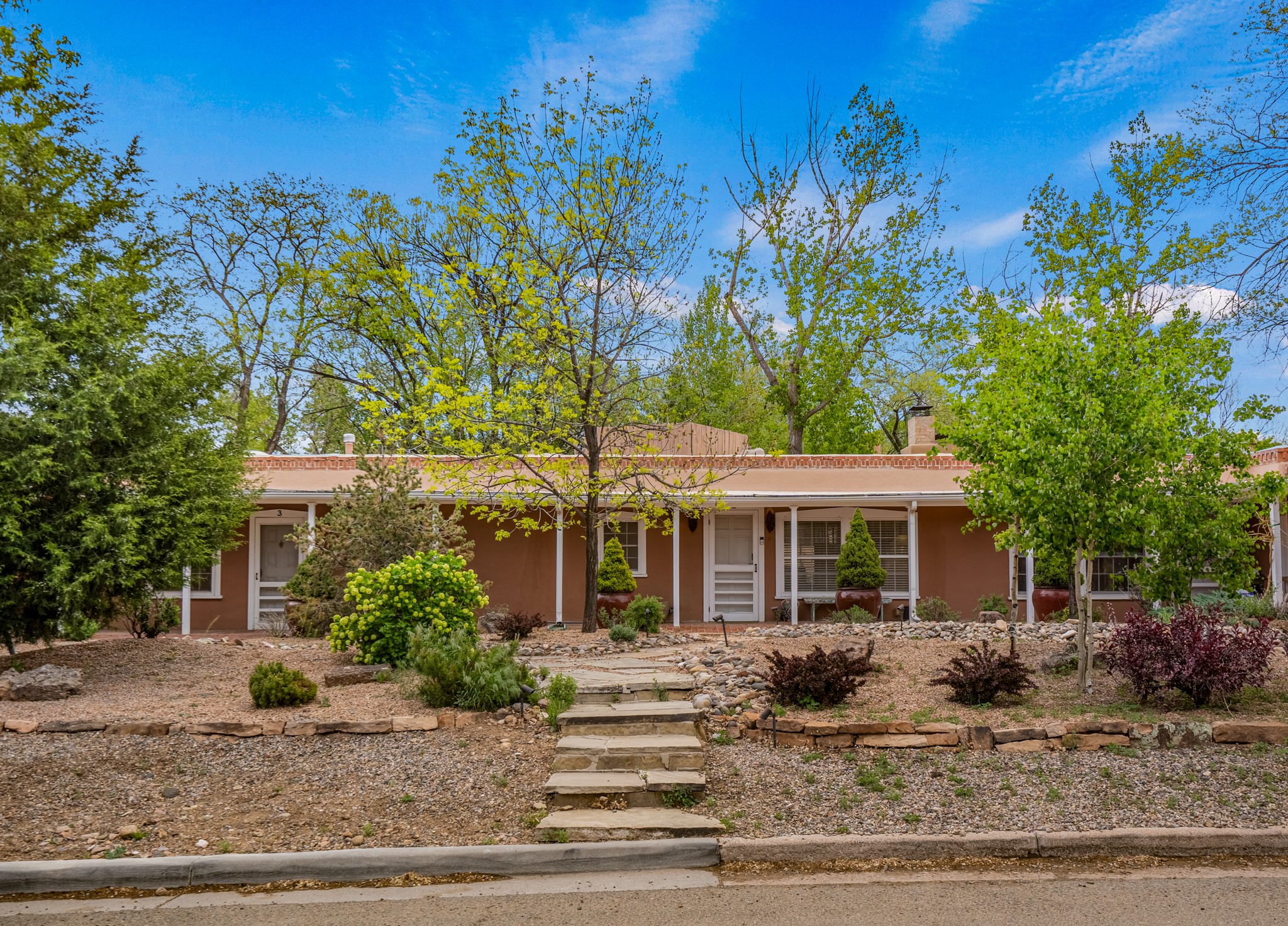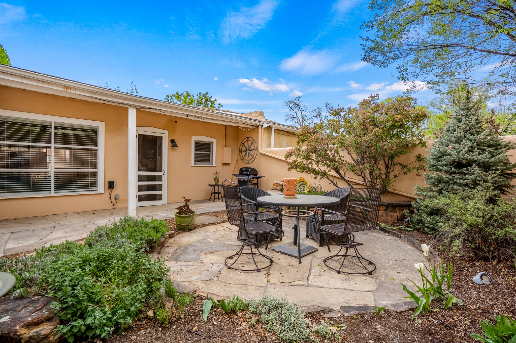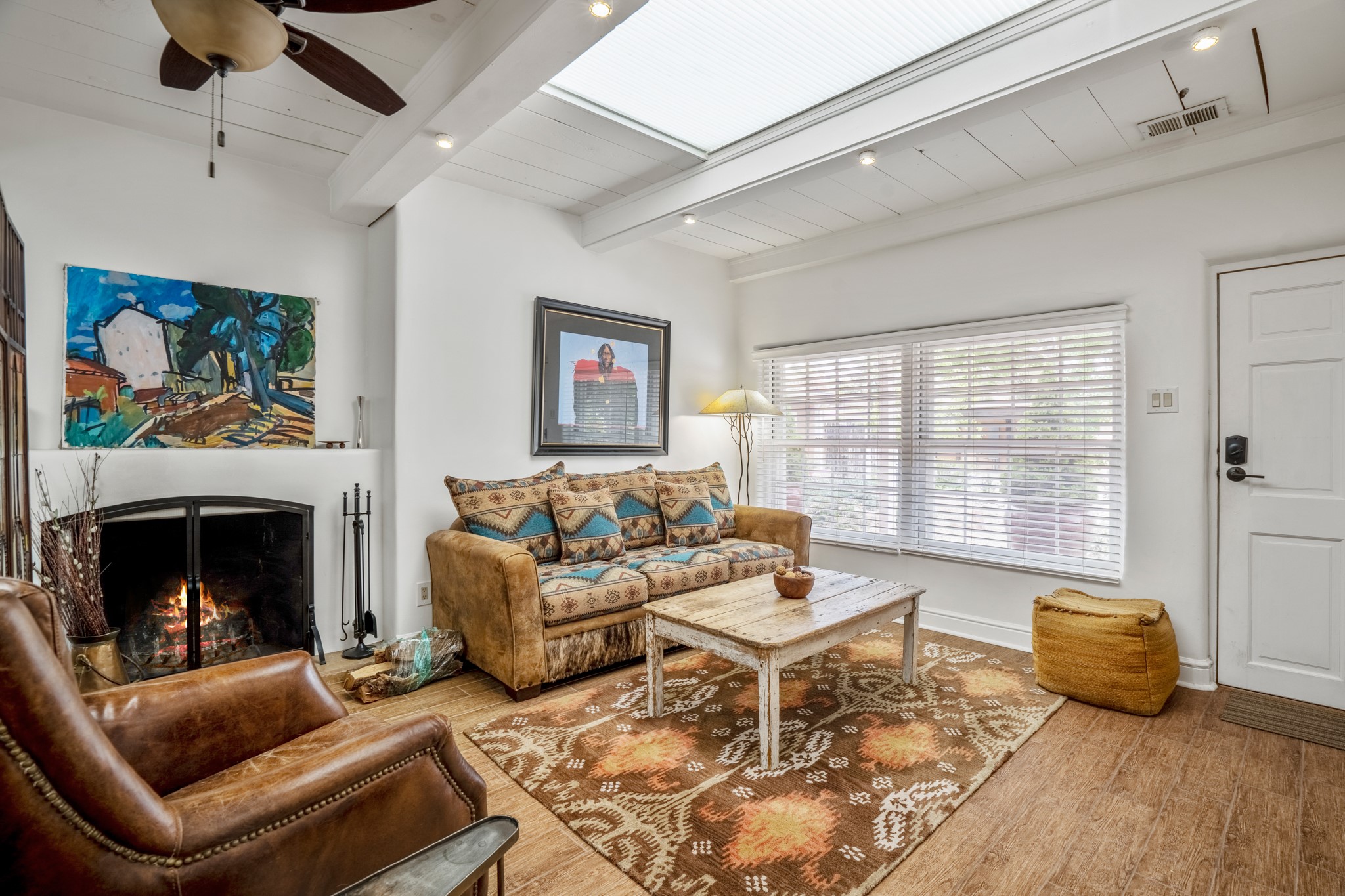 LOCATION, LOCATION, LOCATION! On a quiet lane between Canyon Road and the Santa Fe River, the perfect pied--terre awaits. This rare gem is part of a compound of 5. The fully equipped and furnished studio is +/-620sqft has abundant natural light pouring in from skylights and large windows - truly TURNKEY. Features include a spacious kitchen with stone countertops and stainless appliances, beamed ceilings, a wood burning fireplace, and an ultra private rear courtyard. The floor plan accommodates a king bed with movable curtain for added privacy, a luxurious bathroom, hallway storage and in-unit washer/dryer combo. Tile floors & A/C round out the package. Your own secluded oasis is right in the middle of everything that Santa Fe has to offer.