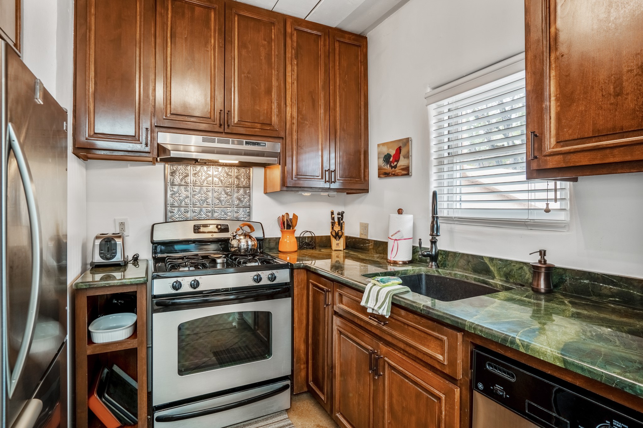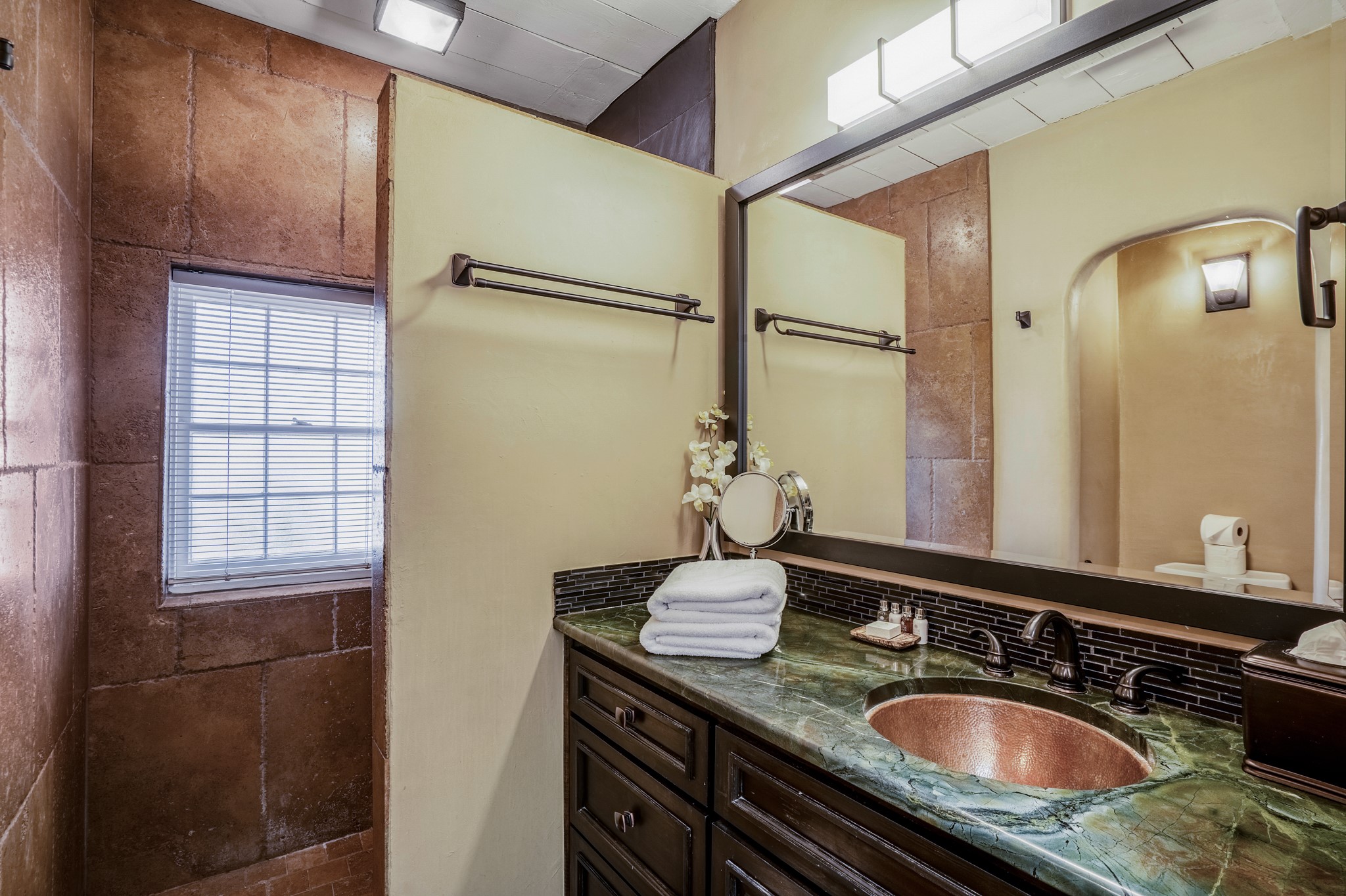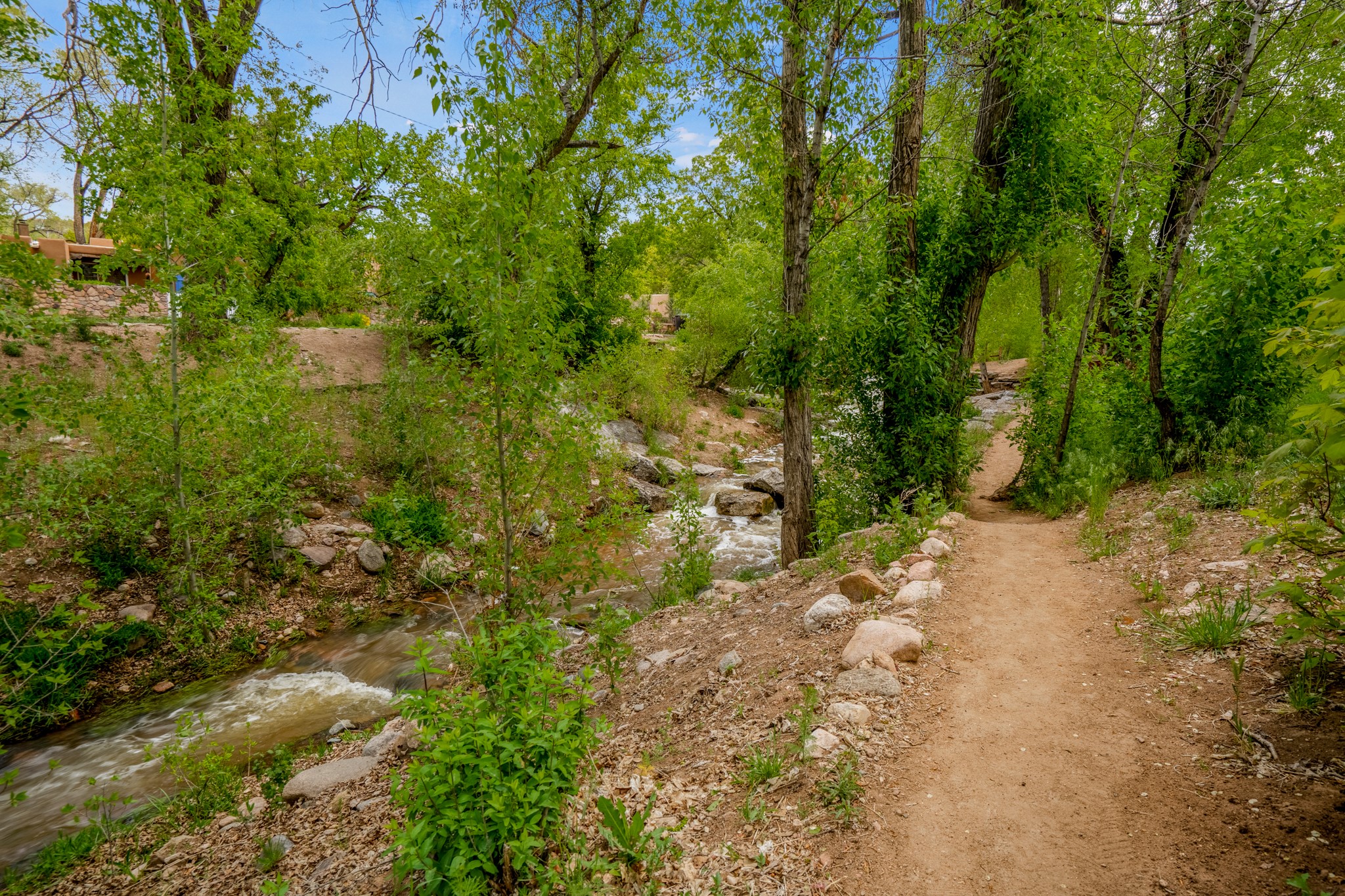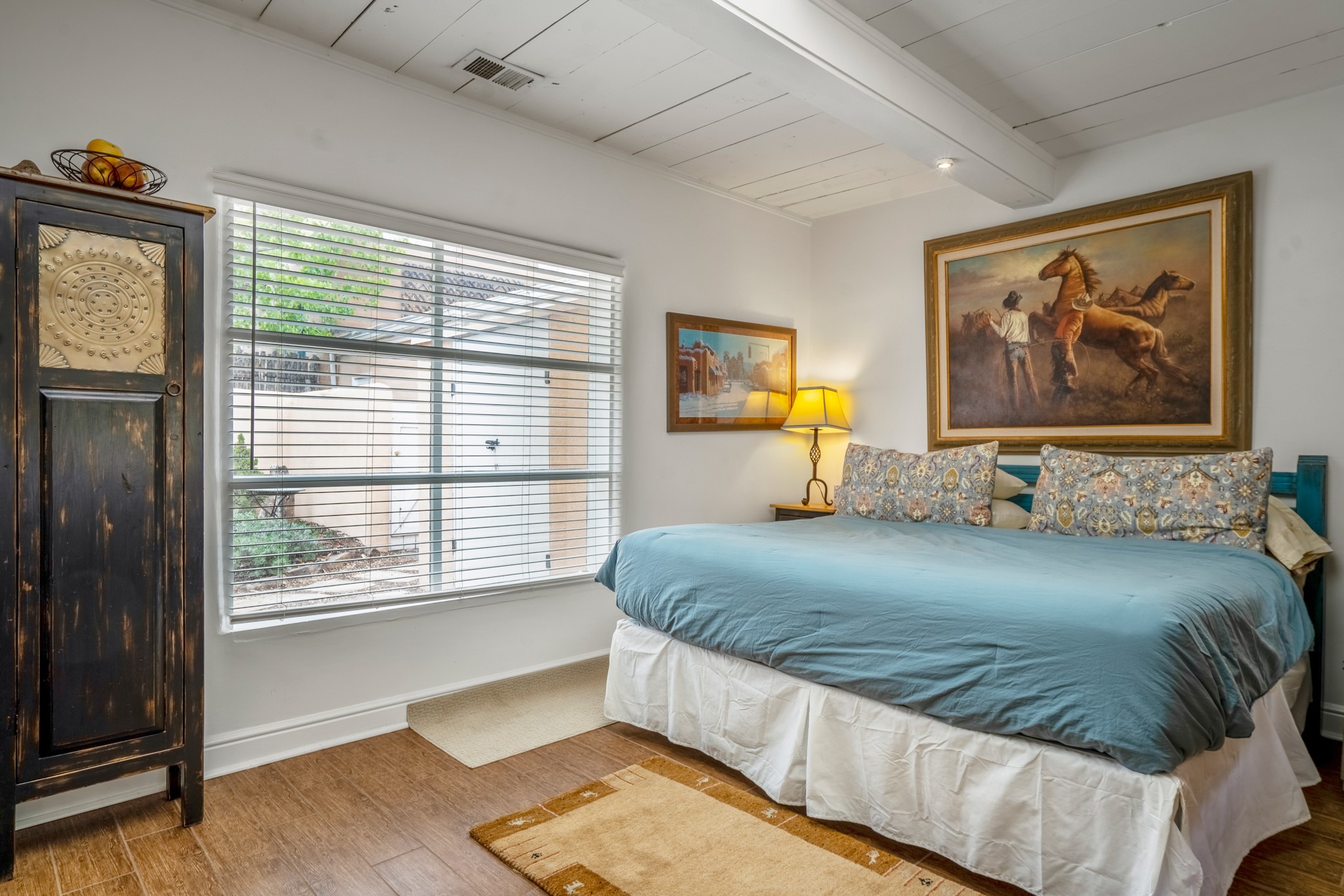 LOCATION, LOCATION, LOCATION! On a quiet lane between Canyon Road and the Santa Fe River, the perfect pied--terre awaits. This rare gem is part of a compound of 5. The fully equipped and furnished studio is +/-620sqft has abundant natural light pouring in from skylights and large windows - truly TURNKEY. Features include a spacious kitchen with stone countertops and stainless appliances, beamed ceilings, a wood burning fireplace, and an ultra private rear courtyard. The floor plan accommodates a king bed with movable curtain for added privacy, a luxurious bathroom, hallway storage and in-unit washer/dryer combo. Tile floors & A/C round out the package. Your own secluded oasis is right in the middle of everything that Santa Fe has to offer.