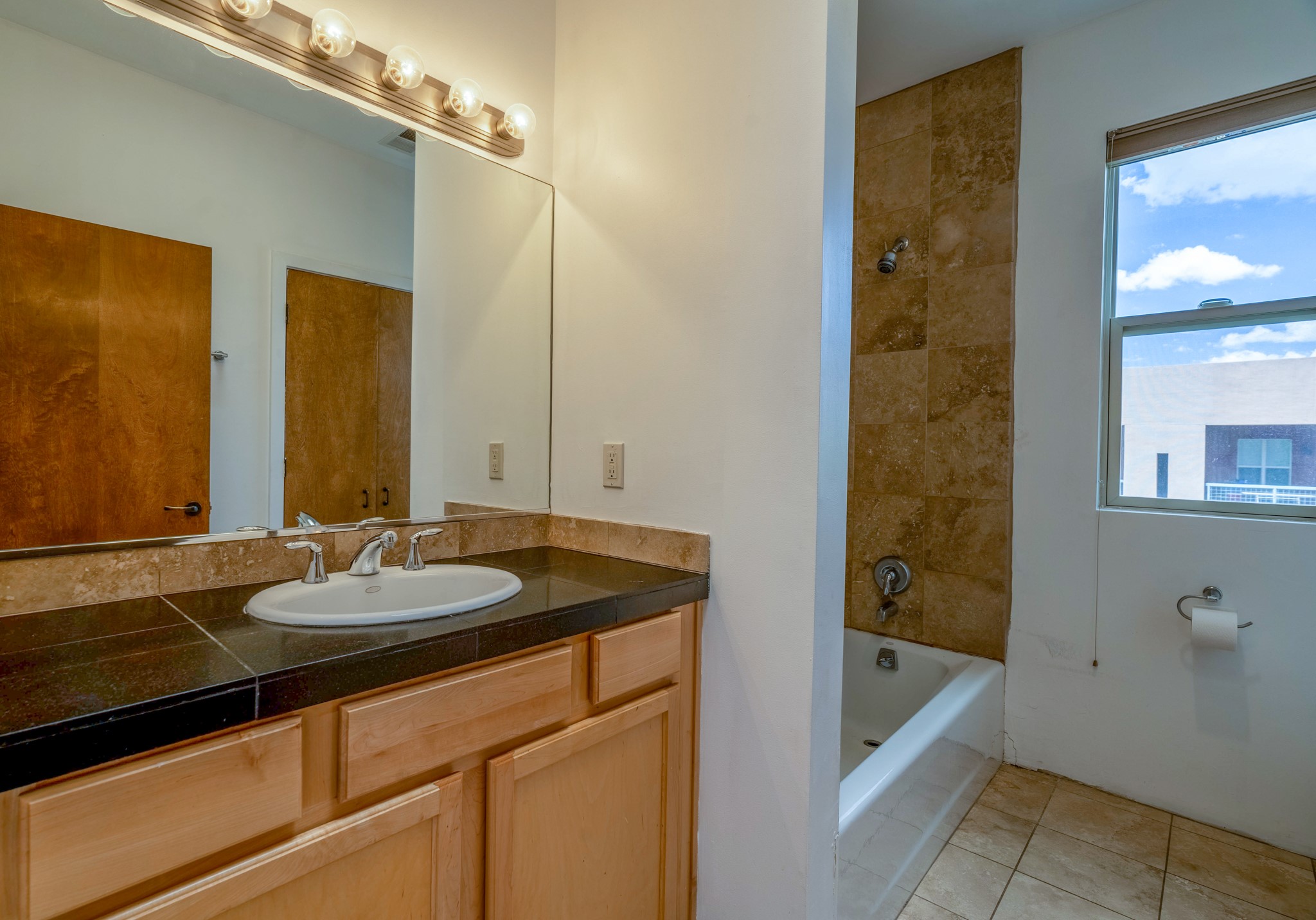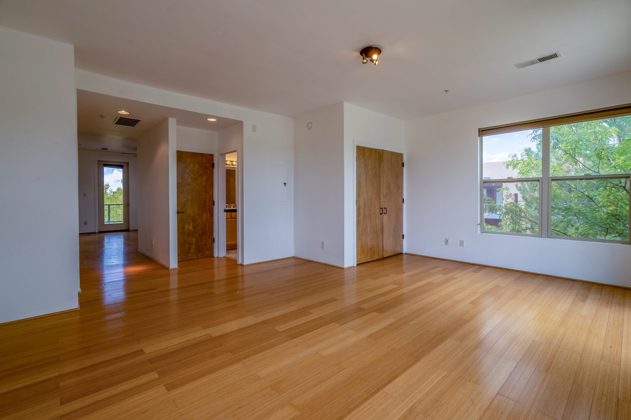 Bright, open second floor condominium with views of Sangre De Cristos and Sandias, end/corner unit with almost 200 sq ft of covered balcony. This stylish one bedroom features an updated kitchen, refrigerated air and a stackable washer/dryer. HOA pays for garbage, roof, stucco and HVAC maintenance. Owner is a NM Real Estate Broker.