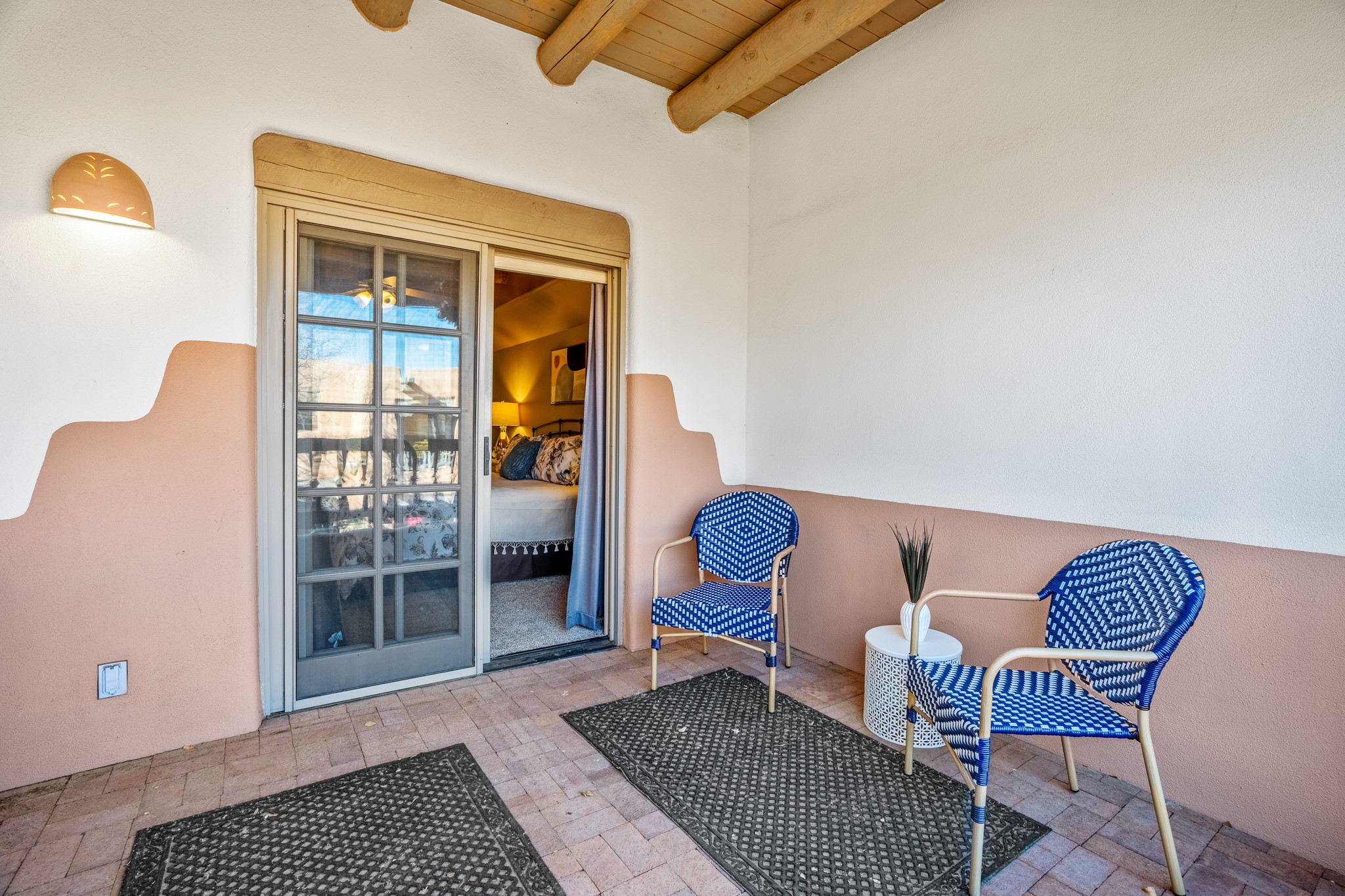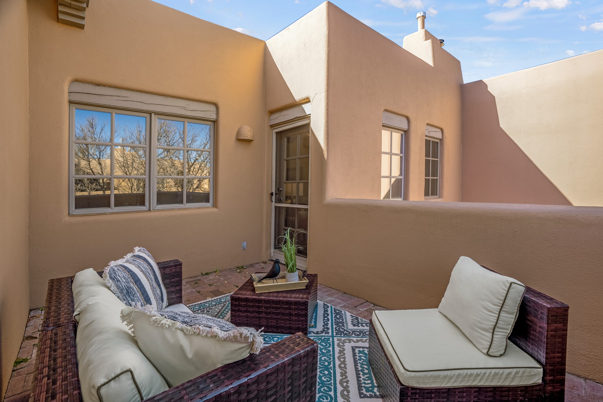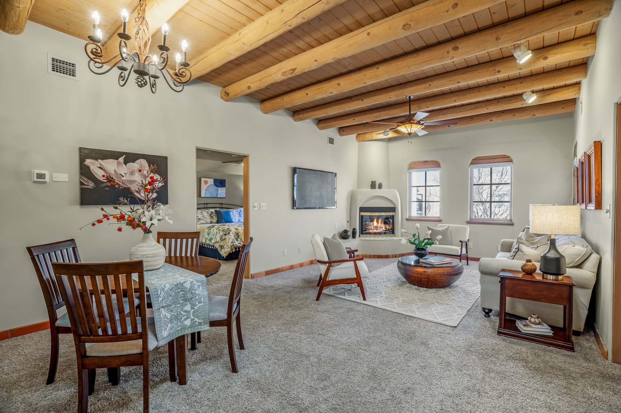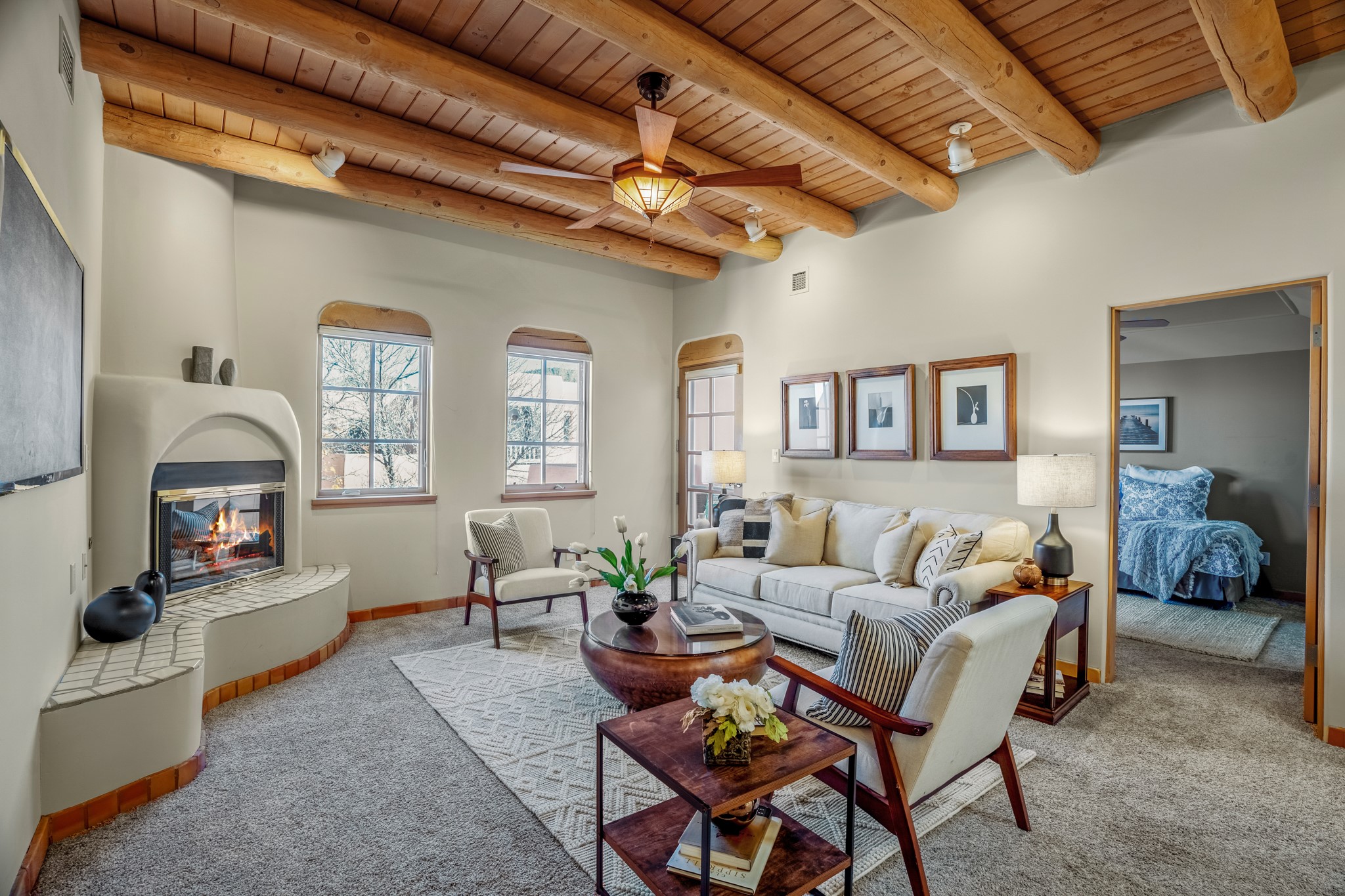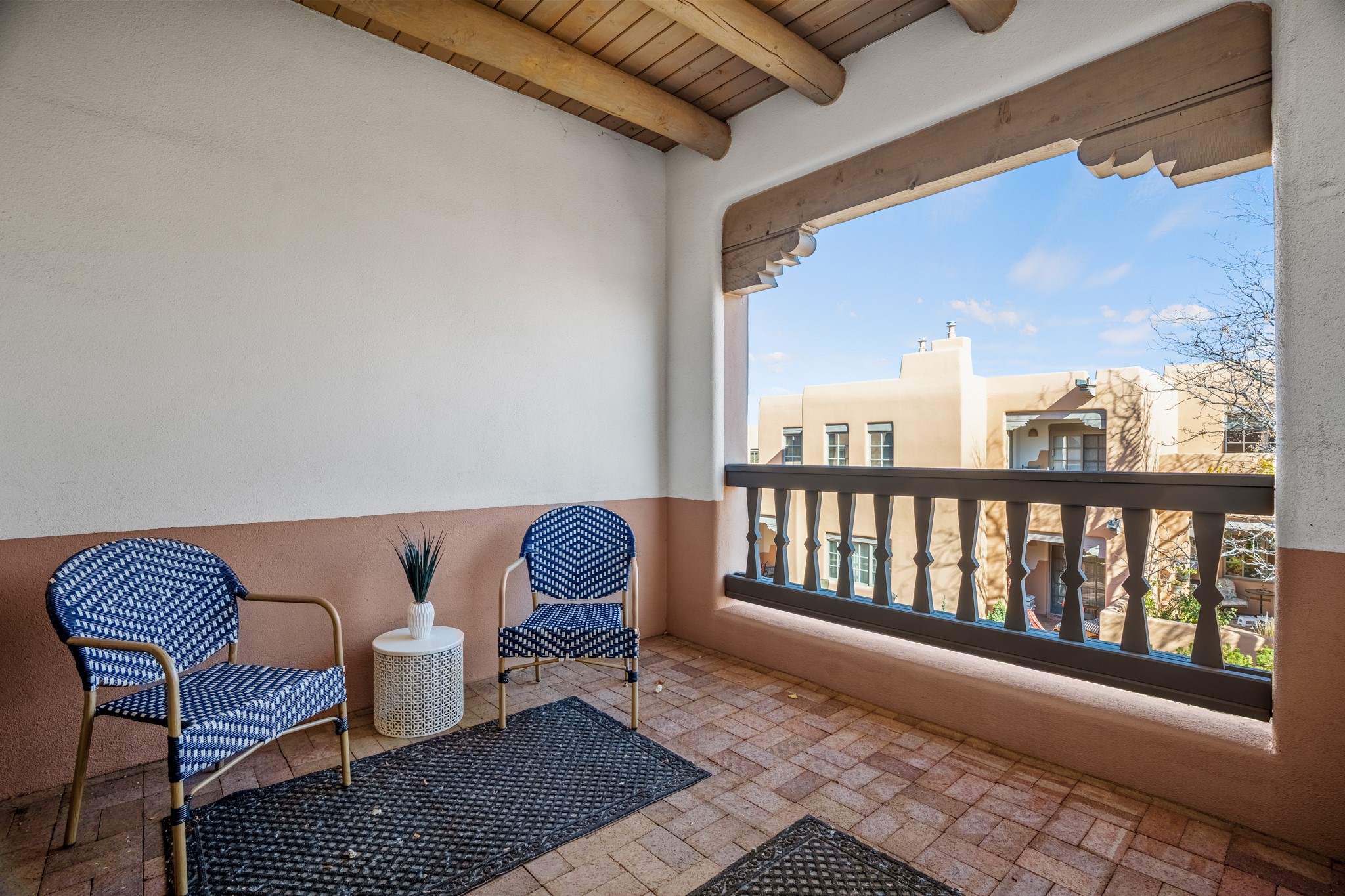 Resort Style living only minutes from the downtown. Welcome home to this second floor condo, three steps from the elevator. This unit embodies Santa Fe Style with vigas, saltillo tile and a kiva fireplace. There are two bedrooms and two balconies, one is oversized and covered. Come join Quail Run which offers community in a space that accommodates the times you need privacy and quiet. Ownership includes all of Quail Run's top notch amenities including golf, fitness, indoor pool, spa, gym, pickleball and more. 24 hour hosted security and stunning grounds, Quail Run remains one of a kind.