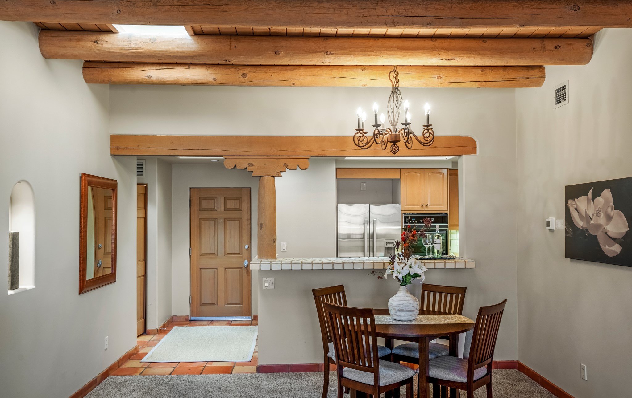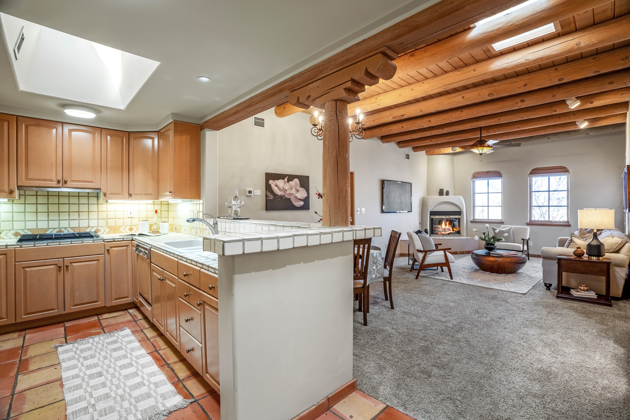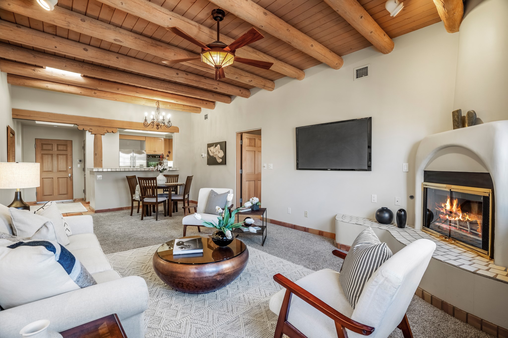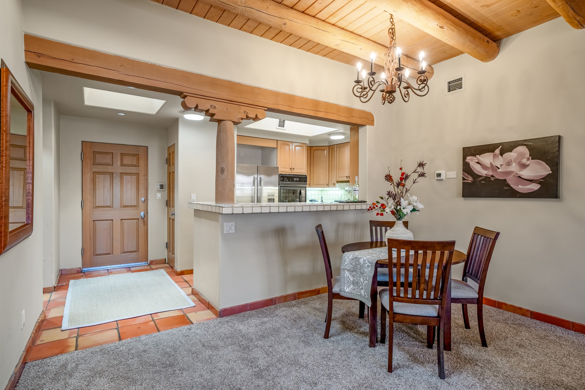 Resort Style living only minutes from the downtown. Welcome home to this second floor condo, three steps from the elevator. This unit embodies Santa Fe Style with vigas, saltillo tile and a kiva fireplace. There are two bedrooms and two balconies, one is oversized and covered. Come join Quail Run which offers community in a space that accommodates the times you need privacy and quiet. Ownership includes all of Quail Run's top notch amenities including golf, fitness, indoor pool, spa, gym, pickleball and more. 24 hour hosted security and stunning grounds, Quail Run remains one of a kind.