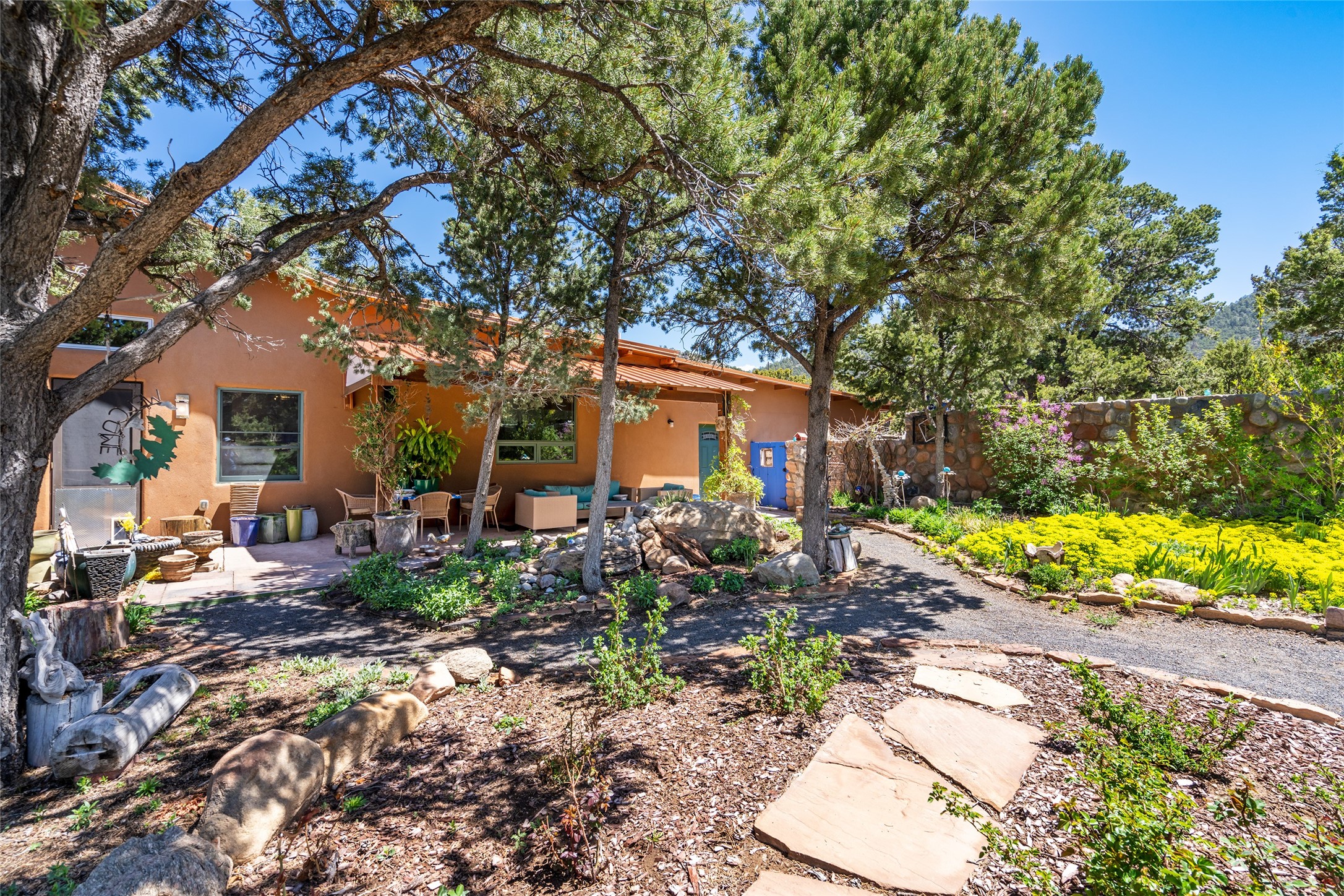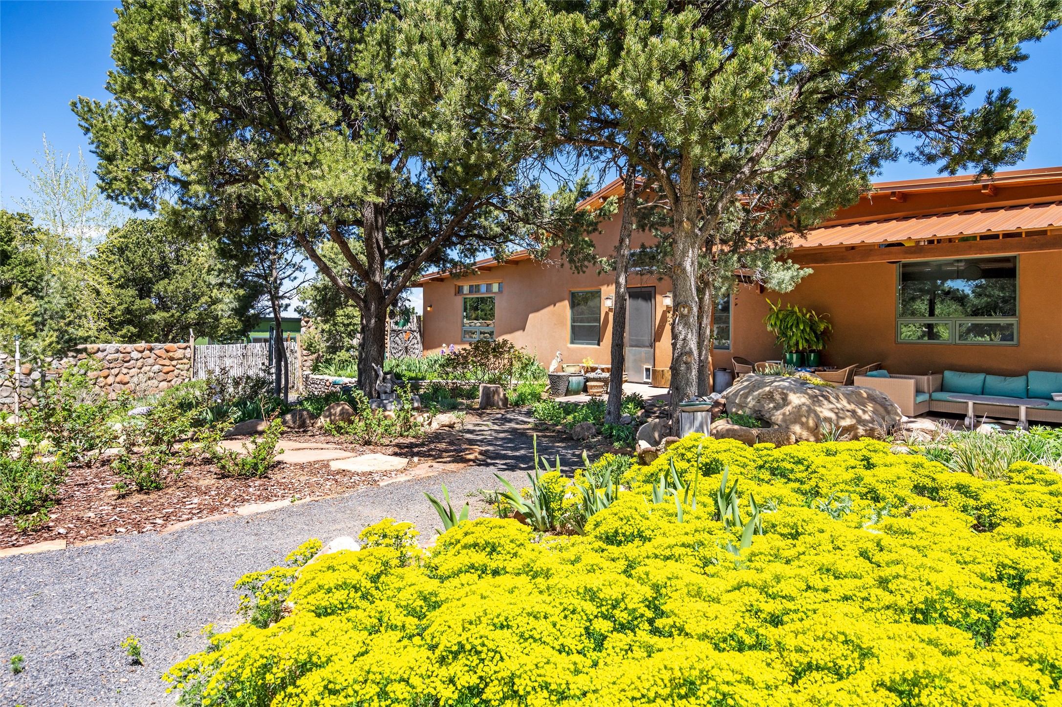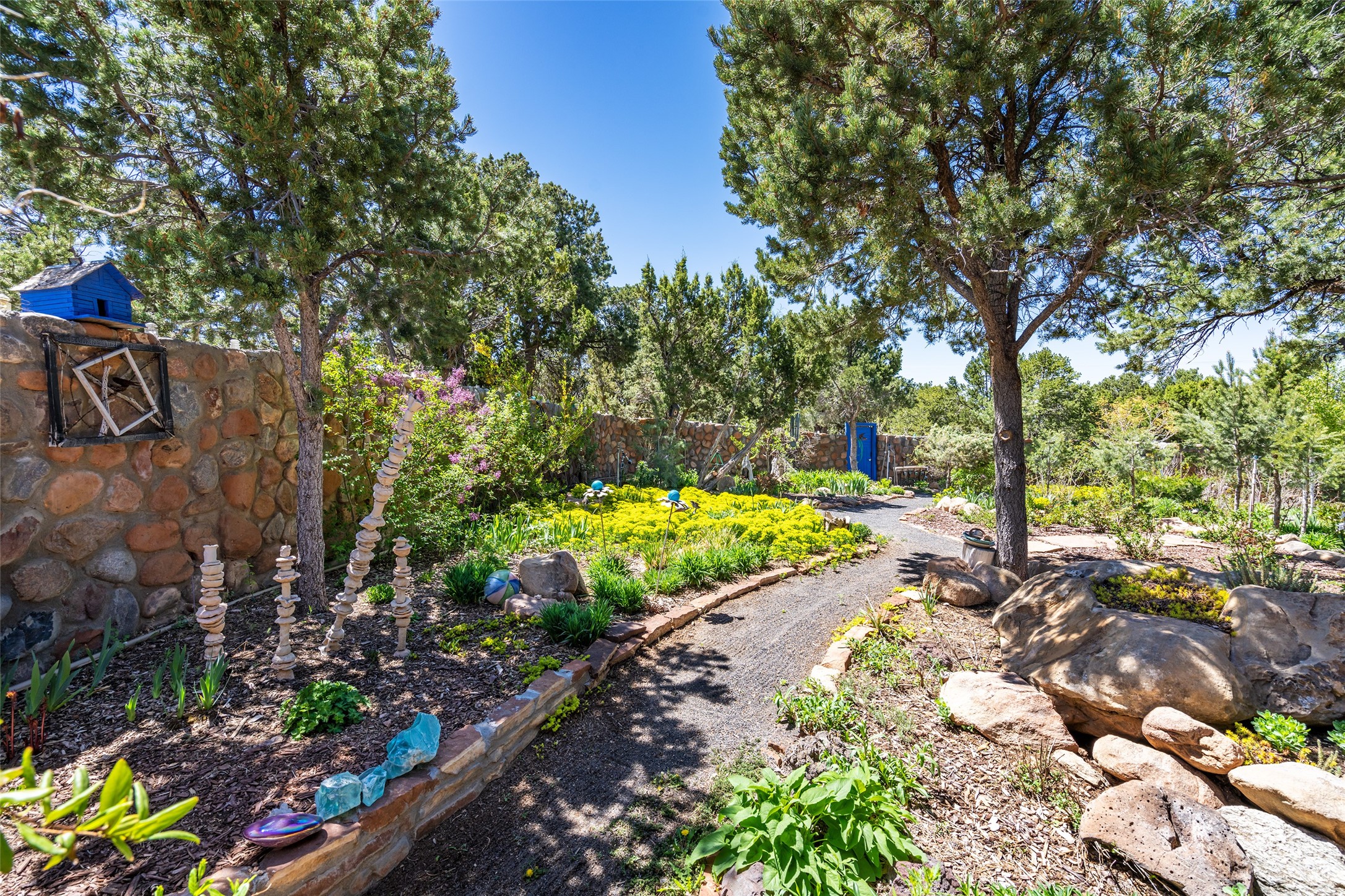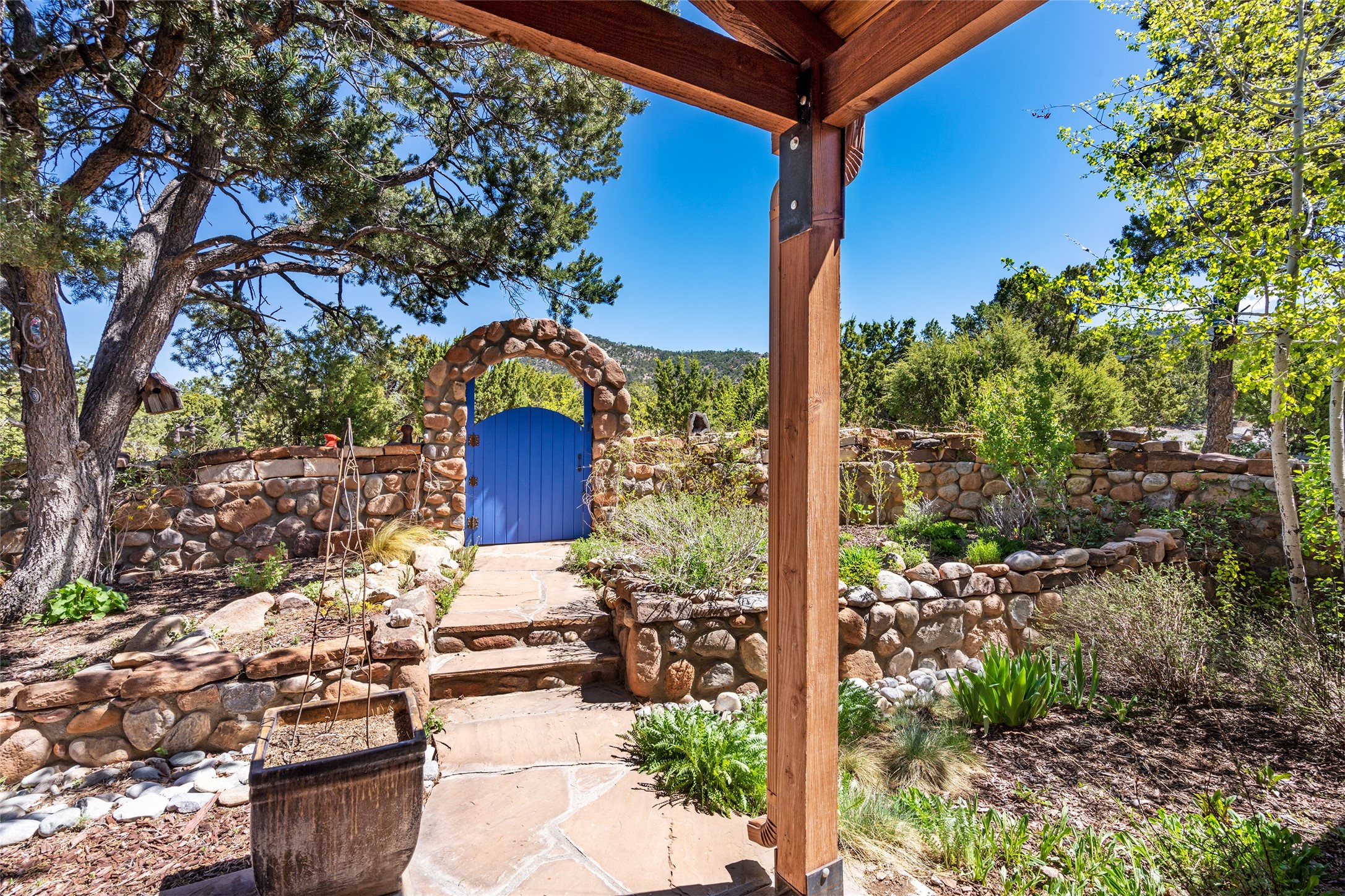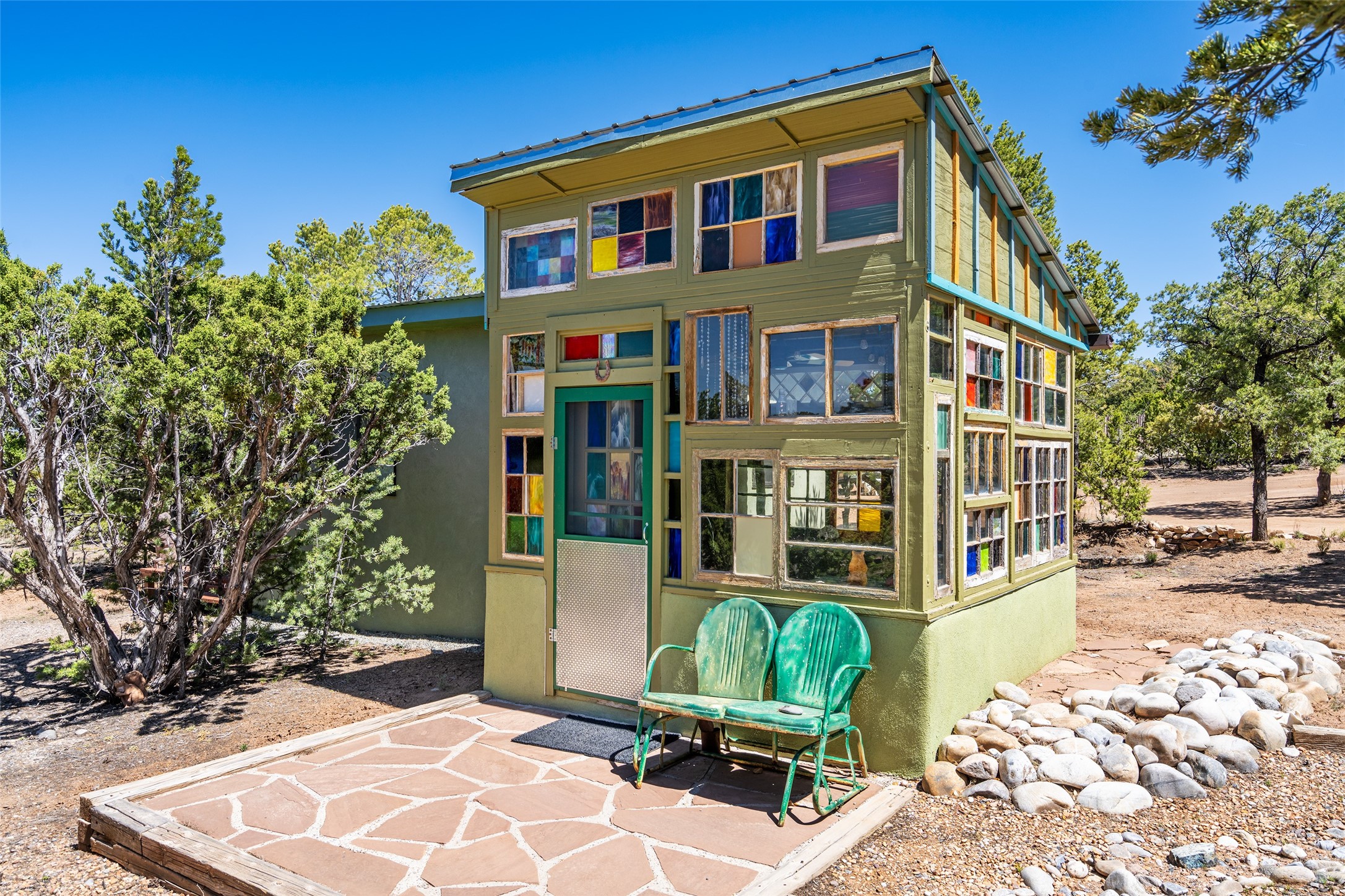 Welcome to this custom and unique gated compound on 5.76 acres just off the Old Santa Fe Trail. Built in 2016, the celebrated designer Todd Oldham credits his parents Linda and Jack Oldham with creating an "incubator of creativity." This fully fenced property features a pitched roof main house, a glass house with salvaged stained glass windows, a container modified into a hip, log cabin casita, a green house, an art house/studio, a wood shop, barn and stable. Lush and mature landscaping throughout with gardens galore and extensive rock work. Rare iris, mallows, clematis, plum, peach and cherry trees plus garden stone beds for growing corn, tomatoes, greens, cucumbers, sweet peas and strawberries; a true gardeners paradise. A private well with 13 acre feet of water and two, 2000 gallon tanks for efficient water reclamation. The main house at 4268 square feet has a pitched ceiling, an entry way with handmade tile and restored metal 1940s chandeliers, three bedrooms, large primary bathroom w/custom handmade tiles, one 3/4 bathroom and a colorful and artistically tiled 3rd bathroom, 1/2 bath with bird motif walls, den/studio, kitchen, walk-in pantry and plenty of wall space for artwork and collectibles. The kitchen has black marble counter tops and marble hexagon green tiled back splash with antique glass windows above the sink, double sided spice rack and stainless appliances. The over sized garage is 1461 sq. ft and has ample bonus storage. Solar panels are owned and provide 40% of the electricity which provides an effortlessly comfortable and thermally efficient environment. This is a remarkable, story book setting punctuated with bursts of color from mosaics, stained glass and other art installations created by the entire family. Just 10 minutes to the Santa Fe Plaza, near Harry's Road House, El Gancho Club and easy access to I-25. Don't miss seeing this private and peaceful retreat.
