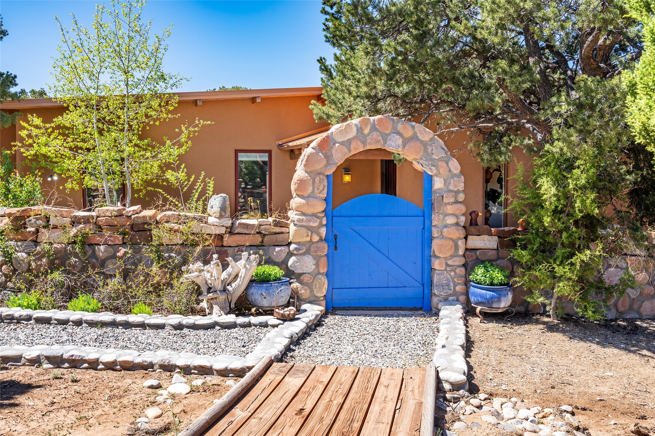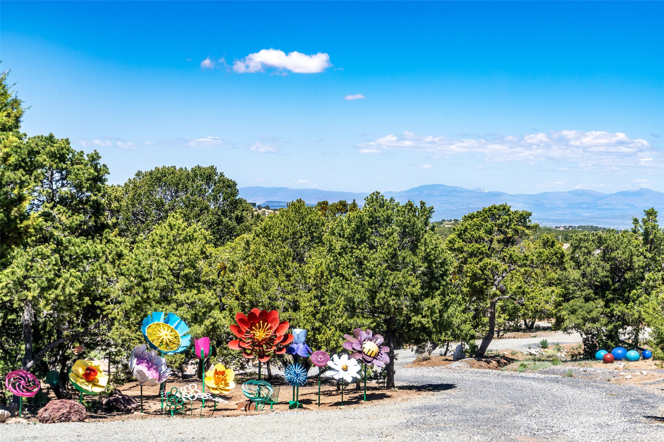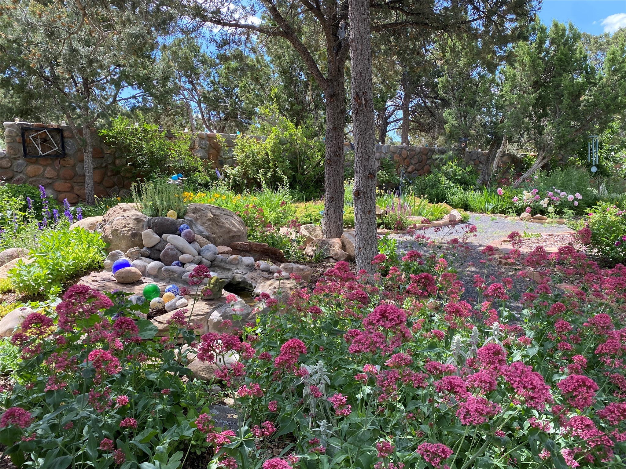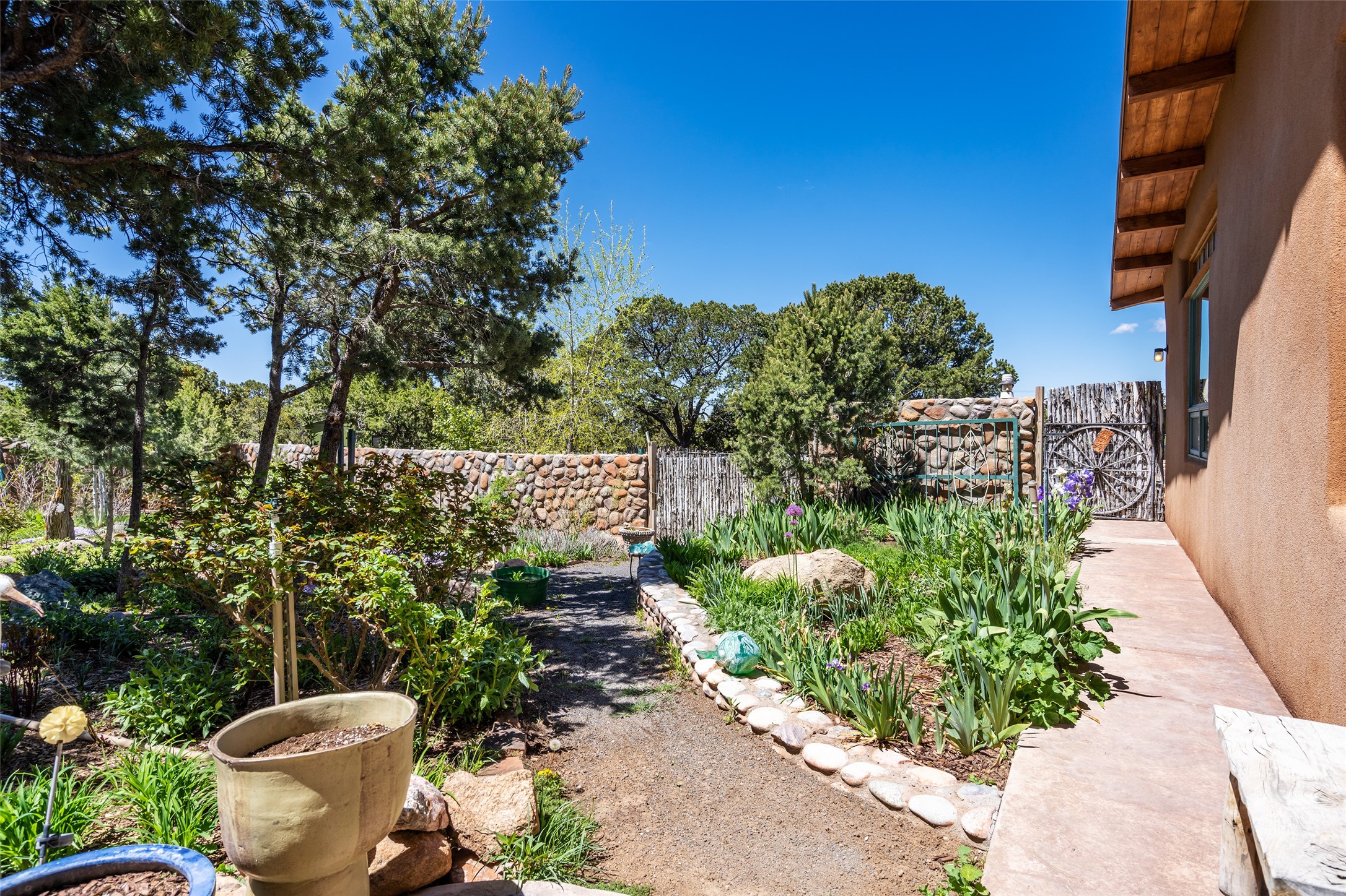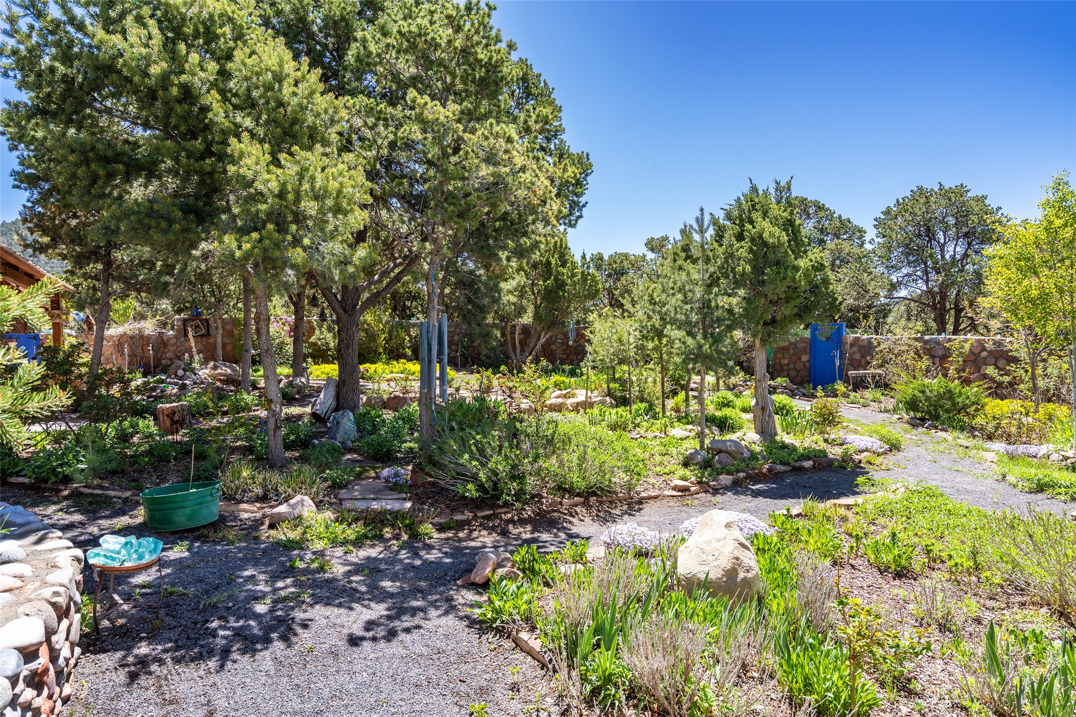 Welcome to this custom and unique gated compound on 5.76 acres just off the Old Santa Fe Trail. Built in 2016, the celebrated designer Todd Oldham credits his parents Linda and Jack Oldham with creating an "incubator of creativity." This fully fenced property features a pitched roof main house, a glass house with salvaged stained glass windows, a container modified into a hip, log cabin casita, a green house, an art house/studio, a wood shop, barn and stable. Lush and mature landscaping throughout with gardens galore and extensive rock work. Rare iris, mallows, clematis, plum, peach and cherry trees plus garden stone beds for growing corn, tomatoes, greens, cucumbers, sweet peas and strawberries; a true gardeners paradise. A private well with 13 acre feet of water and two, 2000 gallon tanks for efficient water reclamation. The main house at 4268 square feet has a pitched ceiling, an entry way with handmade tile and restored metal 1940s chandeliers, three bedrooms, large primary bathroom w/custom handmade tiles, one 3/4 bathroom and a colorful and artistically tiled 3rd bathroom, 1/2 bath with bird motif walls, den/studio, kitchen, walk-in pantry and plenty of wall space for artwork and collectibles. The kitchen has black marble counter tops and marble hexagon green tiled back splash with antique glass windows above the sink, double sided spice rack and stainless appliances. The over sized garage is 1461 sq. ft and has ample bonus storage. Solar panels are owned and provide 40% of the electricity which provides an effortlessly comfortable and thermally efficient environment. This is a remarkable, story book setting punctuated with bursts of color from mosaics, stained glass and other art installations created by the entire family. Just 10 minutes to the Santa Fe Plaza, near Harry's Road House, El Gancho Club and easy access to I-25. Don't miss seeing this private and peaceful retreat.