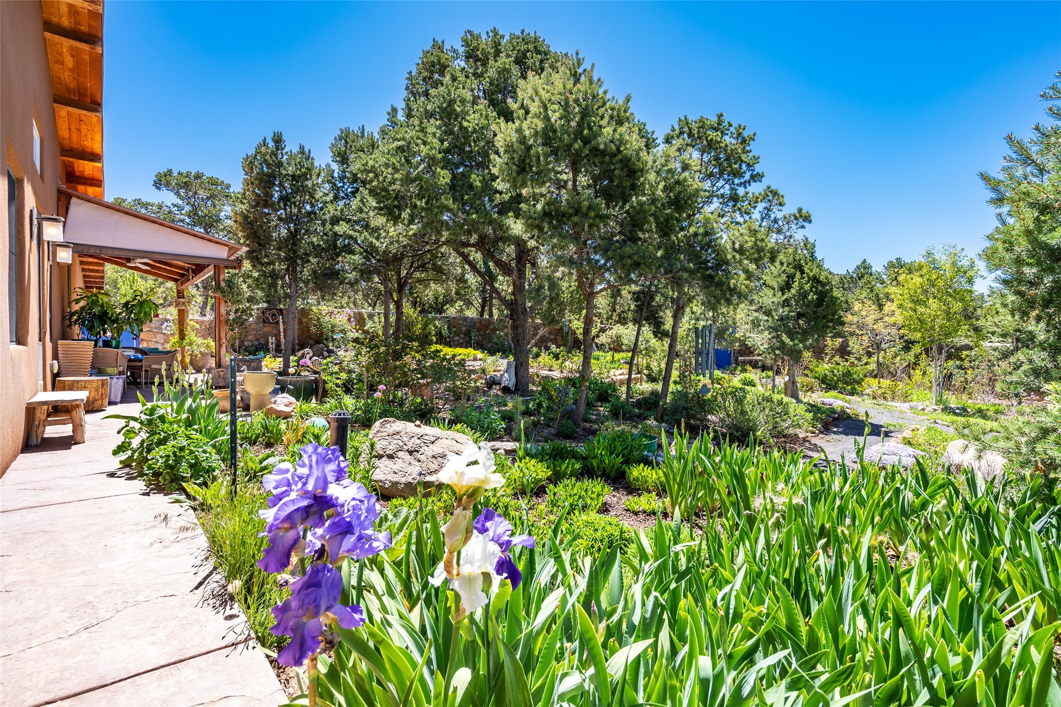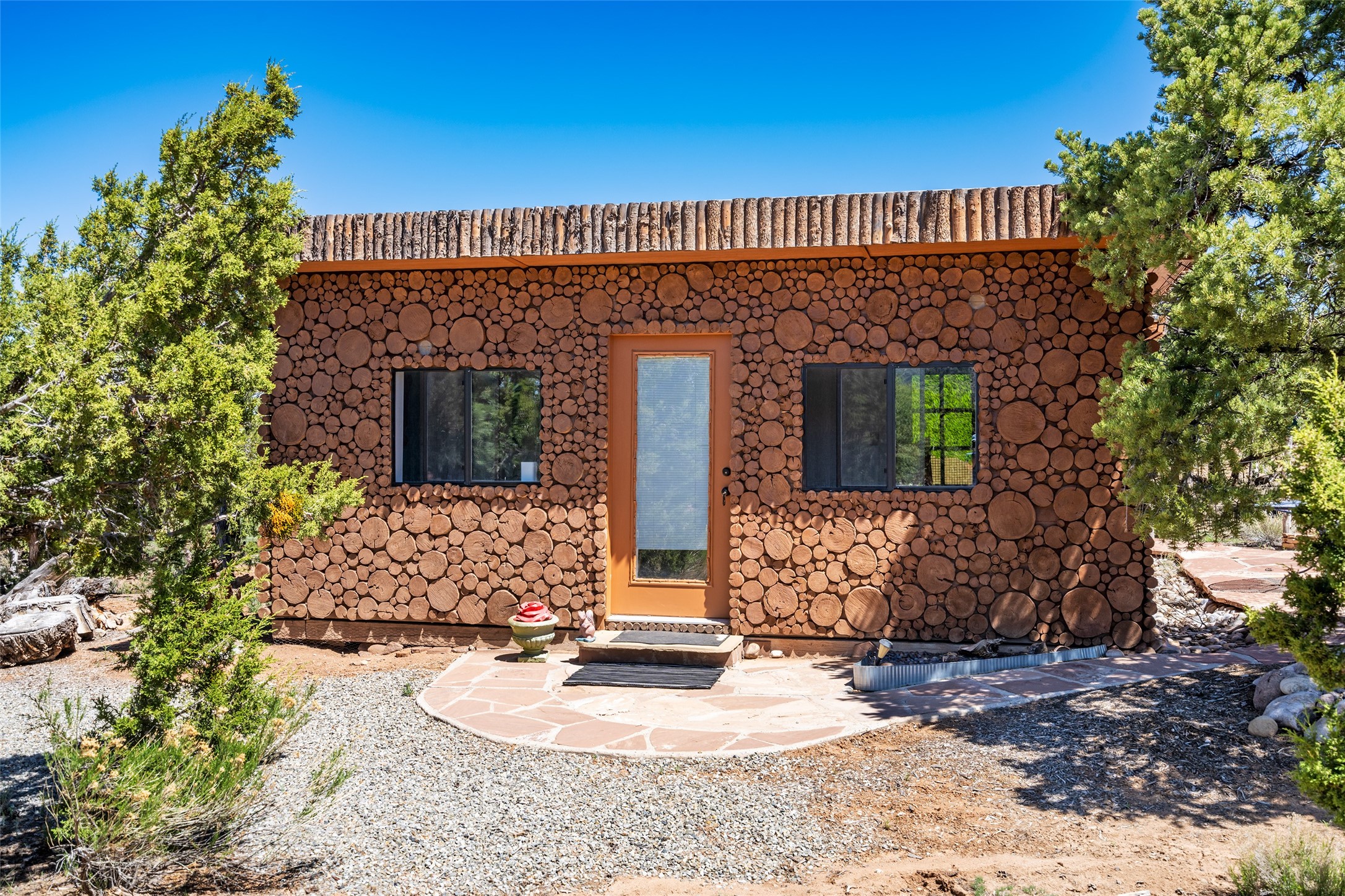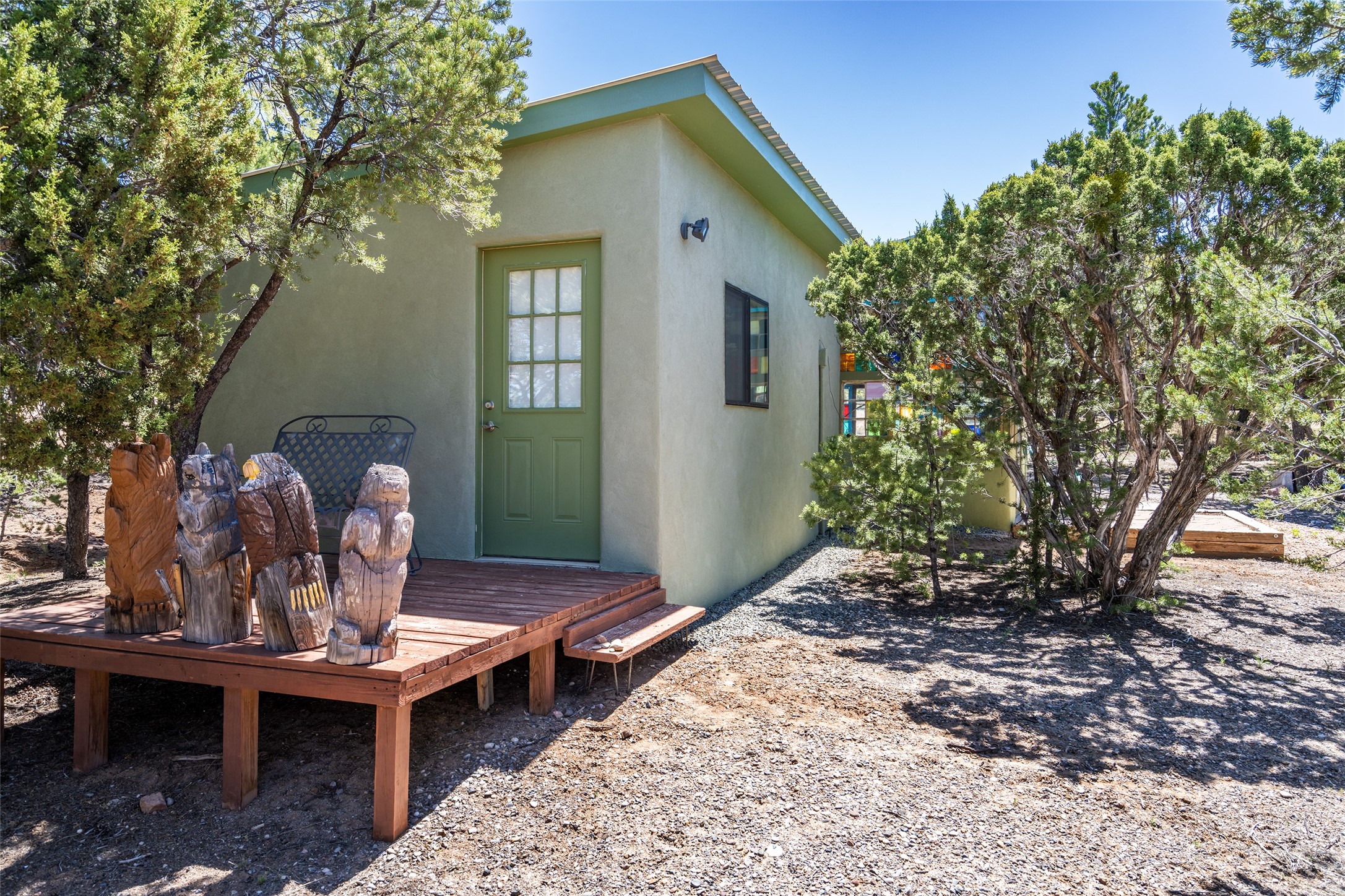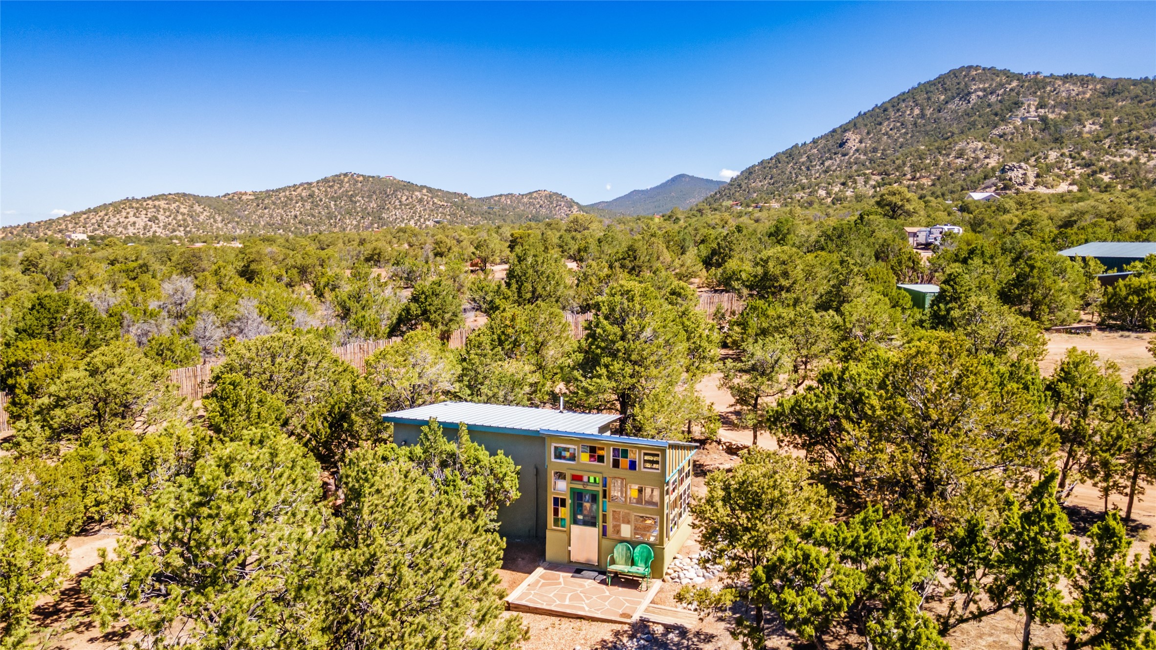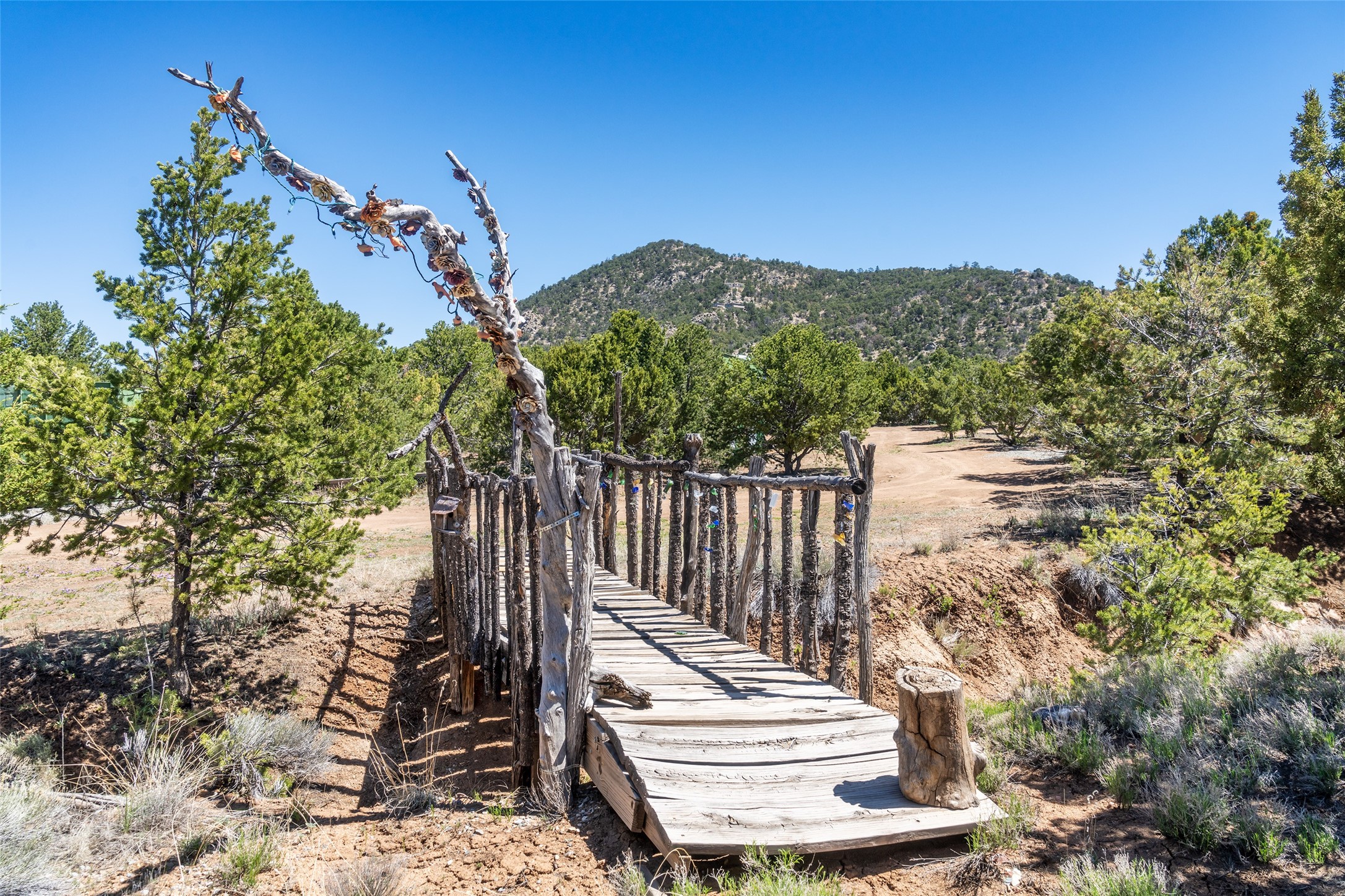 Welcome to this custom and unique gated compound on 5.76 acres just off the Old Santa Fe Trail. Built in 2016, the celebrated designer Todd Oldham credits his parents Linda and Jack Oldham with creating an "incubator of creativity." This fully fenced property features a pitched roof main house, a glass house with salvaged stained glass windows, a container modified into a hip, log cabin casita, a green house, an art house/studio, a wood shop, barn and stable. Lush and mature landscaping throughout with gardens galore and extensive rock work. Rare iris, mallows, clematis, plum, peach and cherry trees plus garden stone beds for growing corn, tomatoes, greens, cucumbers, sweet peas and strawberries; a true gardeners paradise. A private well with 13 acre feet of water and two, 2000 gallon tanks for efficient water reclamation. The main house at 4268 square feet has a pitched ceiling, an entry way with handmade tile and restored metal 1940s chandeliers, three bedrooms, large primary bathroom w/custom handmade tiles, one 3/4 bathroom and a colorful and artistically tiled 3rd bathroom, 1/2 bath with bird motif walls, den/studio, kitchen, walk-in pantry and plenty of wall space for artwork and collectibles. The kitchen has black marble counter tops and marble hexagon green tiled back splash with antique glass windows above the sink, double sided spice rack and stainless appliances. The over sized garage is 1461 sq. ft and has ample bonus storage. Solar panels are owned and provide 40% of the electricity which provides an effortlessly comfortable and thermally efficient environment. This is a remarkable, story book setting punctuated with bursts of color from mosaics, stained glass and other art installations created by the entire family. Just 10 minutes to the Santa Fe Plaza, near Harry's Road House, El Gancho Club and easy access to I-25. Don't miss seeing this private and peaceful retreat.