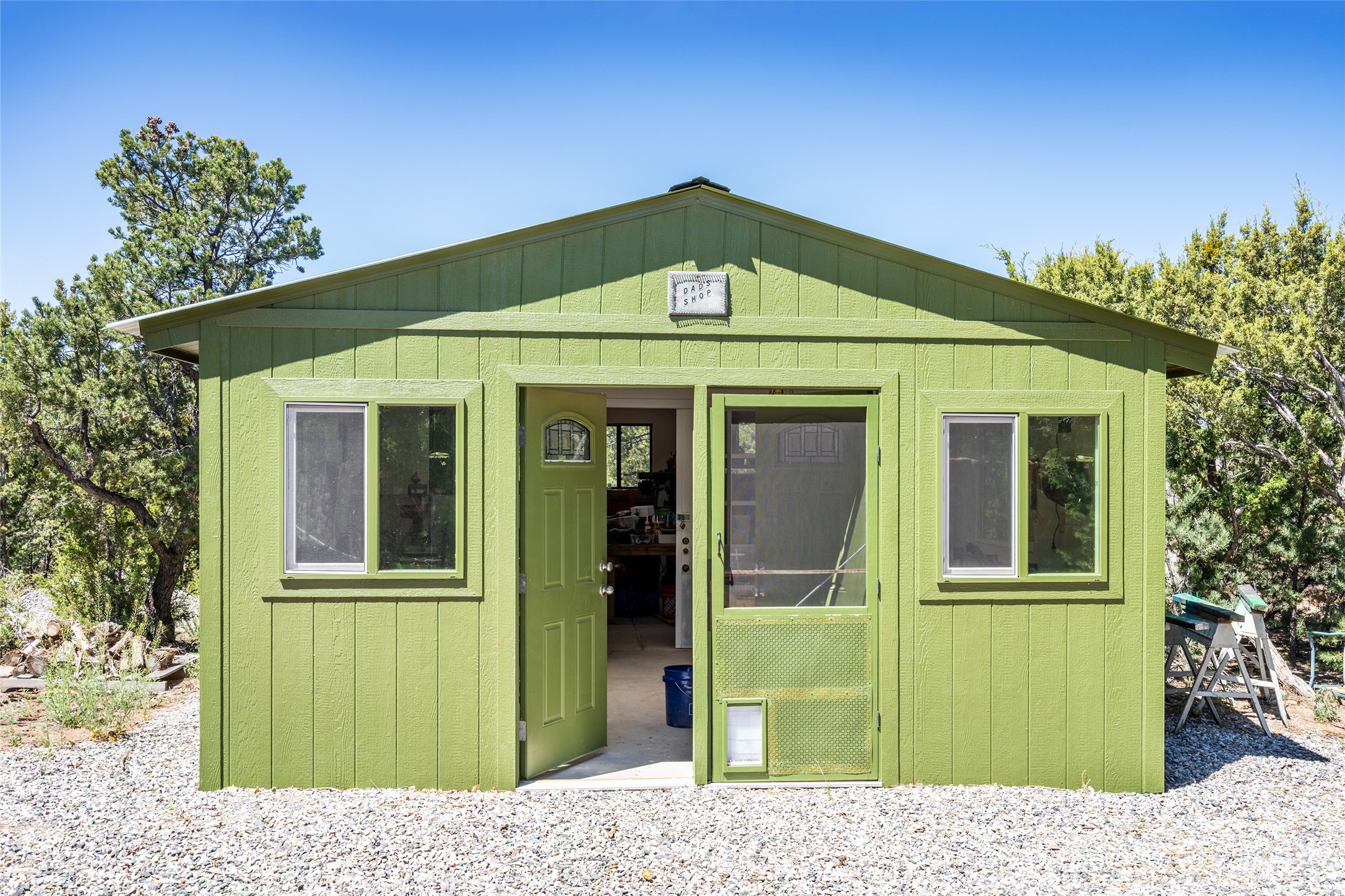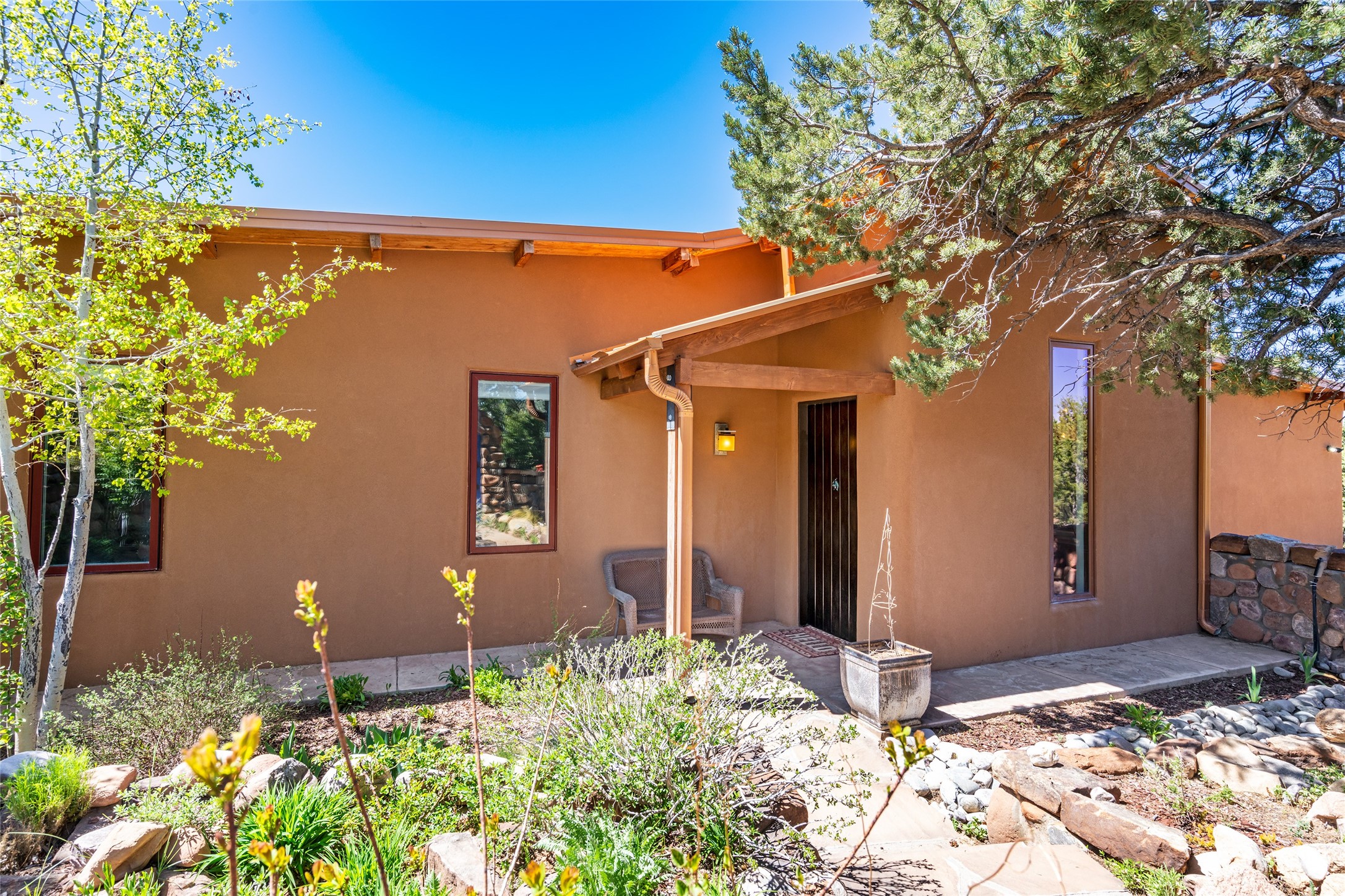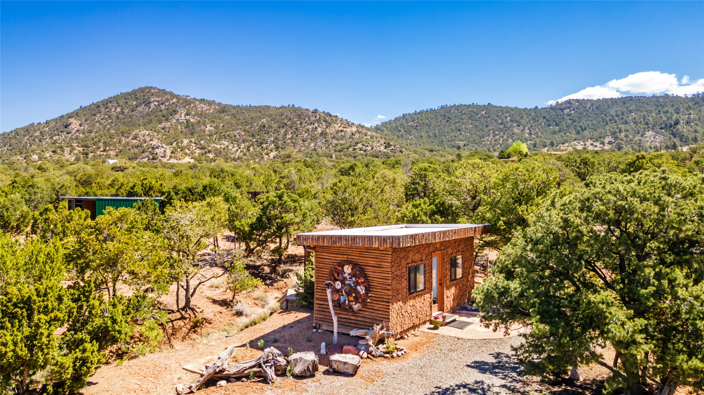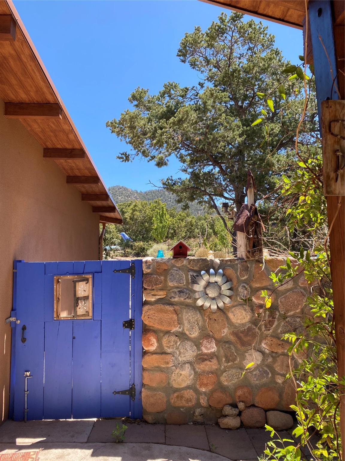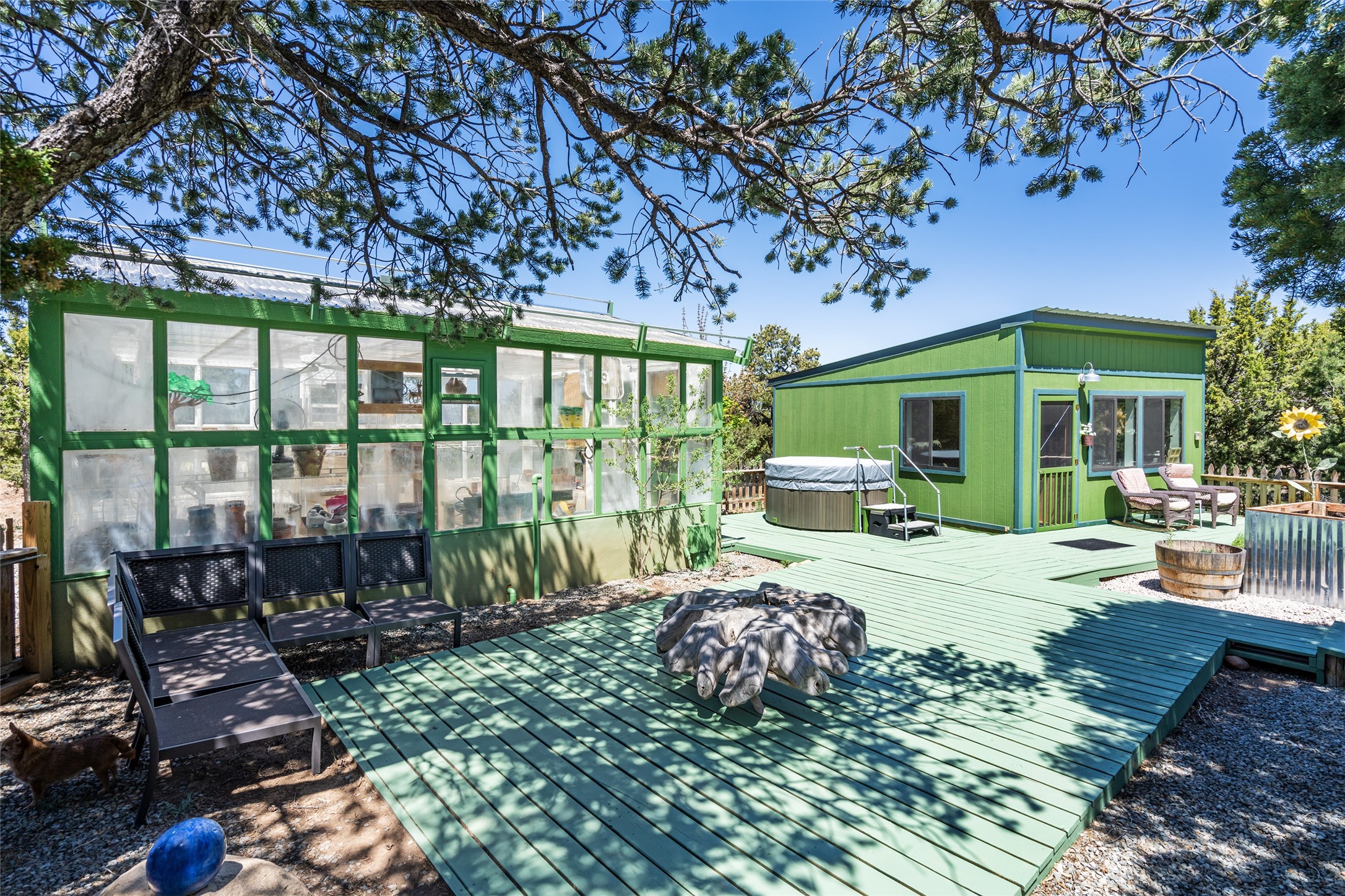Welcome to this custom and unique gated compound on 5.76 acres just off the Old Santa Fe Trail. Built in 2016, the celebrated designer Todd Oldham credits his parents Linda and Jack Oldham with creating an "incubator of creativity." This fully fenced property features a pitched roof main house, a glass house with salvaged stained glass windows, a container modified into a hip, log cabin casita, a green house, an art house/studio, a wood shop, barn and stable. Lush and mature landscaping throughout with gardens galore and extensive rock work. Rare iris, mallows, clematis, plum, peach and cherry trees plus garden stone beds for growing corn, tomatoes, greens, cucumbers, sweet peas and strawberries; a true gardeners paradise. A private well with 13 acre feet of water and two, 2000 gallon tanks for efficient water reclamation. The main house at 4268 square feet has a pitched ceiling, an entry way with handmade tile and restored metal 1940s chandeliers, three bedrooms, large primary bathroom w/custom handmade tiles, one 3/4 bathroom and a colorful and artistically tiled 3rd bathroom, 1/2 bath with bird motif walls, den/studio, kitchen, walk-in pantry and plenty of wall space for artwork and collectibles. The kitchen has black marble counter tops and marble hexagon green tiled back splash with antique glass windows above the sink, double sided spice rack and stainless appliances. The over sized garage is 1461 sq. ft and has ample bonus storage. Solar panels are owned and provide 40% of the electricity which provides an effortlessly comfortable and thermally efficient environment. This is a remarkable, story book setting punctuated with bursts of color from mosaics, stained glass and other art installations created by the entire family. Just 10 minutes to the Santa Fe Plaza, near Harry's Road House, El Gancho Club and easy access to I-25. Don't miss seeing this private and peaceful retreat.
