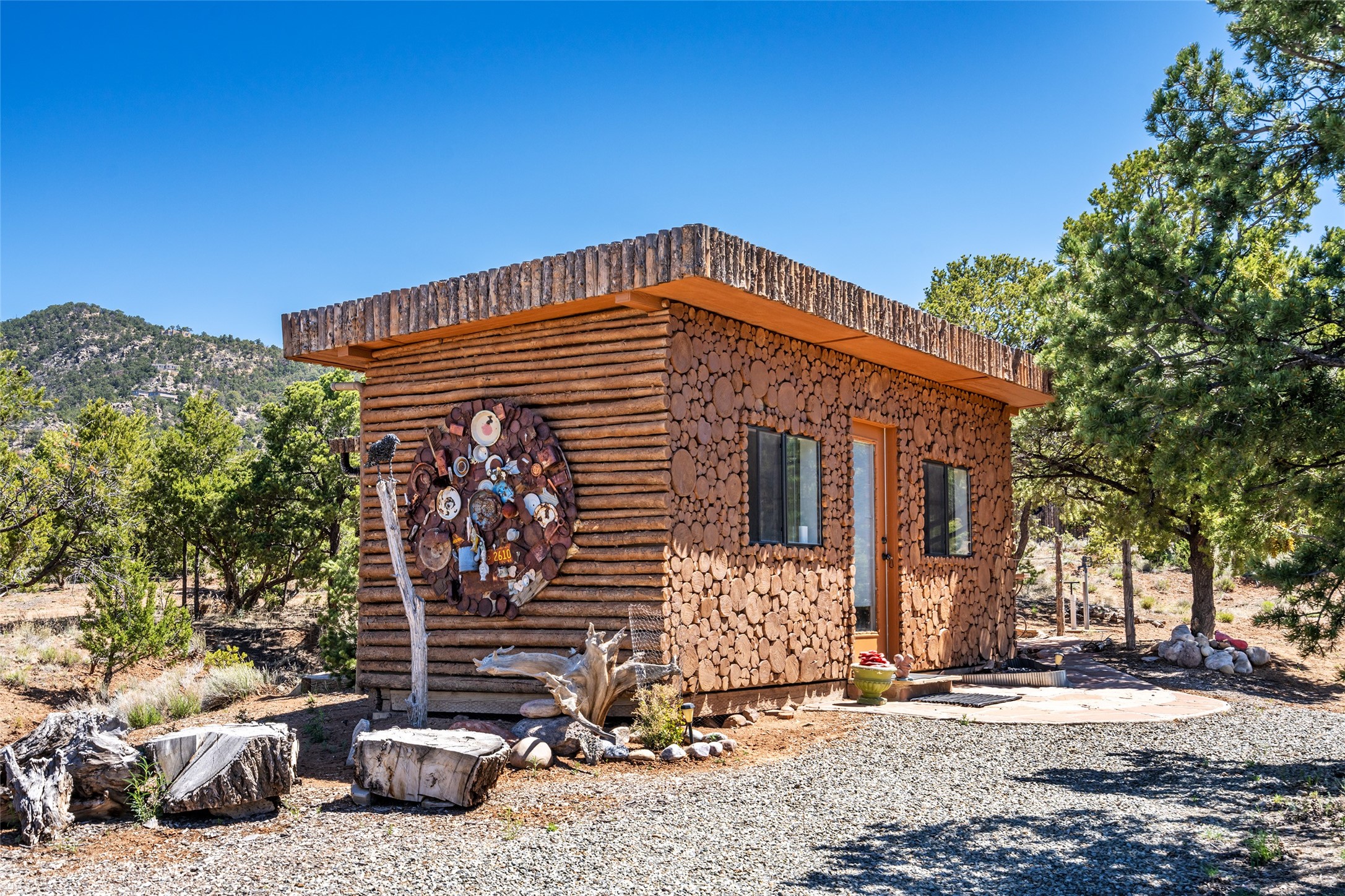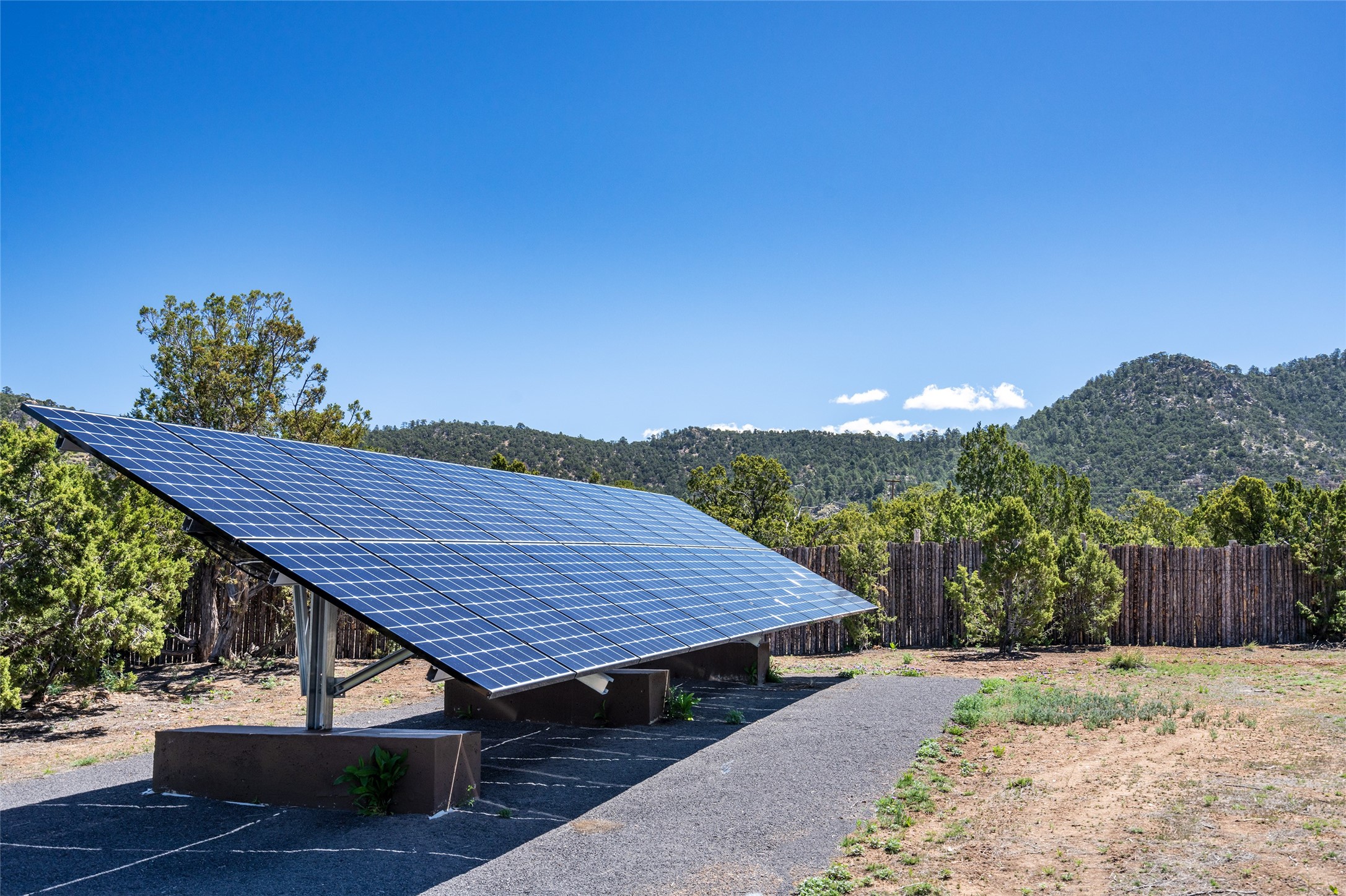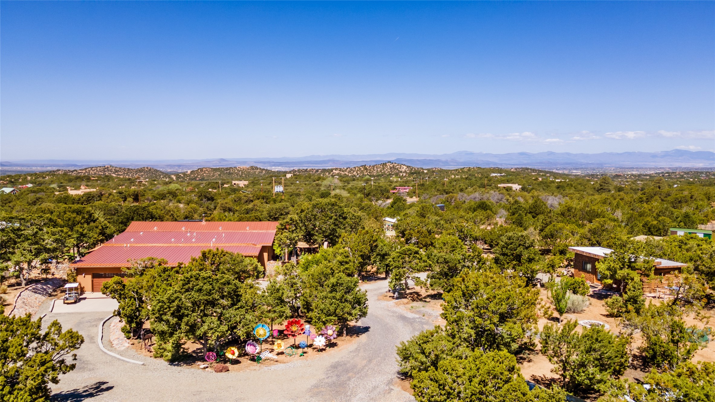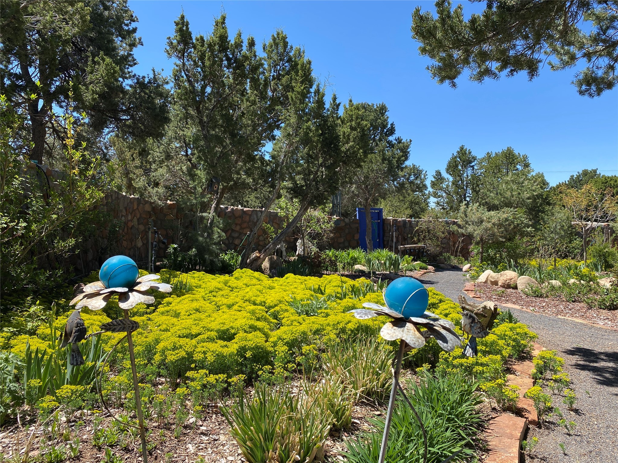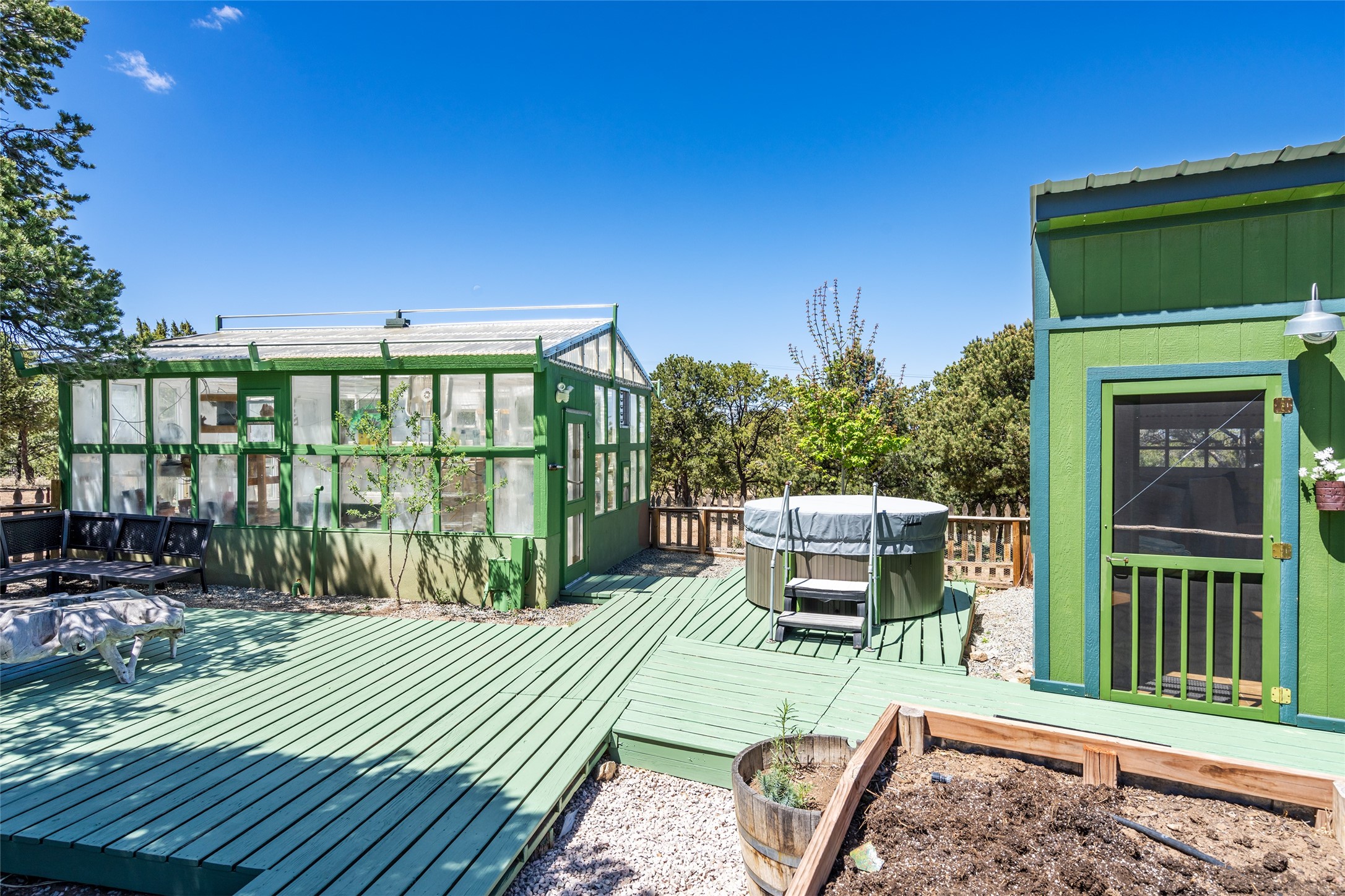 Welcome to this custom and unique gated compound on 5.76 acres just off the Old Santa Fe Trail. Built in 2016, the celebrated designer Todd Oldham credits his parents Linda and Jack Oldham with creating an "incubator of creativity." This fully fenced property features a pitched roof main house, a glass house with salvaged stained glass windows, a container modified into a hip, log cabin casita, a green house, an art house/studio, a wood shop, barn and stable. Lush and mature landscaping throughout with gardens galore and extensive rock work. Rare iris, mallows, clematis, plum, peach and cherry trees plus garden stone beds for growing corn, tomatoes, greens, cucumbers, sweet peas and strawberries; a true gardeners paradise. A private well with 13 acre feet of water and two, 2000 gallon tanks for efficient water reclamation. The main house at 4268 square feet has a pitched ceiling, an entry way with handmade tile and restored metal 1940s chandeliers, three bedrooms, large primary bathroom w/custom handmade tiles, one 3/4 bathroom and a colorful and artistically tiled 3rd bathroom, 1/2 bath with bird motif walls, den/studio, kitchen, walk-in pantry and plenty of wall space for artwork and collectibles. The kitchen has black marble counter tops and marble hexagon green tiled back splash with antique glass windows above the sink, double sided spice rack and stainless appliances. The over sized garage is 1461 sq. ft and has ample bonus storage. Solar panels are owned and provide 40% of the electricity which provides an effortlessly comfortable and thermally efficient environment. This is a remarkable, story book setting punctuated with bursts of color from mosaics, stained glass and other art installations created by the entire family. Just 10 minutes to the Santa Fe Plaza, near Harry's Road House, El Gancho Club and easy access to I-25. Don't miss seeing this private and peaceful retreat.