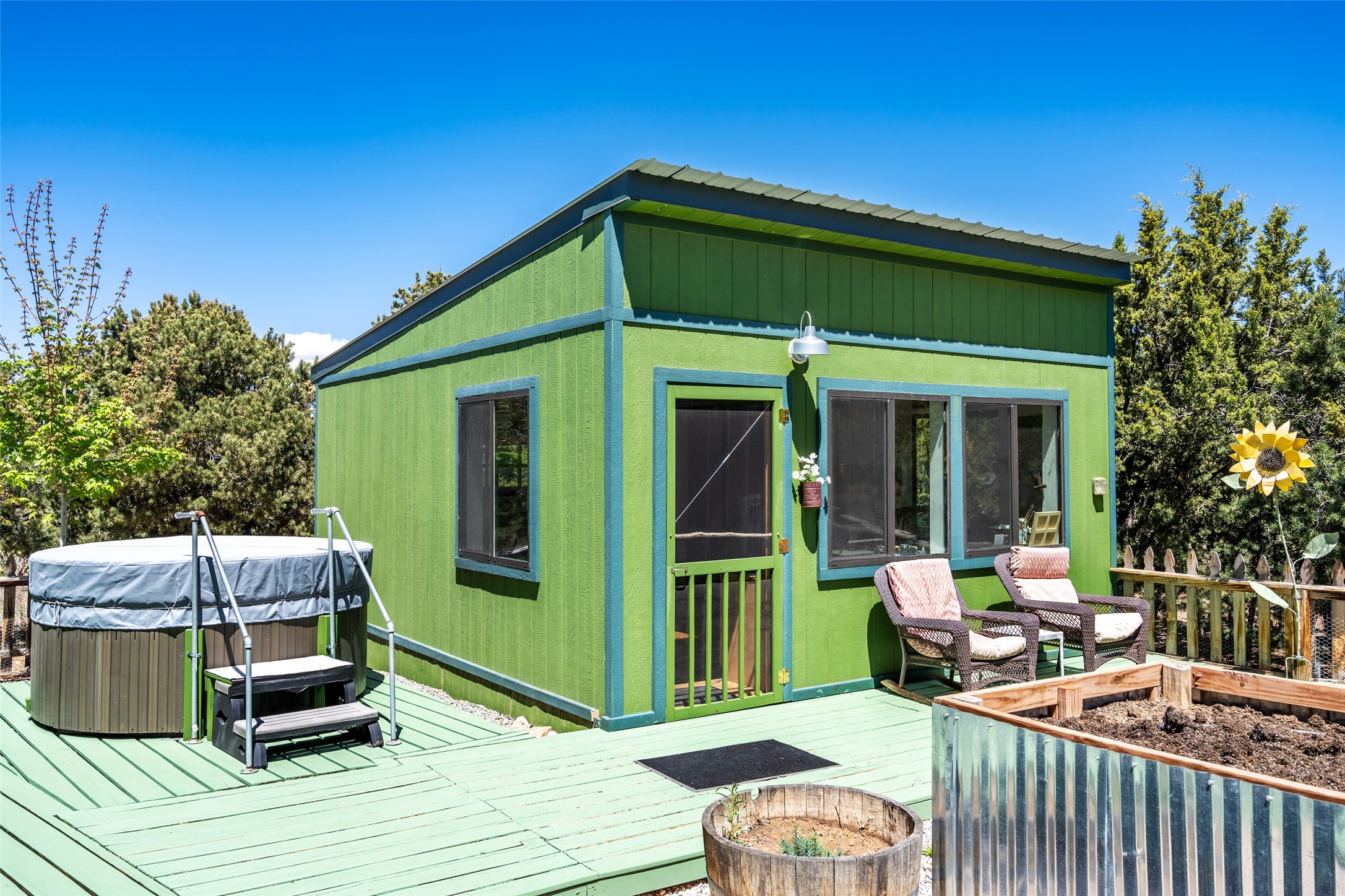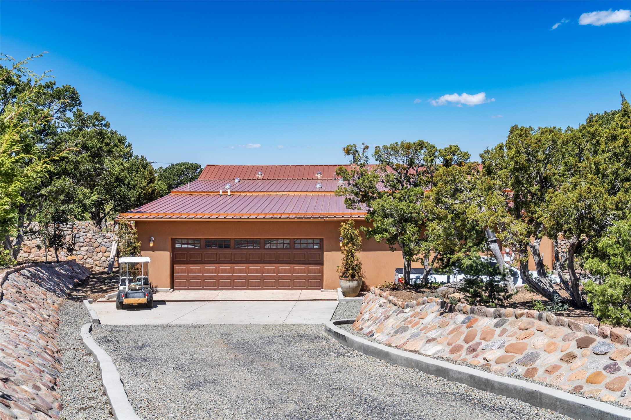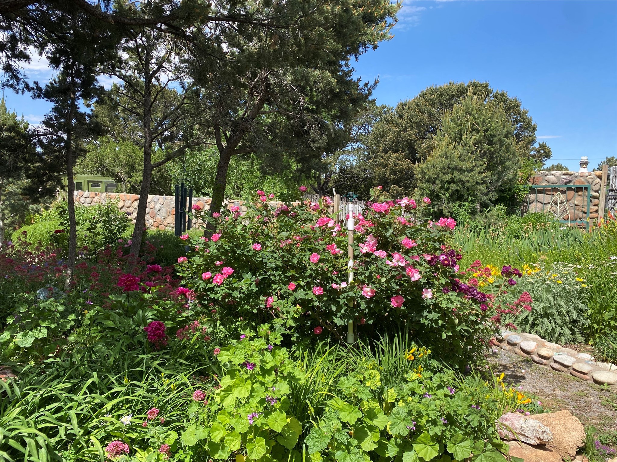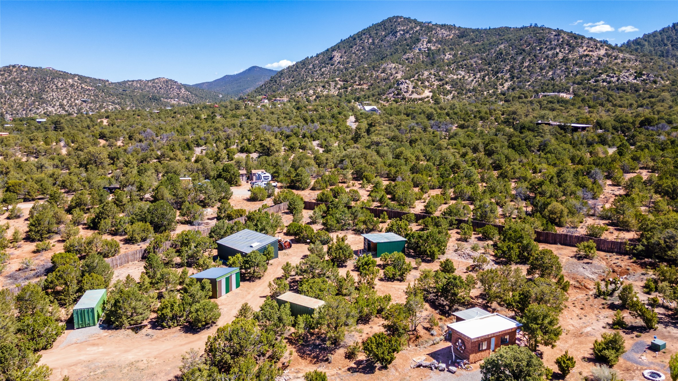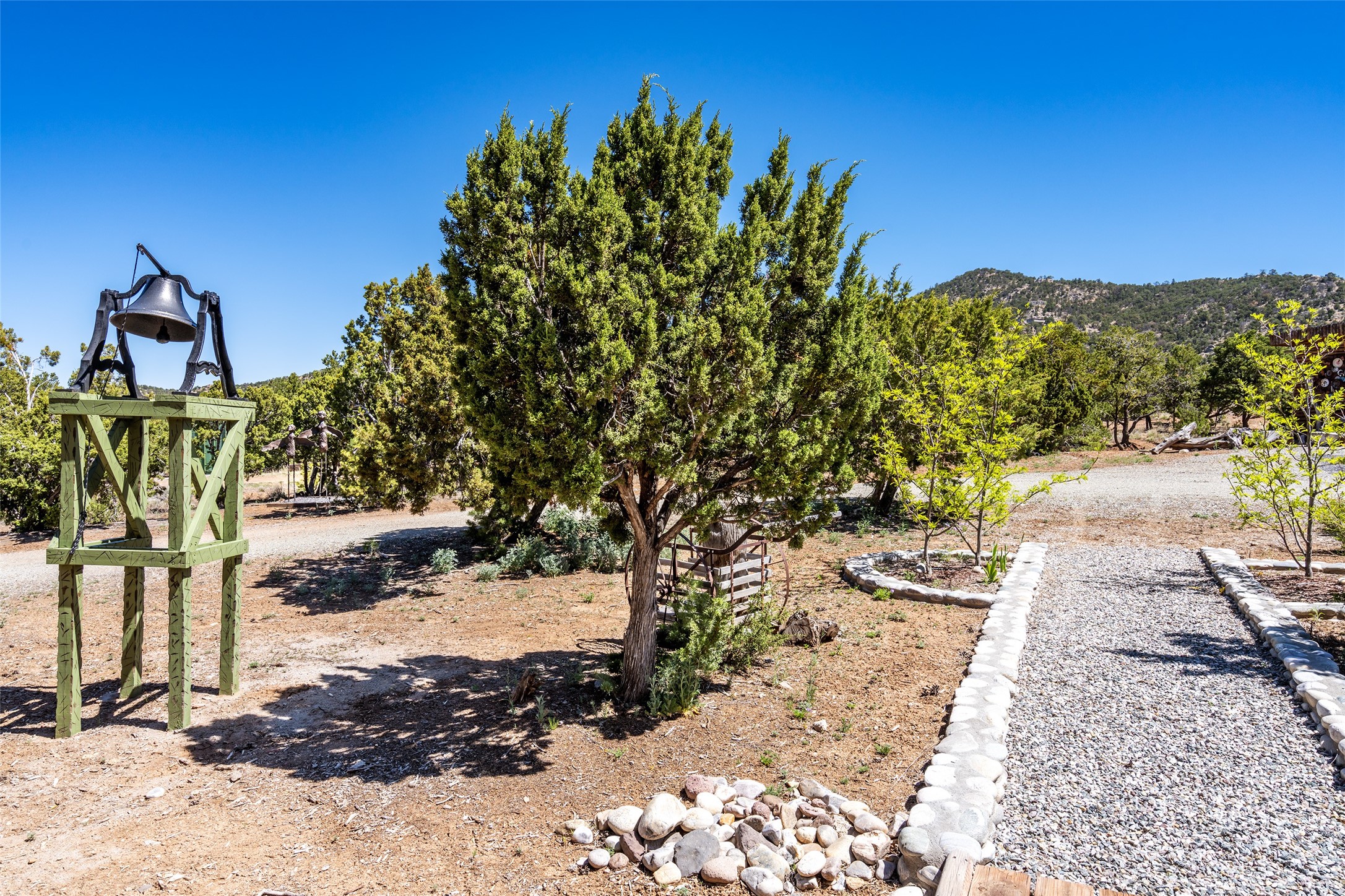Welcome to this custom and unique gated compound on 5.76 acres just off the Old Santa Fe Trail. Built in 2016, the celebrated designer Todd Oldham credits his parents Linda and Jack Oldham with creating an "incubator of creativity." This fully fenced property features a pitched roof main house, a glass house with salvaged stained glass windows, a container modified into a hip, log cabin casita, a green house, an art house/studio, a wood shop, barn and stable. Lush and mature landscaping throughout with gardens galore and extensive rock work. Rare iris, mallows, clematis, plum, peach and cherry trees plus garden stone beds for growing corn, tomatoes, greens, cucumbers, sweet peas and strawberries; a true gardeners paradise. A private well with 13 acre feet of water and two, 2000 gallon tanks for efficient water reclamation. The main house at 4268 square feet has a pitched ceiling, an entry way with handmade tile and restored metal 1940s chandeliers, three bedrooms, large primary bathroom w/custom handmade tiles, one 3/4 bathroom and a colorful and artistically tiled 3rd bathroom, 1/2 bath with bird motif walls, den/studio, kitchen, walk-in pantry and plenty of wall space for artwork and collectibles. The kitchen has black marble counter tops and marble hexagon green tiled back splash with antique glass windows above the sink, double sided spice rack and stainless appliances. The over sized garage is 1461 sq. ft and has ample bonus storage. Solar panels are owned and provide 40% of the electricity which provides an effortlessly comfortable and thermally efficient environment. This is a remarkable, story book setting punctuated with bursts of color from mosaics, stained glass and other art installations created by the entire family. Just 10 minutes to the Santa Fe Plaza, near Harry's Road House, El Gancho Club and easy access to I-25. Don't miss seeing this private and peaceful retreat.