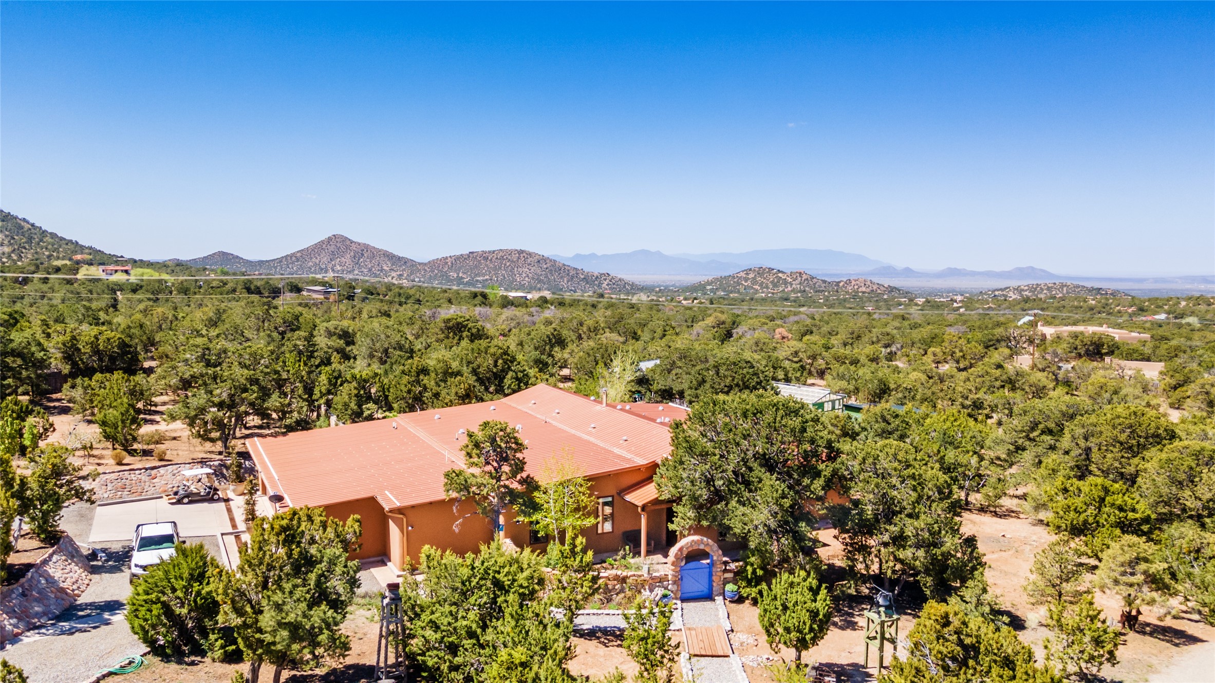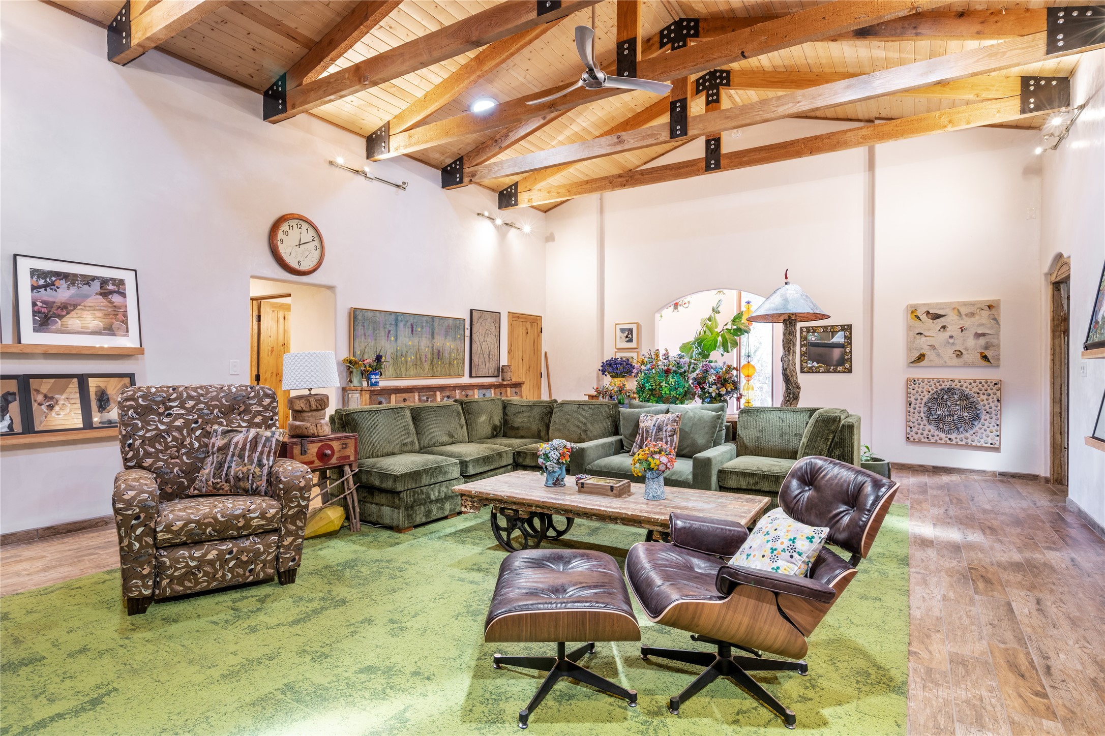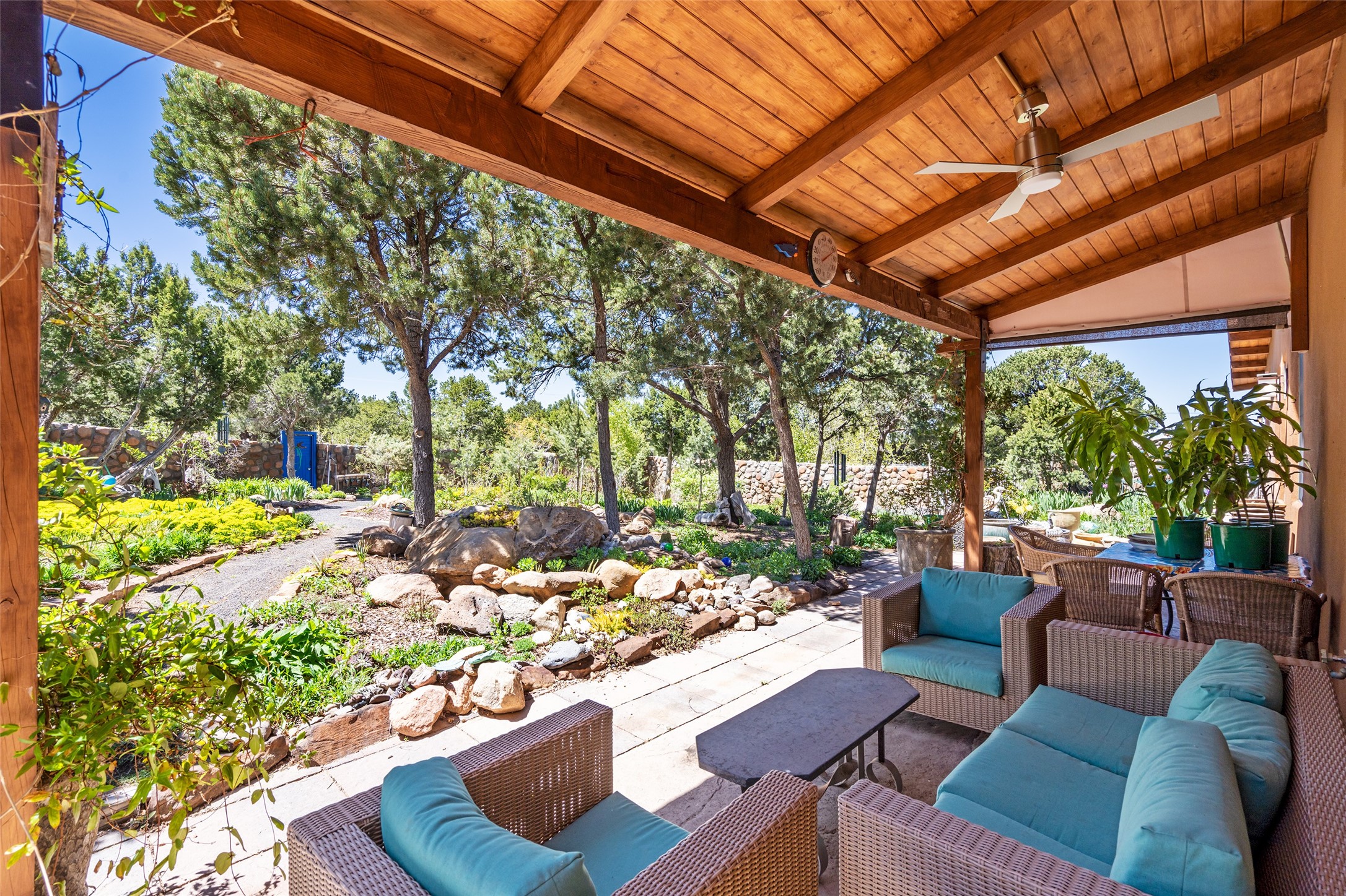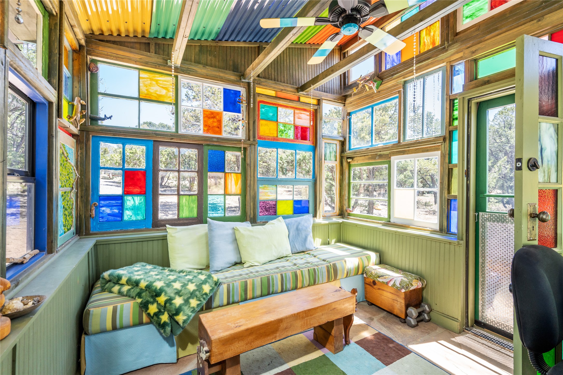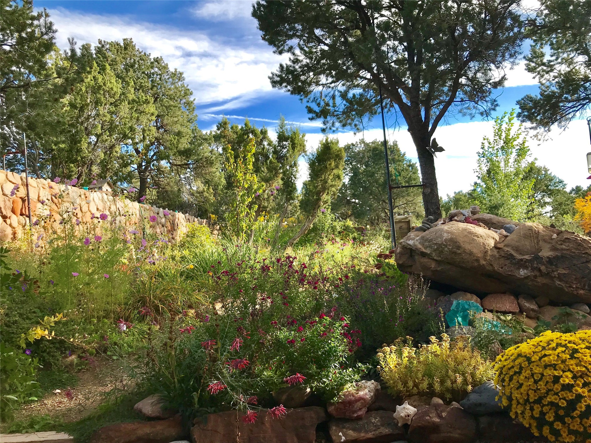 Welcome to this custom and unique gated compound on 5.76 acres just off the Old Santa Fe Trail. Built in 2016, the celebrated designer Todd Oldham credits his parents Linda and Jack Oldham with creating an "incubator of creativity." This fully fenced property features a pitched roof main house, a glass house with salvaged stained glass windows, a container modified into a hip, log cabin casita, a green house, an art house/studio, a wood shop, barn and stable. Lush and mature landscaping throughout with gardens galore and extensive rock work. Rare iris, mallows, clematis, plum, peach and cherry trees plus garden stone beds for growing corn, tomatoes, greens, cucumbers, sweet peas and strawberries; a true gardeners paradise. A private well with 13 acre feet of water and two, 2000 gallon tanks for efficient water reclamation. The main house at 4268 square feet has a pitched ceiling, an entry way with handmade tile and restored metal 1940s chandeliers, three bedrooms, large primary bathroom w/custom handmade tiles, one 3/4 bathroom and a colorful and artistically tiled 3rd bathroom, 1/2 bath with bird motif walls, den/studio, kitchen, walk-in pantry and plenty of wall space for artwork and collectibles. The kitchen has black marble counter tops and marble hexagon green tiled back splash with antique glass windows above the sink, double sided spice rack and stainless appliances. The over sized garage is 1461 sq. ft and has ample bonus storage. Solar panels are owned and provide 40% of the electricity which provides an effortlessly comfortable and thermally efficient environment. This is a remarkable, story book setting punctuated with bursts of color from mosaics, stained glass and other art installations created by the entire family. Just 10 minutes to the Santa Fe Plaza, near Harry's Road House, El Gancho Club and easy access to I-25. Don't miss seeing this private and peaceful retreat.