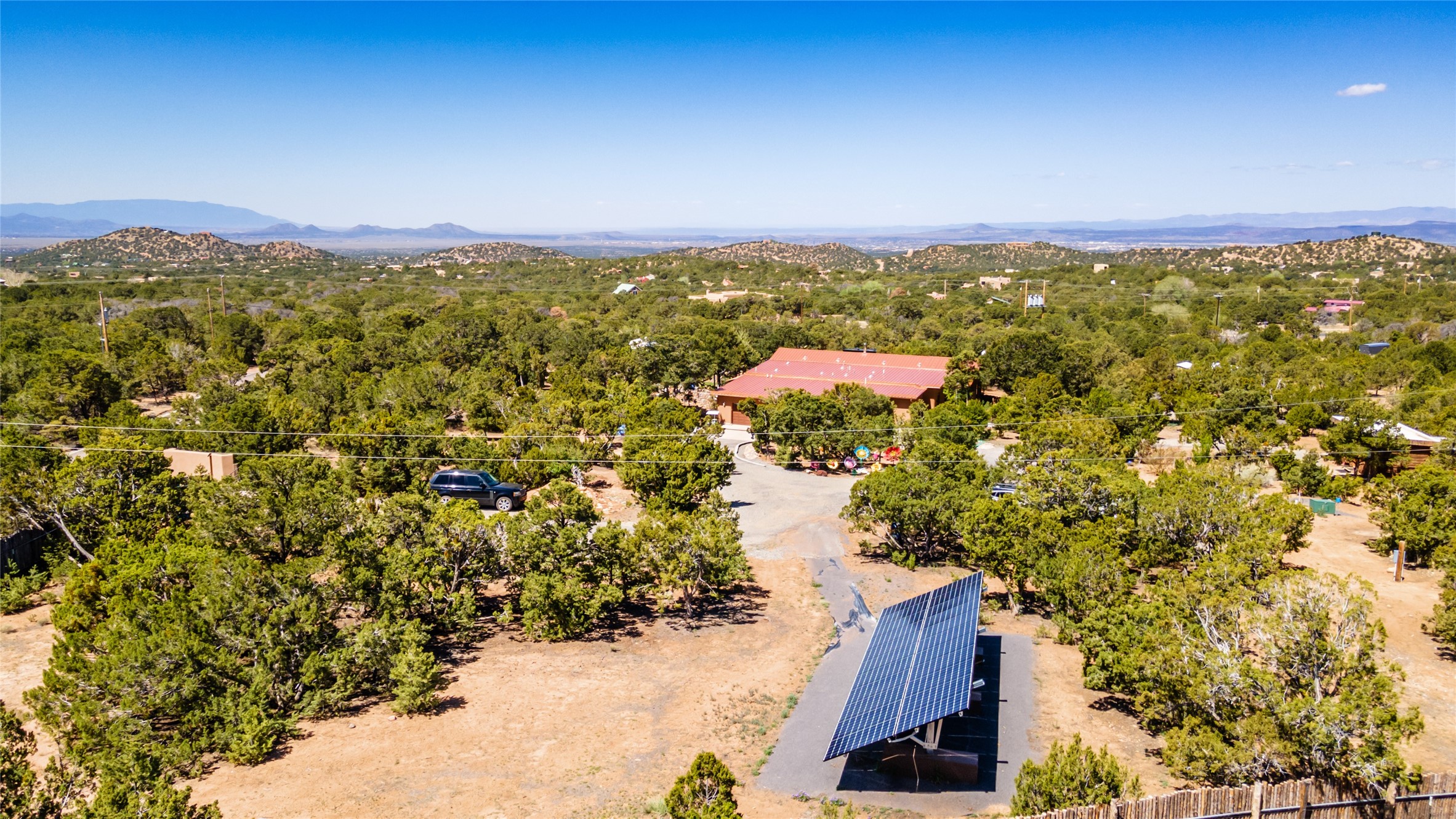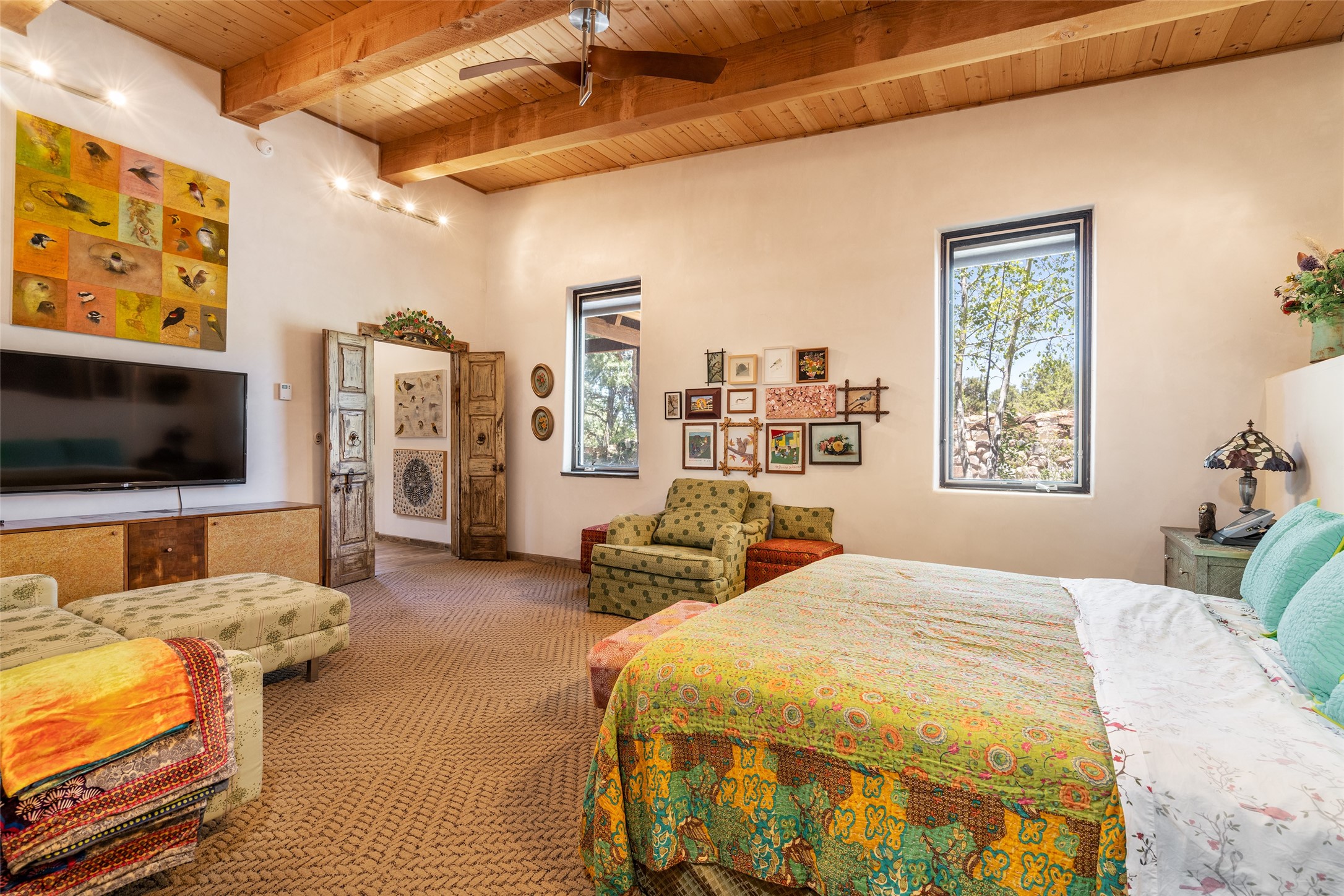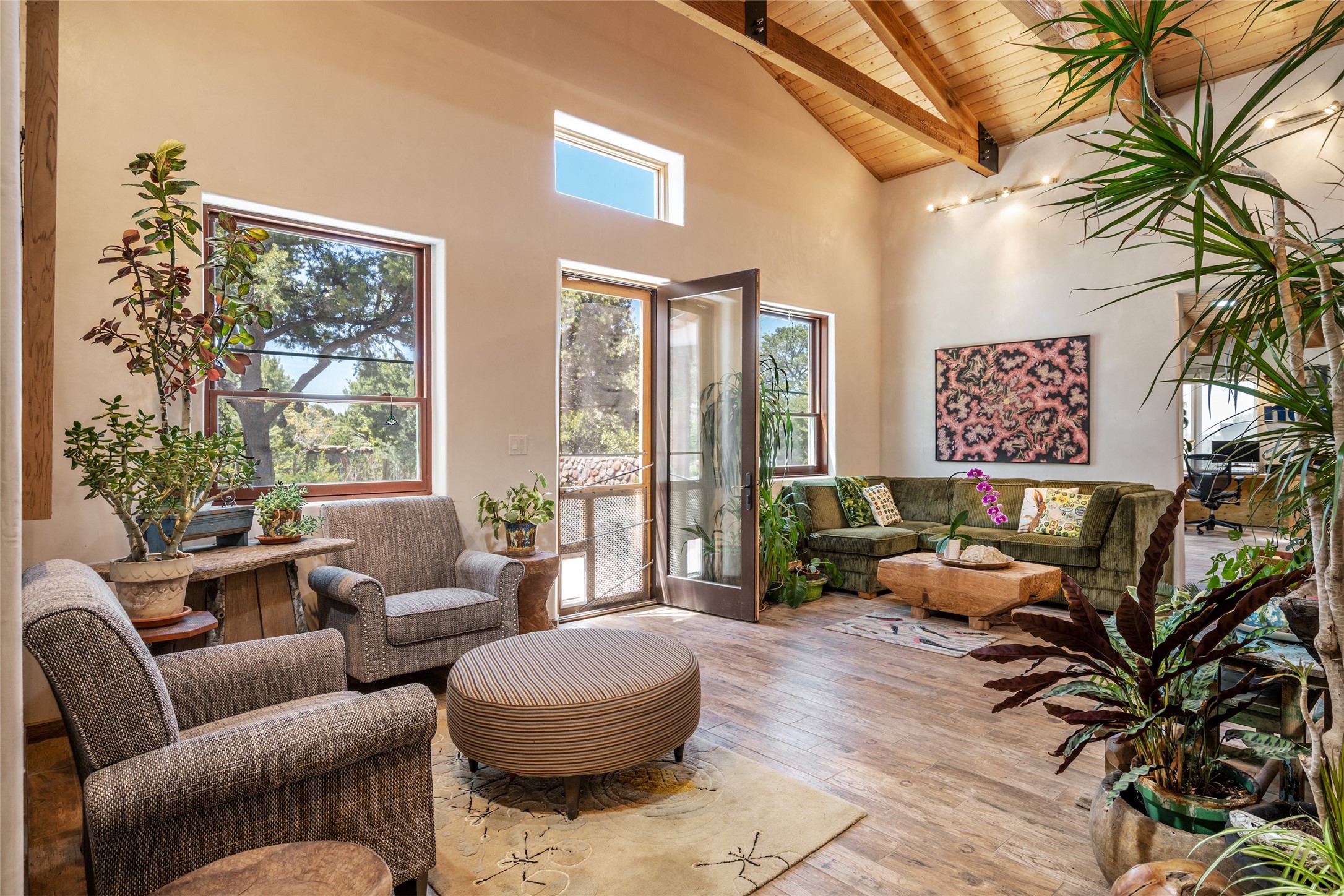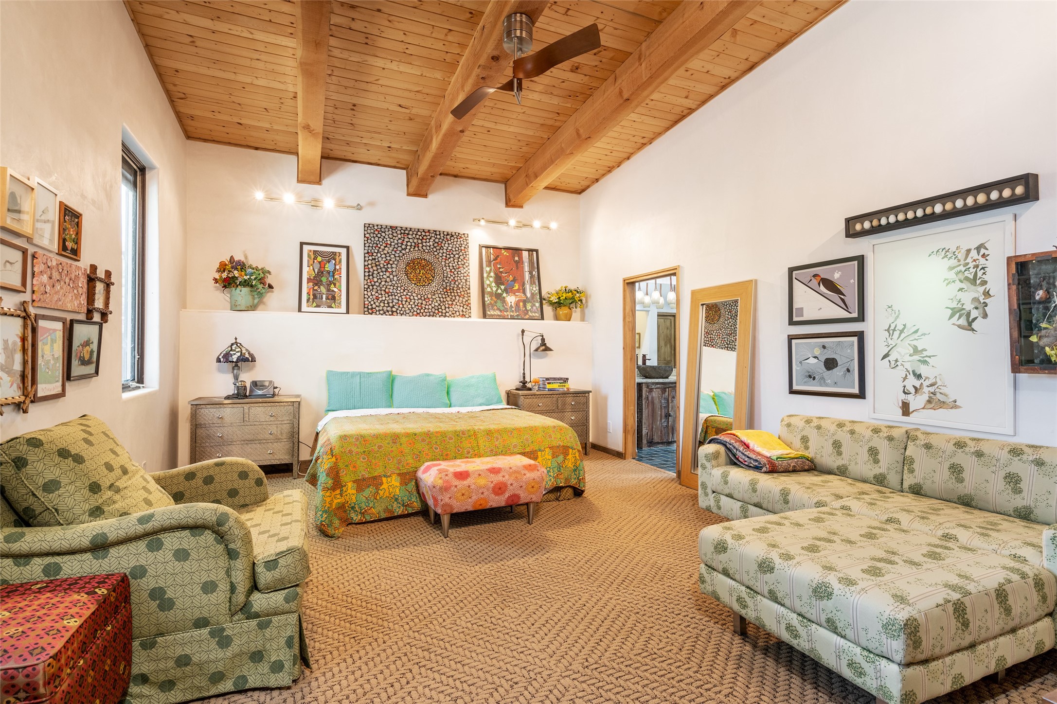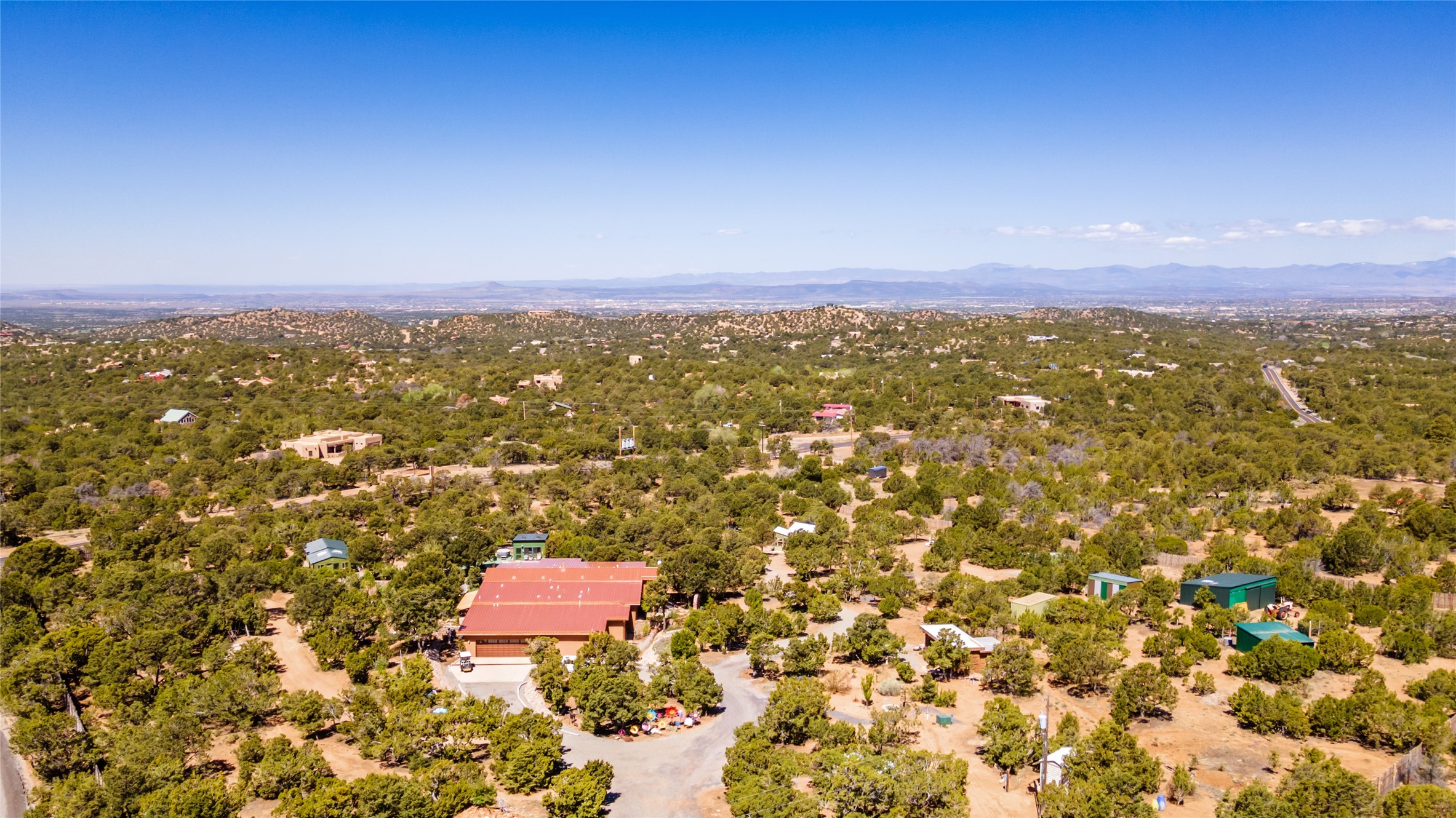 Welcome to this custom and unique gated compound on 5.76 acres just off the Old Santa Fe Trail. Built in 2016, the celebrated designer Todd Oldham credits his parents Linda and Jack Oldham with creating an "incubator of creativity." This fully fenced property features a pitched roof main house, a glass house with salvaged stained glass windows, a container modified into a hip, log cabin casita, a green house, an art house/studio, a wood shop, barn and stable. Lush and mature landscaping throughout with gardens galore and extensive rock work. Rare iris, mallows, clematis, plum, peach and cherry trees plus garden stone beds for growing corn, tomatoes, greens, cucumbers, sweet peas and strawberries; a true gardeners paradise. A private well with 13 acre feet of water and two, 2000 gallon tanks for efficient water reclamation. The main house at 4268 square feet has a pitched ceiling, an entry way with handmade tile and restored metal 1940s chandeliers, three bedrooms, large primary bathroom w/custom handmade tiles, one 3/4 bathroom and a colorful and artistically tiled 3rd bathroom, 1/2 bath with bird motif walls, den/studio, kitchen, walk-in pantry and plenty of wall space for artwork and collectibles. The kitchen has black marble counter tops and marble hexagon green tiled back splash with antique glass windows above the sink, double sided spice rack and stainless appliances. The over sized garage is 1461 sq. ft and has ample bonus storage. Solar panels are owned and provide 40% of the electricity which provides an effortlessly comfortable and thermally efficient environment. This is a remarkable, story book setting punctuated with bursts of color from mosaics, stained glass and other art installations created by the entire family. Just 10 minutes to the Santa Fe Plaza, near Harry's Road House, El Gancho Club and easy access to I-25. Don't miss seeing this private and peaceful retreat.
