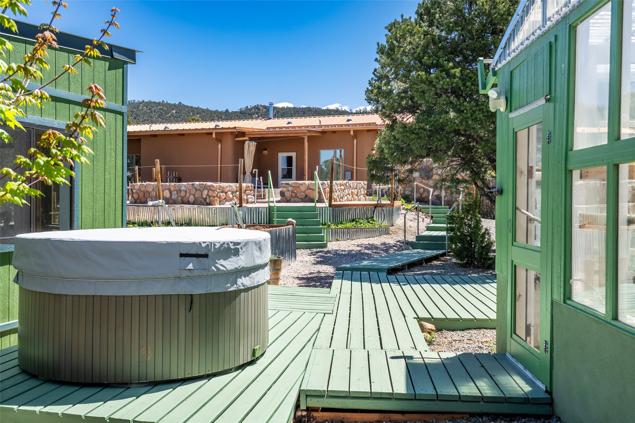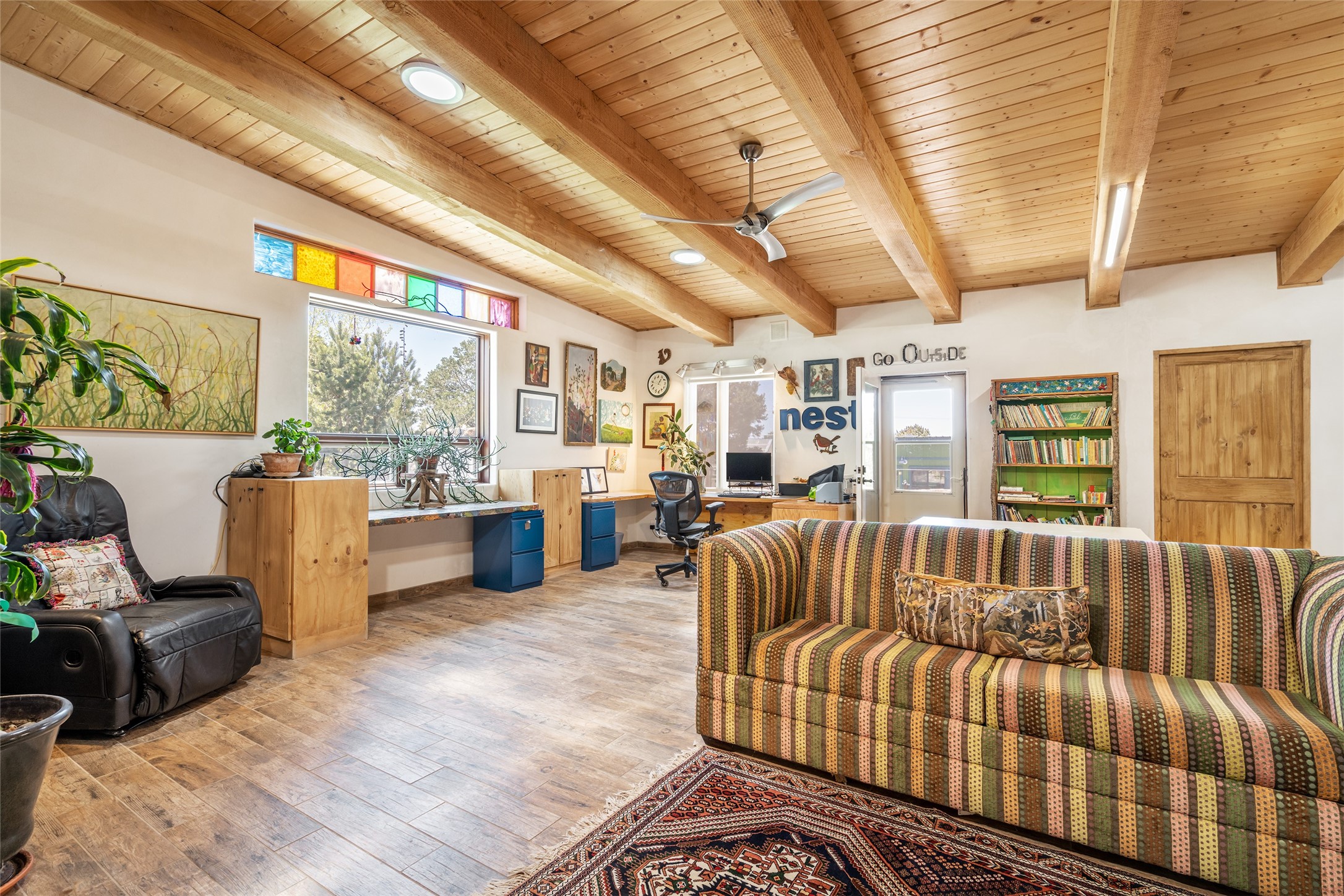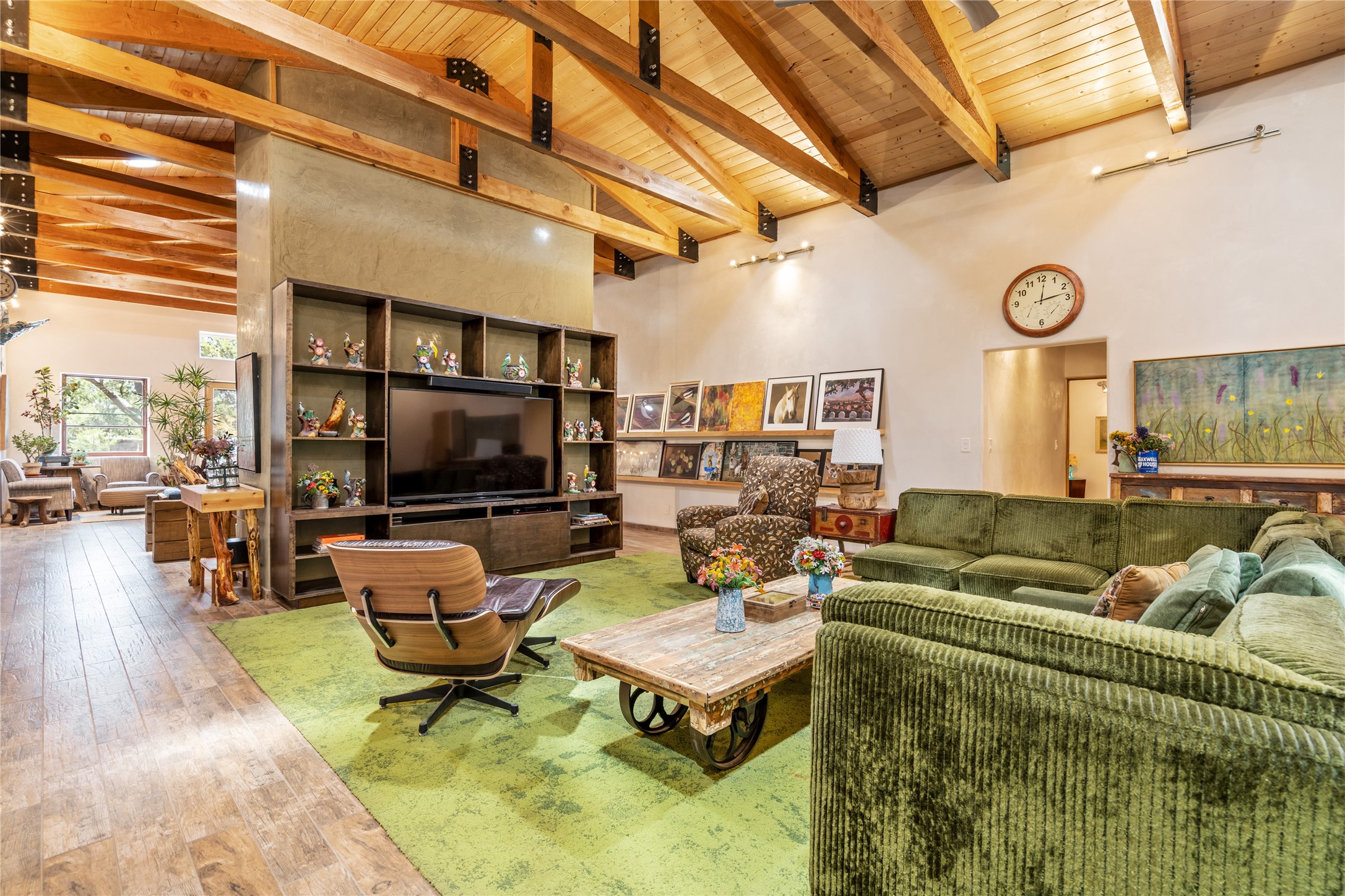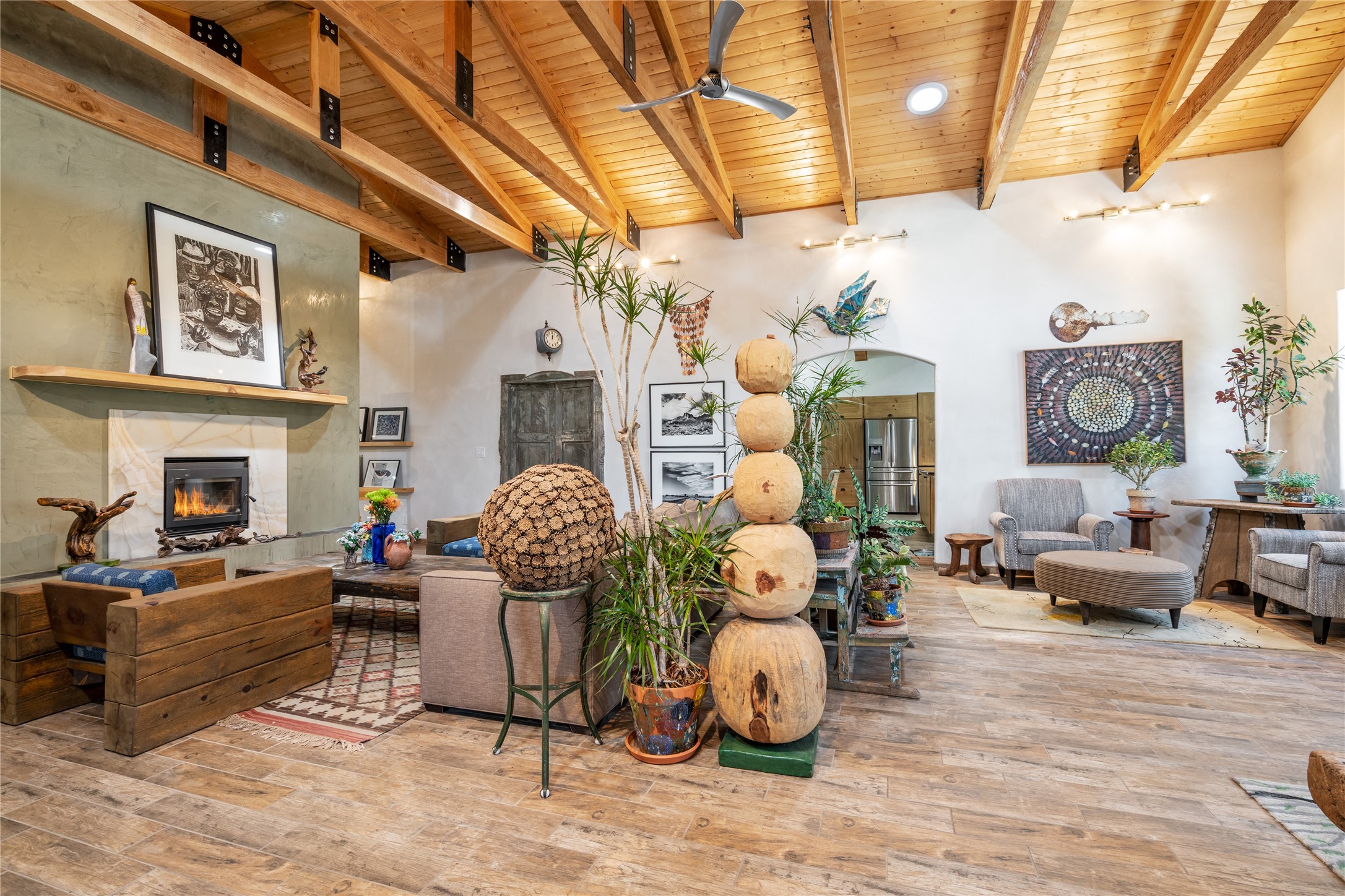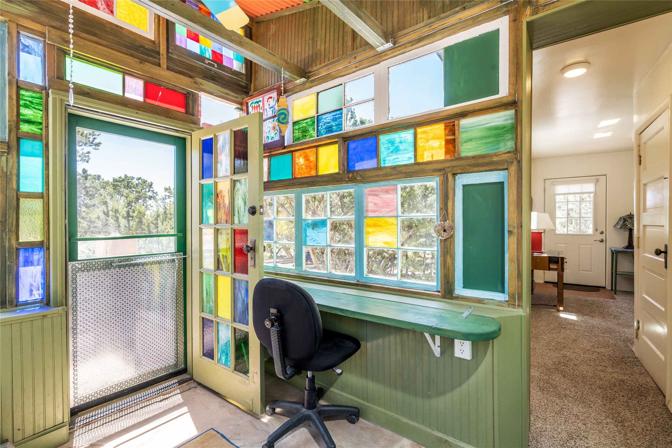 Welcome to this custom and unique gated compound on 5.76 acres just off the Old Santa Fe Trail. Built in 2016, the celebrated designer Todd Oldham credits his parents Linda and Jack Oldham with creating an "incubator of creativity." This fully fenced property features a pitched roof main house, a glass house with salvaged stained glass windows, a container modified into a hip, log cabin casita, a green house, an art house/studio, a wood shop, barn and stable. Lush and mature landscaping throughout with gardens galore and extensive rock work. Rare iris, mallows, clematis, plum, peach and cherry trees plus garden stone beds for growing corn, tomatoes, greens, cucumbers, sweet peas and strawberries; a true gardeners paradise. A private well with 13 acre feet of water and two, 2000 gallon tanks for efficient water reclamation. The main house at 4268 square feet has a pitched ceiling, an entry way with handmade tile and restored metal 1940s chandeliers, three bedrooms, large primary bathroom w/custom handmade tiles, one 3/4 bathroom and a colorful and artistically tiled 3rd bathroom, 1/2 bath with bird motif walls, den/studio, kitchen, walk-in pantry and plenty of wall space for artwork and collectibles. The kitchen has black marble counter tops and marble hexagon green tiled back splash with antique glass windows above the sink, double sided spice rack and stainless appliances. The over sized garage is 1461 sq. ft and has ample bonus storage. Solar panels are owned and provide 40% of the electricity which provides an effortlessly comfortable and thermally efficient environment. This is a remarkable, story book setting punctuated with bursts of color from mosaics, stained glass and other art installations created by the entire family. Just 10 minutes to the Santa Fe Plaza, near Harry's Road House, El Gancho Club and easy access to I-25. Don't miss seeing this private and peaceful retreat.