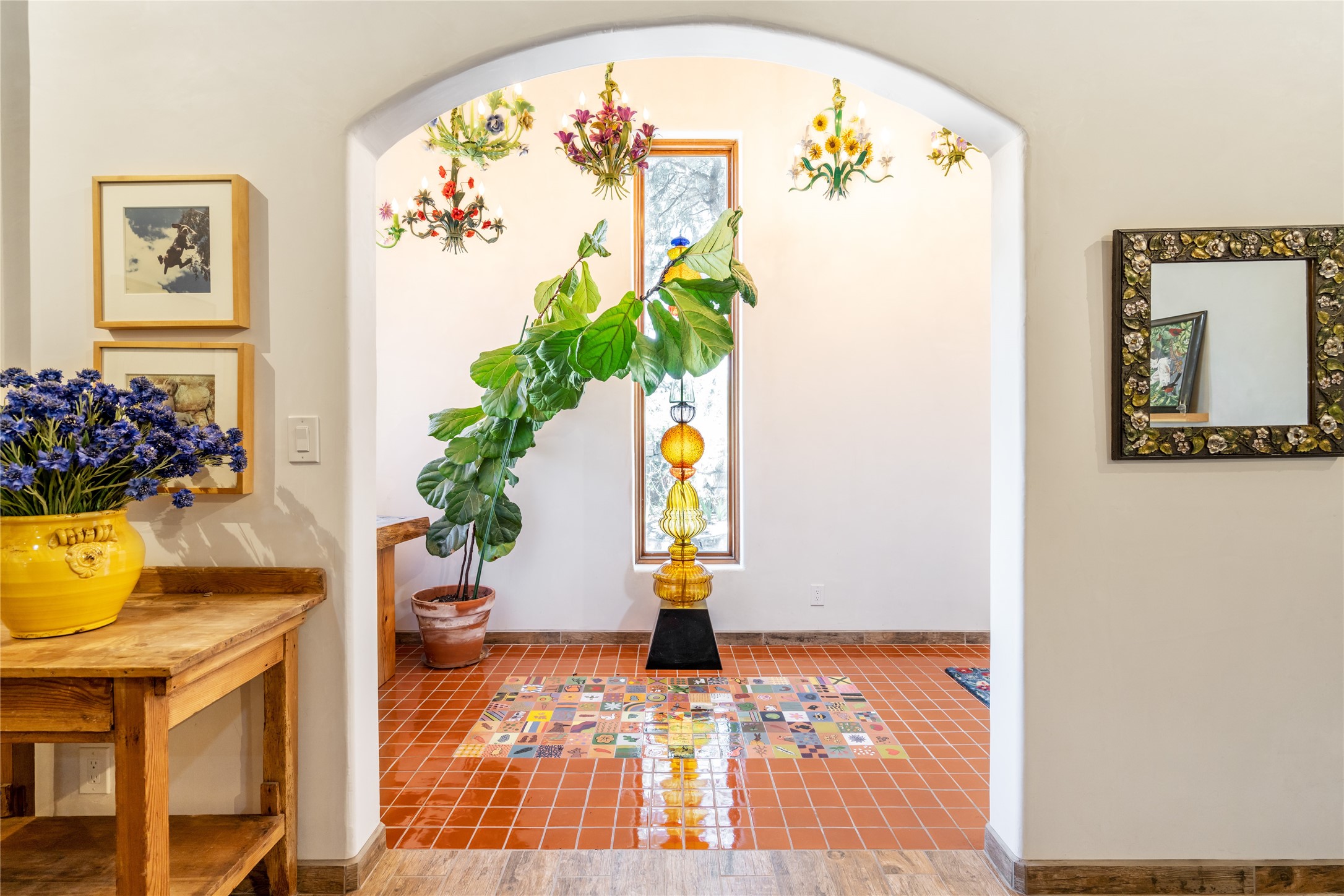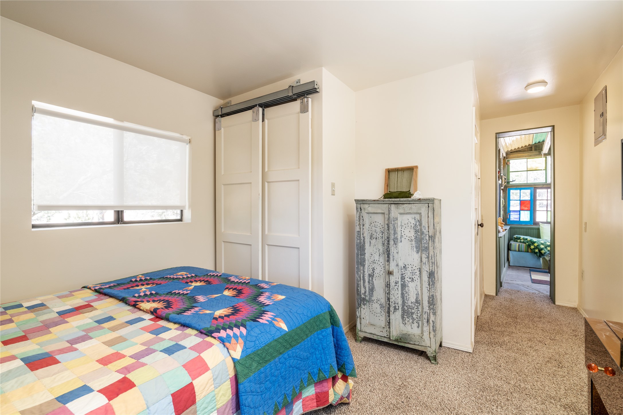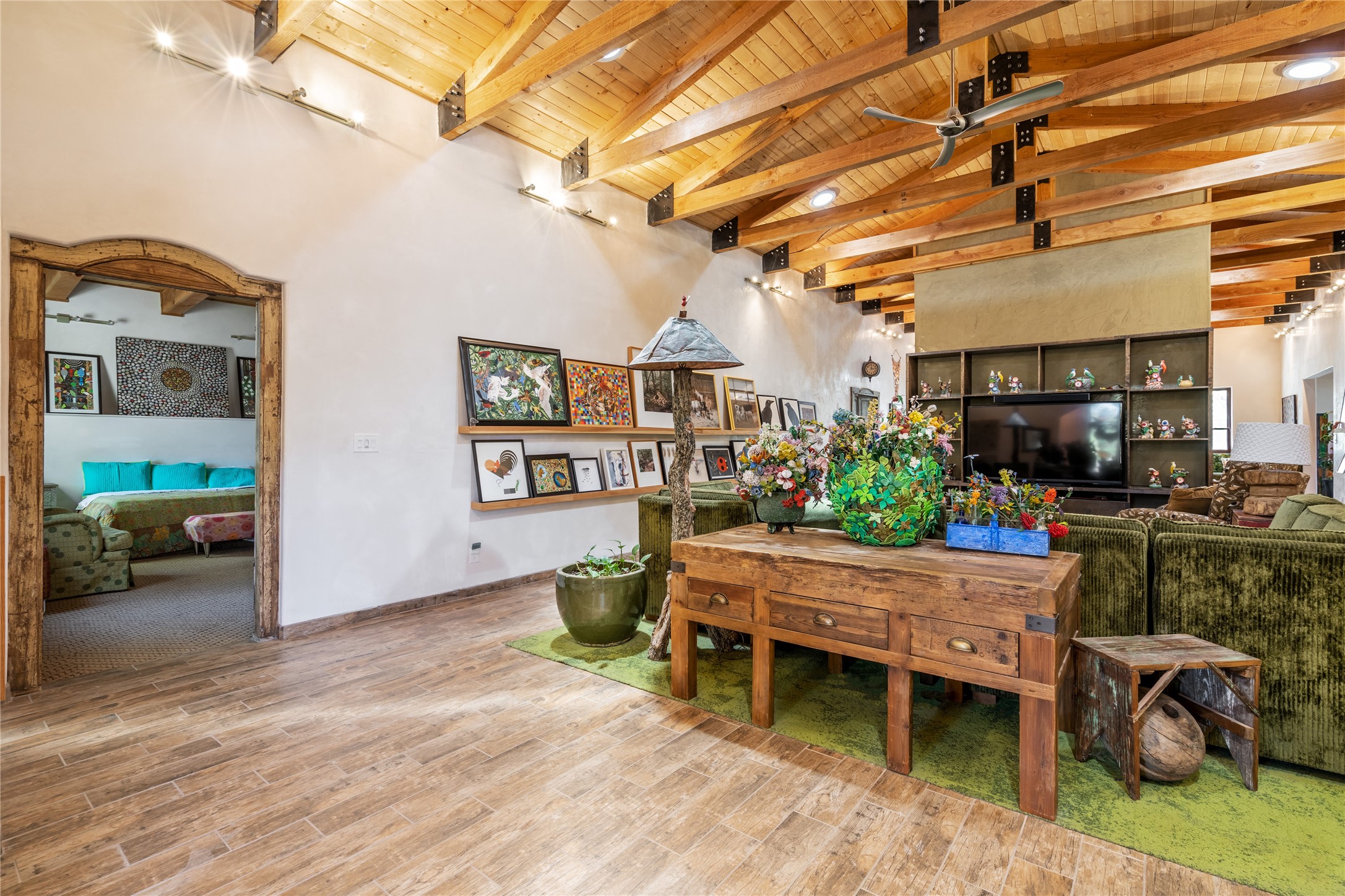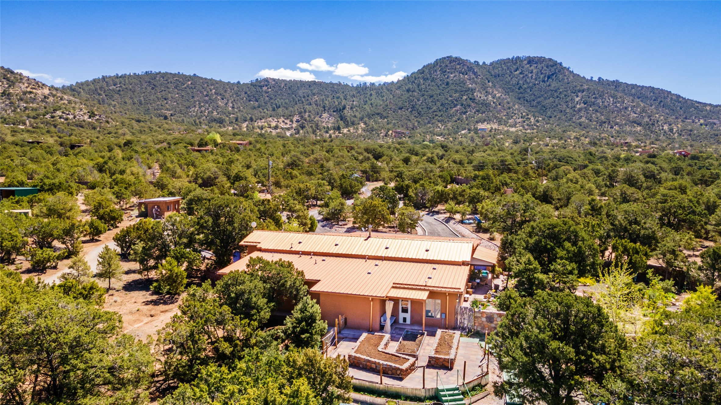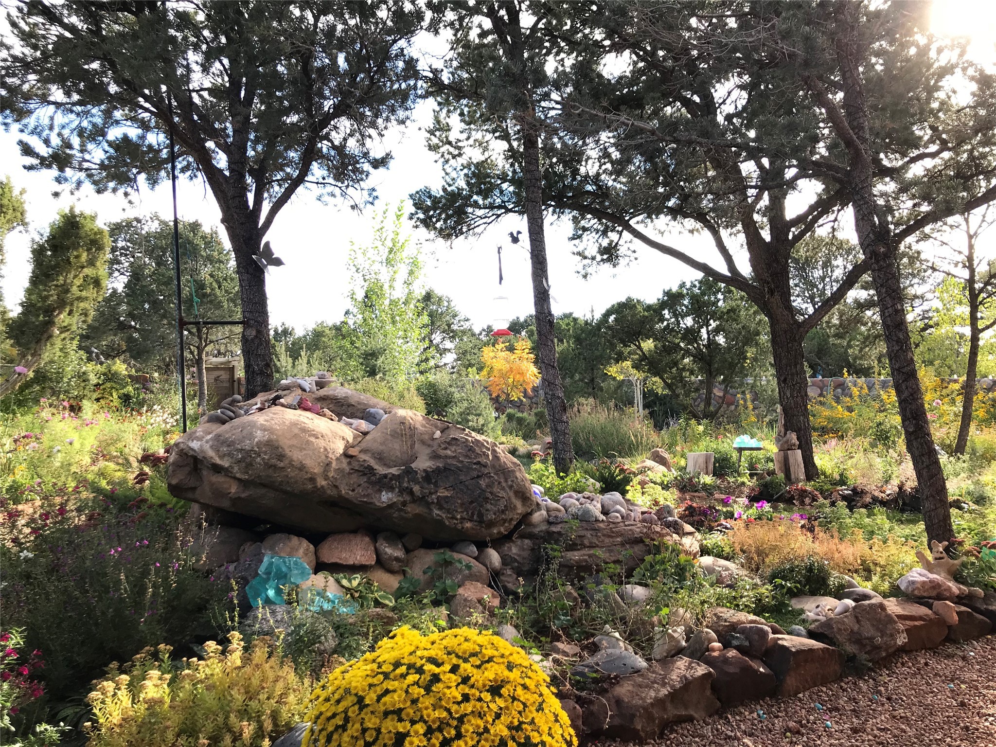 Welcome to this custom and unique gated compound on 5.76 acres just off the Old Santa Fe Trail. Built in 2016, the celebrated designer Todd Oldham credits his parents Linda and Jack Oldham with creating an "incubator of creativity." This fully fenced property features a pitched roof main house, a glass house with salvaged stained glass windows, a container modified into a hip, log cabin casita, a green house, an art house/studio, a wood shop, barn and stable. Lush and mature landscaping throughout with gardens galore and extensive rock work. Rare iris, mallows, clematis, plum, peach and cherry trees plus garden stone beds for growing corn, tomatoes, greens, cucumbers, sweet peas and strawberries; a true gardeners paradise. A private well with 13 acre feet of water and two, 2000 gallon tanks for efficient water reclamation. The main house at 4268 square feet has a pitched ceiling, an entry way with handmade tile and restored metal 1940s chandeliers, three bedrooms, large primary bathroom w/custom handmade tiles, one 3/4 bathroom and a colorful and artistically tiled 3rd bathroom, 1/2 bath with bird motif walls, den/studio, kitchen, walk-in pantry and plenty of wall space for artwork and collectibles. The kitchen has black marble counter tops and marble hexagon green tiled back splash with antique glass windows above the sink, double sided spice rack and stainless appliances. The over sized garage is 1461 sq. ft and has ample bonus storage. Solar panels are owned and provide 40% of the electricity which provides an effortlessly comfortable and thermally efficient environment. This is a remarkable, story book setting punctuated with bursts of color from mosaics, stained glass and other art installations created by the entire family. Just 10 minutes to the Santa Fe Plaza, near Harry's Road House, El Gancho Club and easy access to I-25. Don't miss seeing this private and peaceful retreat.
