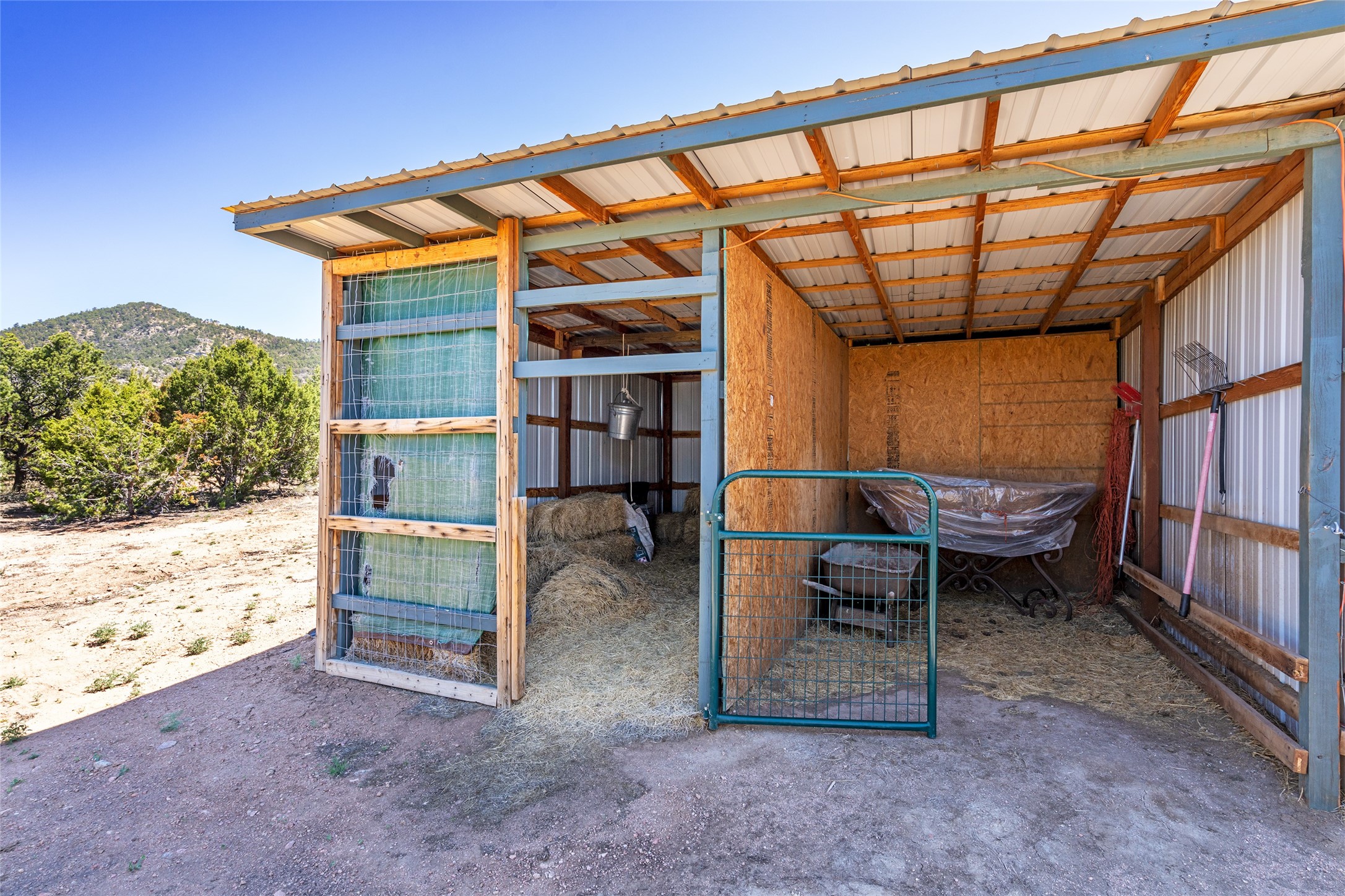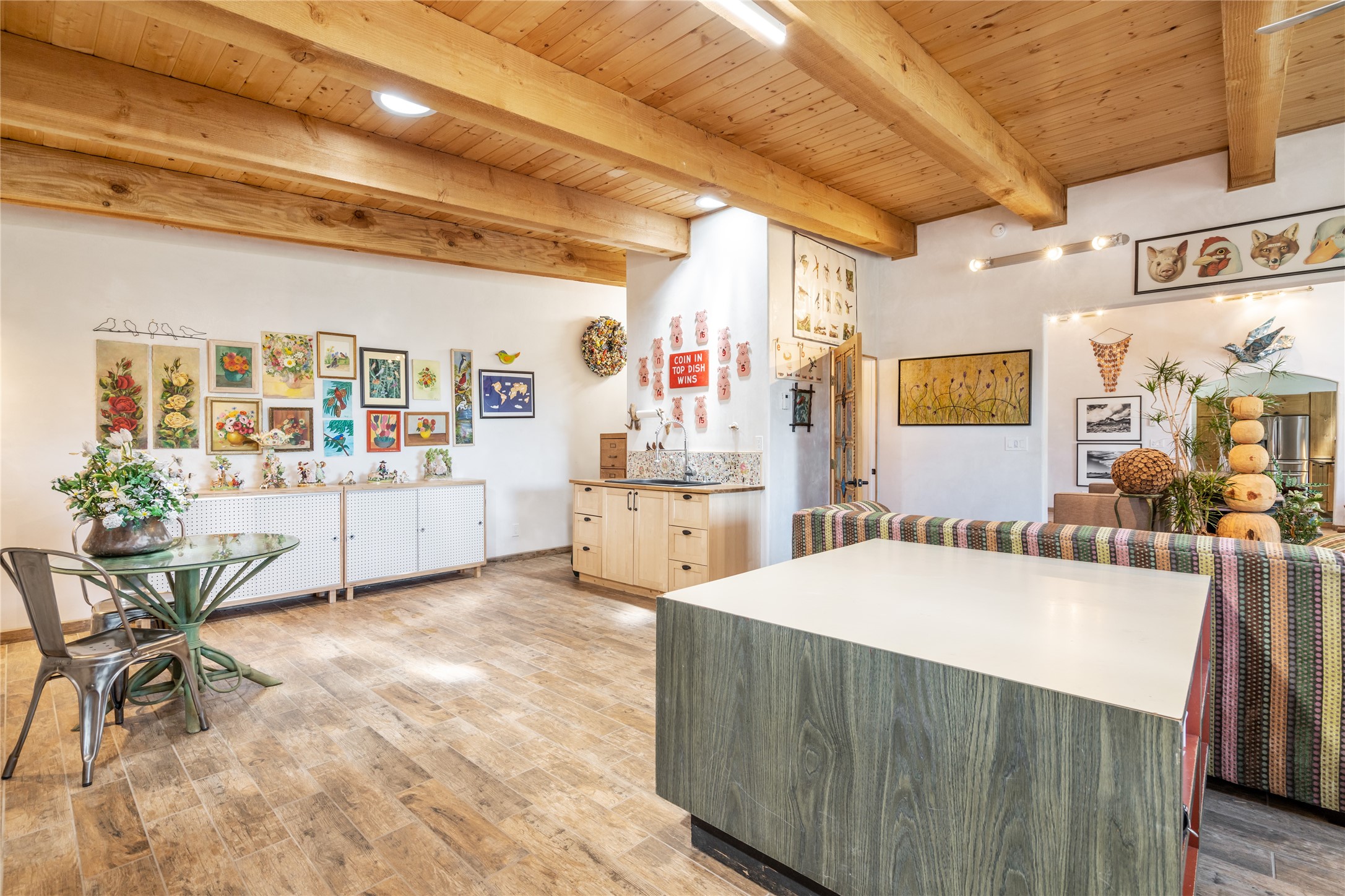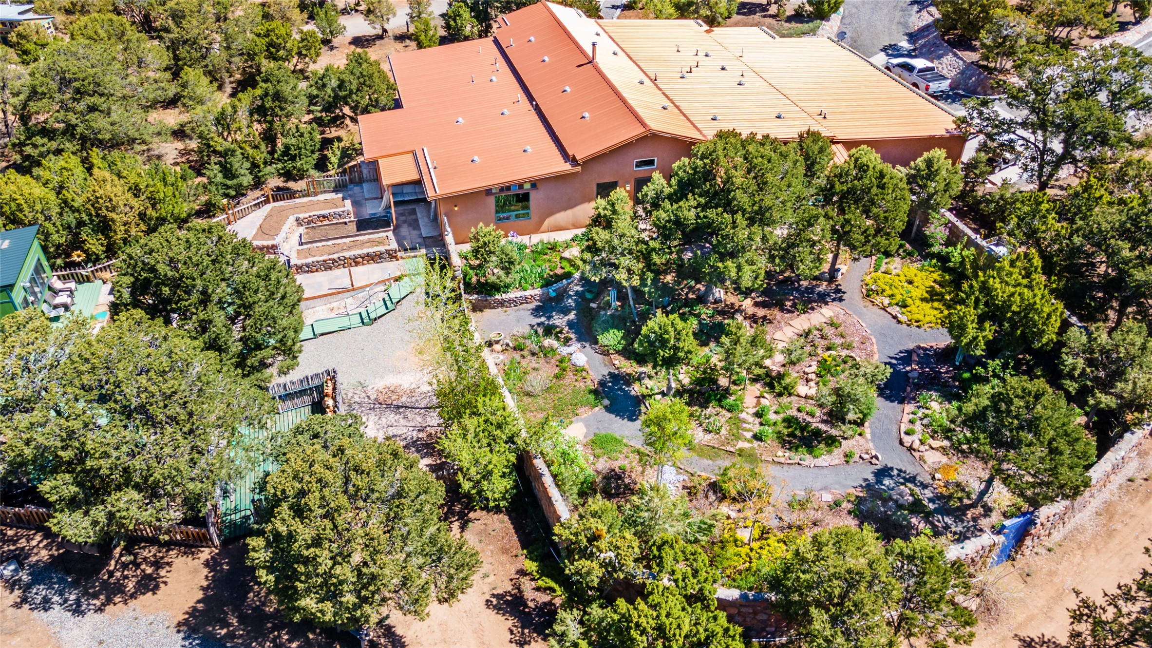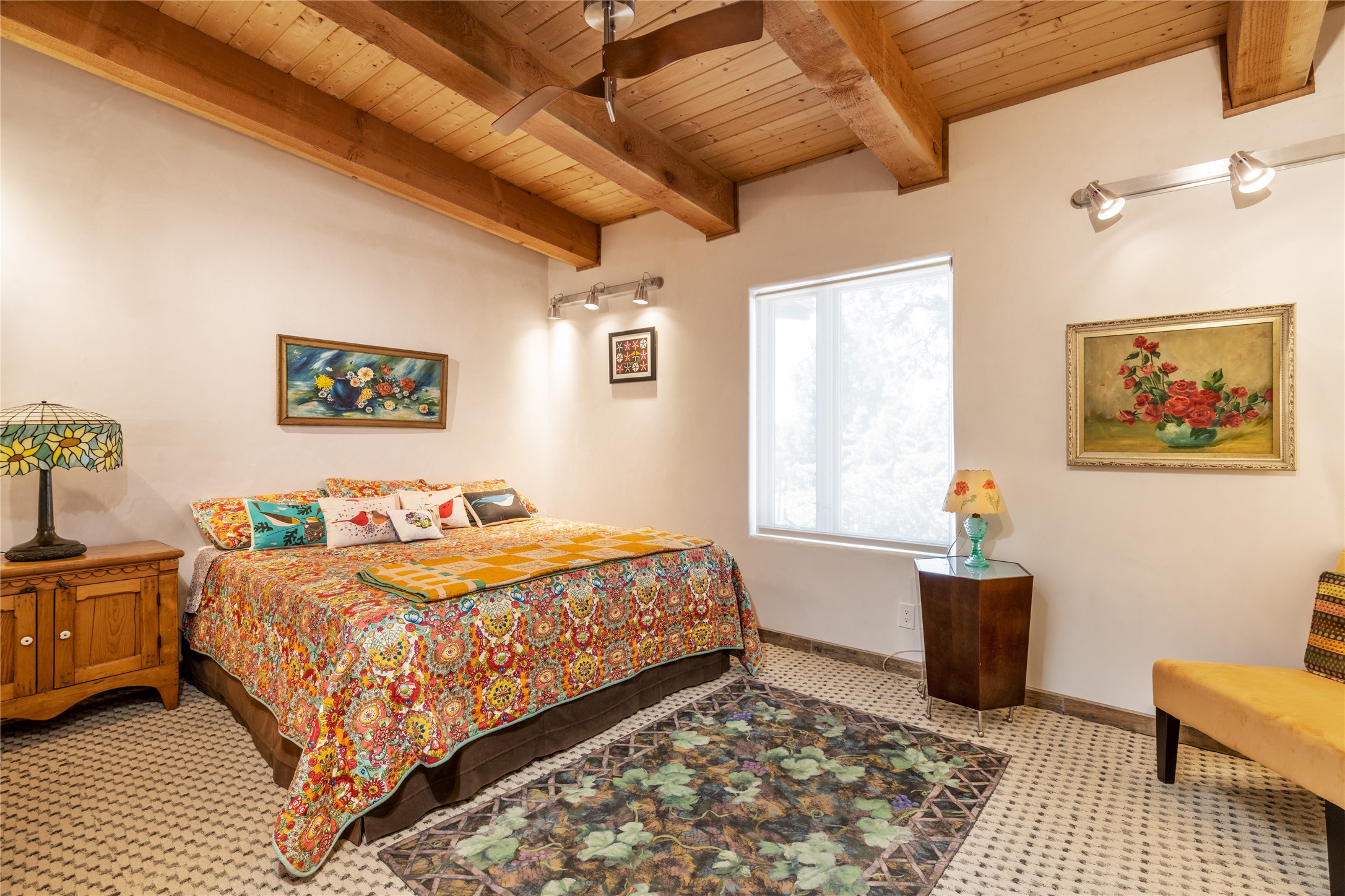 Welcome to this custom and unique gated compound on 5.76 acres just off the Old Santa Fe Trail. Built in 2016, the celebrated designer Todd Oldham credits his parents Linda and Jack Oldham with creating an "incubator of creativity." This fully fenced property features a pitched roof main house, a glass house with salvaged stained glass windows, a container modified into a hip, log cabin casita, a green house, an art house/studio, a wood shop, barn and stable. Lush and mature landscaping throughout with gardens galore and extensive rock work. Rare iris, mallows, clematis, plum, peach and cherry trees plus garden stone beds for growing corn, tomatoes, greens, cucumbers, sweet peas and strawberries; a true gardeners paradise. A private well with 13 acre feet of water and two, 2000 gallon tanks for efficient water reclamation. The main house at 4268 square feet has a pitched ceiling, an entry way with handmade tile and restored metal 1940s chandeliers, three bedrooms, large primary bathroom w/custom handmade tiles, one 3/4 bathroom and a colorful and artistically tiled 3rd bathroom, 1/2 bath with bird motif walls, den/studio, kitchen, walk-in pantry and plenty of wall space for artwork and collectibles. The kitchen has black marble counter tops and marble hexagon green tiled back splash with antique glass windows above the sink, double sided spice rack and stainless appliances. The over sized garage is 1461 sq. ft and has ample bonus storage. Solar panels are owned and provide 40% of the electricity which provides an effortlessly comfortable and thermally efficient environment. This is a remarkable, story book setting punctuated with bursts of color from mosaics, stained glass and other art installations created by the entire family. Just 10 minutes to the Santa Fe Plaza, near Harry's Road House, El Gancho Club and easy access to I-25. Don't miss seeing this private and peaceful retreat.
