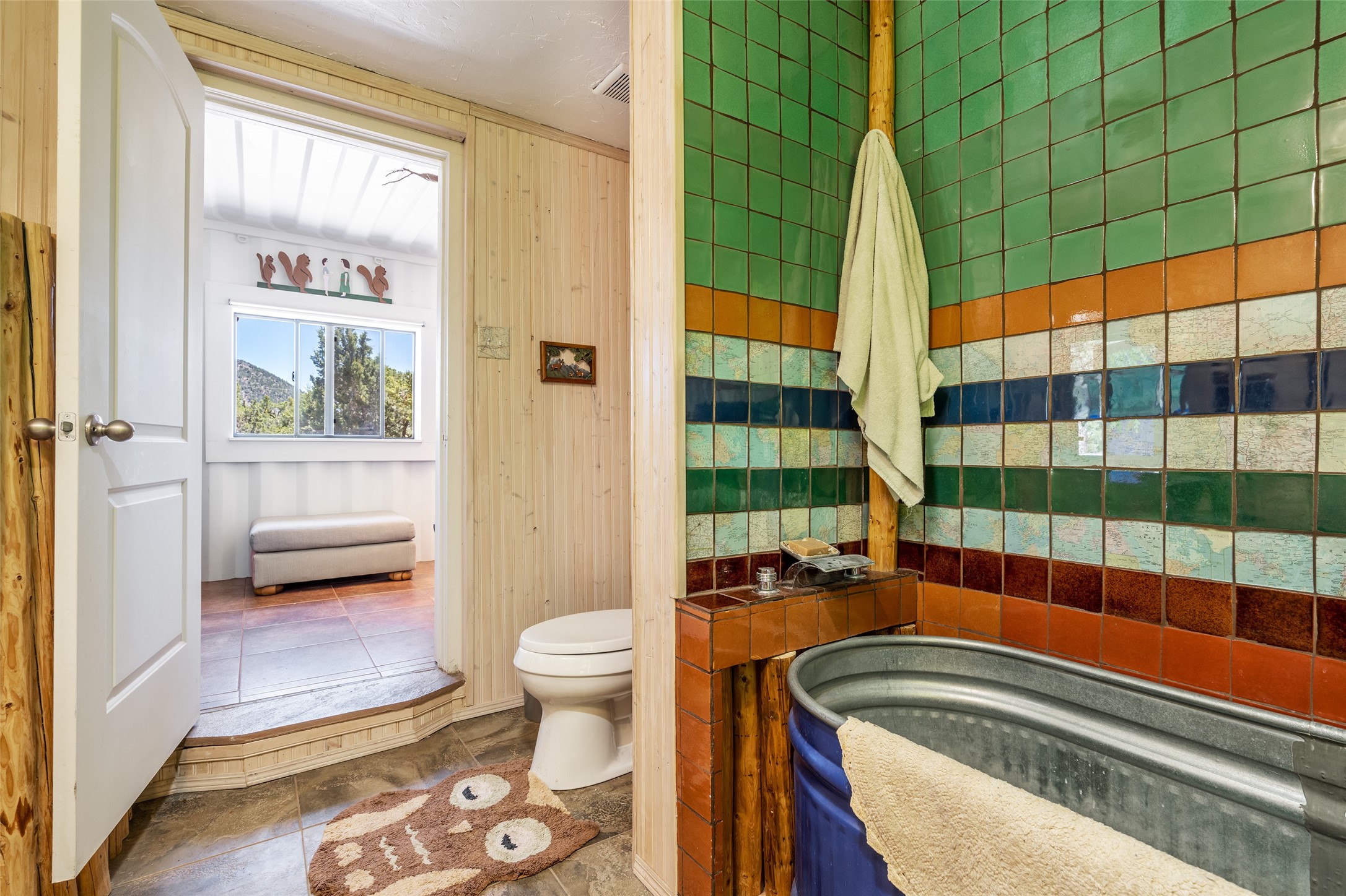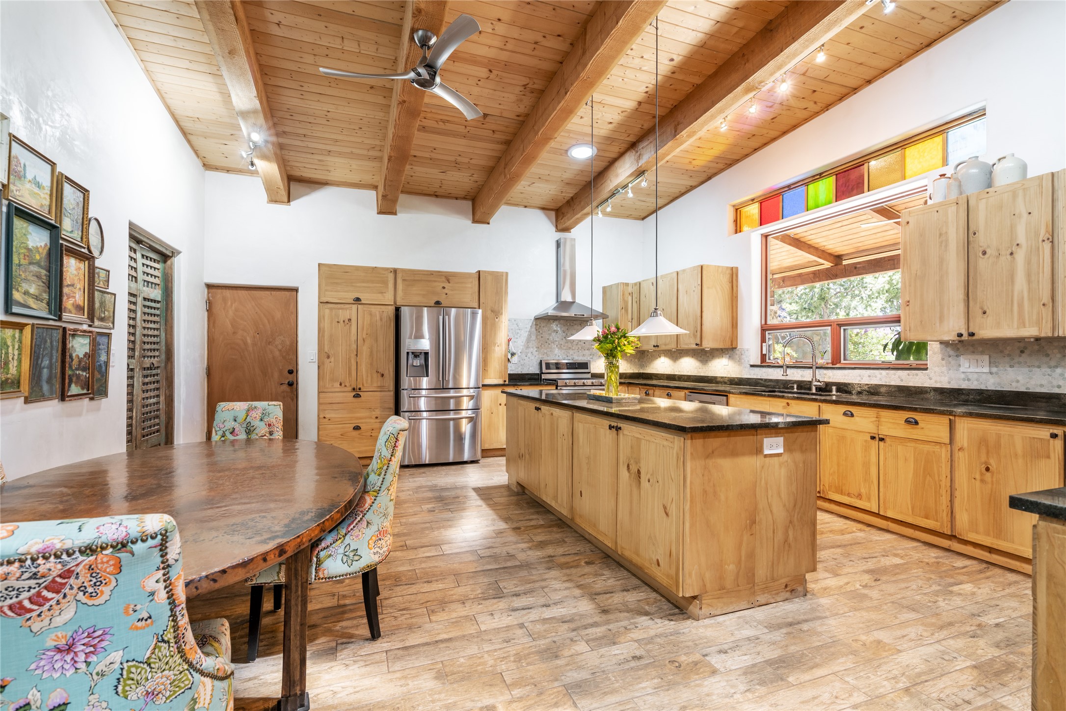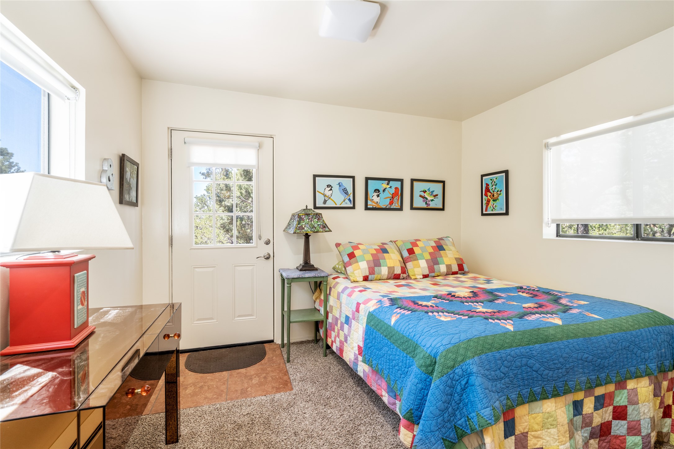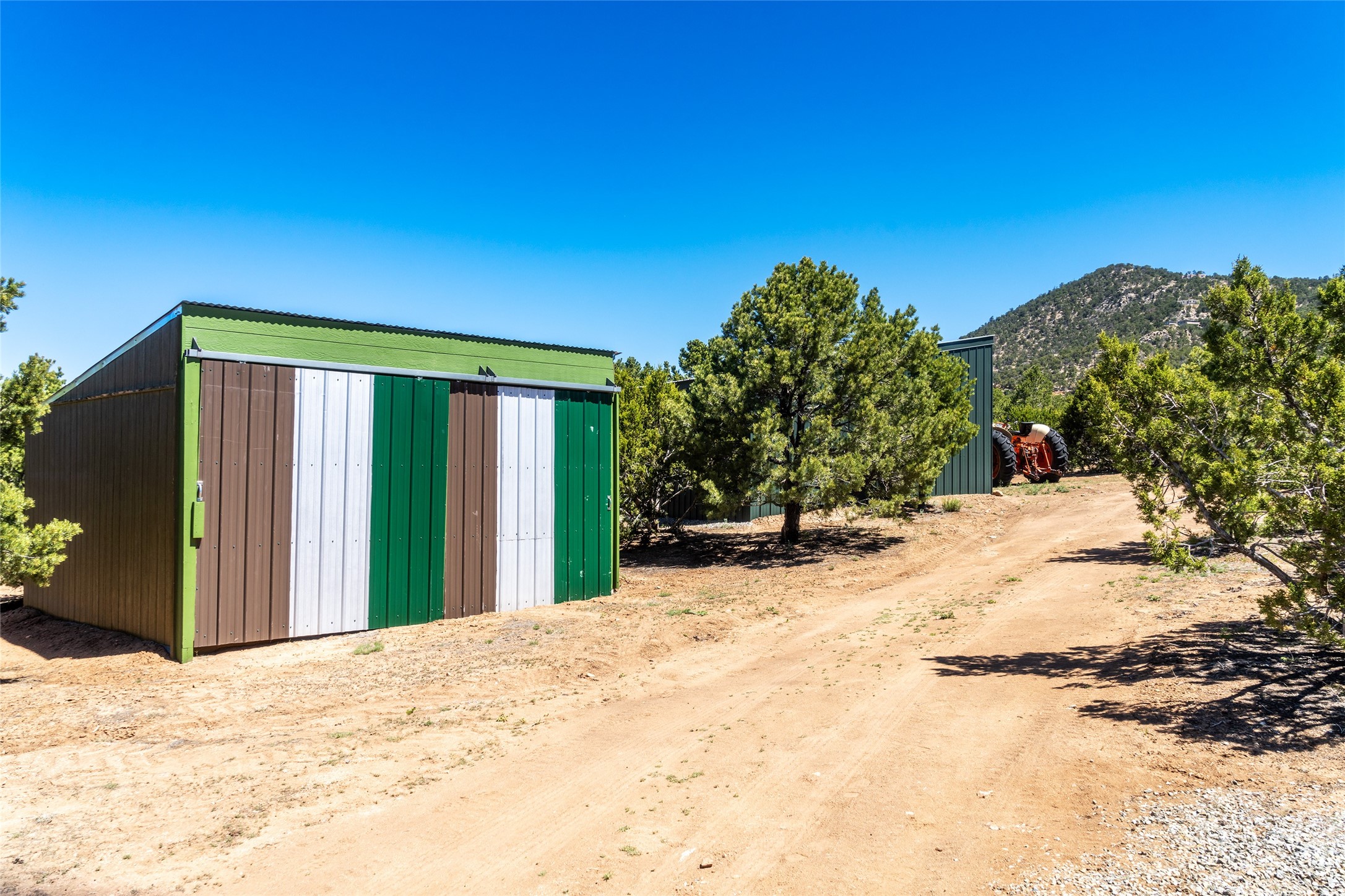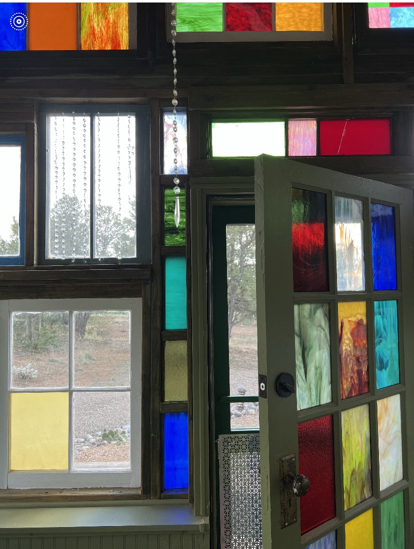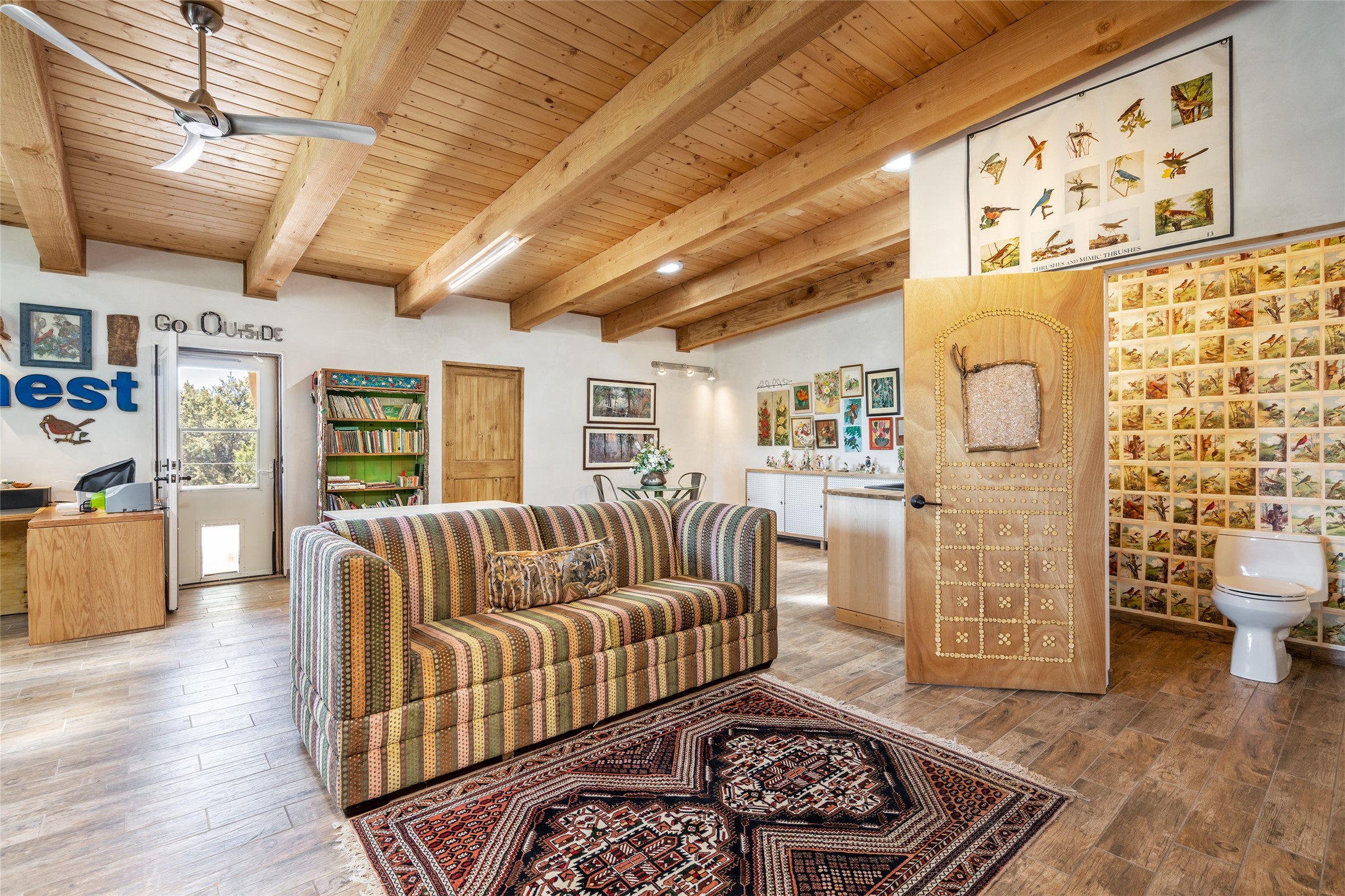 Welcome to this custom and unique gated compound on 5.76 acres just off the Old Santa Fe Trail. Built in 2016, the celebrated designer Todd Oldham credits his parents Linda and Jack Oldham with creating an "incubator of creativity." This fully fenced property features a pitched roof main house, a glass house with salvaged stained glass windows, a container modified into a hip, log cabin casita, a green house, an art house/studio, a wood shop, barn and stable. Lush and mature landscaping throughout with gardens galore and extensive rock work. Rare iris, mallows, clematis, plum, peach and cherry trees plus garden stone beds for growing corn, tomatoes, greens, cucumbers, sweet peas and strawberries; a true gardeners paradise. A private well with 13 acre feet of water and two, 2000 gallon tanks for efficient water reclamation. The main house at 4268 square feet has a pitched ceiling, an entry way with handmade tile and restored metal 1940s chandeliers, three bedrooms, large primary bathroom w/custom handmade tiles, one 3/4 bathroom and a colorful and artistically tiled 3rd bathroom, 1/2 bath with bird motif walls, den/studio, kitchen, walk-in pantry and plenty of wall space for artwork and collectibles. The kitchen has black marble counter tops and marble hexagon green tiled back splash with antique glass windows above the sink, double sided spice rack and stainless appliances. The over sized garage is 1461 sq. ft and has ample bonus storage. Solar panels are owned and provide 40% of the electricity which provides an effortlessly comfortable and thermally efficient environment. This is a remarkable, story book setting punctuated with bursts of color from mosaics, stained glass and other art installations created by the entire family. Just 10 minutes to the Santa Fe Plaza, near Harry's Road House, El Gancho Club and easy access to I-25. Don't miss seeing this private and peaceful retreat.