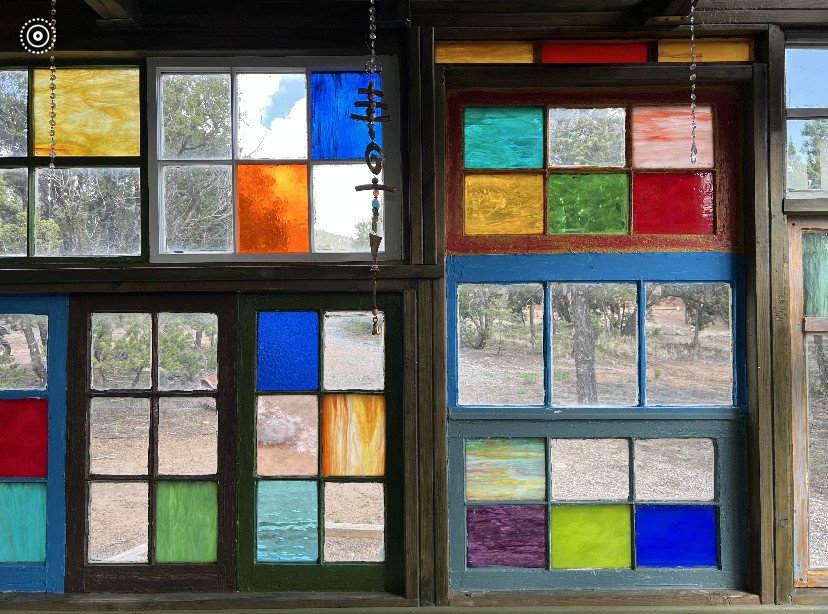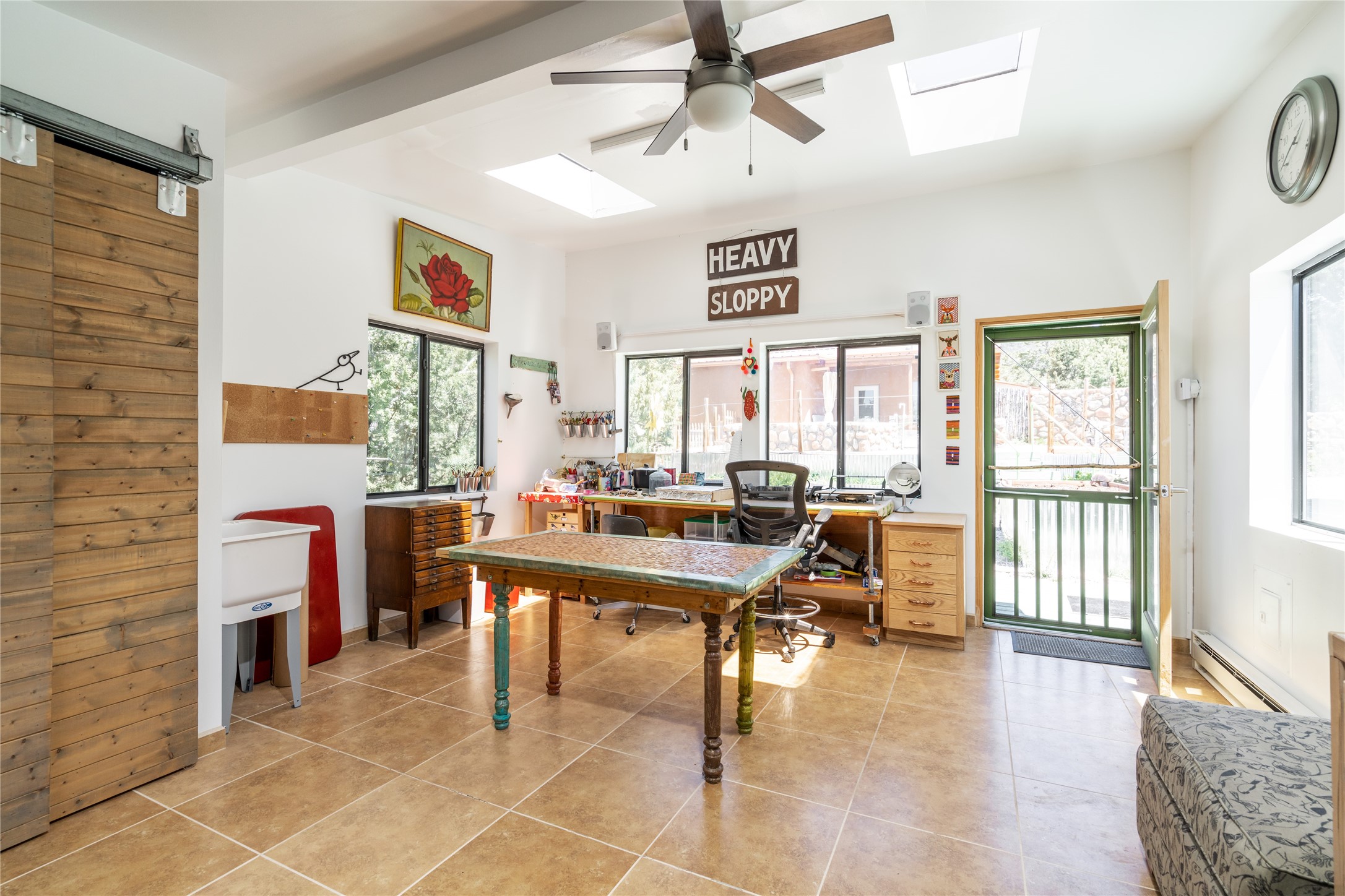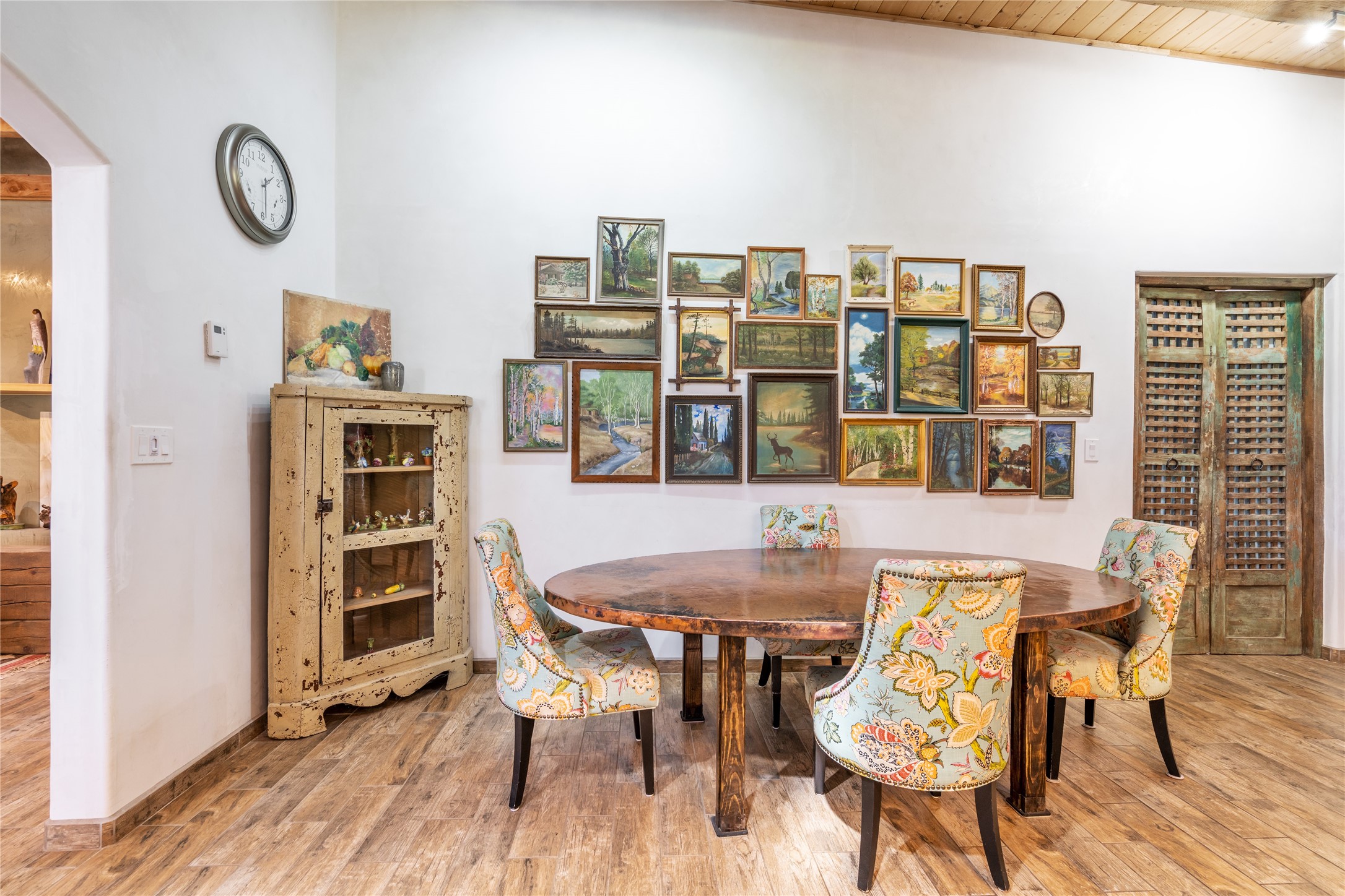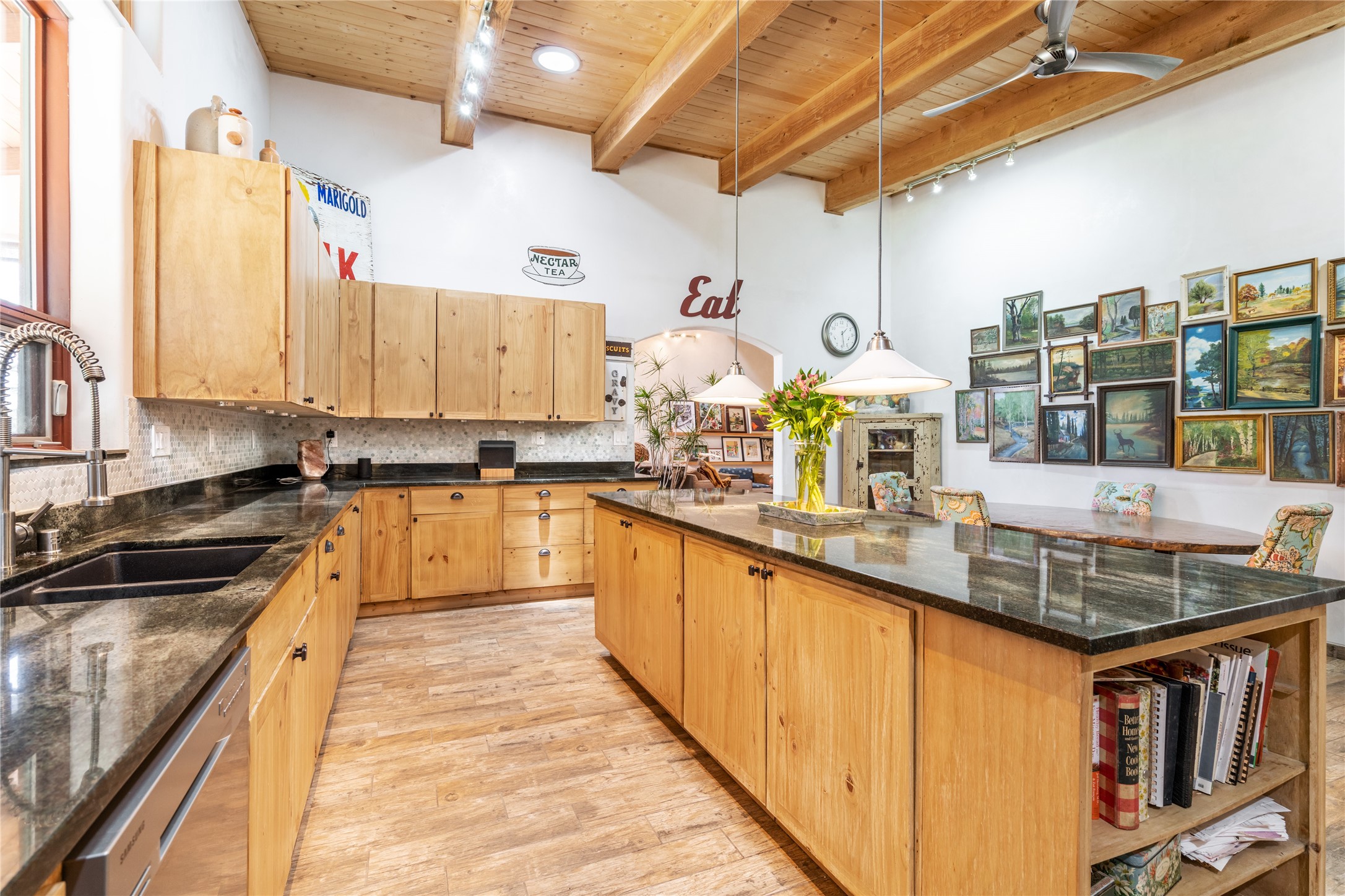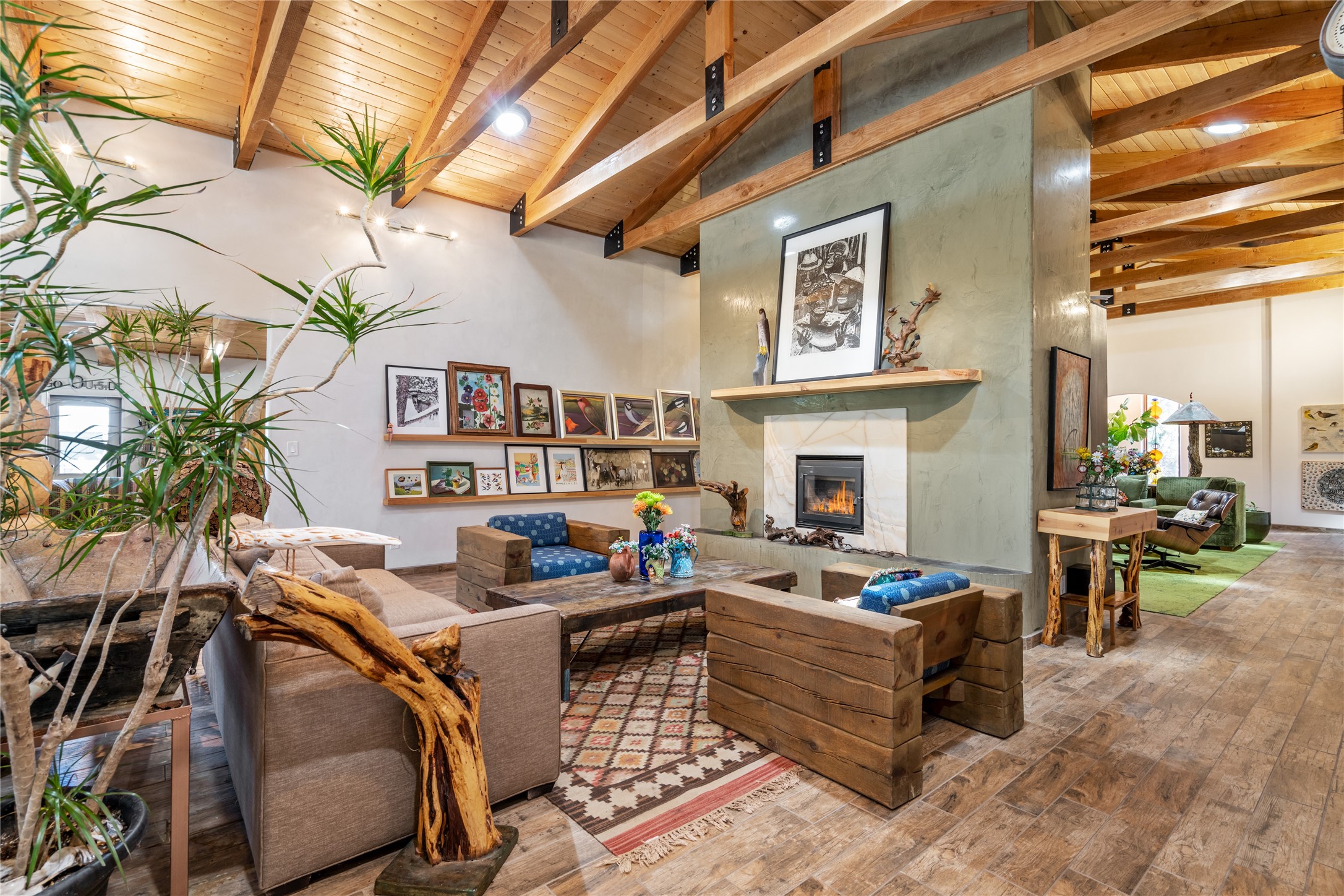 Welcome to this custom and unique gated compound on 5.76 acres just off the Old Santa Fe Trail. Built in 2016, the celebrated designer Todd Oldham credits his parents Linda and Jack Oldham with creating an "incubator of creativity." This fully fenced property features a pitched roof main house, a glass house with salvaged stained glass windows, a container modified into a hip, log cabin casita, a green house, an art house/studio, a wood shop, barn and stable. Lush and mature landscaping throughout with gardens galore and extensive rock work. Rare iris, mallows, clematis, plum, peach and cherry trees plus garden stone beds for growing corn, tomatoes, greens, cucumbers, sweet peas and strawberries; a true gardeners paradise. A private well with 13 acre feet of water and two, 2000 gallon tanks for efficient water reclamation. The main house at 4268 square feet has a pitched ceiling, an entry way with handmade tile and restored metal 1940s chandeliers, three bedrooms, large primary bathroom w/custom handmade tiles, one 3/4 bathroom and a colorful and artistically tiled 3rd bathroom, 1/2 bath with bird motif walls, den/studio, kitchen, walk-in pantry and plenty of wall space for artwork and collectibles. The kitchen has black marble counter tops and marble hexagon green tiled back splash with antique glass windows above the sink, double sided spice rack and stainless appliances. The over sized garage is 1461 sq. ft and has ample bonus storage. Solar panels are owned and provide 40% of the electricity which provides an effortlessly comfortable and thermally efficient environment. This is a remarkable, story book setting punctuated with bursts of color from mosaics, stained glass and other art installations created by the entire family. Just 10 minutes to the Santa Fe Plaza, near Harry's Road House, El Gancho Club and easy access to I-25. Don't miss seeing this private and peaceful retreat.