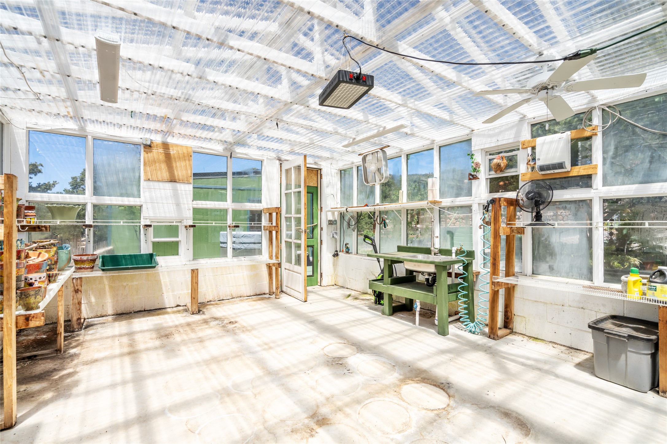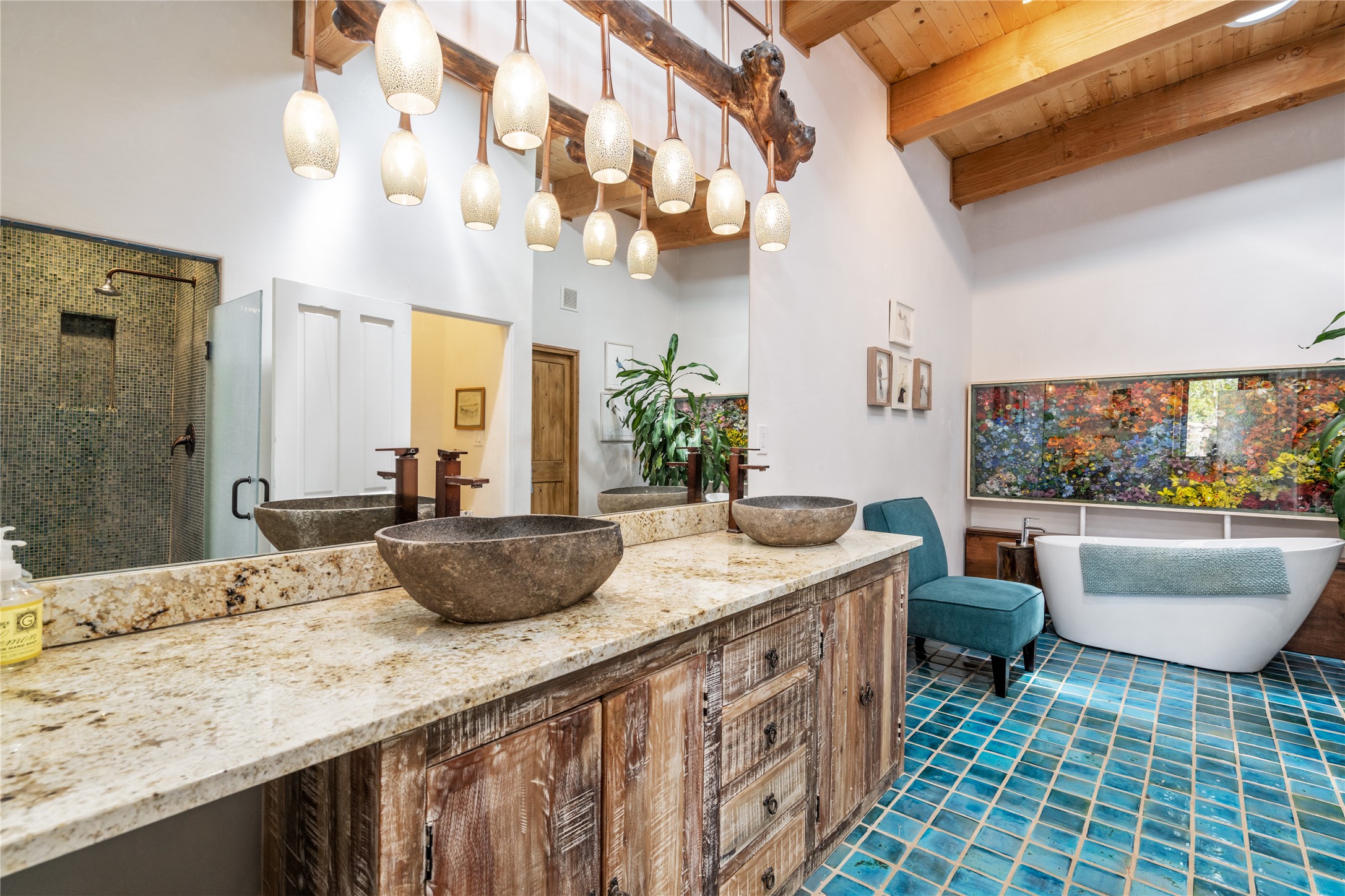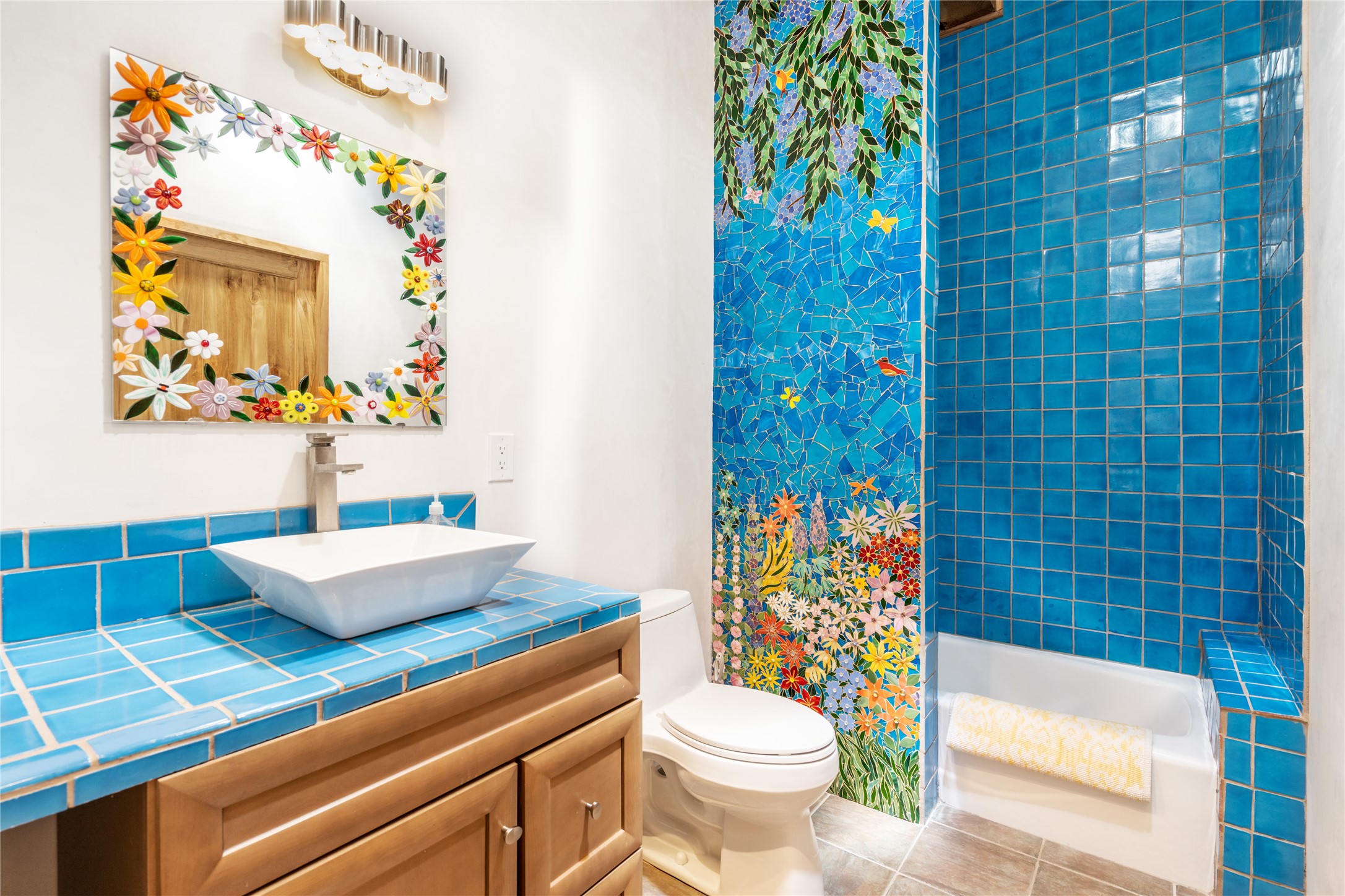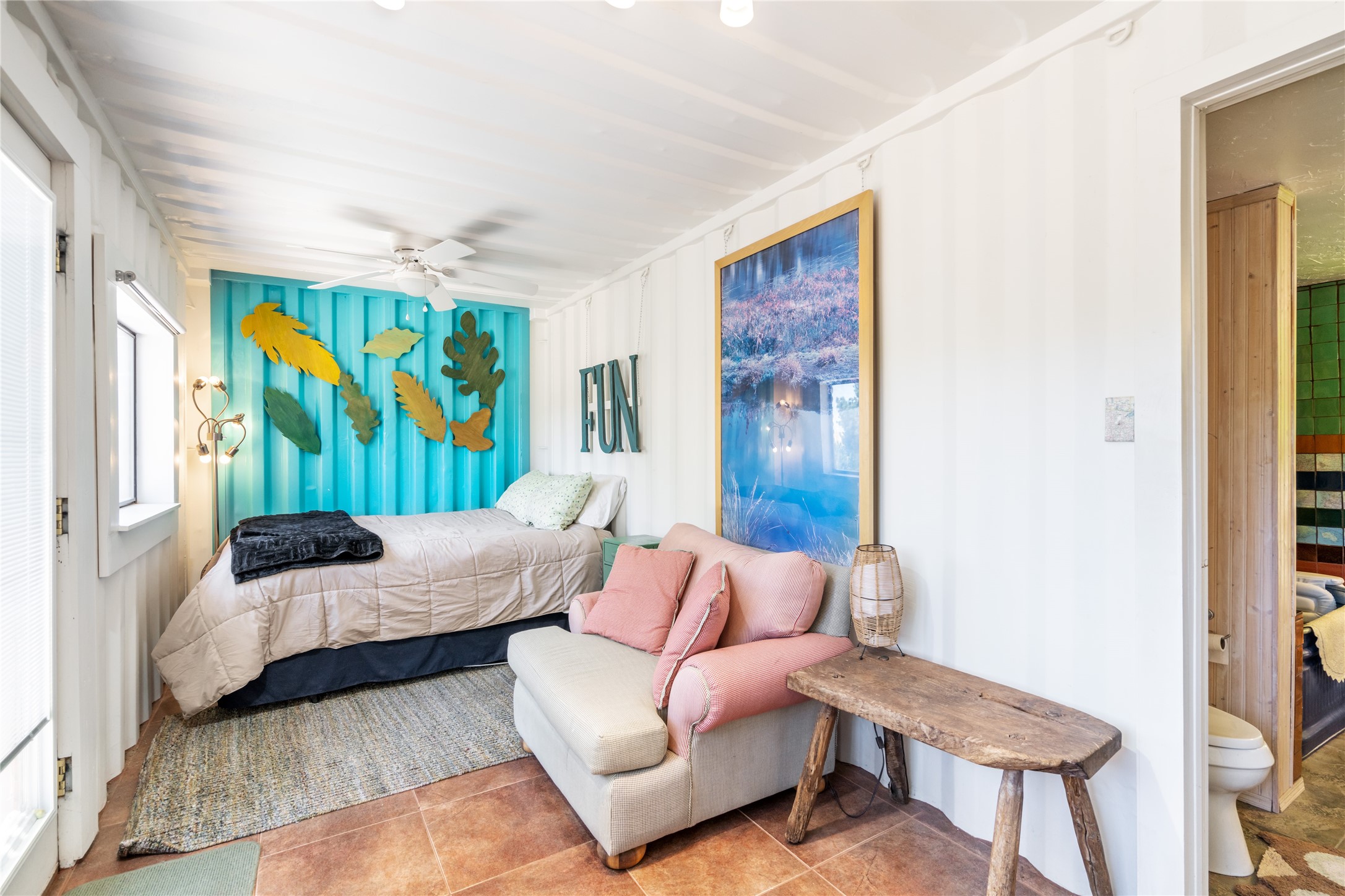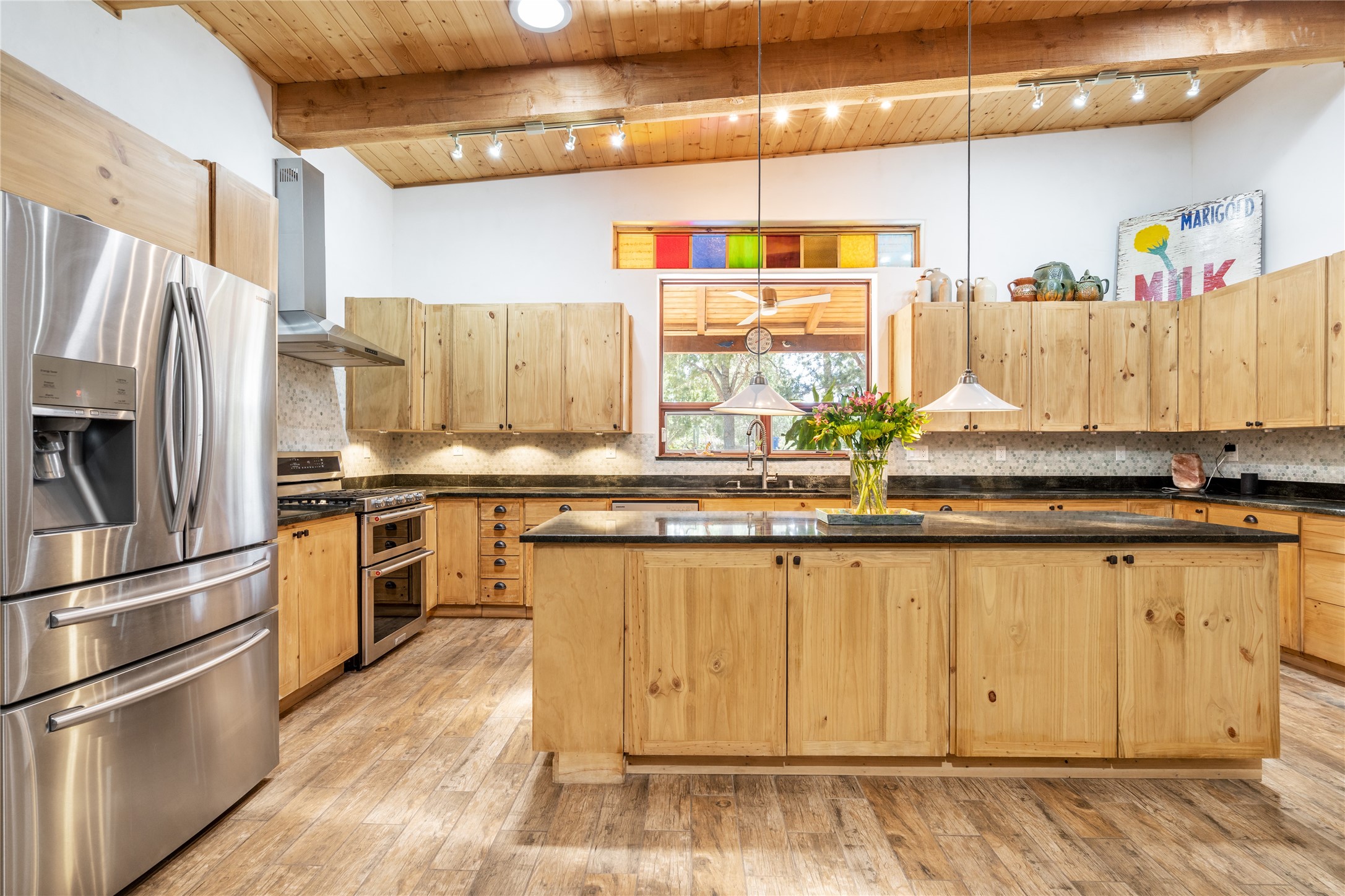 Welcome to this custom and unique gated compound on 5.76 acres just off the Old Santa Fe Trail. Built in 2016, the celebrated designer Todd Oldham credits his parents Linda and Jack Oldham with creating an "incubator of creativity." This fully fenced property features a pitched roof main house, a glass house with salvaged stained glass windows, a container modified into a hip, log cabin casita, a green house, an art house/studio, a wood shop, barn and stable. Lush and mature landscaping throughout with gardens galore and extensive rock work. Rare iris, mallows, clematis, plum, peach and cherry trees plus garden stone beds for growing corn, tomatoes, greens, cucumbers, sweet peas and strawberries; a true gardeners paradise. A private well with 13 acre feet of water and two, 2000 gallon tanks for efficient water reclamation. The main house at 4268 square feet has a pitched ceiling, an entry way with handmade tile and restored metal 1940s chandeliers, three bedrooms, large primary bathroom w/custom handmade tiles, one 3/4 bathroom and a colorful and artistically tiled 3rd bathroom, 1/2 bath with bird motif walls, den/studio, kitchen, walk-in pantry and plenty of wall space for artwork and collectibles. The kitchen has black marble counter tops and marble hexagon green tiled back splash with antique glass windows above the sink, double sided spice rack and stainless appliances. The over sized garage is 1461 sq. ft and has ample bonus storage. Solar panels are owned and provide 40% of the electricity which provides an effortlessly comfortable and thermally efficient environment. This is a remarkable, story book setting punctuated with bursts of color from mosaics, stained glass and other art installations created by the entire family. Just 10 minutes to the Santa Fe Plaza, near Harry's Road House, El Gancho Club and easy access to I-25. Don't miss seeing this private and peaceful retreat.