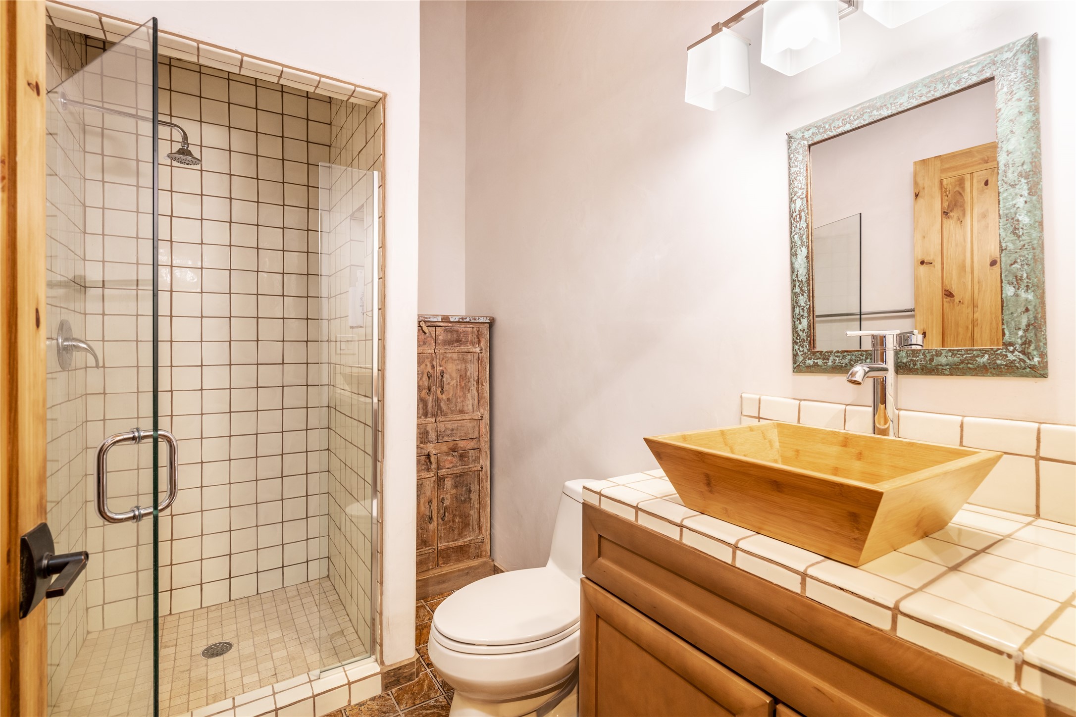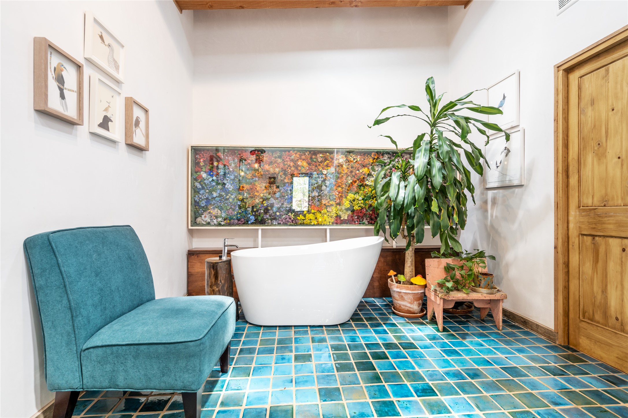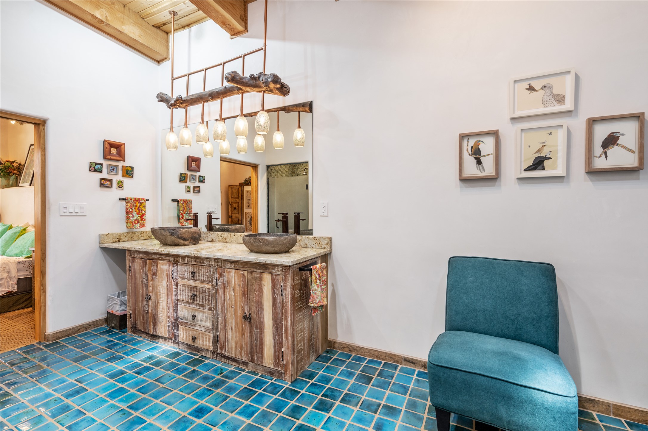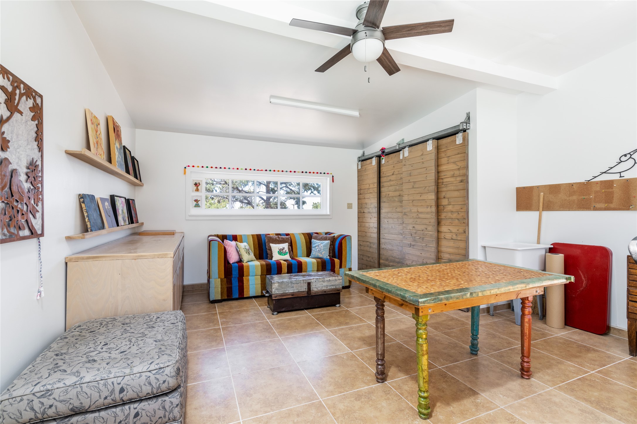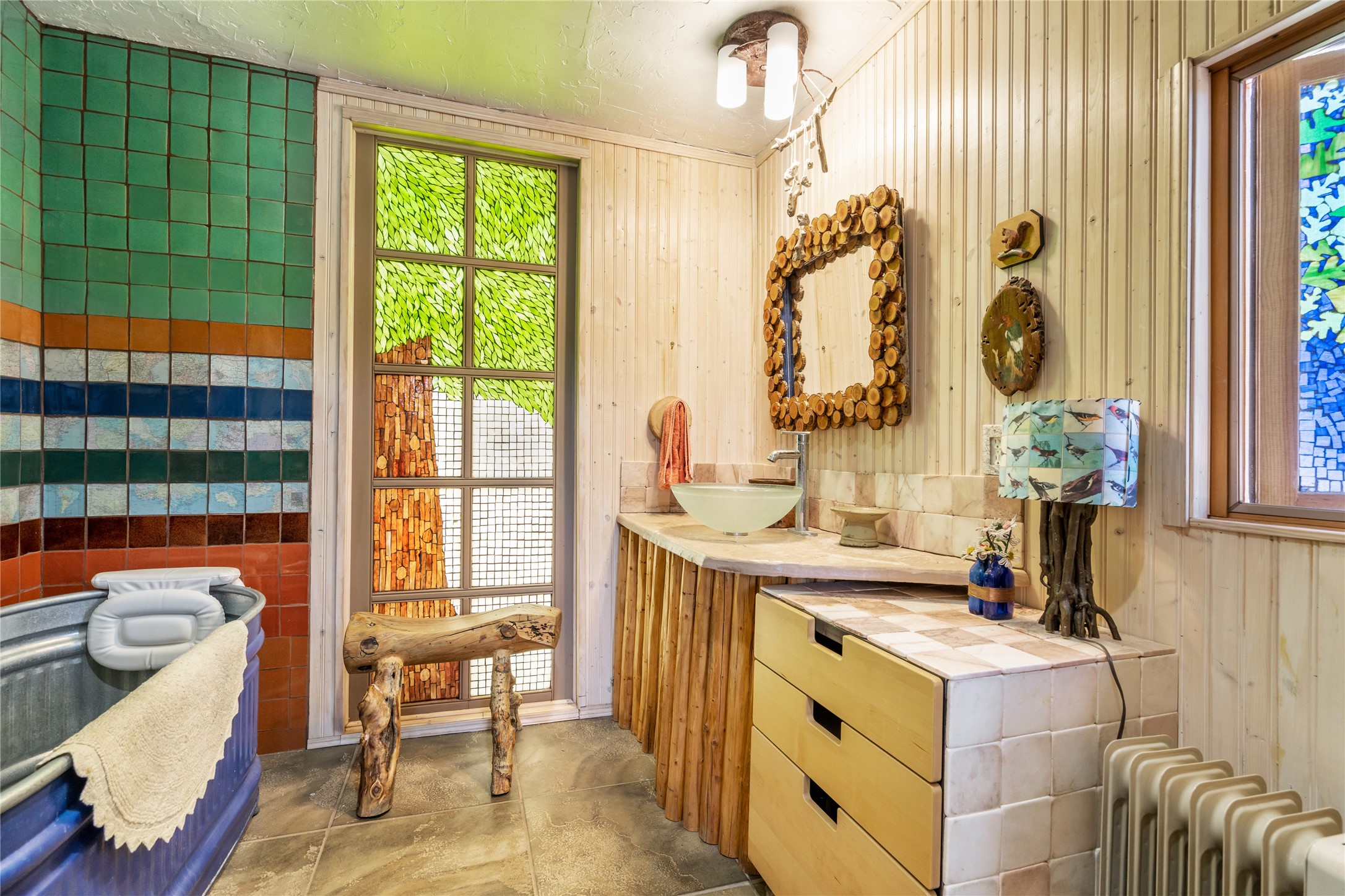 Welcome to this custom and unique gated compound on 5.76 acres just off the Old Santa Fe Trail. Built in 2016, the celebrated designer Todd Oldham credits his parents Linda and Jack Oldham with creating an "incubator of creativity." This fully fenced property features a pitched roof main house, a glass house with salvaged stained glass windows, a container modified into a hip, log cabin casita, a green house, an art house/studio, a wood shop, barn and stable. Lush and mature landscaping throughout with gardens galore and extensive rock work. Rare iris, mallows, clematis, plum, peach and cherry trees plus garden stone beds for growing corn, tomatoes, greens, cucumbers, sweet peas and strawberries; a true gardeners paradise. A private well with 13 acre feet of water and two, 2000 gallon tanks for efficient water reclamation. The main house at 4268 square feet has a pitched ceiling, an entry way with handmade tile and restored metal 1940s chandeliers, three bedrooms, large primary bathroom w/custom handmade tiles, one 3/4 bathroom and a colorful and artistically tiled 3rd bathroom, 1/2 bath with bird motif walls, den/studio, kitchen, walk-in pantry and plenty of wall space for artwork and collectibles. The kitchen has black marble counter tops and marble hexagon green tiled back splash with antique glass windows above the sink, double sided spice rack and stainless appliances. The over sized garage is 1461 sq. ft and has ample bonus storage. Solar panels are owned and provide 40% of the electricity which provides an effortlessly comfortable and thermally efficient environment. This is a remarkable, story book setting punctuated with bursts of color from mosaics, stained glass and other art installations created by the entire family. Just 10 minutes to the Santa Fe Plaza, near Harry's Road House, El Gancho Club and easy access to I-25. Don't miss seeing this private and peaceful retreat.