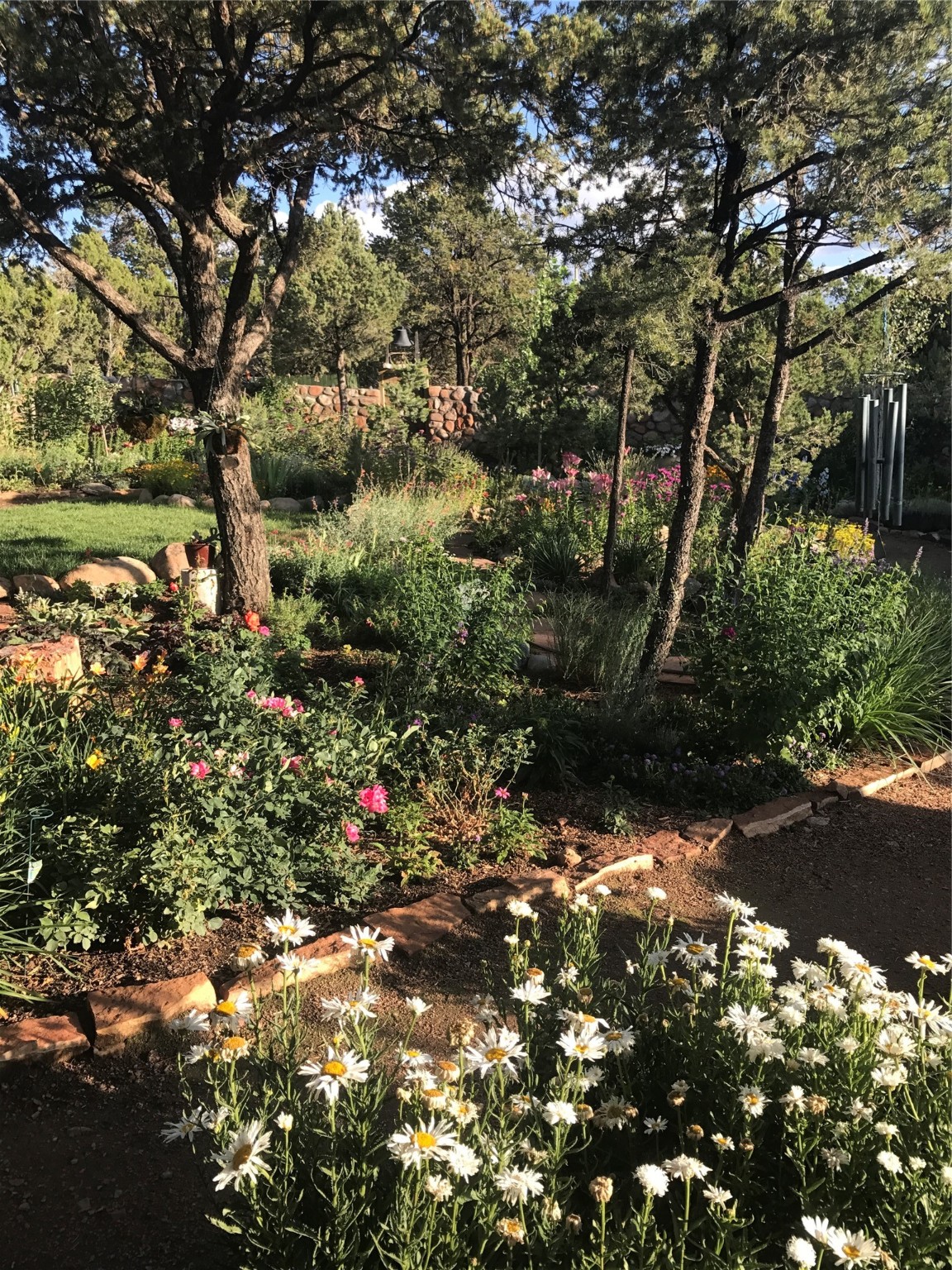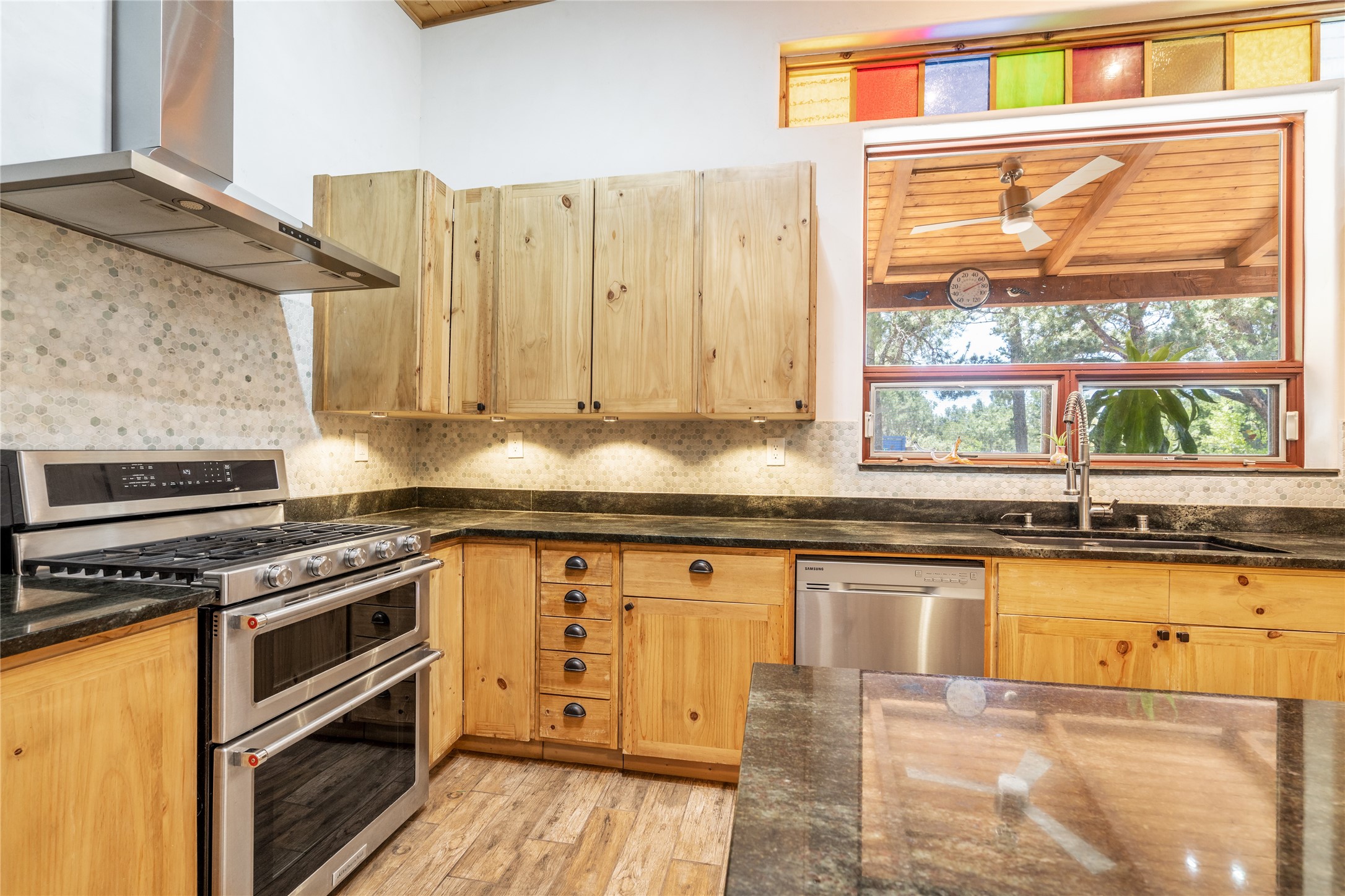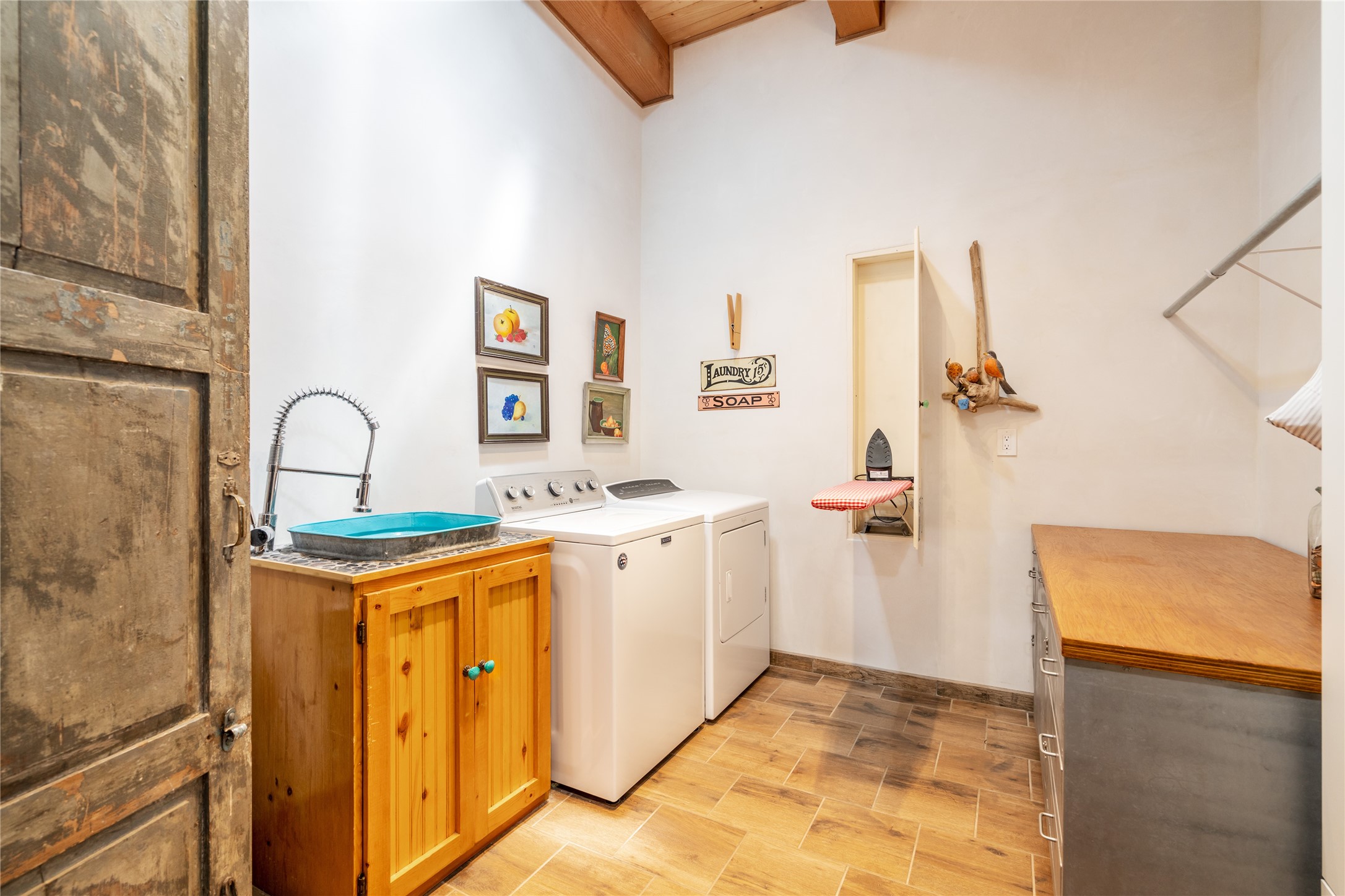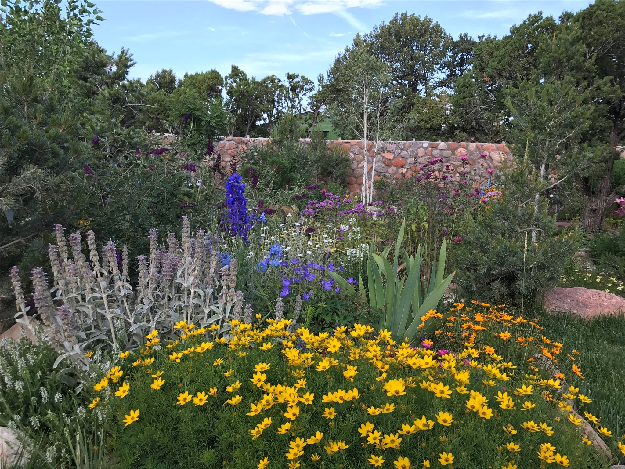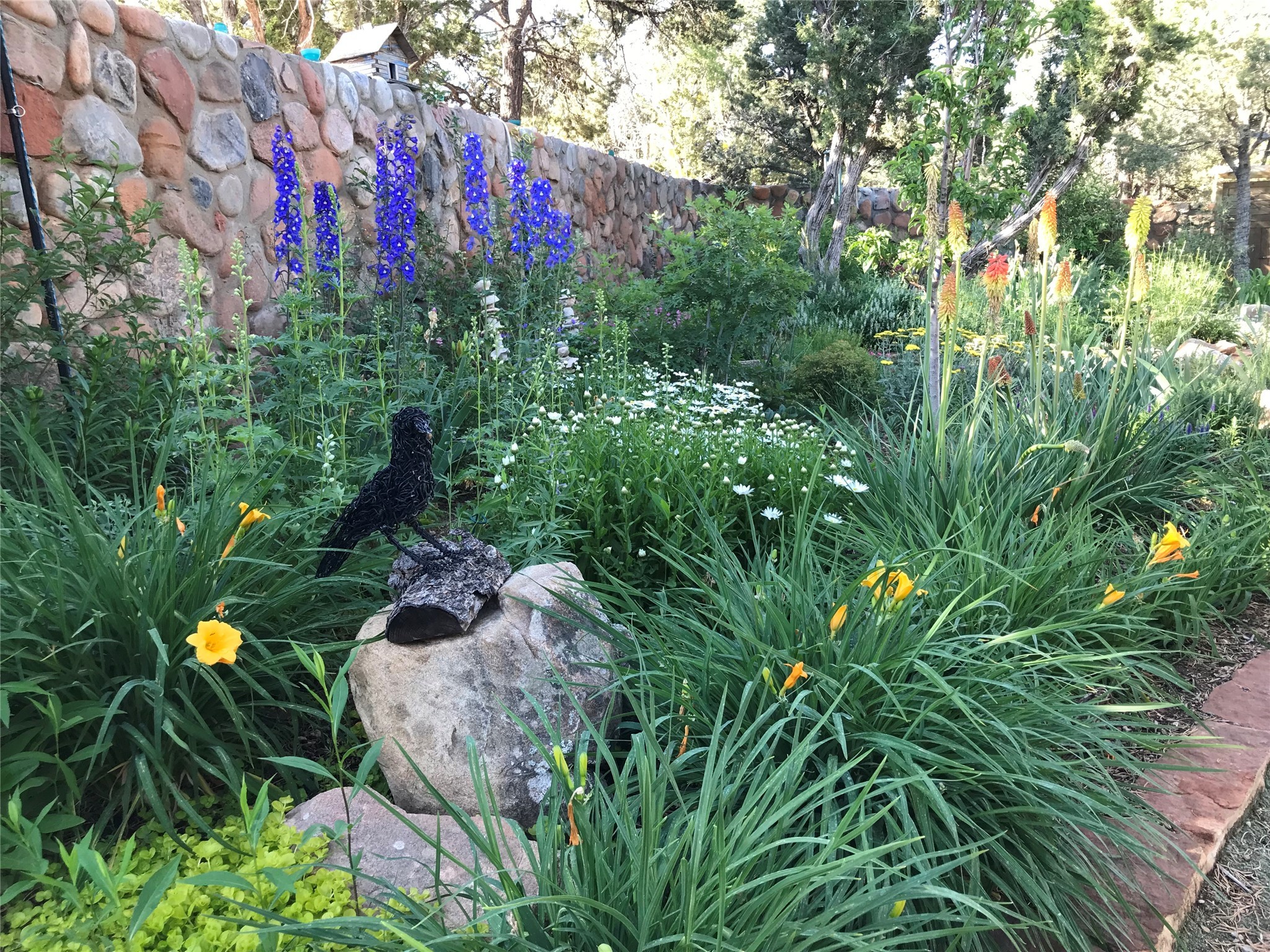 Welcome to this custom and unique gated compound on 5.76 acres just off the Old Santa Fe Trail. Built in 2016, the celebrated designer Todd Oldham credits his parents Linda and Jack Oldham with creating an "incubator of creativity." This fully fenced property features a pitched roof main house, a glass house with salvaged stained glass windows, a container modified into a hip, log cabin casita, a green house, an art house/studio, a wood shop, barn and stable. Lush and mature landscaping throughout with gardens galore and extensive rock work. Rare iris, mallows, clematis, plum, peach and cherry trees plus garden stone beds for growing corn, tomatoes, greens, cucumbers, sweet peas and strawberries; a true gardeners paradise. A private well with 13 acre feet of water and two, 2000 gallon tanks for efficient water reclamation. The main house at 4268 square feet has a pitched ceiling, an entry way with handmade tile and restored metal 1940s chandeliers, three bedrooms, large primary bathroom w/custom handmade tiles, one 3/4 bathroom and a colorful and artistically tiled 3rd bathroom, 1/2 bath with bird motif walls, den/studio, kitchen, walk-in pantry and plenty of wall space for artwork and collectibles. The kitchen has black marble counter tops and marble hexagon green tiled back splash with antique glass windows above the sink, double sided spice rack and stainless appliances. The over sized garage is 1461 sq. ft and has ample bonus storage. Solar panels are owned and provide 40% of the electricity which provides an effortlessly comfortable and thermally efficient environment. This is a remarkable, story book setting punctuated with bursts of color from mosaics, stained glass and other art installations created by the entire family. Just 10 minutes to the Santa Fe Plaza, near Harry's Road House, El Gancho Club and easy access to I-25. Don't miss seeing this private and peaceful retreat.