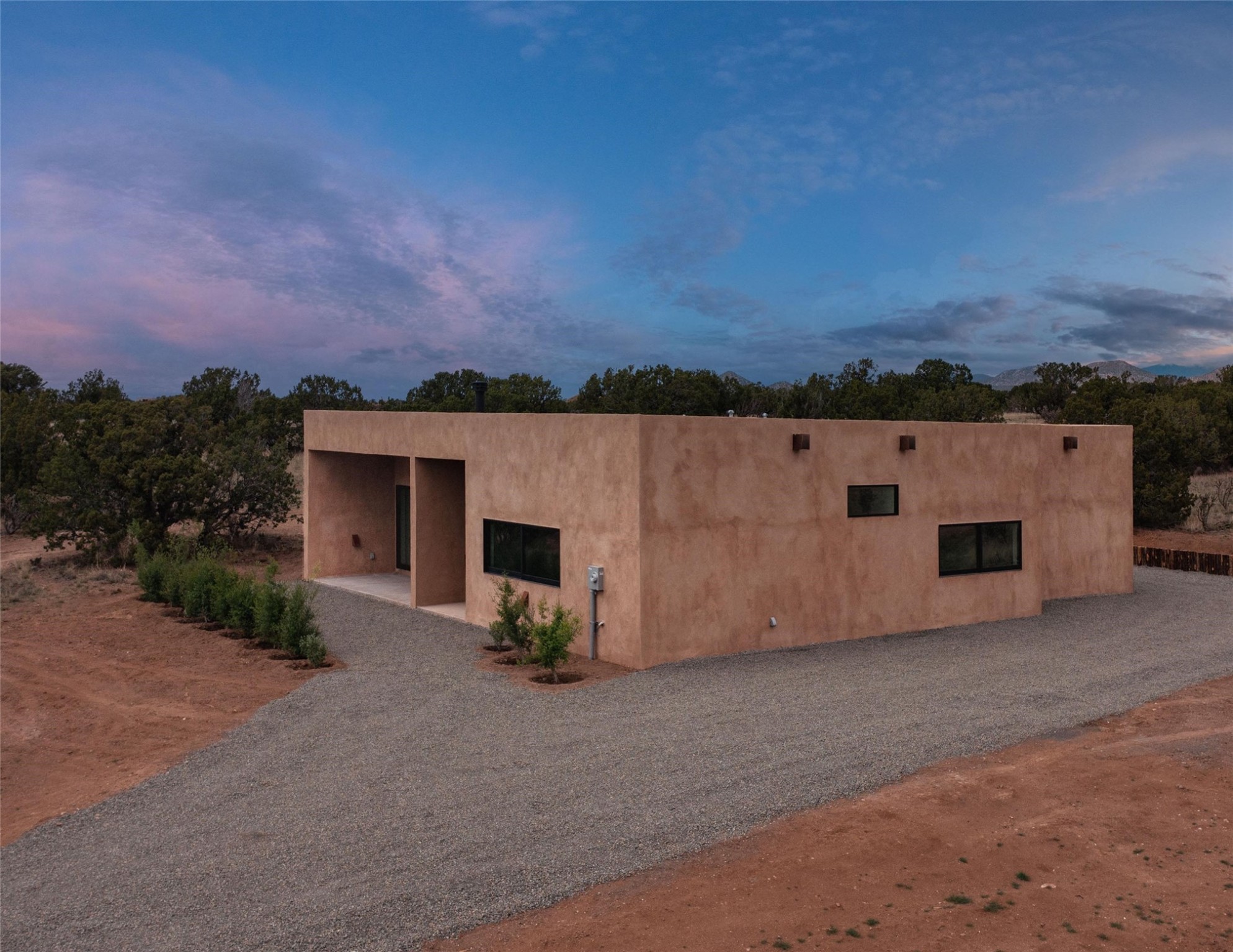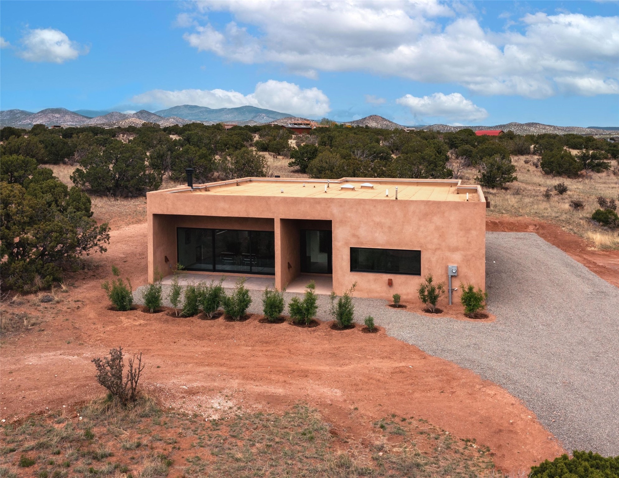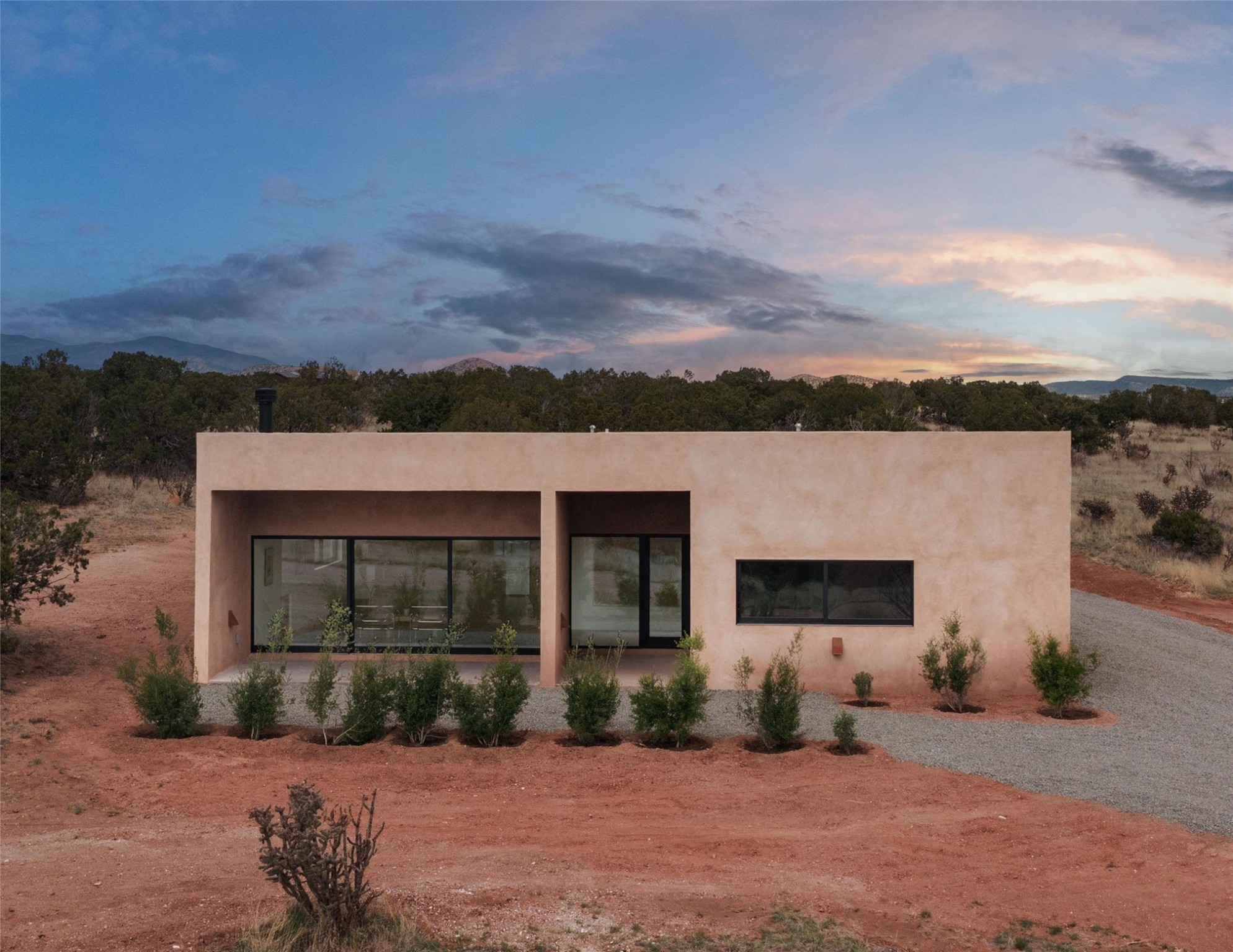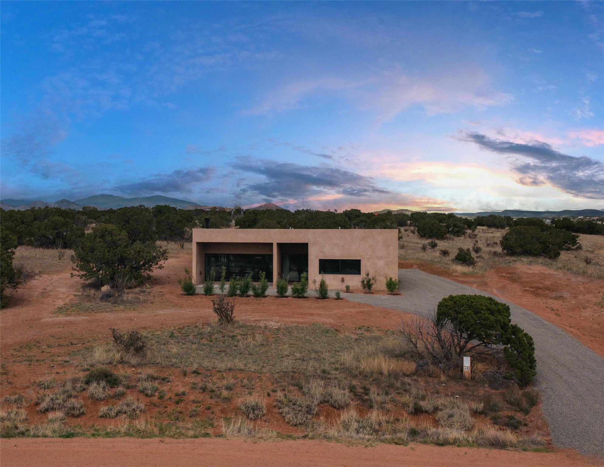 Outstanding views from the top of the hill for this wonderful mid-century style Jenning's designed/built home. Exciting newly constructed home with light filled rooms through out, fabulous/panoramic Ortiz mountain views, and refreshing hard edge modern design. This new home has a open living/dining/kitchen area with lovely beams, central kitchen island, Euro style stainless Bosch appliances, sleek cabinetry, granite counter tops, farm style sink, and under cabinet lighting. There is a wood burning fireplace in the living room. The main suite with mountain views is private and features a Euro style bath with walk in shower. All bedrooms are generous in size and Jennings has designed the 3rd bedroom as a very generous multi-function room which can be a bedroom or studio/creative space room. In addition, all windows used in construction are "Western" brand windows and are commercial grade with wide glass expanses. A very special upgrade feature. The home is on a nicely treed 2.73acre lot on the northern side of the subdivision. Rancho San Lucas is an established subdivision which was started in 2008 and has developed a sense of community. The location is ideal and is near the railroad trail system and the Galisteo Basin Reserve is within walking distance for additional hiking and star watching. Seller/builder will provide a one year builder warranty and the Rancho San Lucas Restrictive Covenants are available for review at www.ranchosanlucashoa.com/legal Property is in the Eldorado Water System and has natural gas.