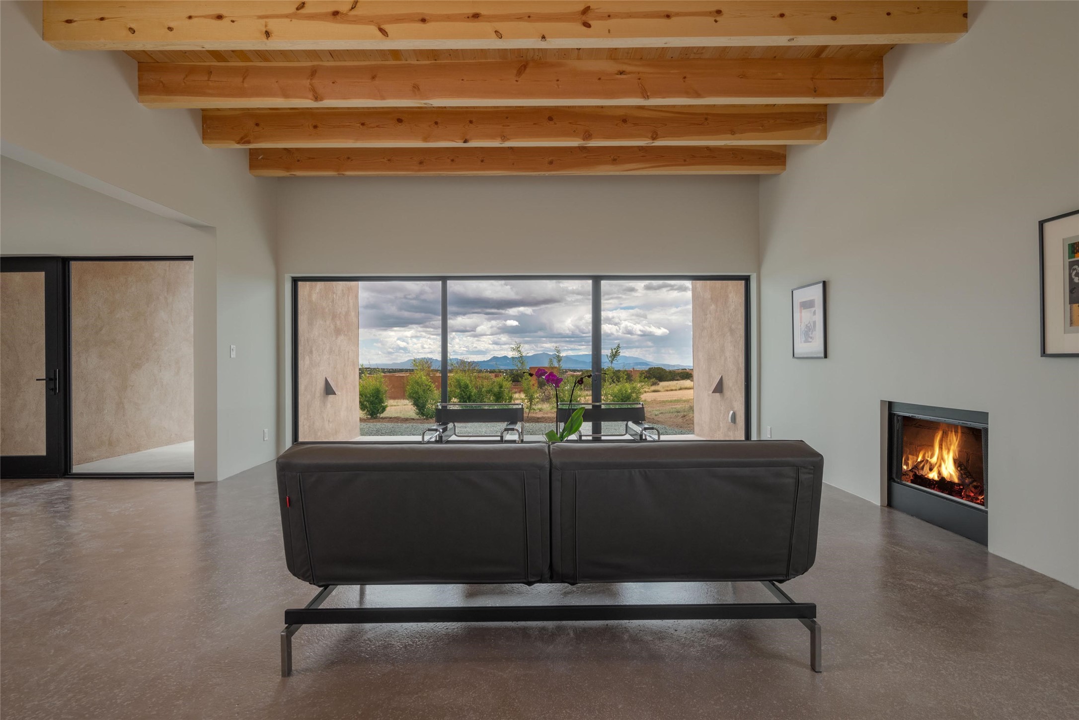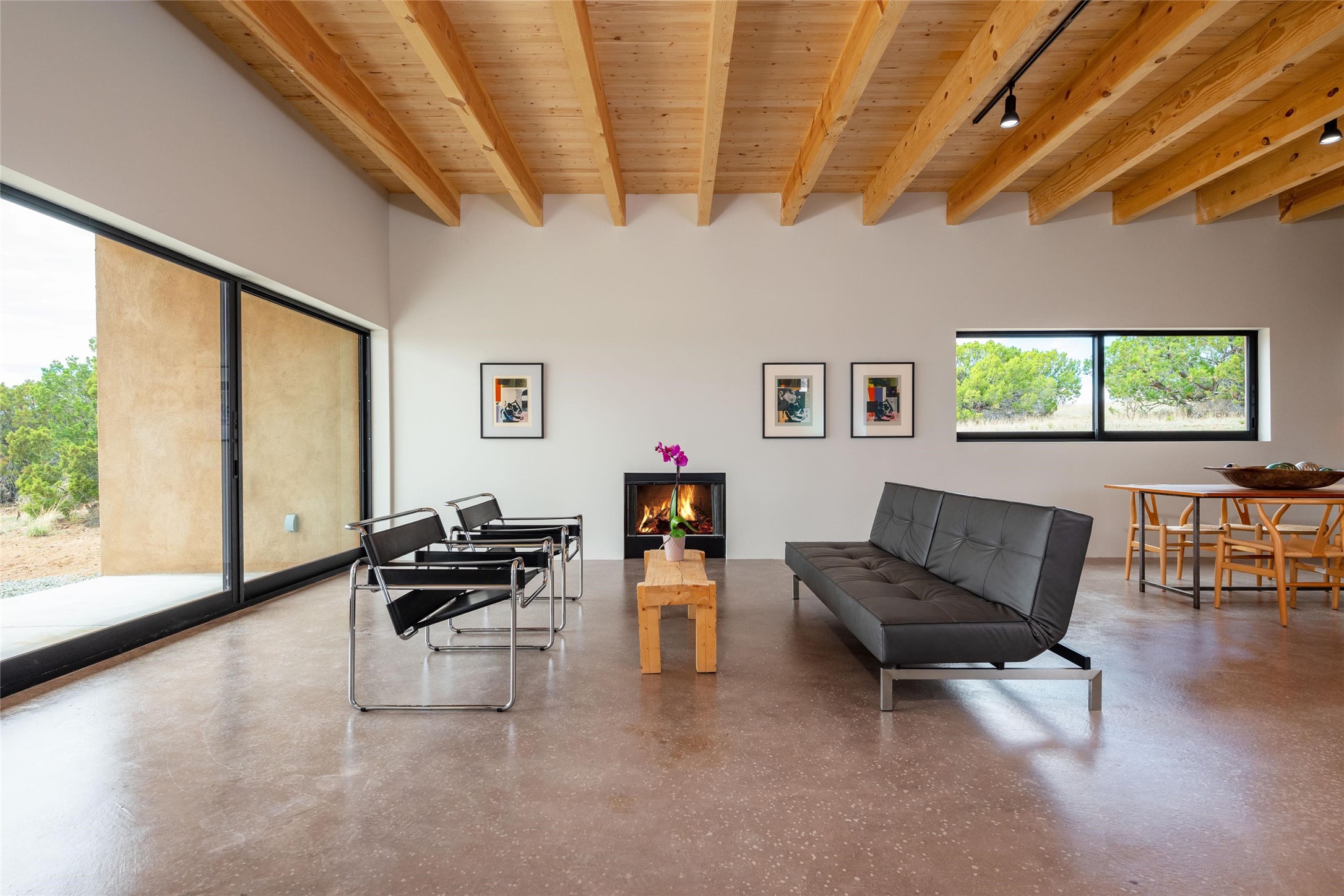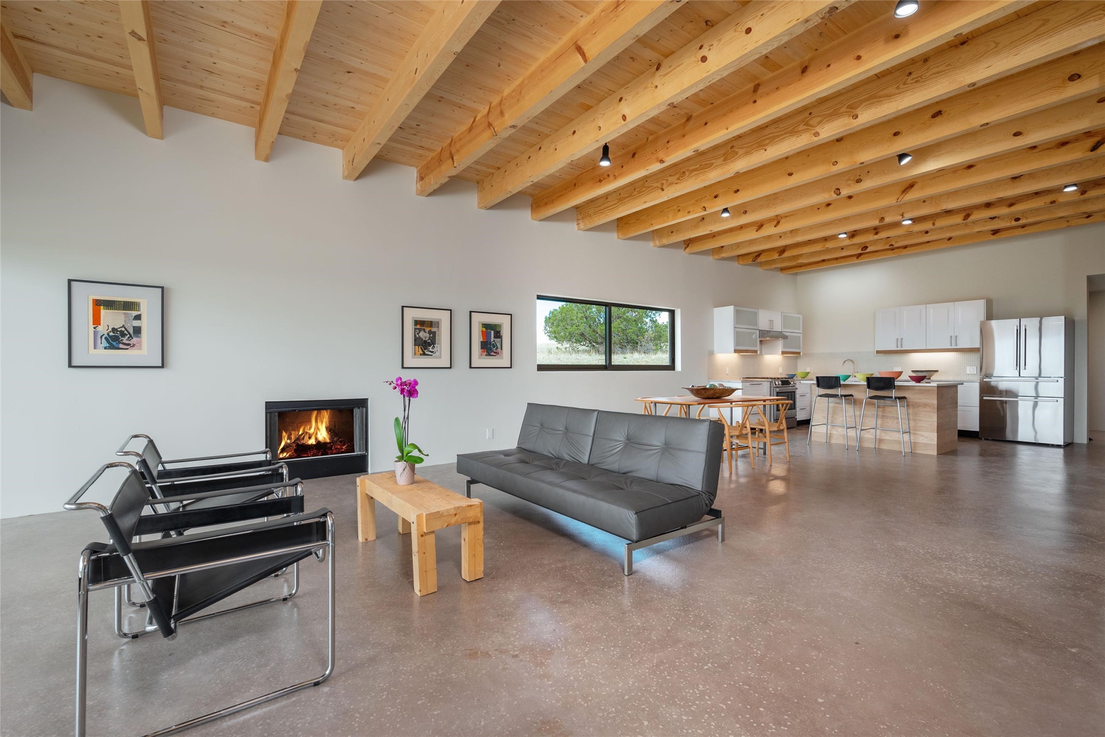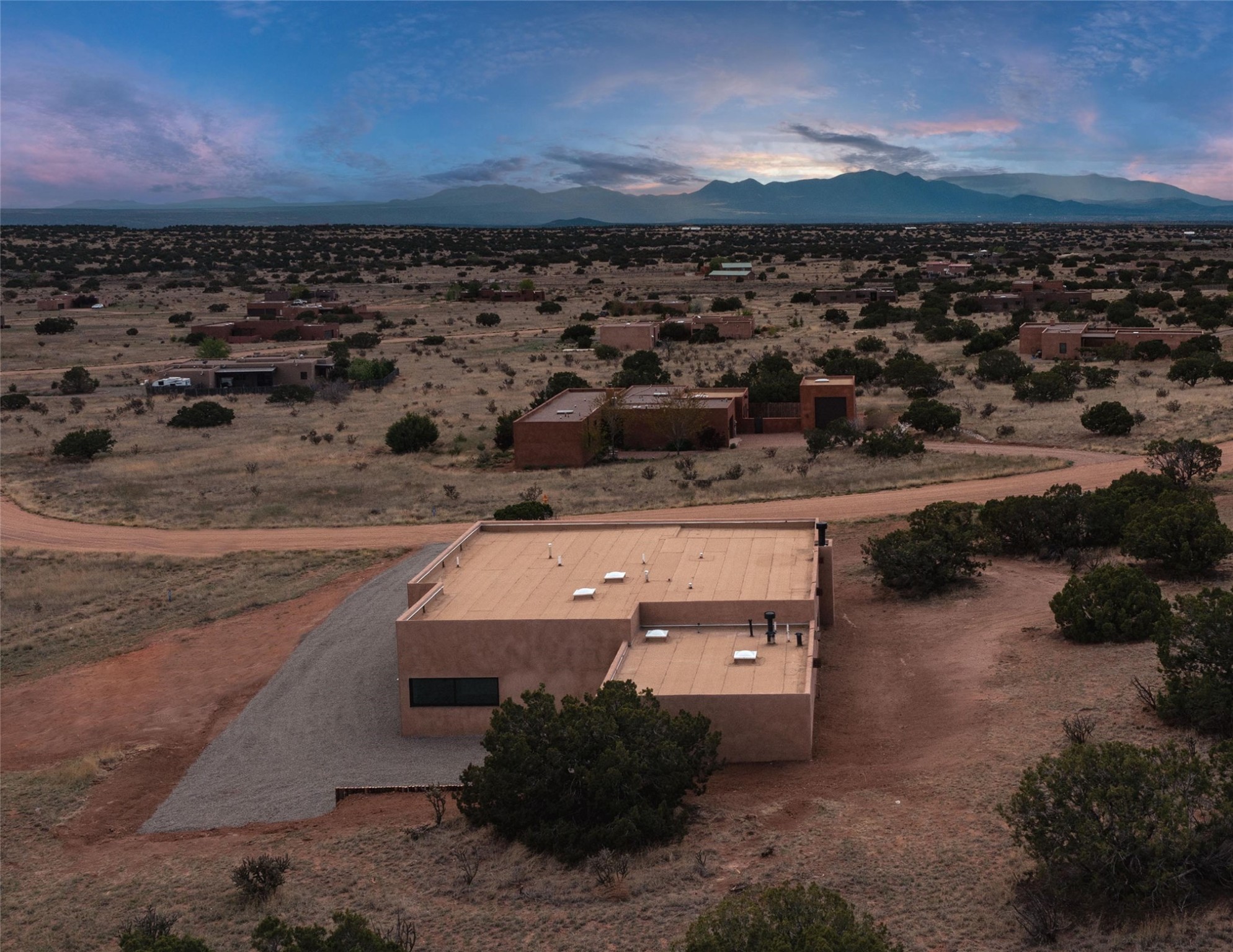 Outstanding views from the top of the hill for this wonderful mid-century style Jenning's designed/built home. Exciting newly constructed home with light filled rooms through out, fabulous/panoramic Ortiz mountain views, and refreshing hard edge modern design. This new home has a open living/dining/kitchen area with lovely beams, central kitchen island, Euro style stainless Bosch appliances, sleek cabinetry, granite counter tops, farm style sink, and under cabinet lighting. There is a wood burning fireplace in the living room. The main suite with mountain views is private and features a Euro style bath with walk in shower. All bedrooms are generous in size and Jennings has designed the 3rd bedroom as a very generous multi-function room which can be a bedroom or studio/creative space room. In addition, all windows used in construction are "Western" brand windows and are commercial grade with wide glass expanses. A very special upgrade feature. The home is on a nicely treed 2.73acre lot on the northern side of the subdivision. Rancho San Lucas is an established subdivision which was started in 2008 and has developed a sense of community. The location is ideal and is near the railroad trail system and the Galisteo Basin Reserve is within walking distance for additional hiking and star watching. Seller/builder will provide a one year builder warranty and the Rancho San Lucas Restrictive Covenants are available for review at www.ranchosanlucashoa.com/legal Property is in the Eldorado Water System and has natural gas.