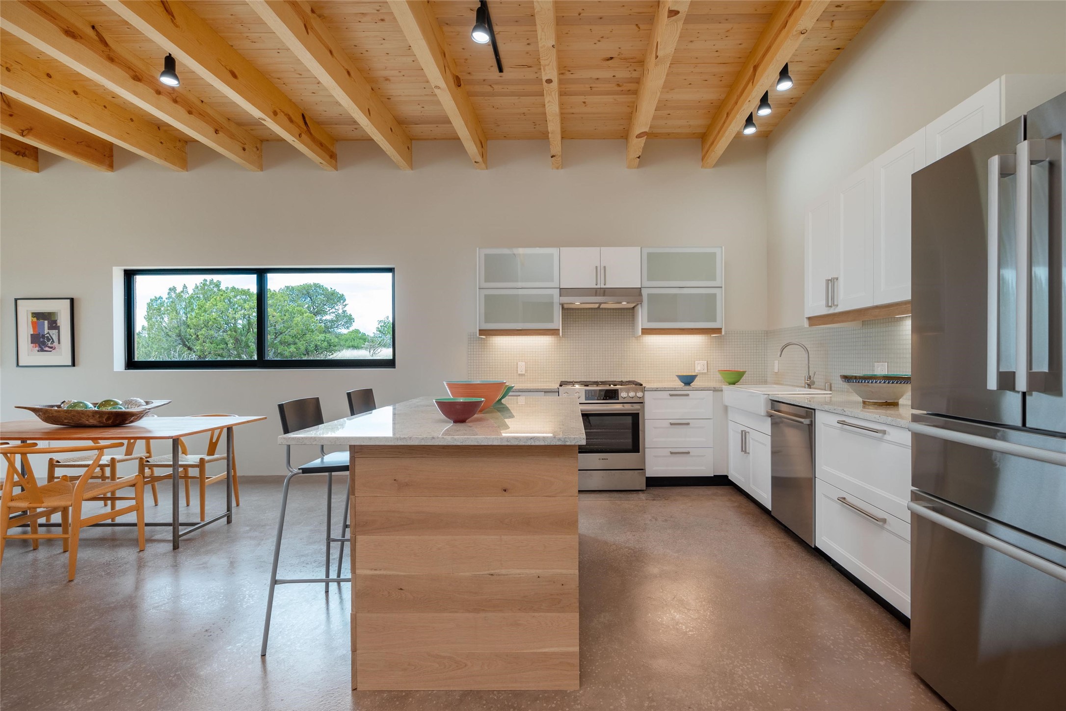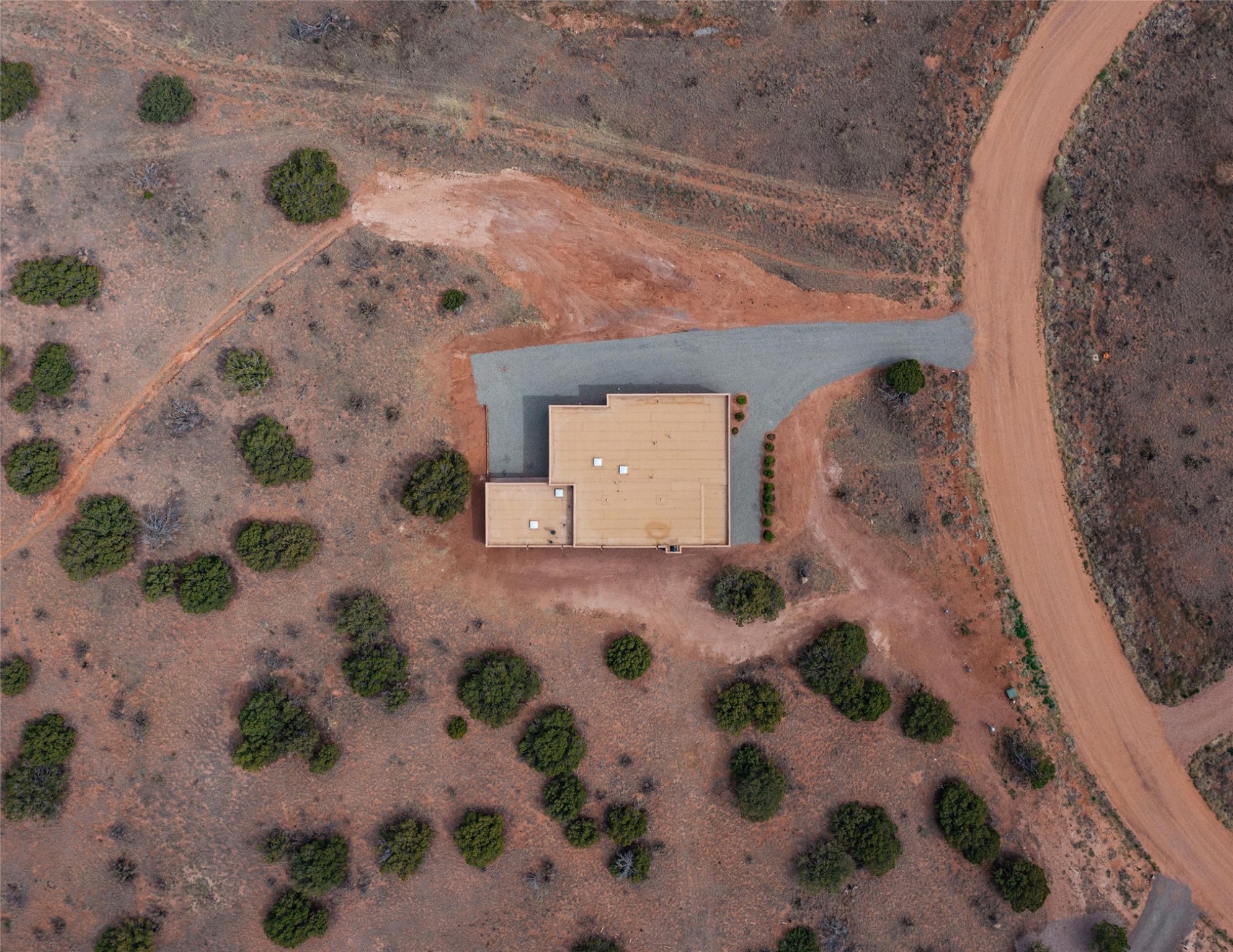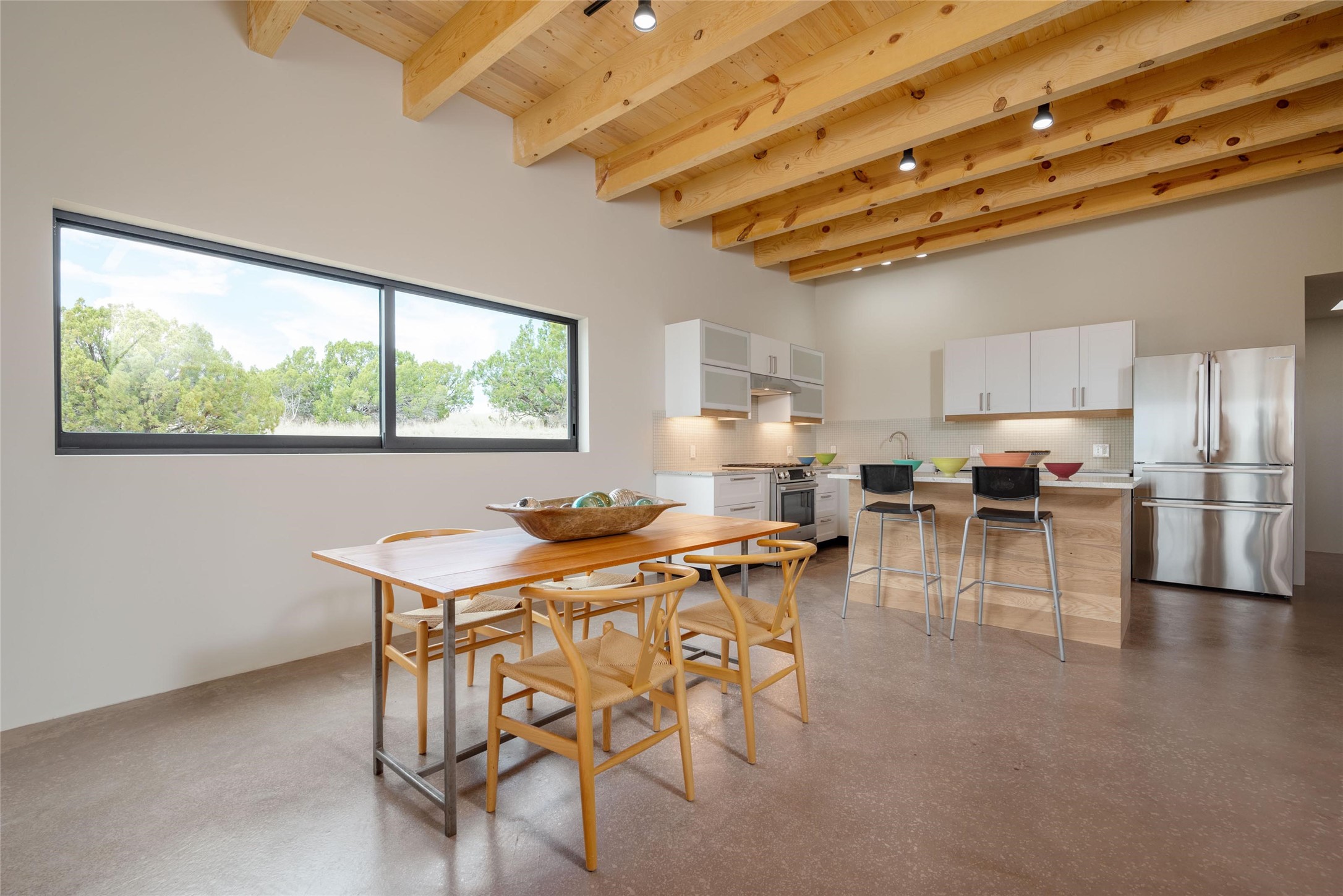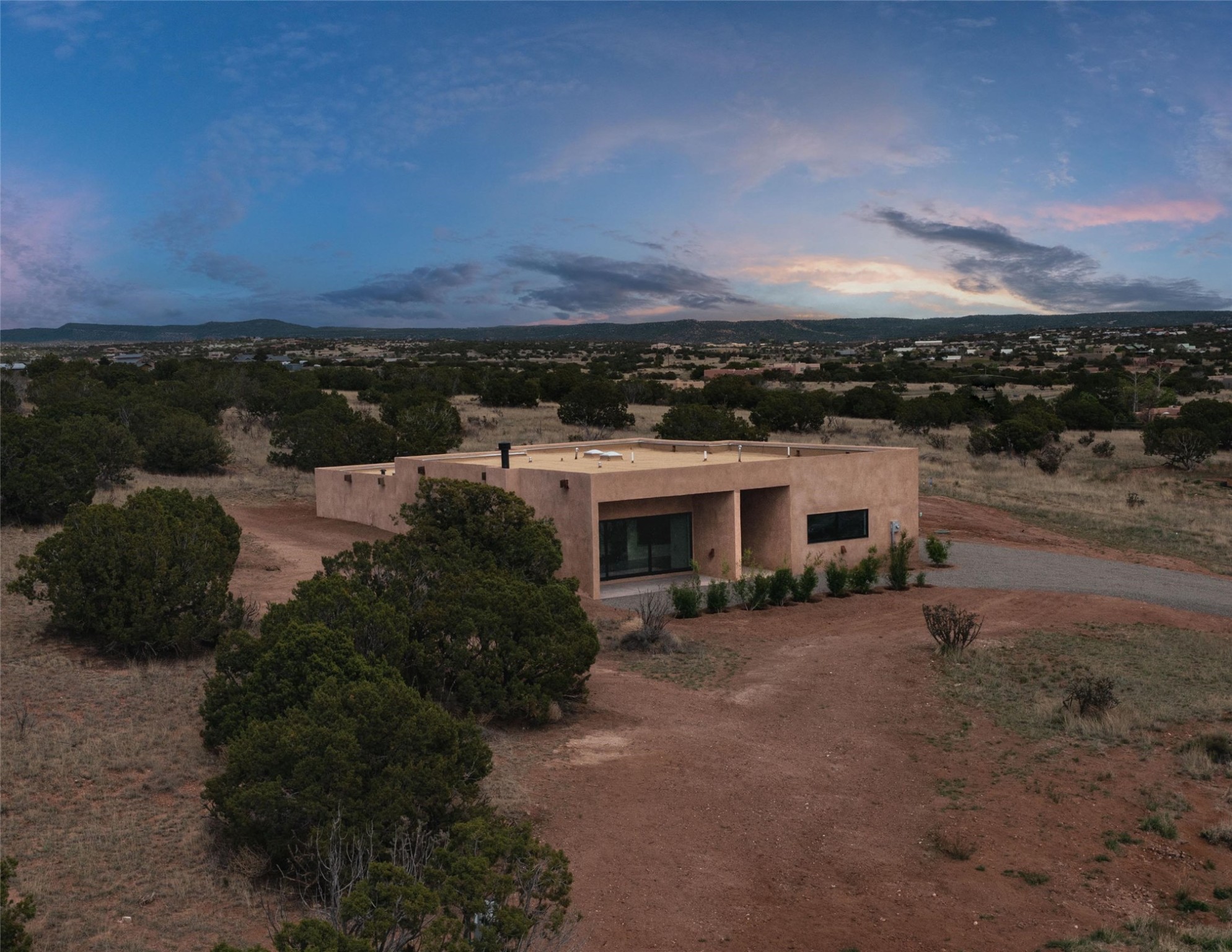 Outstanding views from the top of the hill for this wonderful mid-century style Jenning's designed/built home. Exciting newly constructed home with light filled rooms through out, fabulous/panoramic Ortiz mountain views, and refreshing hard edge modern design. This new home has a open living/dining/kitchen area with lovely beams, central kitchen island, Euro style stainless Bosch appliances, sleek cabinetry, granite counter tops, farm style sink, and under cabinet lighting. There is a wood burning fireplace in the living room. The main suite with mountain views is private and features a Euro style bath with walk in shower. All bedrooms are generous in size and Jennings has designed the 3rd bedroom as a very generous multi-function room which can be a bedroom or studio/creative space room. In addition, all windows used in construction are "Western" brand windows and are commercial grade with wide glass expanses. A very special upgrade feature. The home is on a nicely treed 2.73acre lot on the northern side of the subdivision. Rancho San Lucas is an established subdivision which was started in 2008 and has developed a sense of community. The location is ideal and is near the railroad trail system and the Galisteo Basin Reserve is within walking distance for additional hiking and star watching. Seller/builder will provide a one year builder warranty and the Rancho San Lucas Restrictive Covenants are available for review at www.ranchosanlucashoa.com/legal Property is in the Eldorado Water System and has natural gas.