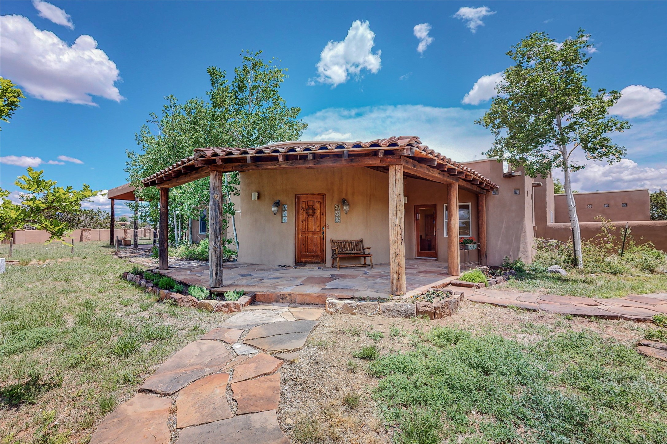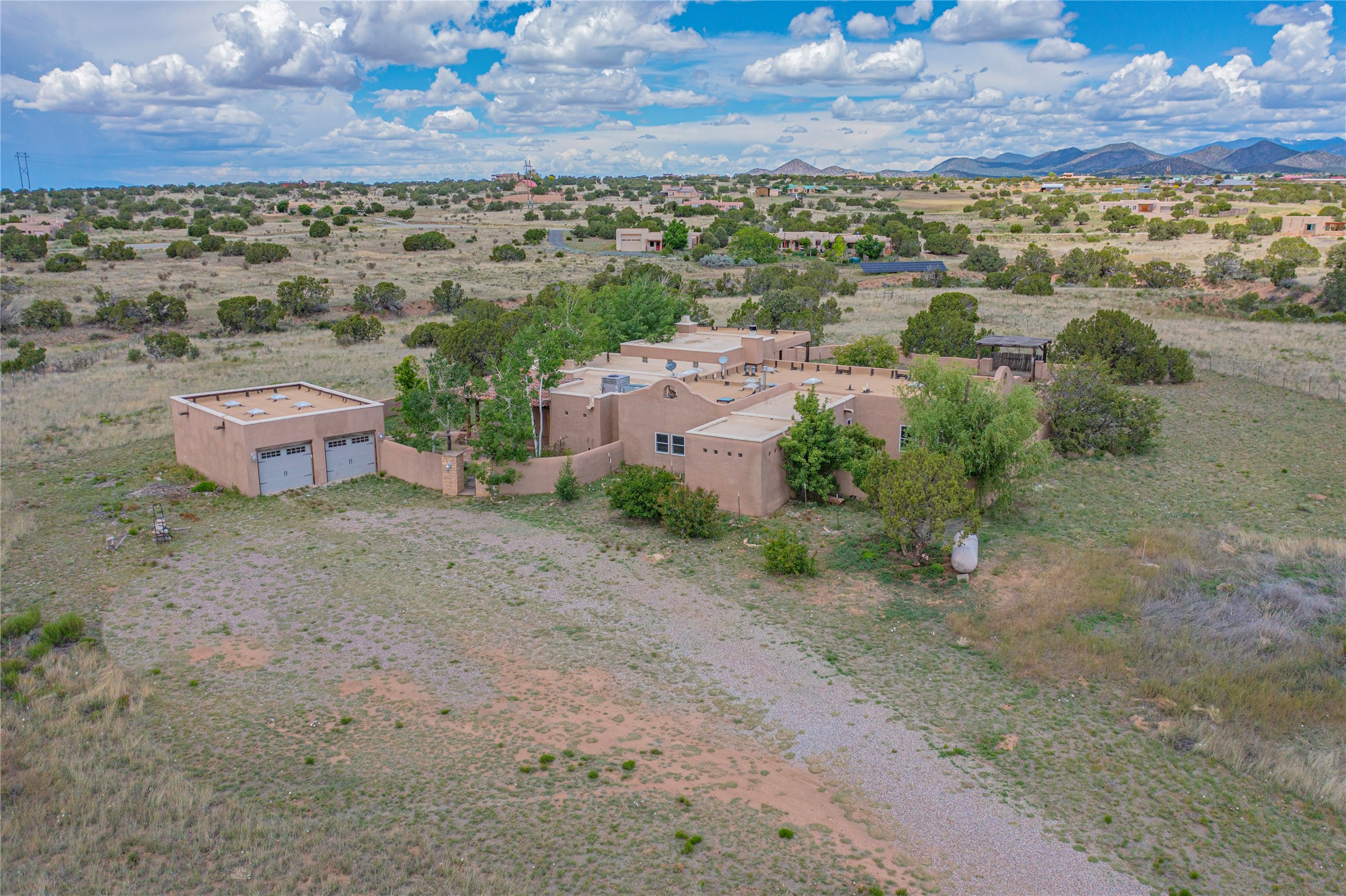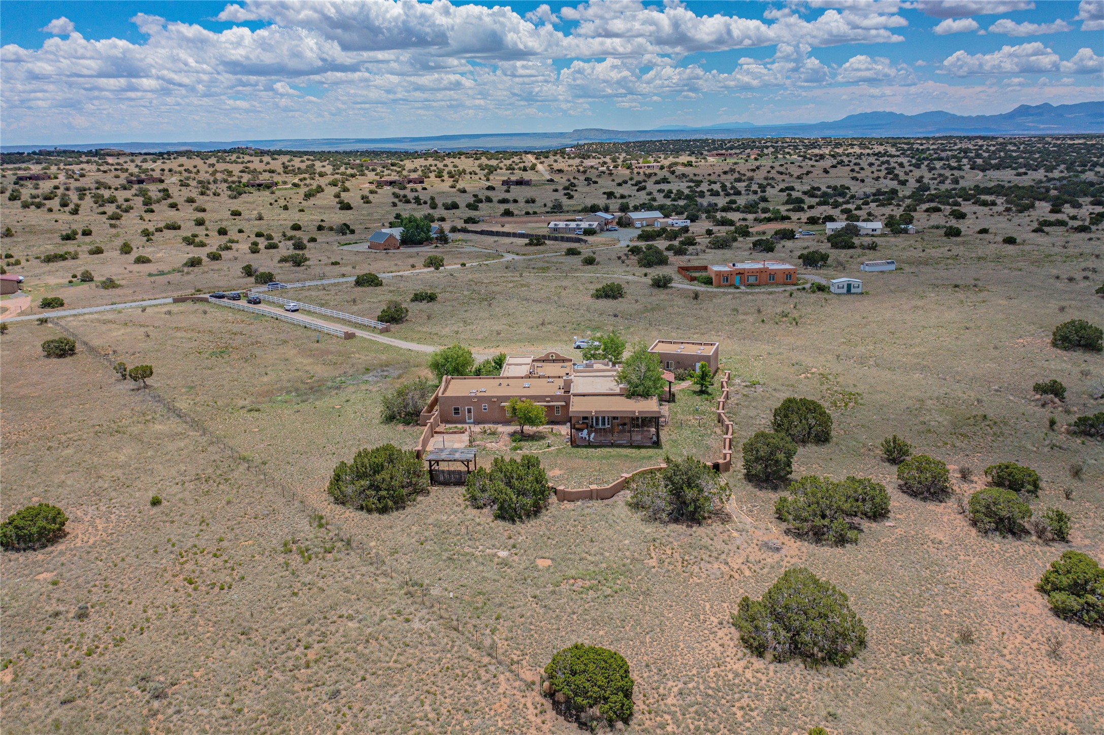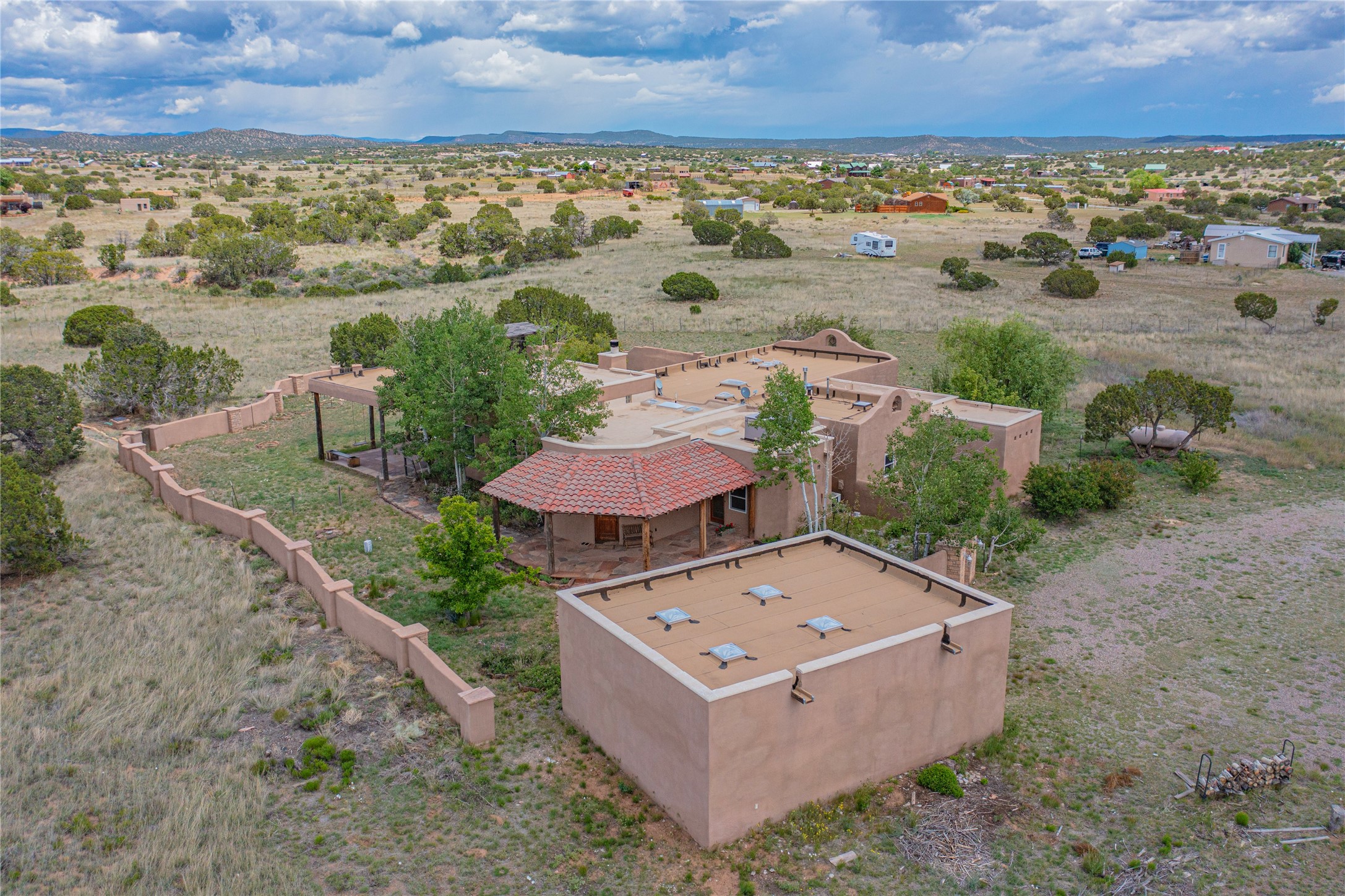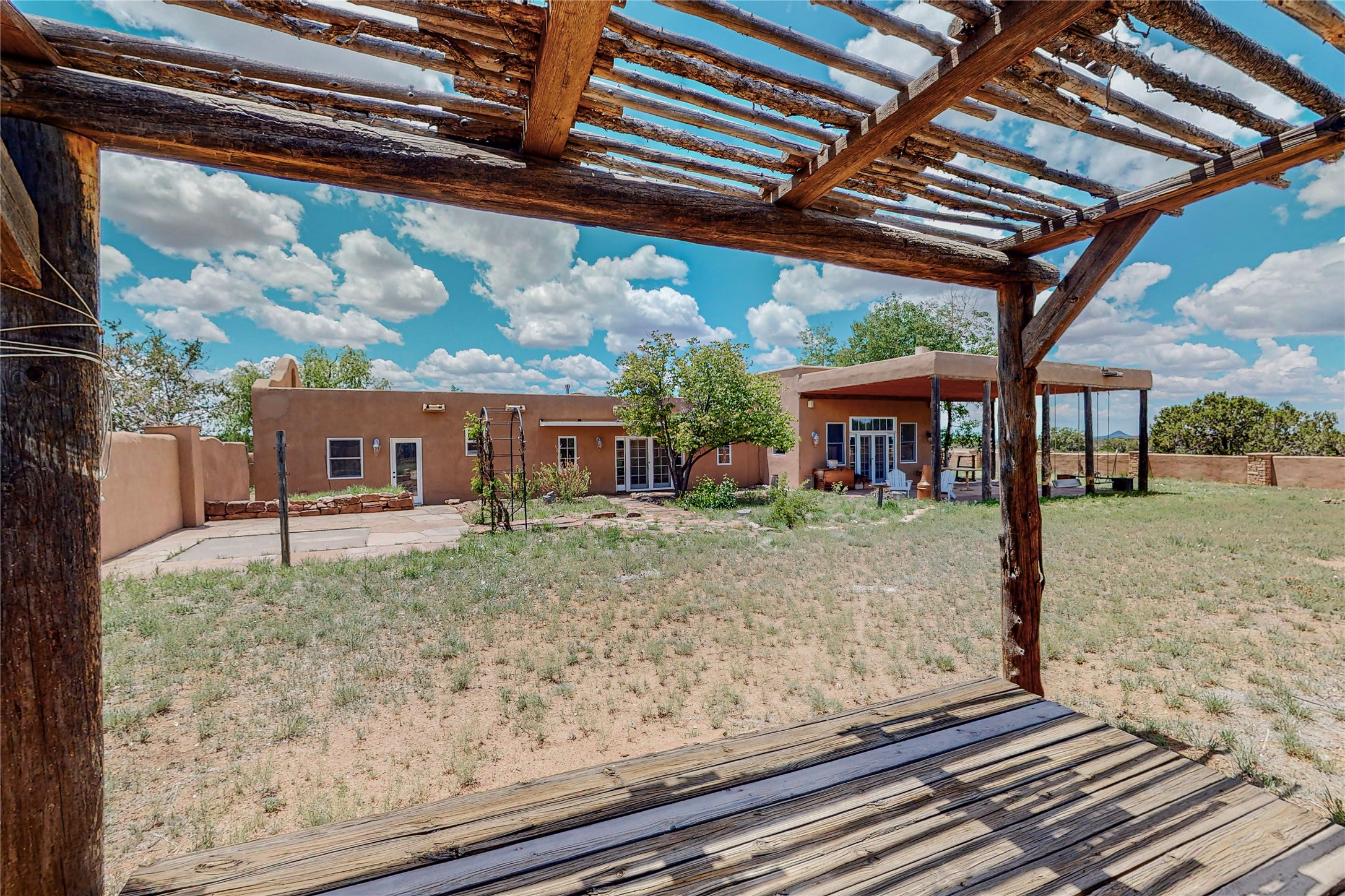 Welcome to an extraordinary slice of Southwestern serenity. This skillfully crafted ranch property is an impressive blend of rustic charm and modern amenities spread across over 4000 sq. ft. With three bedrooms and three bathrooms, this home is nestled on five private acres, rich in views, and boasts an additional room that makes a perfect office or flex room with a private entry. The home's distinctive character is marked by accents of 150-year-old reclaimed lumber and honed flagstone floors with tile inlay. Curved archways, charming details, and exquisite built-ins add to the home's unique aesthetic. Thirteen skylights throughout the house create a light-filled environment, while two fireplaces add warmth and ambiance.Cater to your culinary ambitions in the gourmet kitchen, featuring granite countertops, a spacious island, two refrigerators/freezers, a 6-burner Garland stove, and a large walk-in pantry. Entertain effortlessly indoors and out with two spacious portals equipped with a sound system, lushly landscaped gardens, and multiple flagstone patios offering panoramic mountain views. French Pella double doors lead from the dining room and family room to the great outdoors, facilitating a seamless indoor-outdoor lifestyle. The home's flexible floor plan accommodates both formal and casual living spaces. A formal dining room with limestone accents and an informal dining room with built-in shelves and counter complement the great room, replete with a kiva fireplace and 14-foot beamed ceilings. The primary suite, a true sanctuary, features a romantic bath with a vintage claw foot tub and travertine tile overlooking a private courtyard. The generously designed California Closet is not to be forgotten and is perfect for your wardrobe. Additional amenities include A/C, forced air heating, an oversized 2-car garage with four skylights and built-in storage, and a spacious laundry room equipped with a washer and dryer.
