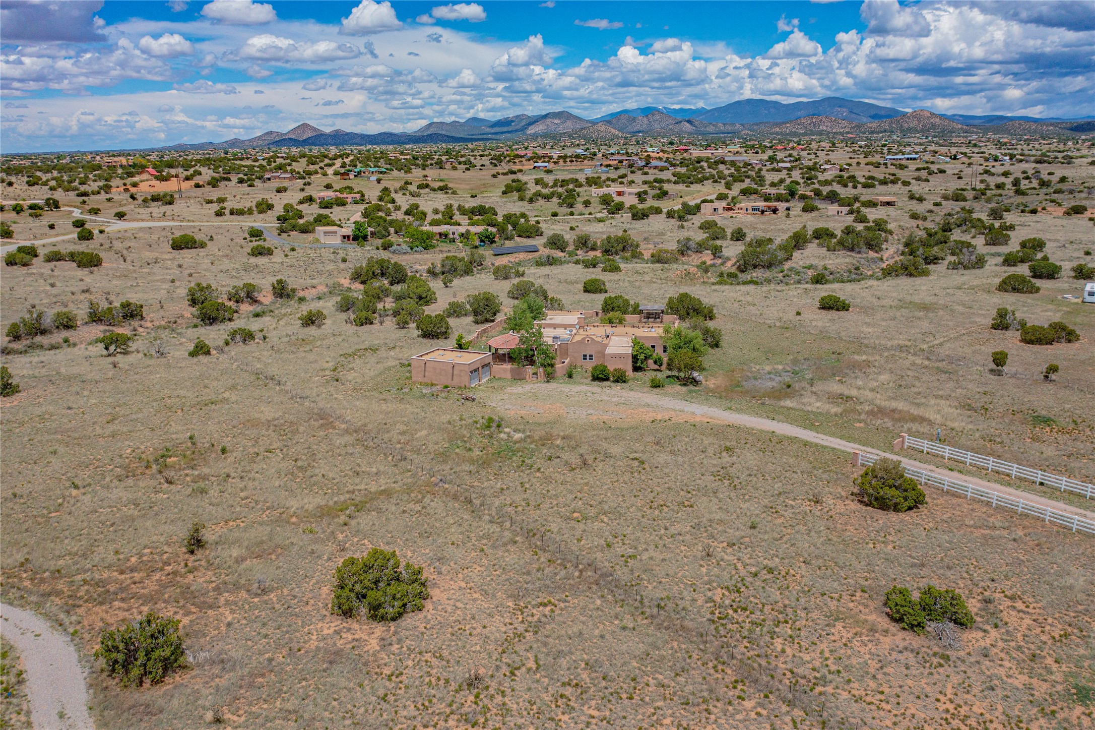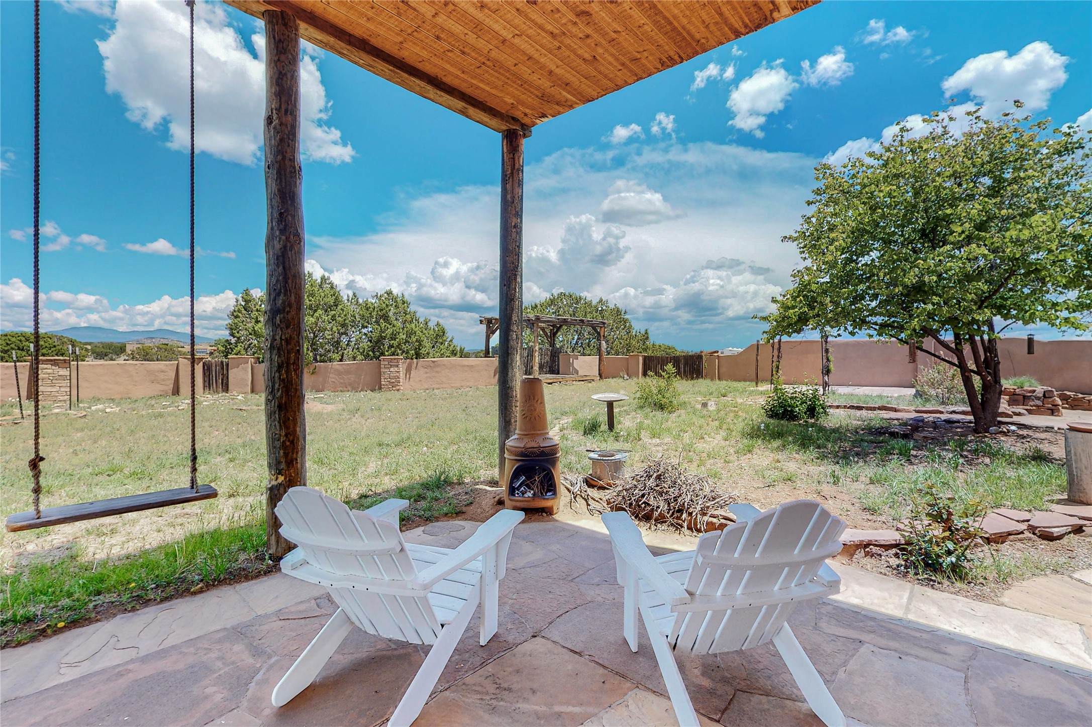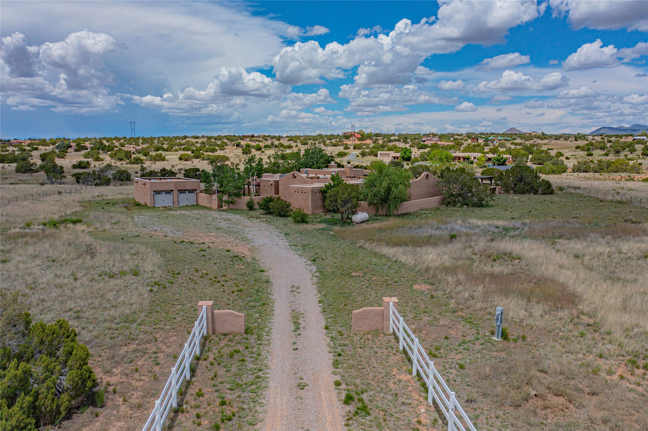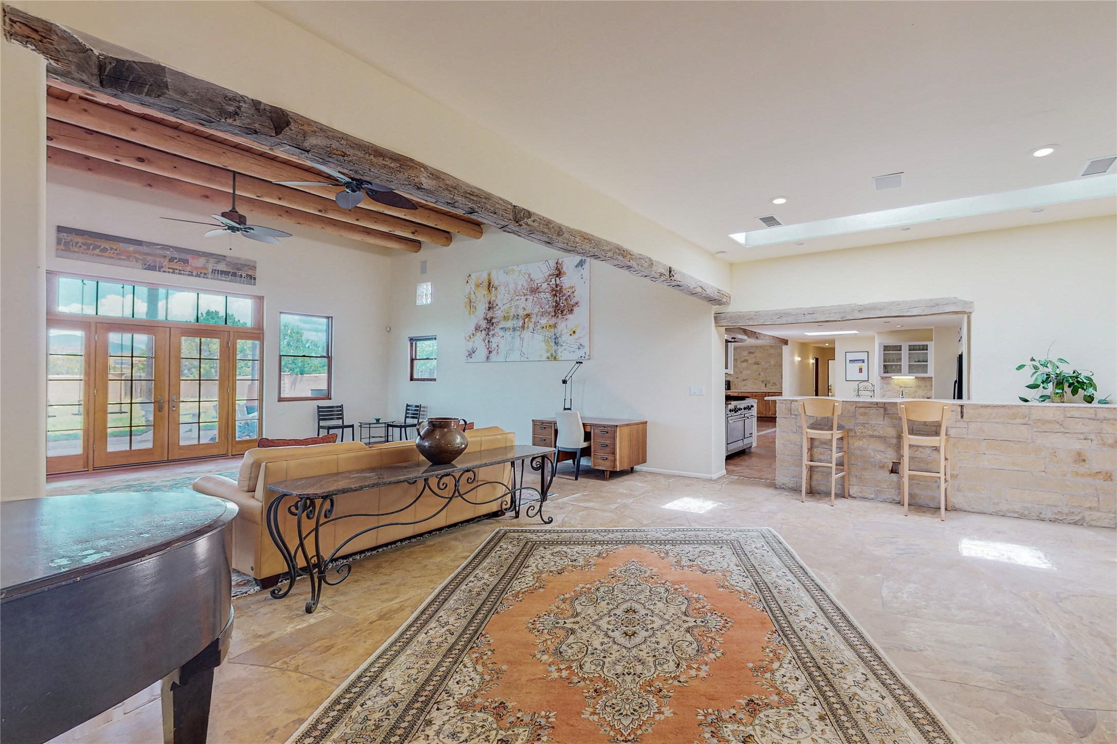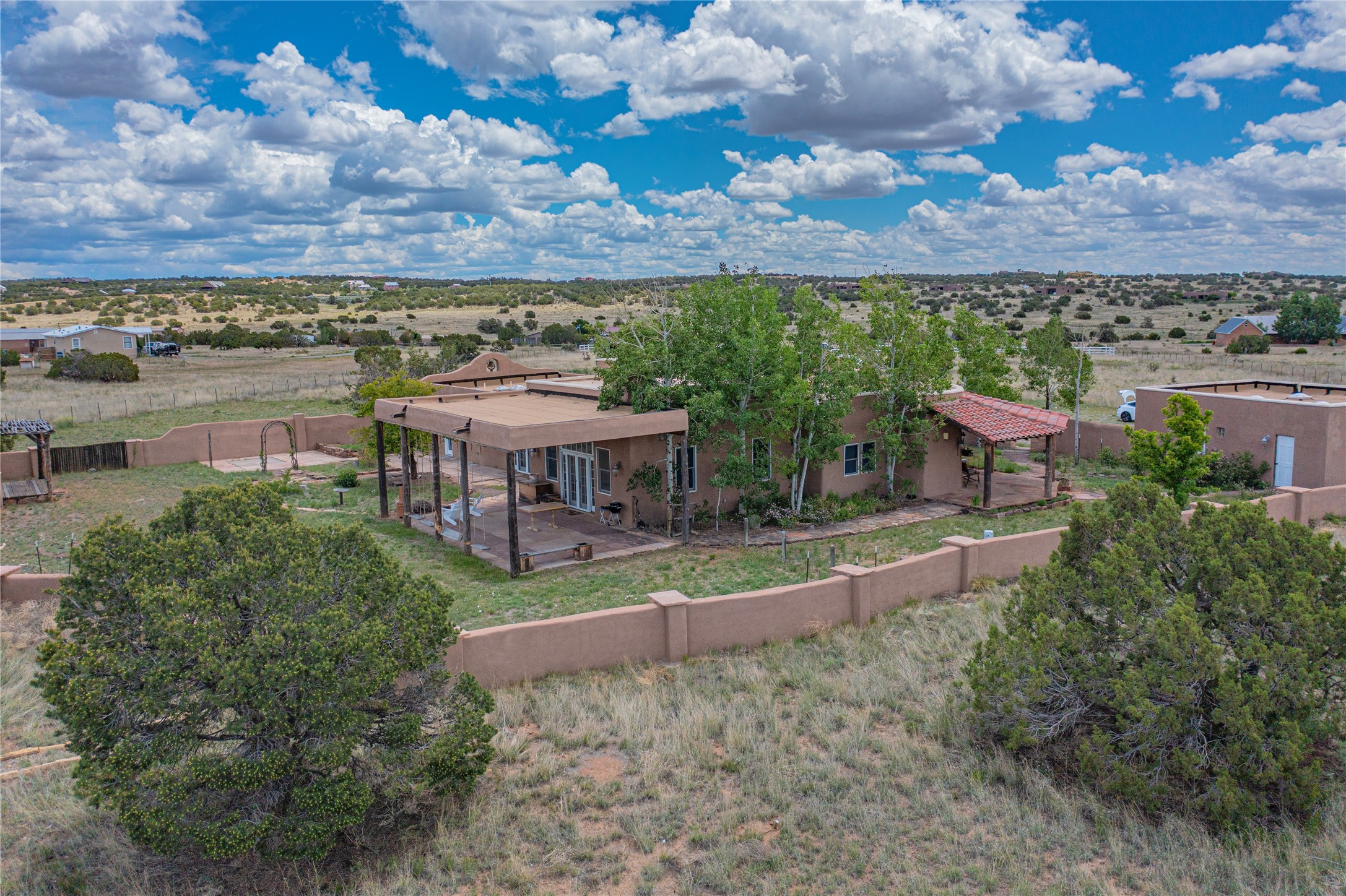 Welcome to an extraordinary slice of Southwestern serenity. This skillfully crafted ranch property is an impressive blend of rustic charm and modern amenities spread across over 4000 sq. ft. With three bedrooms and three bathrooms, this home is nestled on five private acres, rich in views, and boasts an additional room that makes a perfect office or flex room with a private entry. The home's distinctive character is marked by accents of 150-year-old reclaimed lumber and honed flagstone floors with tile inlay. Curved archways, charming details, and exquisite built-ins add to the home's unique aesthetic. Thirteen skylights throughout the house create a light-filled environment, while two fireplaces add warmth and ambiance.Cater to your culinary ambitions in the gourmet kitchen, featuring granite countertops, a spacious island, two refrigerators/freezers, a 6-burner Garland stove, and a large walk-in pantry. Entertain effortlessly indoors and out with two spacious portals equipped with a sound system, lushly landscaped gardens, and multiple flagstone patios offering panoramic mountain views. French Pella double doors lead from the dining room and family room to the great outdoors, facilitating a seamless indoor-outdoor lifestyle. The home's flexible floor plan accommodates both formal and casual living spaces. A formal dining room with limestone accents and an informal dining room with built-in shelves and counter complement the great room, replete with a kiva fireplace and 14-foot beamed ceilings. The primary suite, a true sanctuary, features a romantic bath with a vintage claw foot tub and travertine tile overlooking a private courtyard. The generously designed California Closet is not to be forgotten and is perfect for your wardrobe. Additional amenities include A/C, forced air heating, an oversized 2-car garage with four skylights and built-in storage, and a spacious laundry room equipped with a washer and dryer.