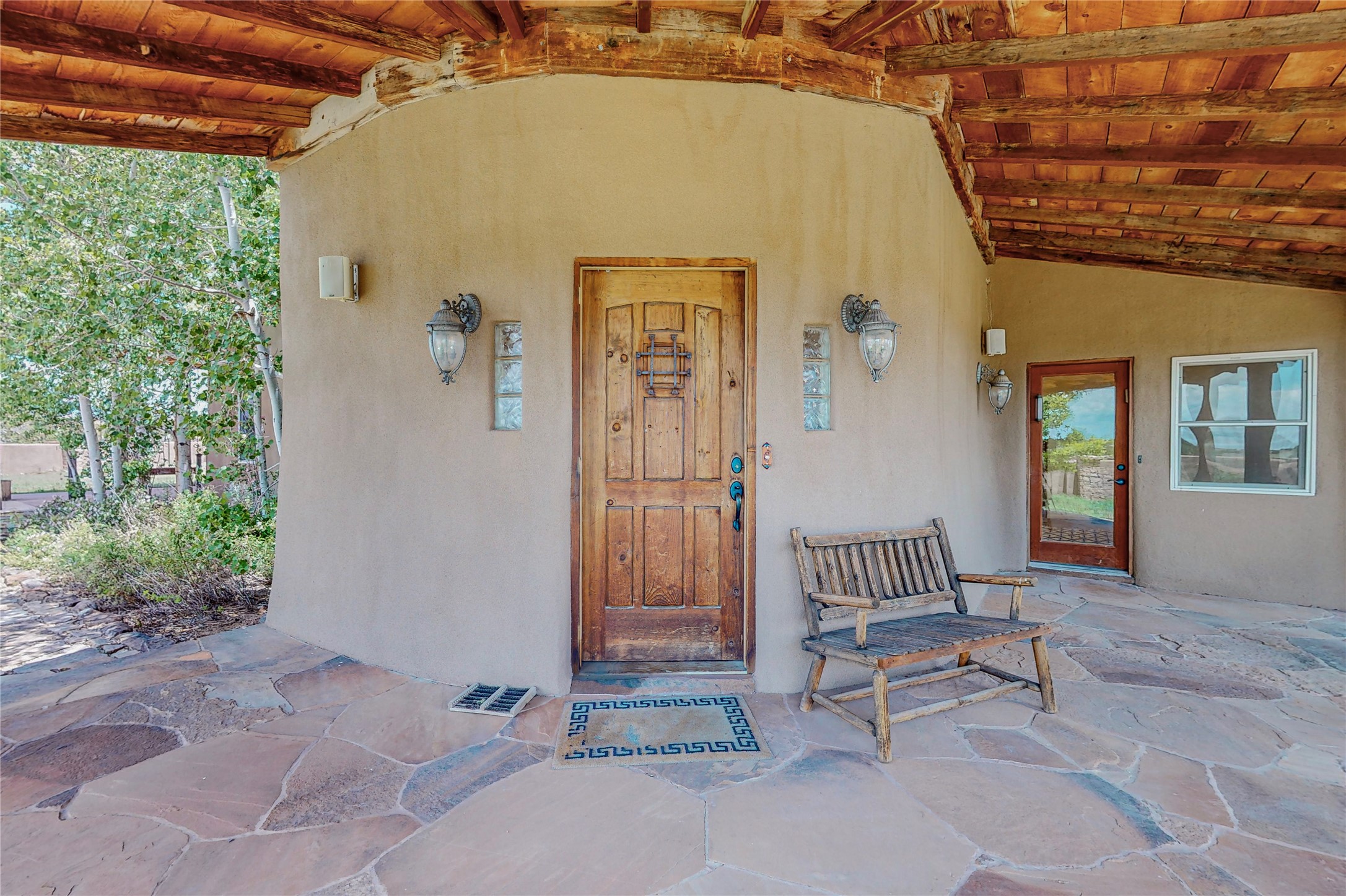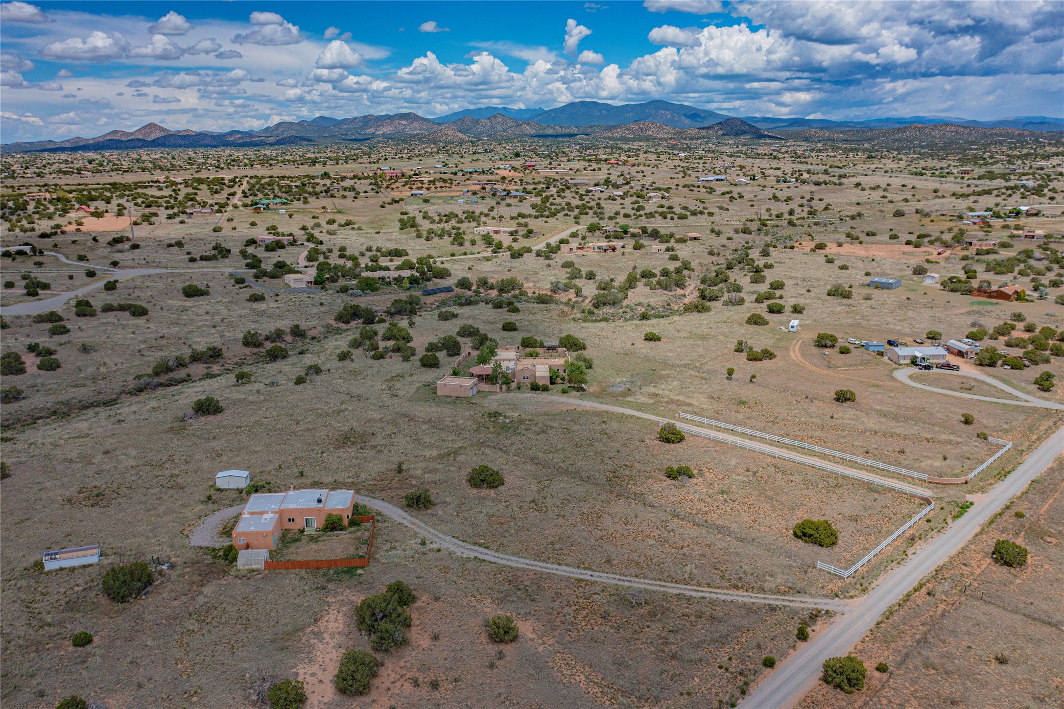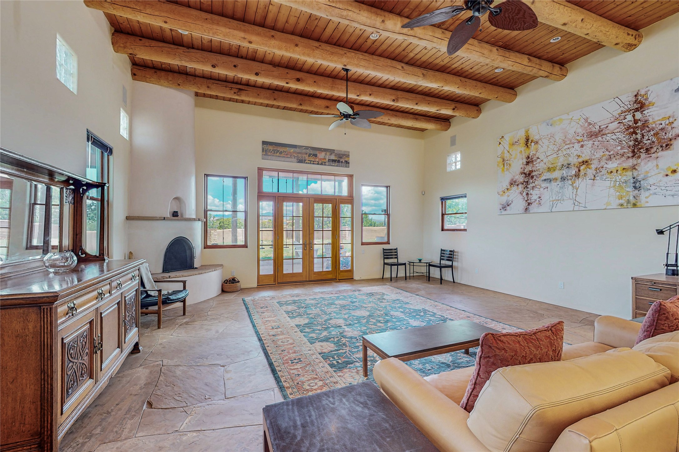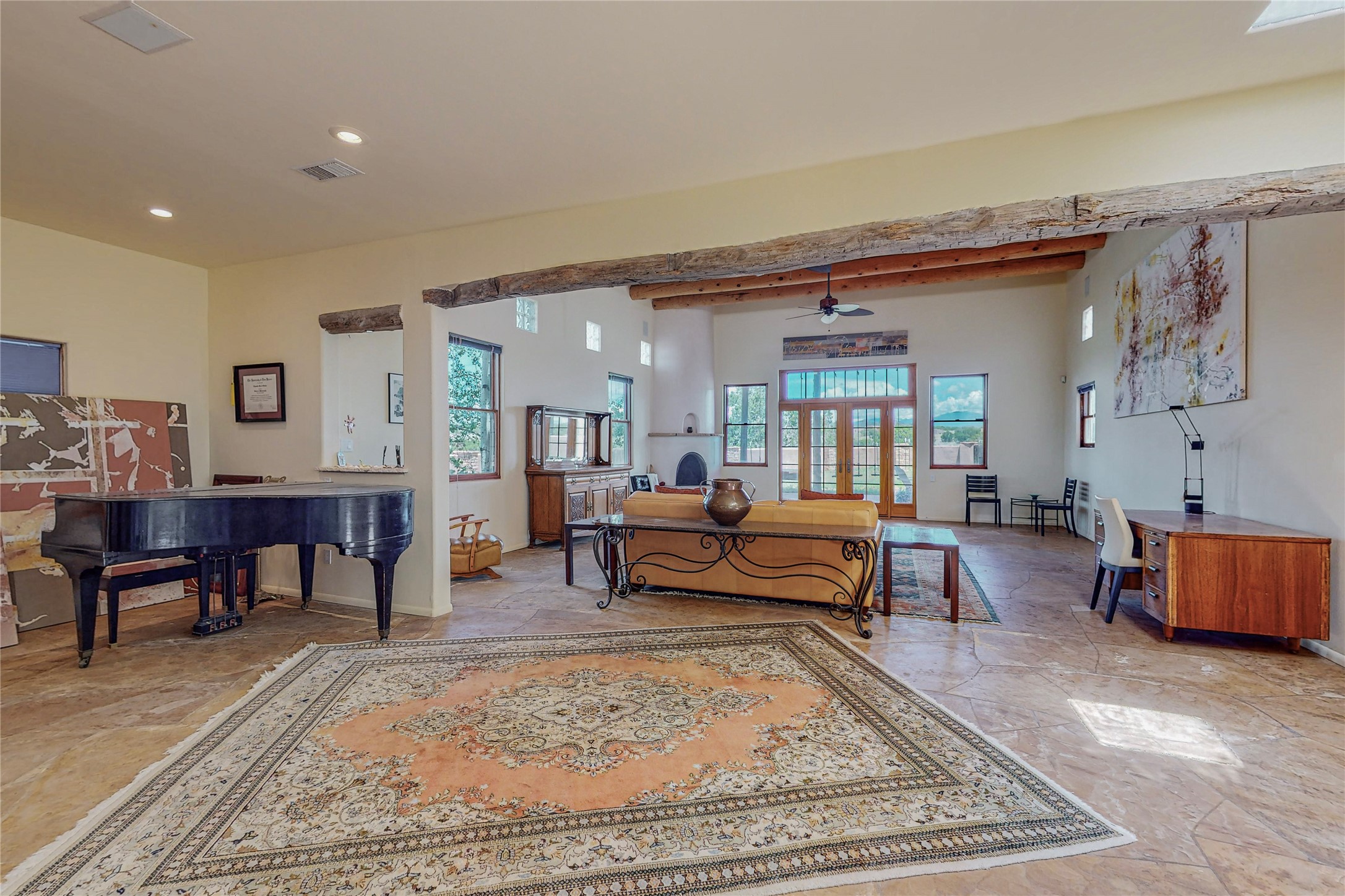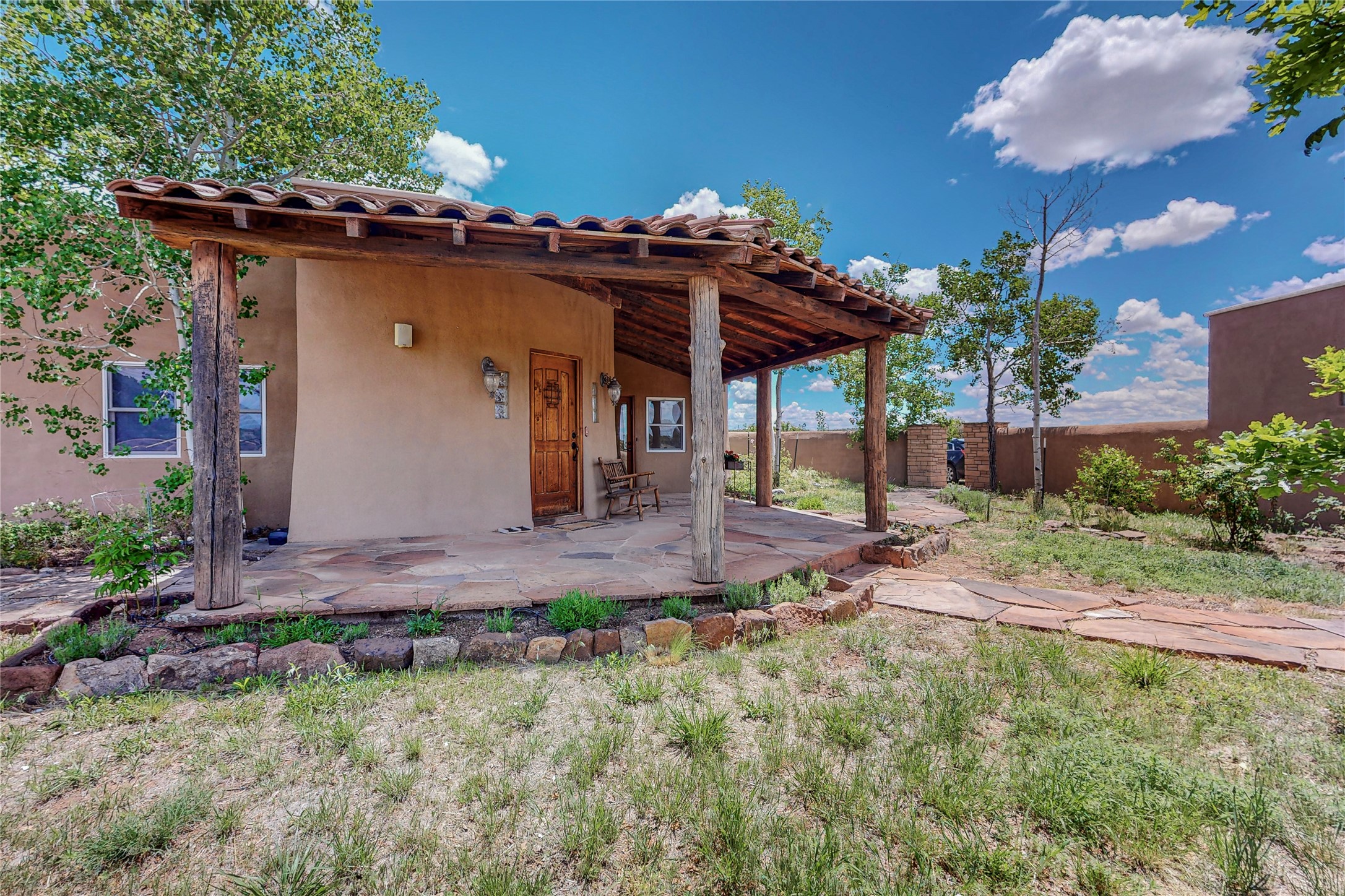 Welcome to an extraordinary slice of Southwestern serenity. This skillfully crafted ranch property is an impressive blend of rustic charm and modern amenities spread across over 4000 sq. ft. With three bedrooms and three bathrooms, this home is nestled on five private acres, rich in views, and boasts an additional room that makes a perfect office or flex room with a private entry. The home's distinctive character is marked by accents of 150-year-old reclaimed lumber and honed flagstone floors with tile inlay. Curved archways, charming details, and exquisite built-ins add to the home's unique aesthetic. Thirteen skylights throughout the house create a light-filled environment, while two fireplaces add warmth and ambiance.Cater to your culinary ambitions in the gourmet kitchen, featuring granite countertops, a spacious island, two refrigerators/freezers, a 6-burner Garland stove, and a large walk-in pantry. Entertain effortlessly indoors and out with two spacious portals equipped with a sound system, lushly landscaped gardens, and multiple flagstone patios offering panoramic mountain views. French Pella double doors lead from the dining room and family room to the great outdoors, facilitating a seamless indoor-outdoor lifestyle. The home's flexible floor plan accommodates both formal and casual living spaces. A formal dining room with limestone accents and an informal dining room with built-in shelves and counter complement the great room, replete with a kiva fireplace and 14-foot beamed ceilings. The primary suite, a true sanctuary, features a romantic bath with a vintage claw foot tub and travertine tile overlooking a private courtyard. The generously designed California Closet is not to be forgotten and is perfect for your wardrobe. Additional amenities include A/C, forced air heating, an oversized 2-car garage with four skylights and built-in storage, and a spacious laundry room equipped with a washer and dryer.