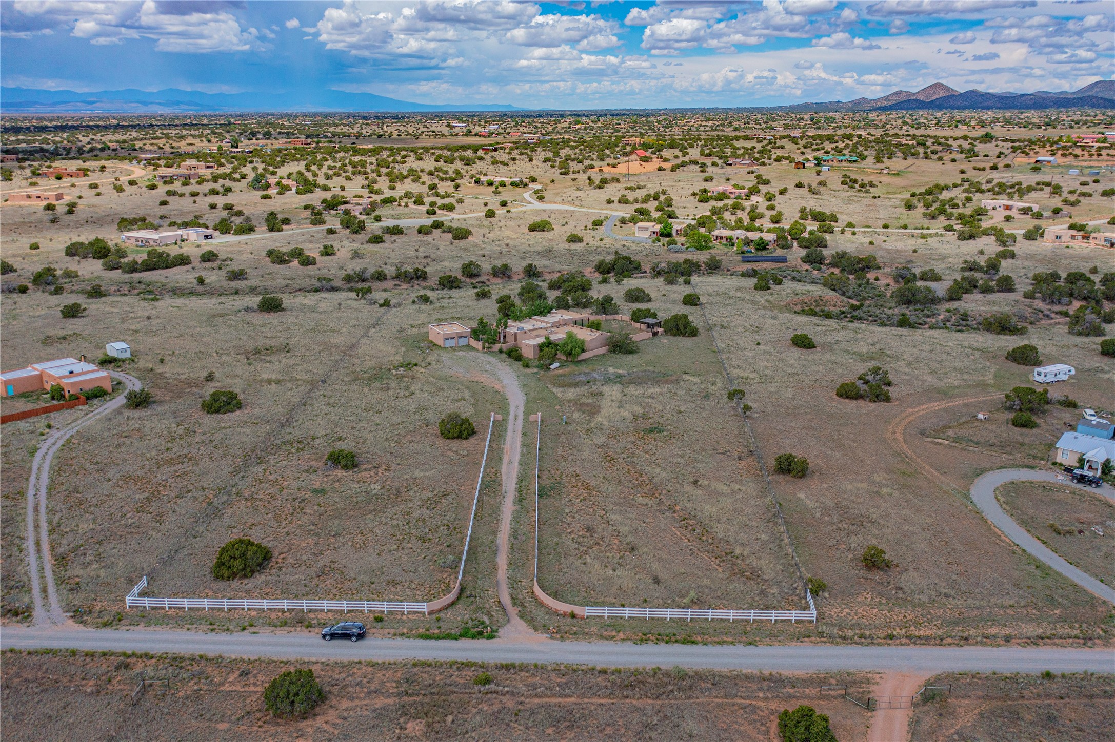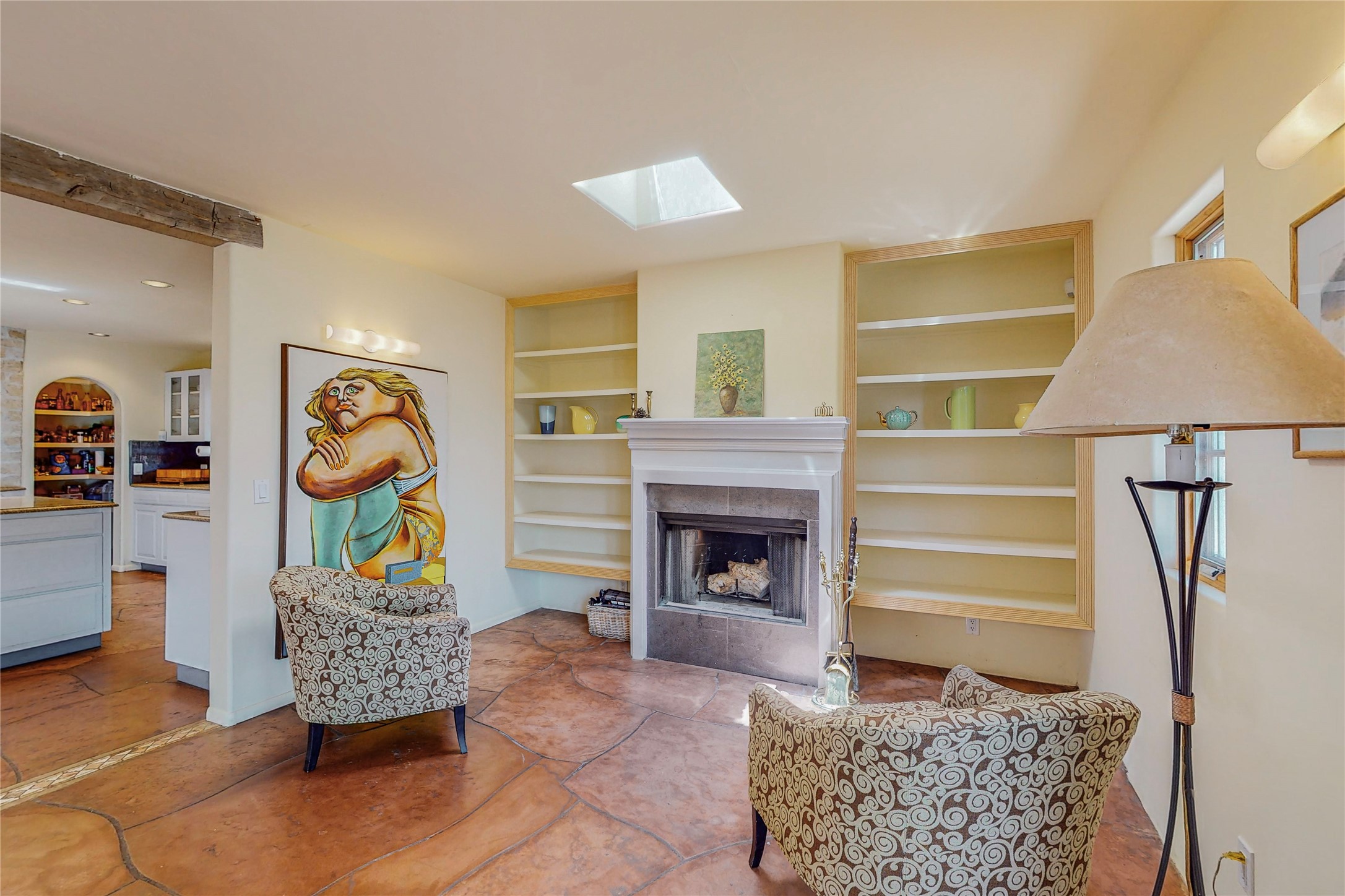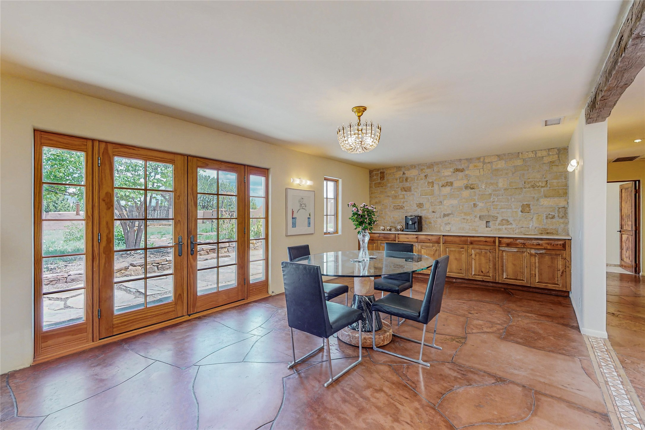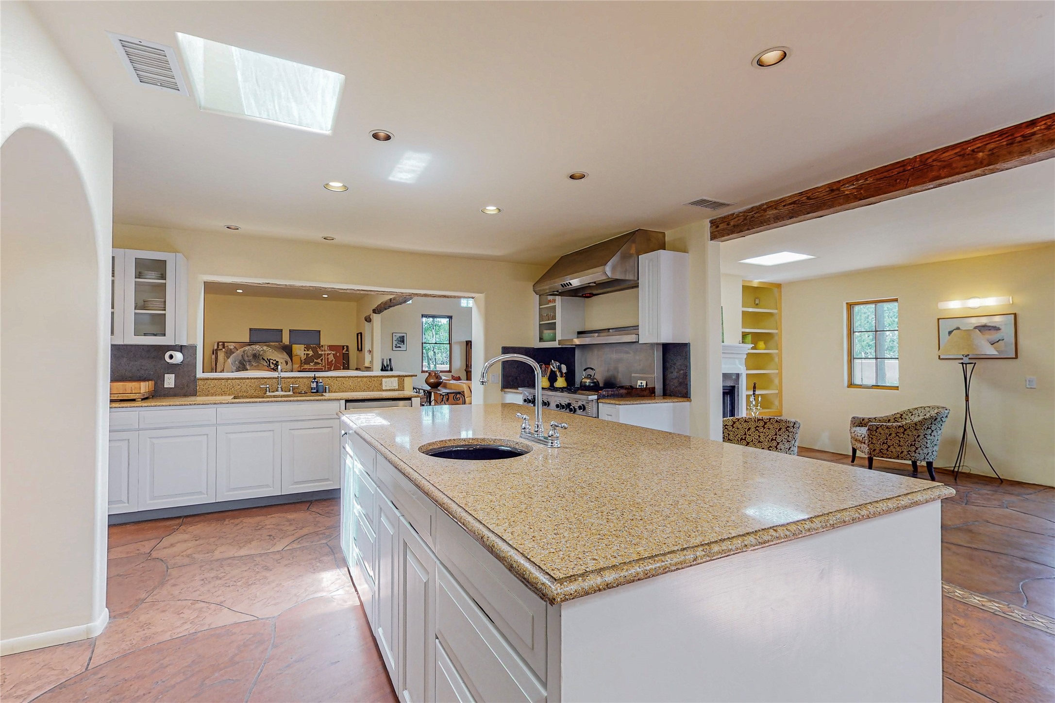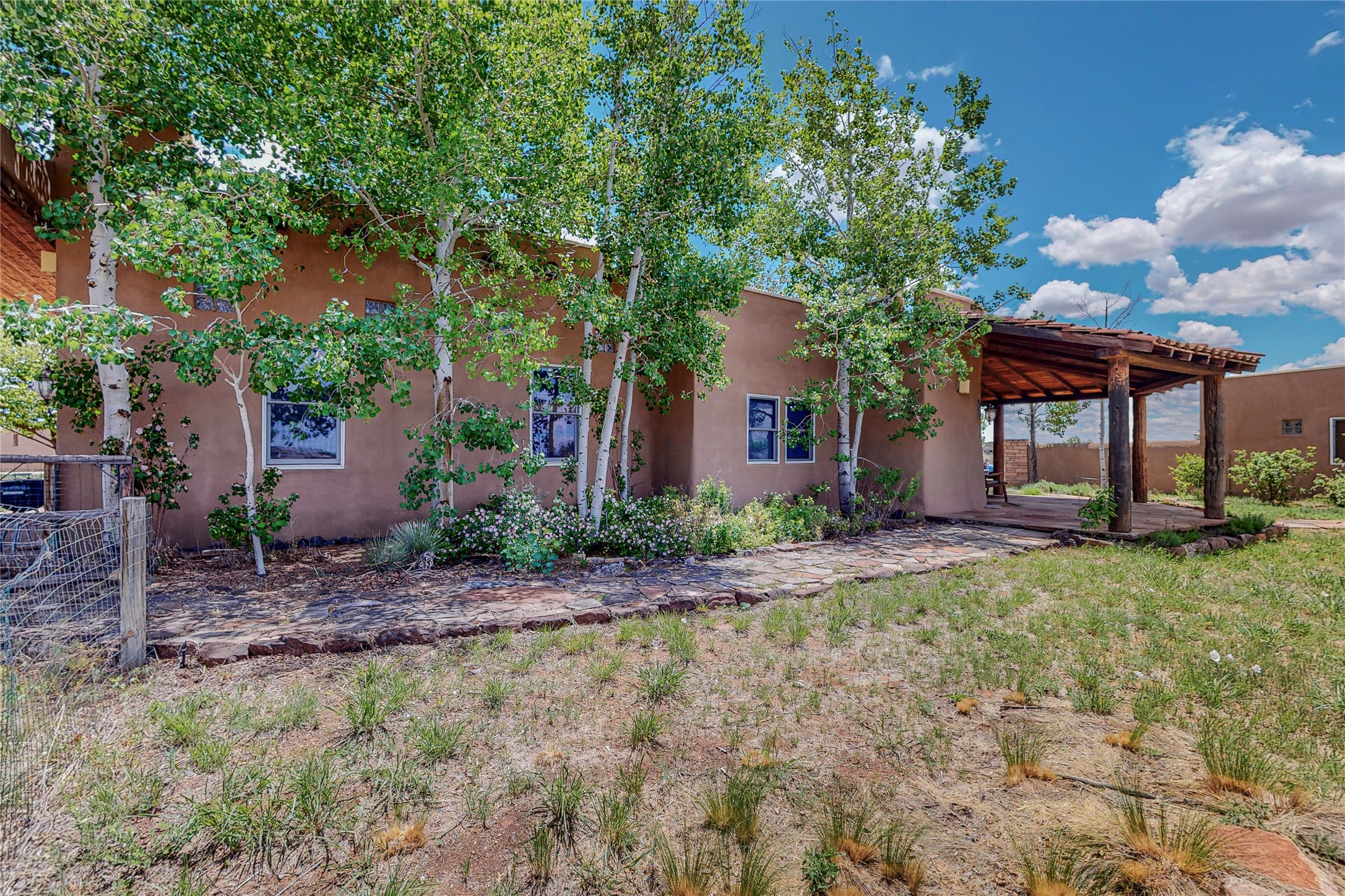 Welcome to an extraordinary slice of Southwestern serenity. This skillfully crafted ranch property is an impressive blend of rustic charm and modern amenities spread across over 4000 sq. ft. With three bedrooms and three bathrooms, this home is nestled on five private acres, rich in views, and boasts an additional room that makes a perfect office or flex room with a private entry. The home's distinctive character is marked by accents of 150-year-old reclaimed lumber and honed flagstone floors with tile inlay. Curved archways, charming details, and exquisite built-ins add to the home's unique aesthetic. Thirteen skylights throughout the house create a light-filled environment, while two fireplaces add warmth and ambiance.Cater to your culinary ambitions in the gourmet kitchen, featuring granite countertops, a spacious island, two refrigerators/freezers, a 6-burner Garland stove, and a large walk-in pantry. Entertain effortlessly indoors and out with two spacious portals equipped with a sound system, lushly landscaped gardens, and multiple flagstone patios offering panoramic mountain views. French Pella double doors lead from the dining room and family room to the great outdoors, facilitating a seamless indoor-outdoor lifestyle. The home's flexible floor plan accommodates both formal and casual living spaces. A formal dining room with limestone accents and an informal dining room with built-in shelves and counter complement the great room, replete with a kiva fireplace and 14-foot beamed ceilings. The primary suite, a true sanctuary, features a romantic bath with a vintage claw foot tub and travertine tile overlooking a private courtyard. The generously designed California Closet is not to be forgotten and is perfect for your wardrobe. Additional amenities include A/C, forced air heating, an oversized 2-car garage with four skylights and built-in storage, and a spacious laundry room equipped with a washer and dryer.