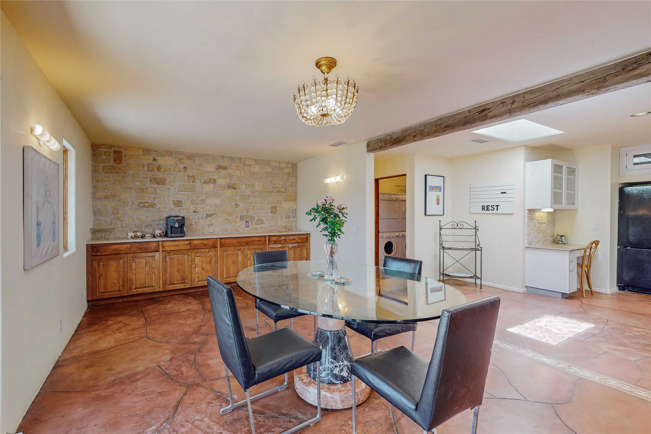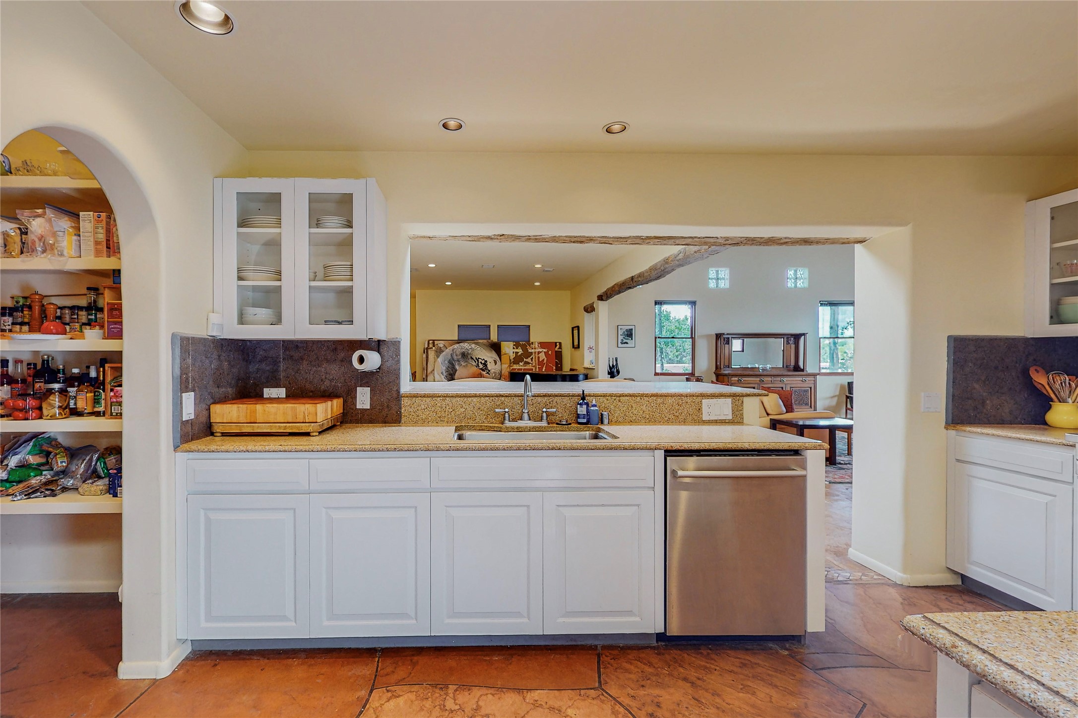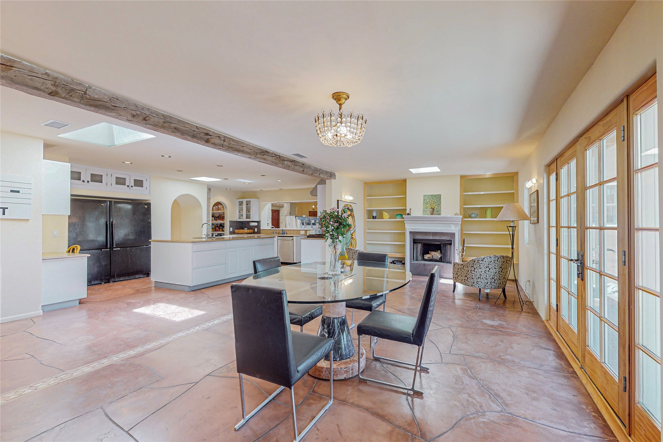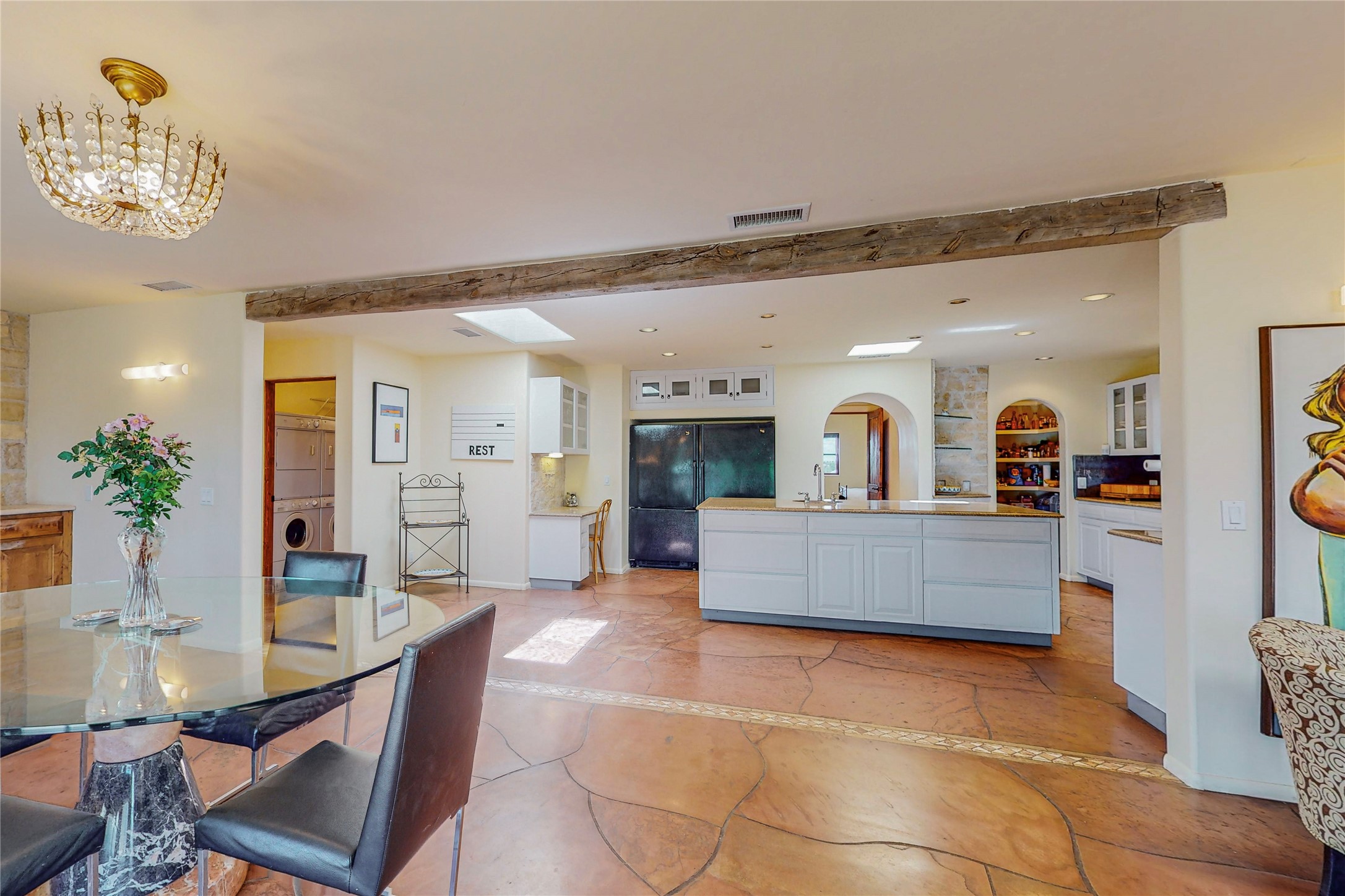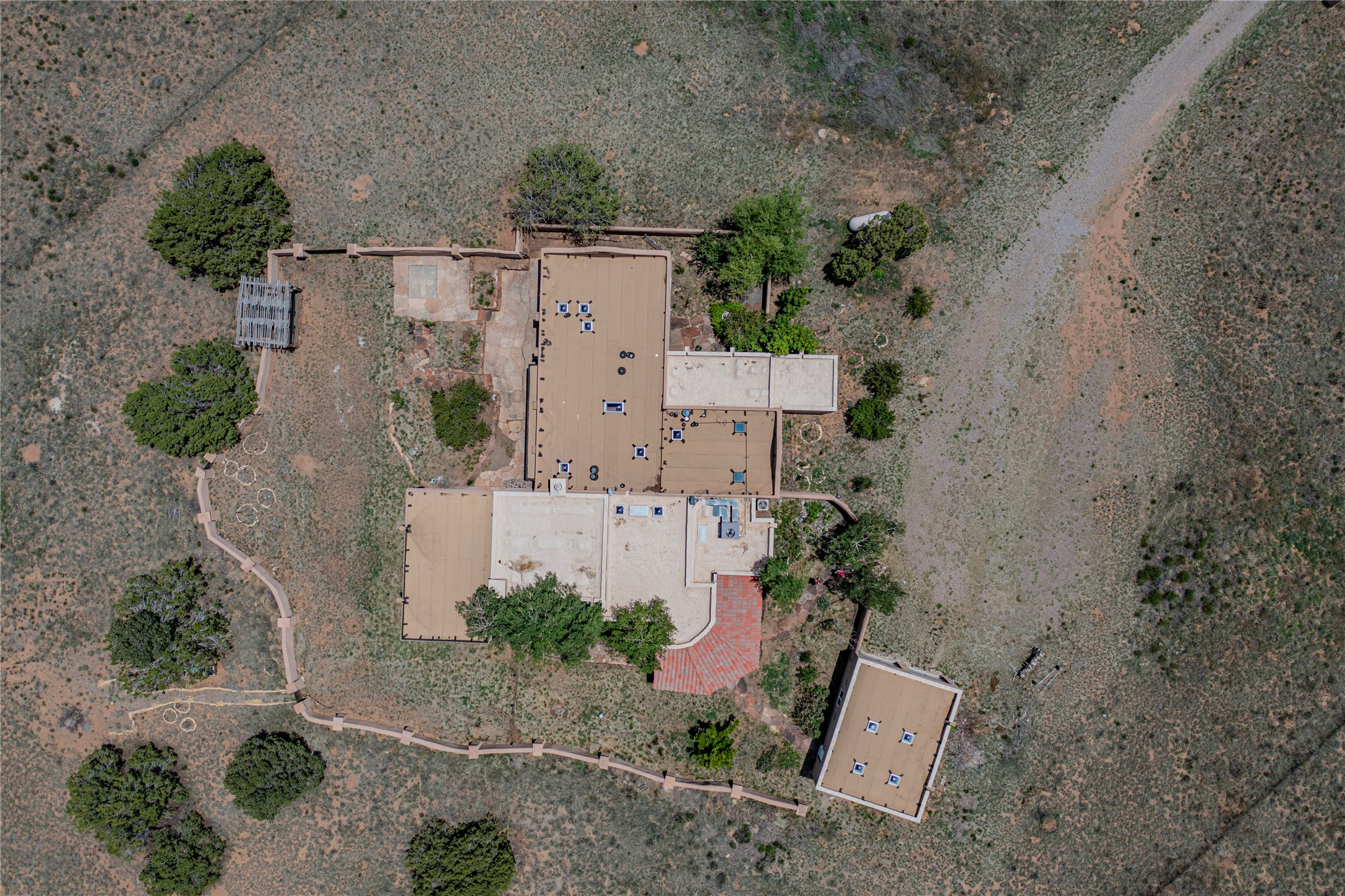 Welcome to an extraordinary slice of Southwestern serenity. This skillfully crafted ranch property is an impressive blend of rustic charm and modern amenities spread across over 4000 sq. ft. With three bedrooms and three bathrooms, this home is nestled on five private acres, rich in views, and boasts an additional room that makes a perfect office or flex room with a private entry. The home's distinctive character is marked by accents of 150-year-old reclaimed lumber and honed flagstone floors with tile inlay. Curved archways, charming details, and exquisite built-ins add to the home's unique aesthetic. Thirteen skylights throughout the house create a light-filled environment, while two fireplaces add warmth and ambiance.Cater to your culinary ambitions in the gourmet kitchen, featuring granite countertops, a spacious island, two refrigerators/freezers, a 6-burner Garland stove, and a large walk-in pantry. Entertain effortlessly indoors and out with two spacious portals equipped with a sound system, lushly landscaped gardens, and multiple flagstone patios offering panoramic mountain views. French Pella double doors lead from the dining room and family room to the great outdoors, facilitating a seamless indoor-outdoor lifestyle. The home's flexible floor plan accommodates both formal and casual living spaces. A formal dining room with limestone accents and an informal dining room with built-in shelves and counter complement the great room, replete with a kiva fireplace and 14-foot beamed ceilings. The primary suite, a true sanctuary, features a romantic bath with a vintage claw foot tub and travertine tile overlooking a private courtyard. The generously designed California Closet is not to be forgotten and is perfect for your wardrobe. Additional amenities include A/C, forced air heating, an oversized 2-car garage with four skylights and built-in storage, and a spacious laundry room equipped with a washer and dryer.