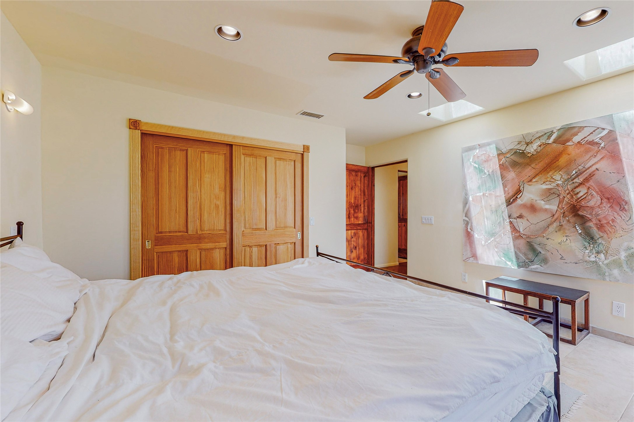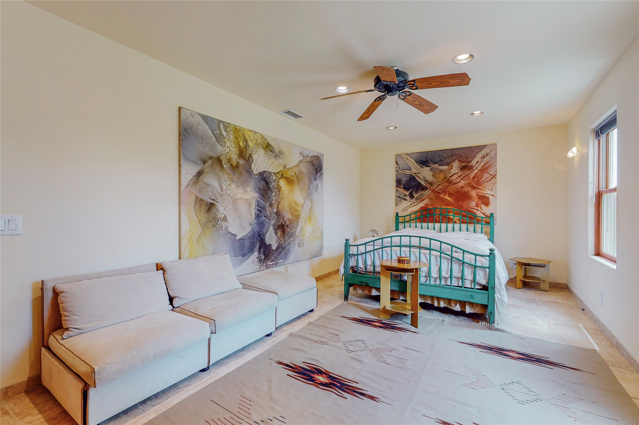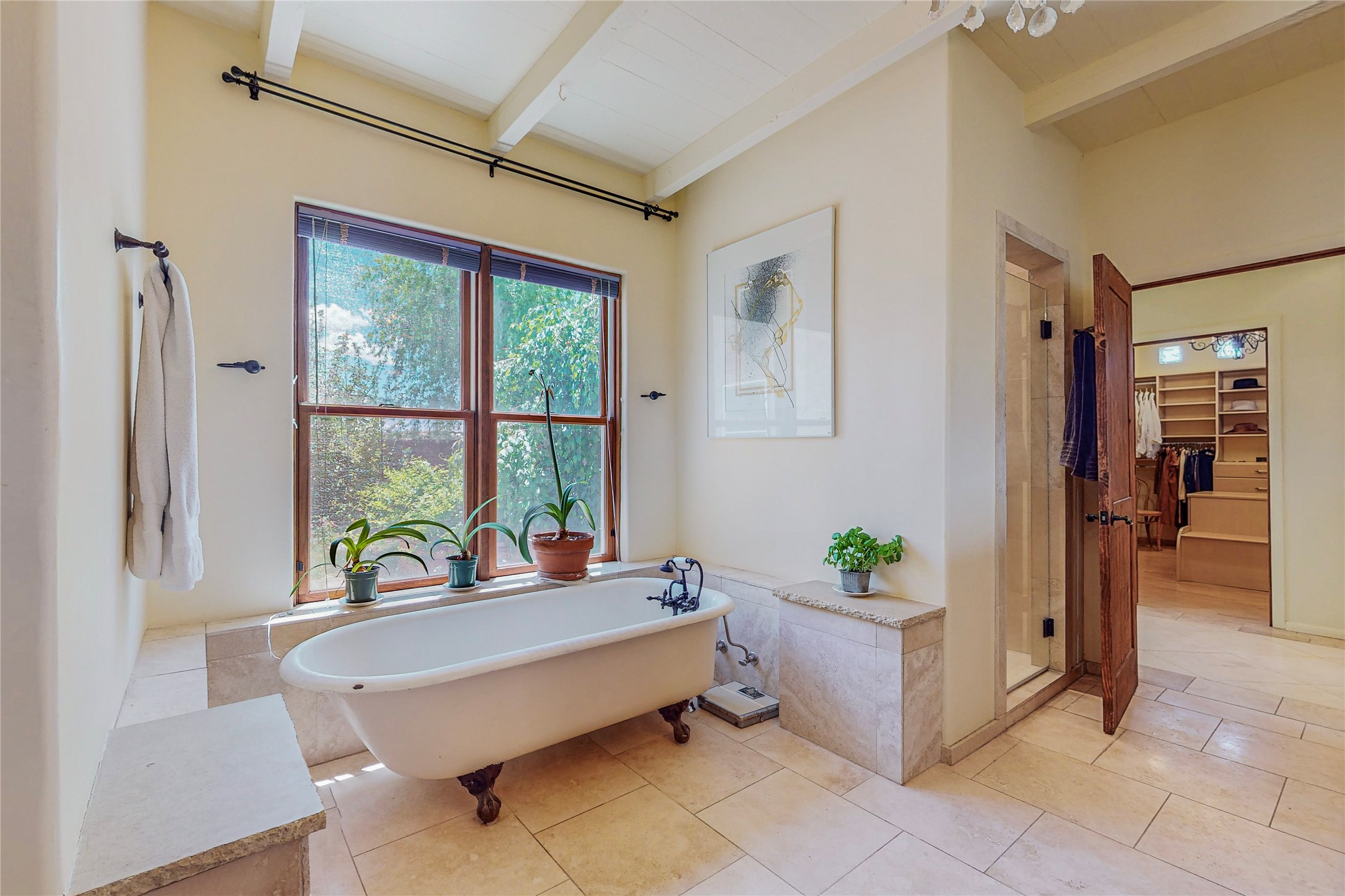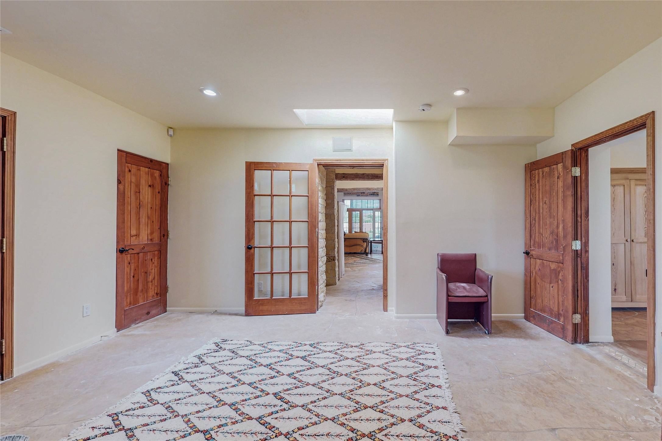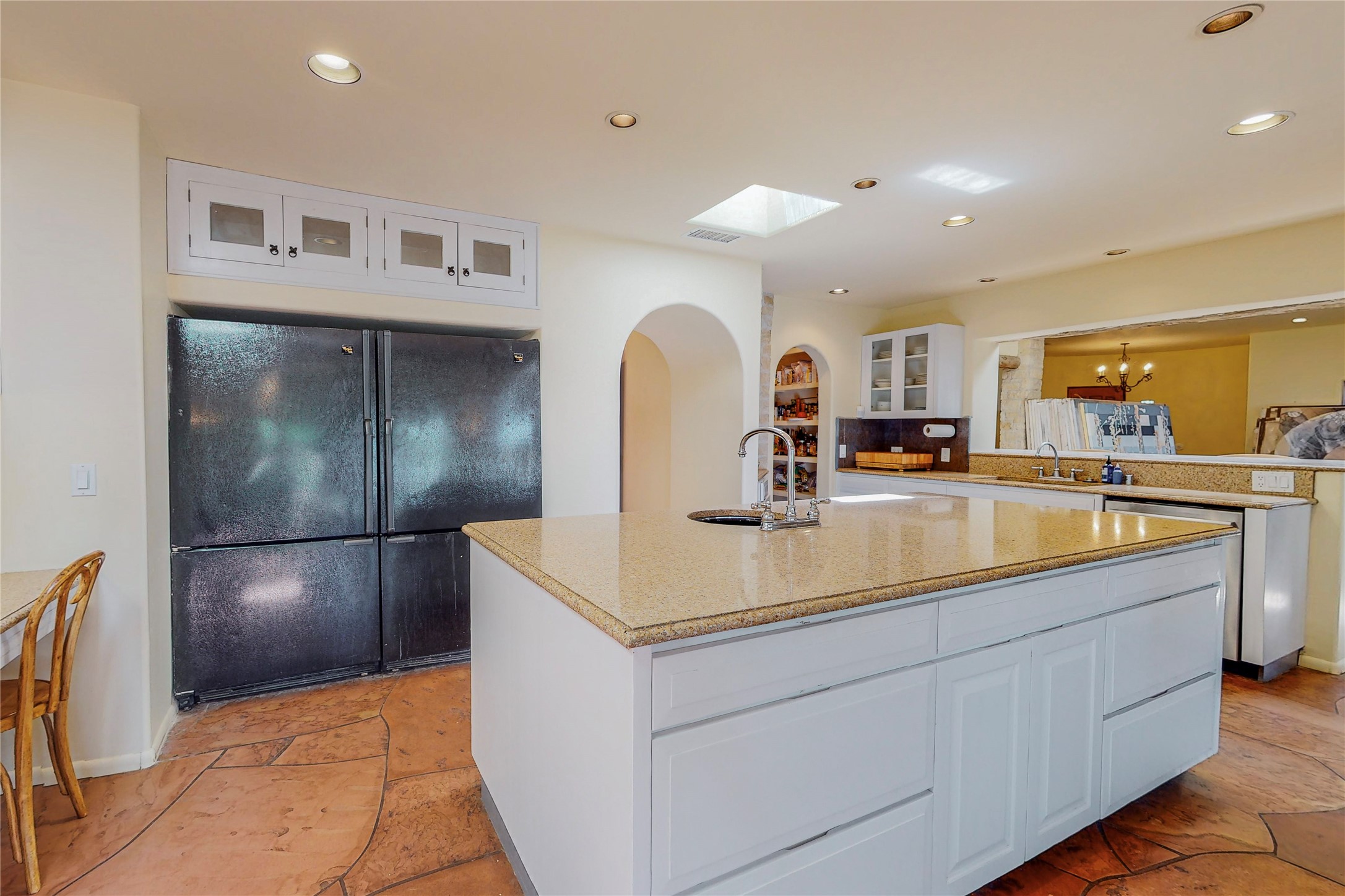 Welcome to an extraordinary slice of Southwestern serenity. This skillfully crafted ranch property is an impressive blend of rustic charm and modern amenities spread across over 4000 sq. ft. With three bedrooms and three bathrooms, this home is nestled on five private acres, rich in views, and boasts an additional room that makes a perfect office or flex room with a private entry. The home's distinctive character is marked by accents of 150-year-old reclaimed lumber and honed flagstone floors with tile inlay. Curved archways, charming details, and exquisite built-ins add to the home's unique aesthetic. Thirteen skylights throughout the house create a light-filled environment, while two fireplaces add warmth and ambiance.Cater to your culinary ambitions in the gourmet kitchen, featuring granite countertops, a spacious island, two refrigerators/freezers, a 6-burner Garland stove, and a large walk-in pantry. Entertain effortlessly indoors and out with two spacious portals equipped with a sound system, lushly landscaped gardens, and multiple flagstone patios offering panoramic mountain views. French Pella double doors lead from the dining room and family room to the great outdoors, facilitating a seamless indoor-outdoor lifestyle. The home's flexible floor plan accommodates both formal and casual living spaces. A formal dining room with limestone accents and an informal dining room with built-in shelves and counter complement the great room, replete with a kiva fireplace and 14-foot beamed ceilings. The primary suite, a true sanctuary, features a romantic bath with a vintage claw foot tub and travertine tile overlooking a private courtyard. The generously designed California Closet is not to be forgotten and is perfect for your wardrobe. Additional amenities include A/C, forced air heating, an oversized 2-car garage with four skylights and built-in storage, and a spacious laundry room equipped with a washer and dryer.