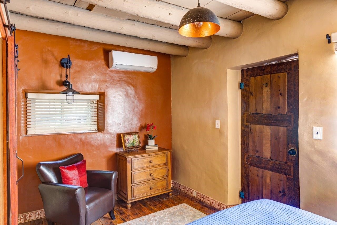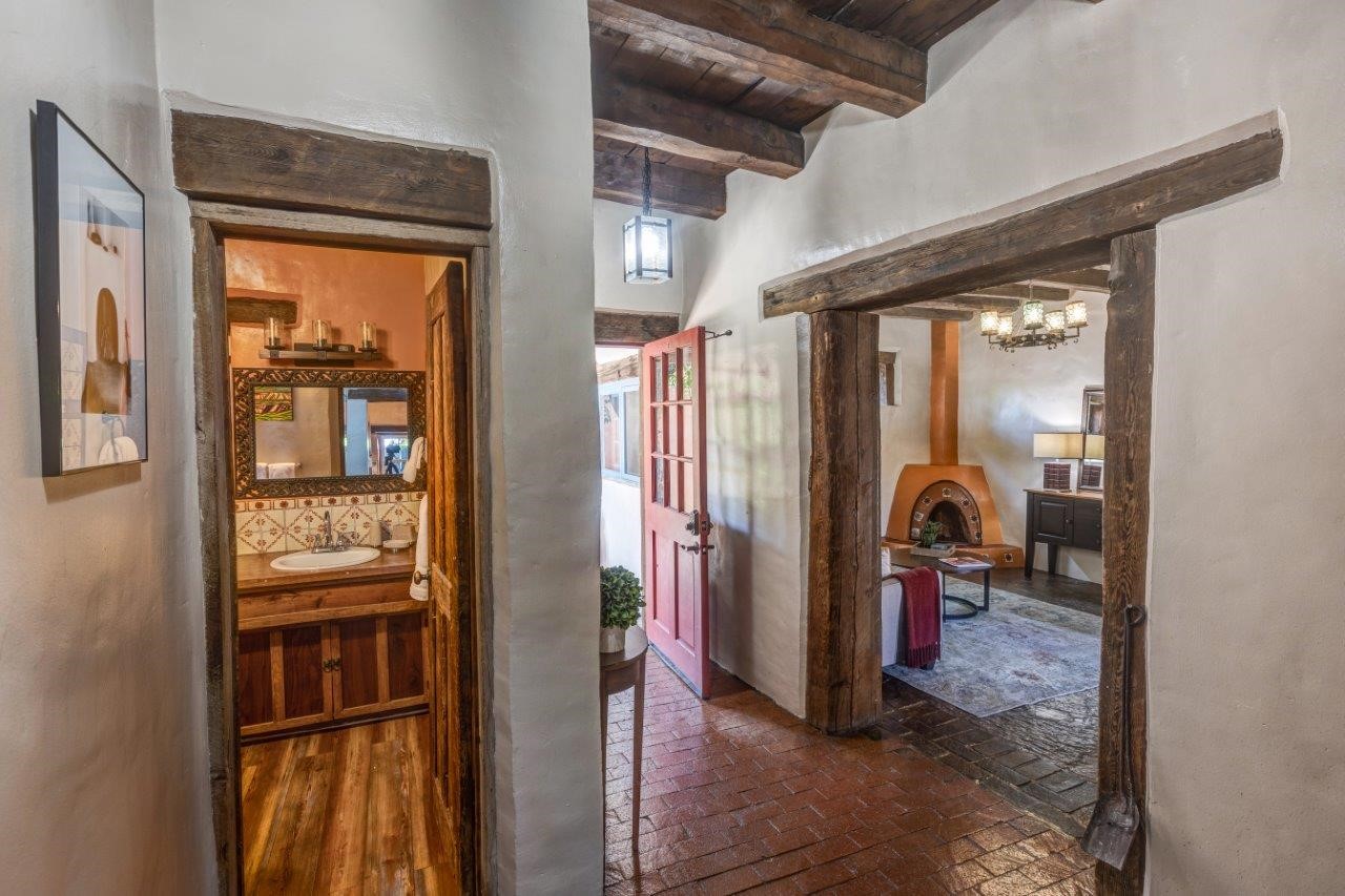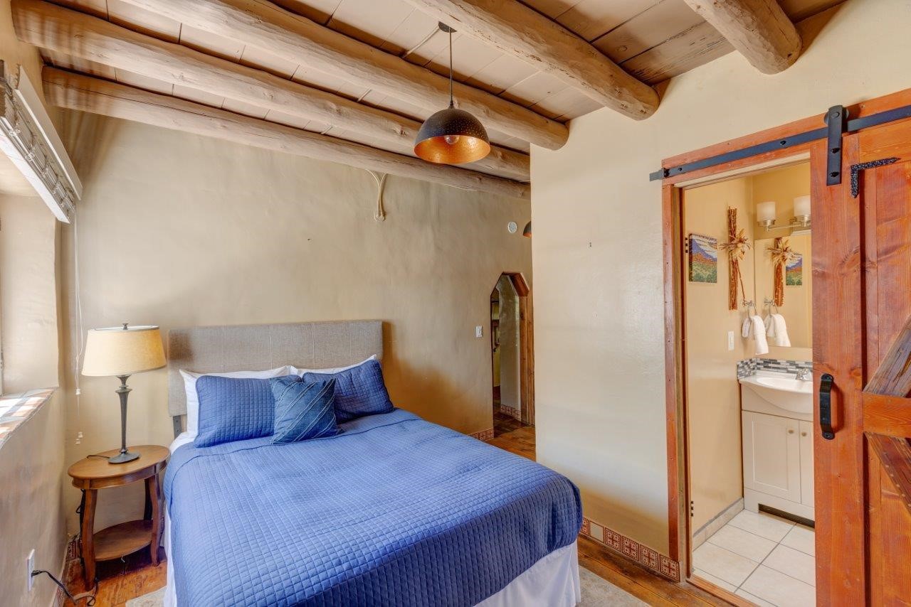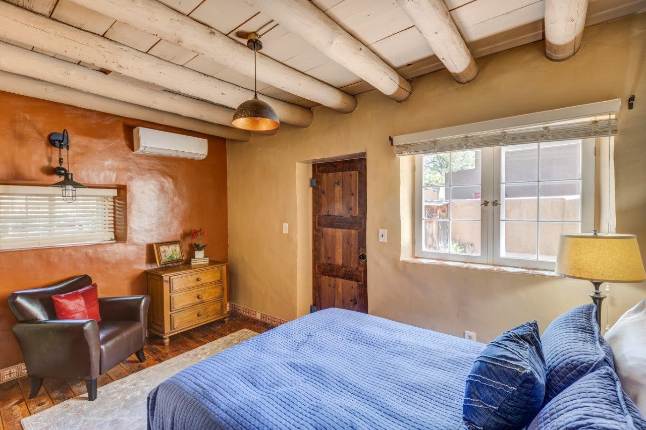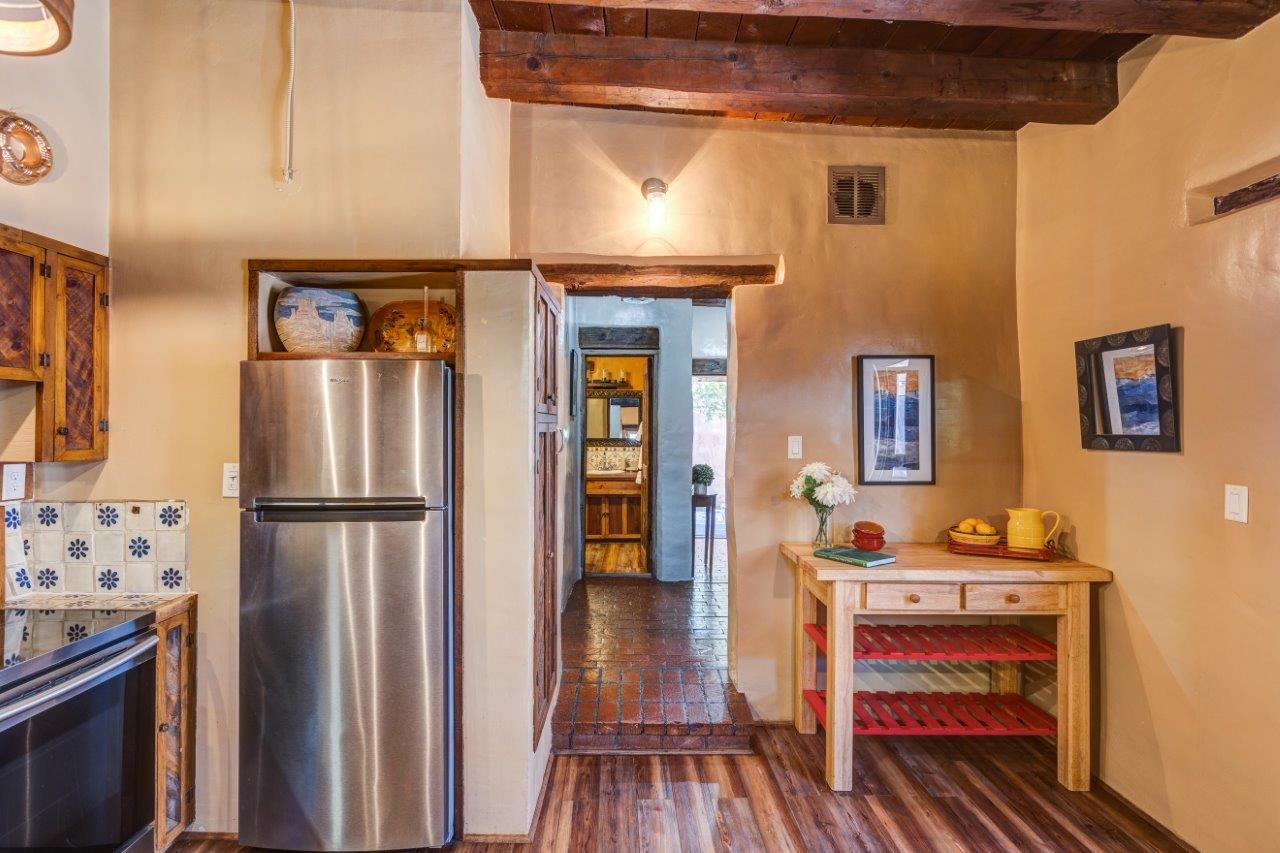 Quintessential adobe home within short proximity to the historic downtown Santa Fe plaza! Welcome to 534 1/2 West Alameda Street-a well-built home with a rustic flair that features many classic and attractive finishes throughout! From the hand crafted ceilings to the solid flagstone flooring, this home provides the ideal setting for the desirable living lifestyle you've been waiting for. Features include 3 bedrooms, 2 baths, 1,479 heated sqft, smooth plaster walls, custom built cabinetry, kiva fireplace, new wood stove, a ductless heating and cooling system and one of a kind hand-hewn, barn wood vigas/beams and lentils repurposed from a barn in Washington State circa early 1800's. There are several inviting and spacious outdoor spaces that are prime for entertaining and provide ideal areas for your future gardening desires. Some of the additional updates include new electric service meter panel and service line, reroofing in 2016, new stucco in 2018, stainless steel appliances and a complete renovation of the primary bathroom. Easy access to great walking/biking paths along the Santa Fe river. Pride of ownership abounds in this move-in-ready home!