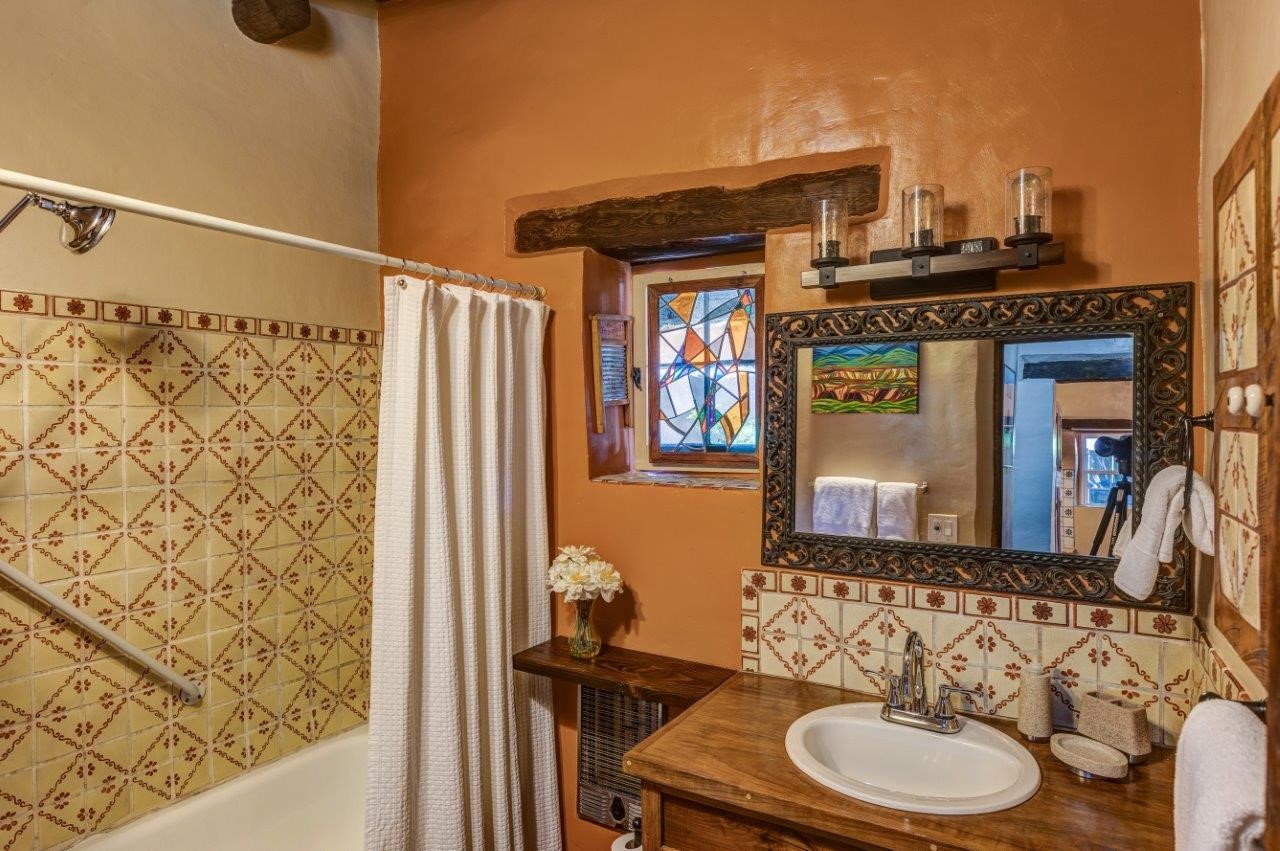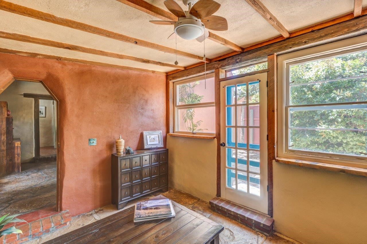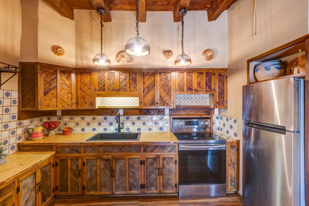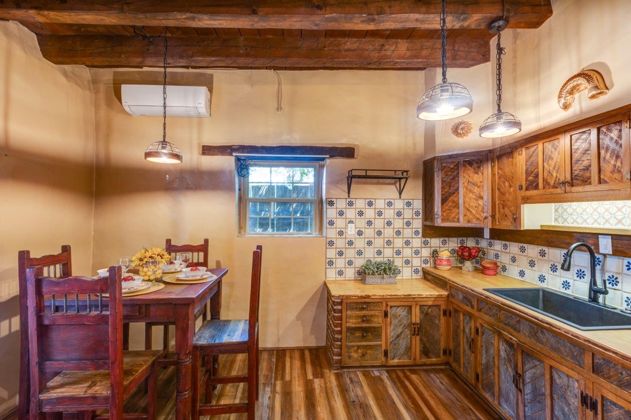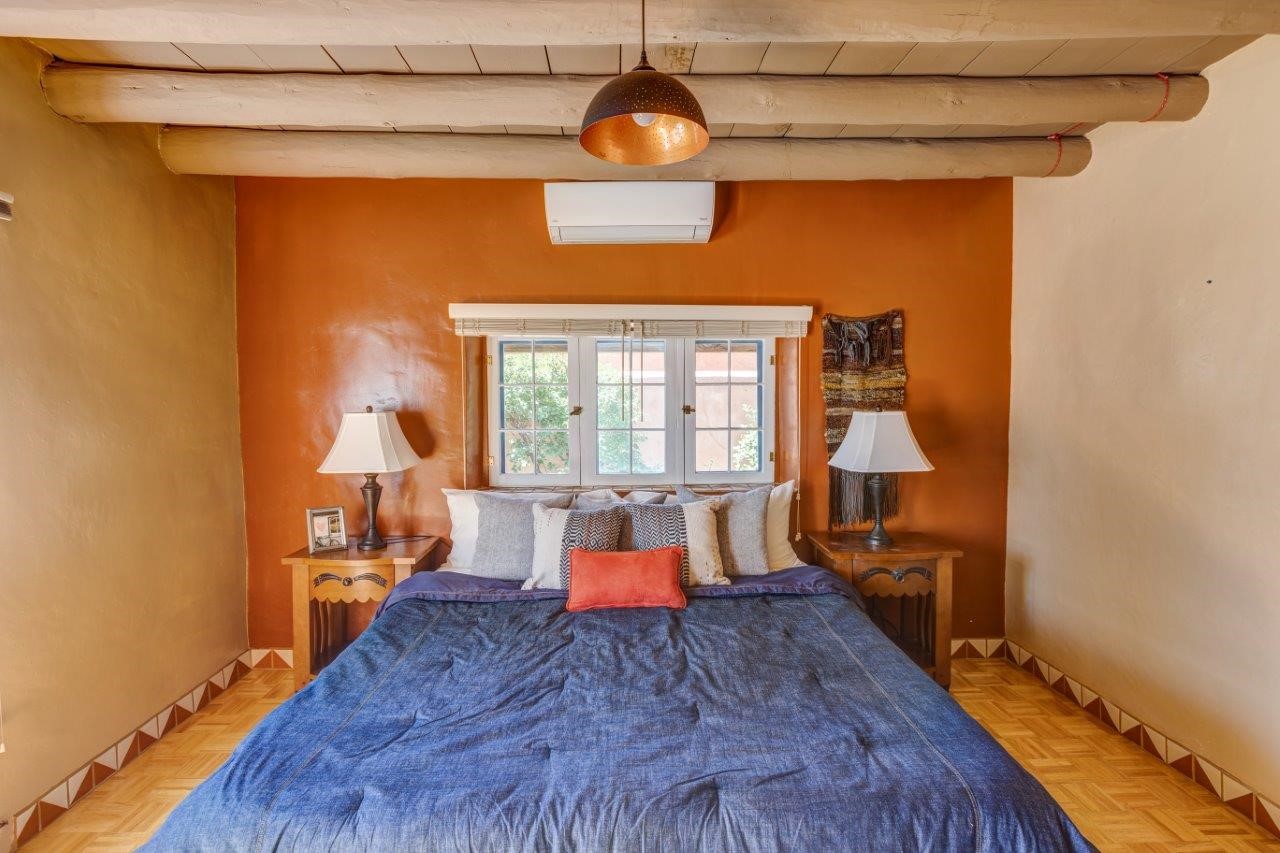 Quintessential adobe home within short proximity to the historic downtown Santa Fe plaza! Welcome to 534 1/2 West Alameda Street-a well-built home with a rustic flair that features many classic and attractive finishes throughout! From the hand crafted ceilings to the solid flagstone flooring, this home provides the ideal setting for the desirable living lifestyle you've been waiting for. Features include 3 bedrooms, 2 baths, 1,479 heated sqft, smooth plaster walls, custom built cabinetry, kiva fireplace, new wood stove, a ductless heating and cooling system and one of a kind hand-hewn, barn wood vigas/beams and lentils repurposed from a barn in Washington State circa early 1800's. There are several inviting and spacious outdoor spaces that are prime for entertaining and provide ideal areas for your future gardening desires. Some of the additional updates include new electric service meter panel and service line, reroofing in 2016, new stucco in 2018, stainless steel appliances and a complete renovation of the primary bathroom. Easy access to great walking/biking paths along the Santa Fe river. Pride of ownership abounds in this move-in-ready home!