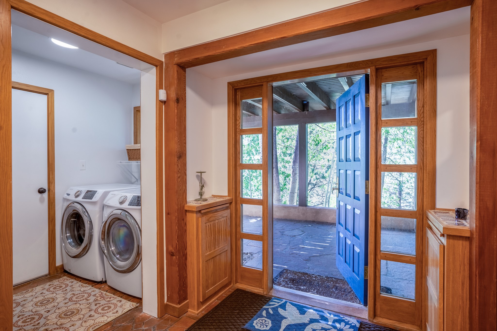 Privacy and serenity set on 10+ acres, just minutes from town! This light & bright residence is about 12 minutes drive to Antalya. Rio Grande, SF Prep & Thrive schools. What an wonderful opportunity for ski and mountain enthusiasts! A truly magical setting, nestled in the trees w/ dramatic rock outcroppings: a nature lover's dream. This home has numerous , wonderful outdoor living areas (3 decks & 3 patios). Thoughtfully designed home w/ a versatile floor plant to accommodate many lifestyles (home office, kids & grandkids, guests or a separate apartment) The public areas are comfortable and functional; consisting of a recently remodeled kitchen, formal dining room, living room w/ fireplace, & a study/media room (can be an additional bedroom), all with beautiful oak floors. The dining room opens to 2 outdoor decks and the kitchen also has access to one of the decks. The charming master suite features a kiva fireplace, well appointed bath, dual closets, library/loft, that leads outside to another deck. The 2nd bedroom is large w/a big storage closet, kiva fireplace; accesses another lively outdoor living area; designed as a den/family room or a guest apartment (a bathroom & pantry/kitchen adjoin it) so it can easily be a self-contained studio apt. The 11 acre site offers privacy and great hiking. No steep mountainous roads & mainly paved; this gated neighborhood off Old Santa Fe Trail is just minutes to the Plaza